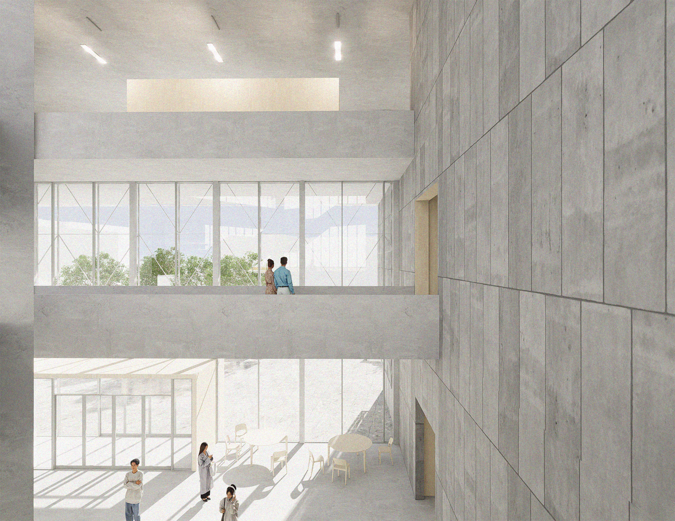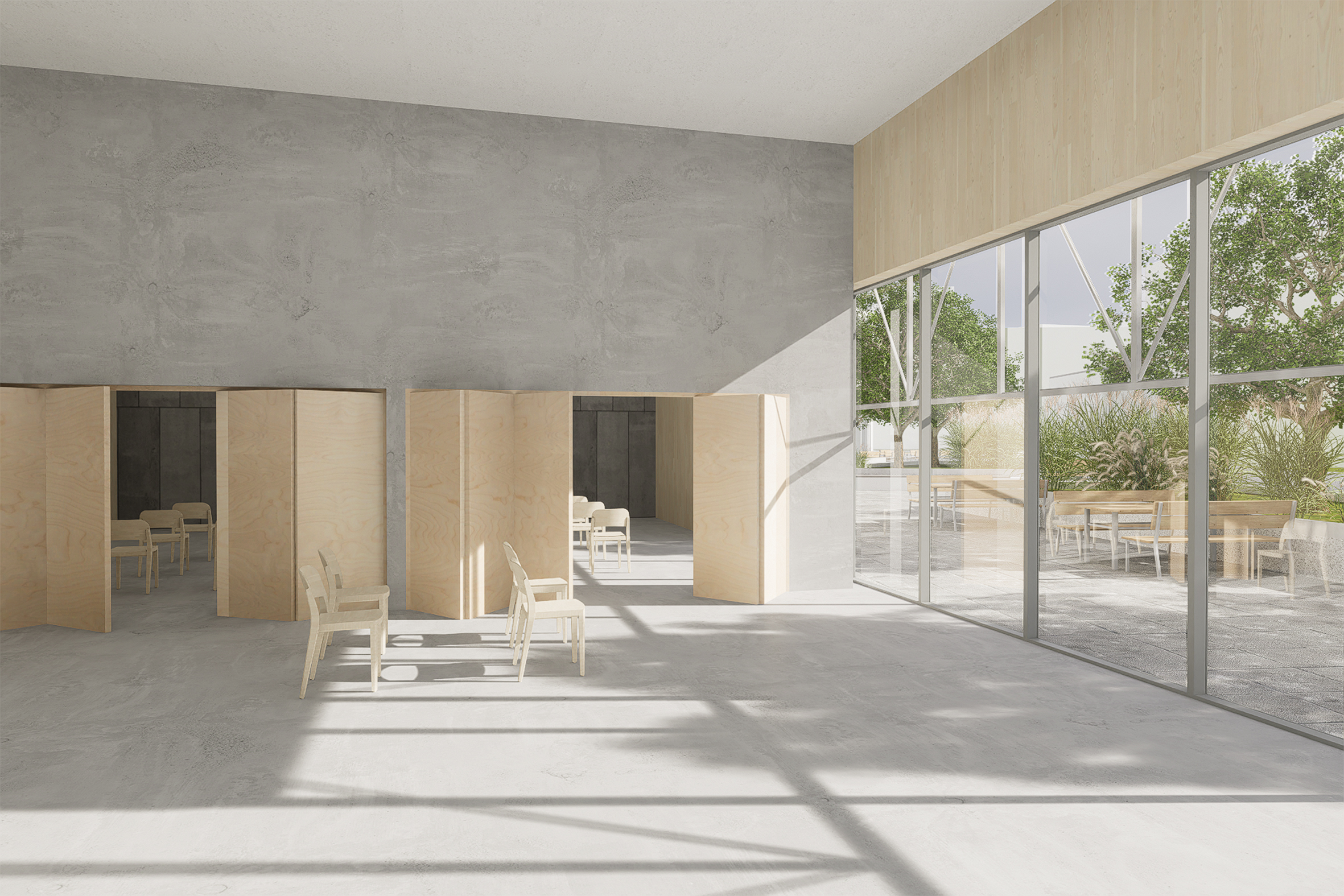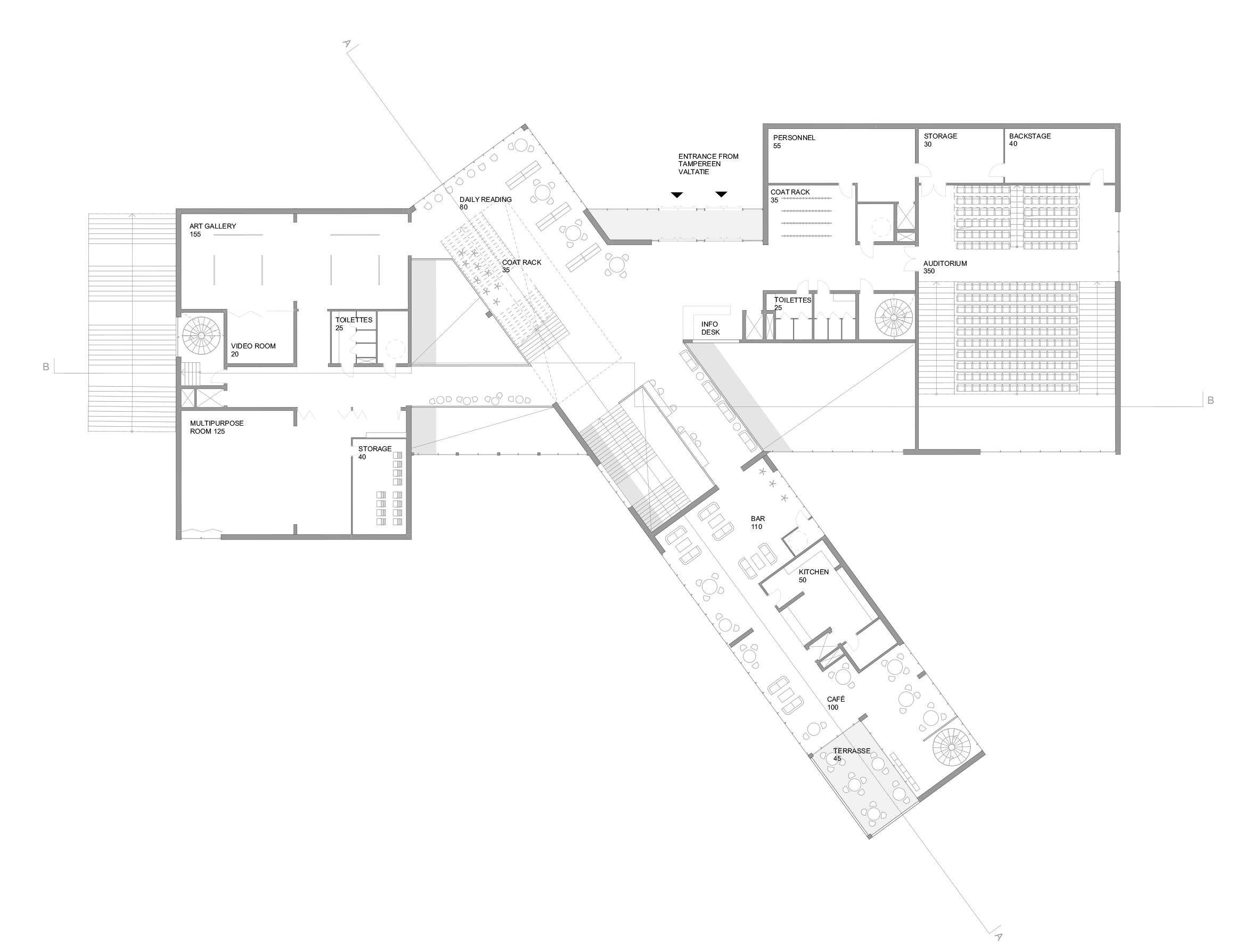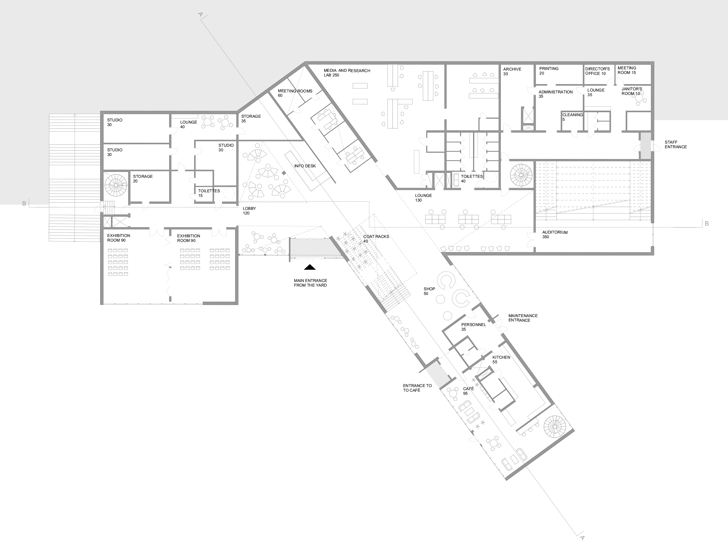 The mass consists of two intersecting pieces. A narrow piece pierces the larger horizontal one into two and divides the building into three almost separate sections. These parts have different characteristics, materials and lighting conditions. The middle part is for commercial use such as cafeteria, bar and consultation whereas the side wings are specifically for exhibitions, research and arts.