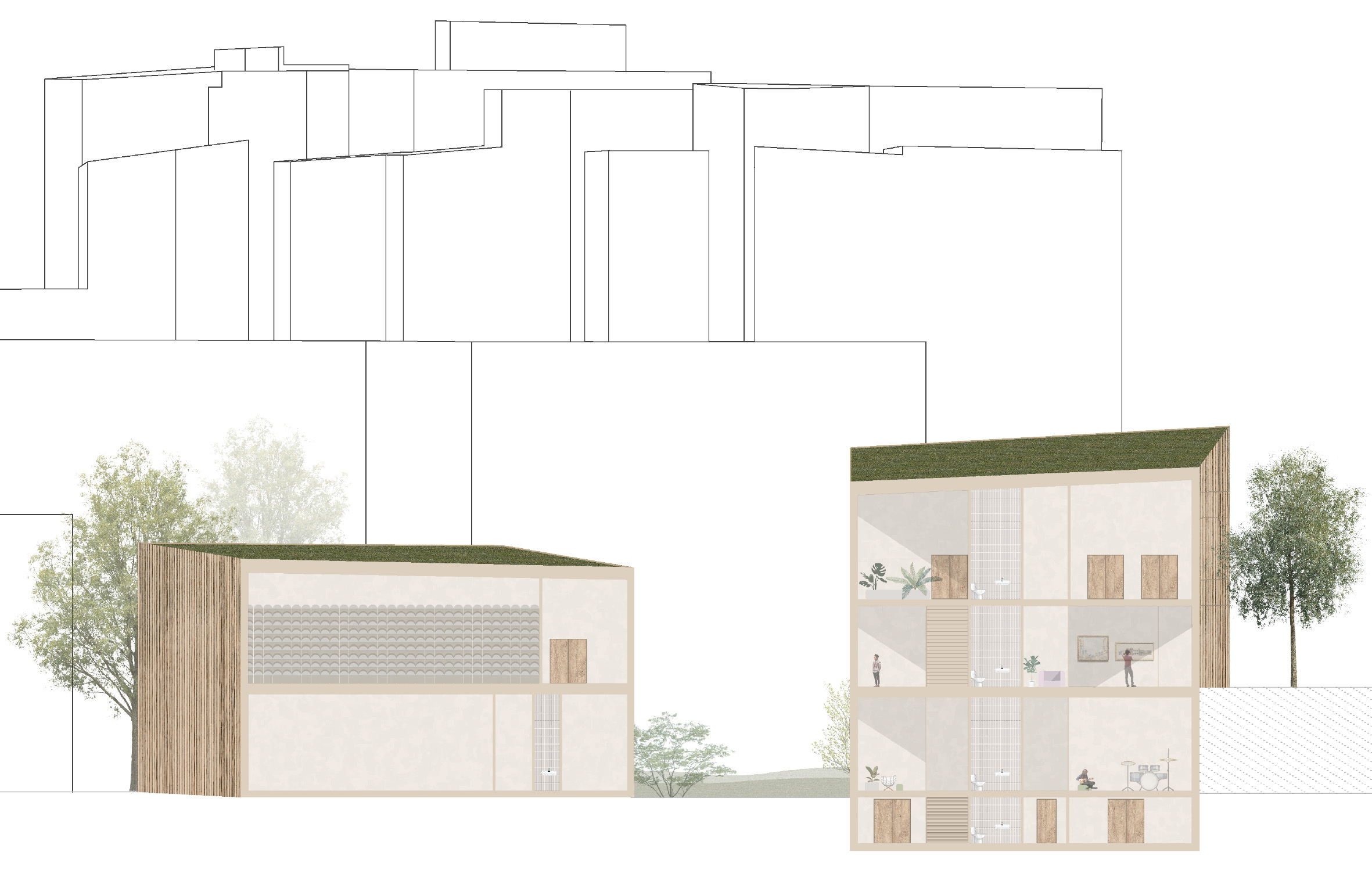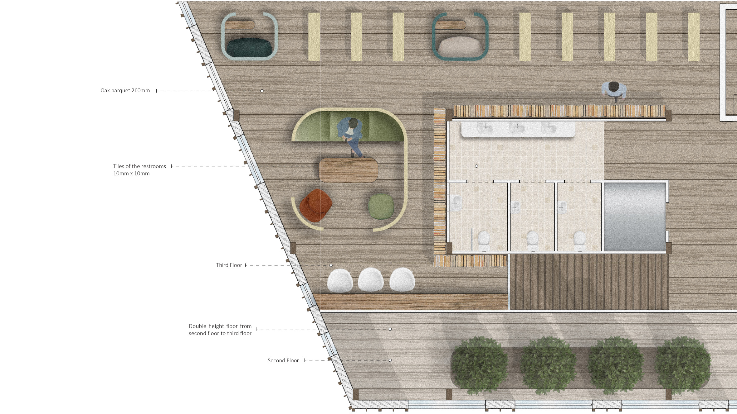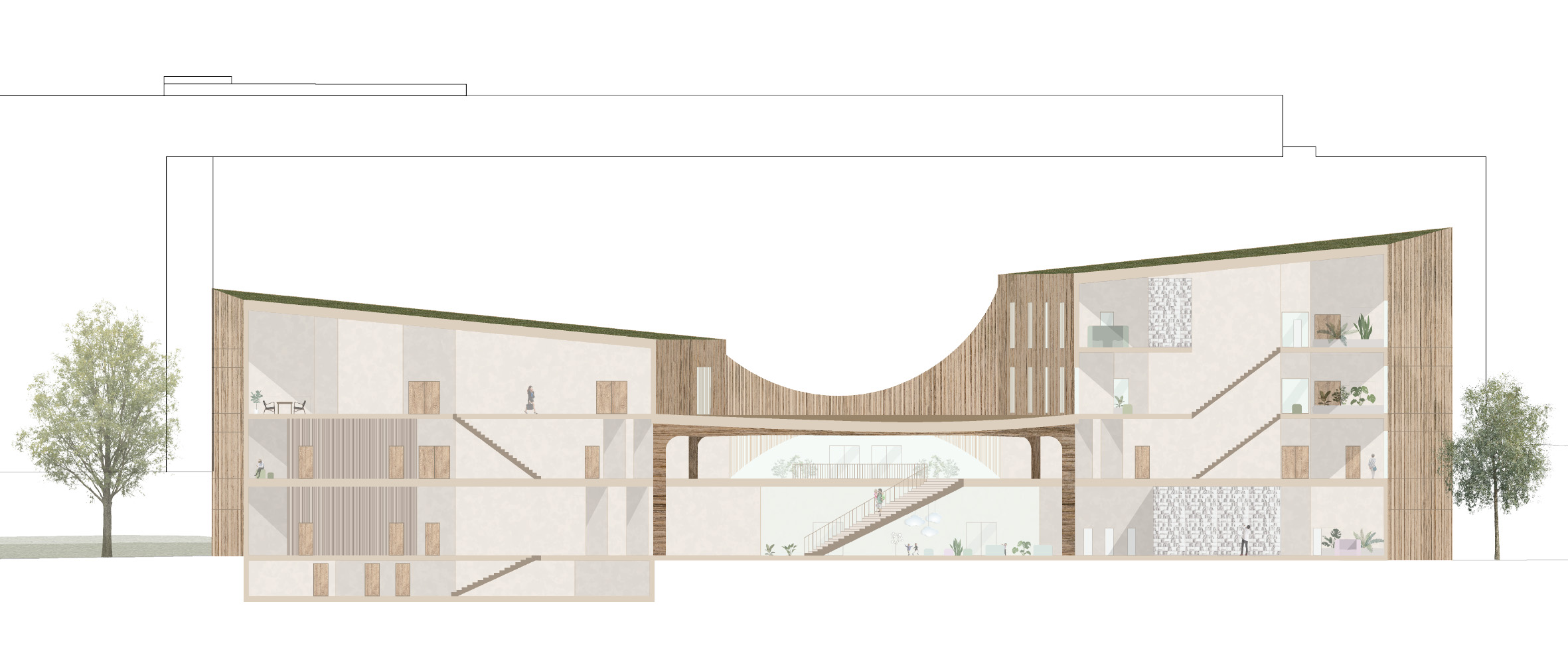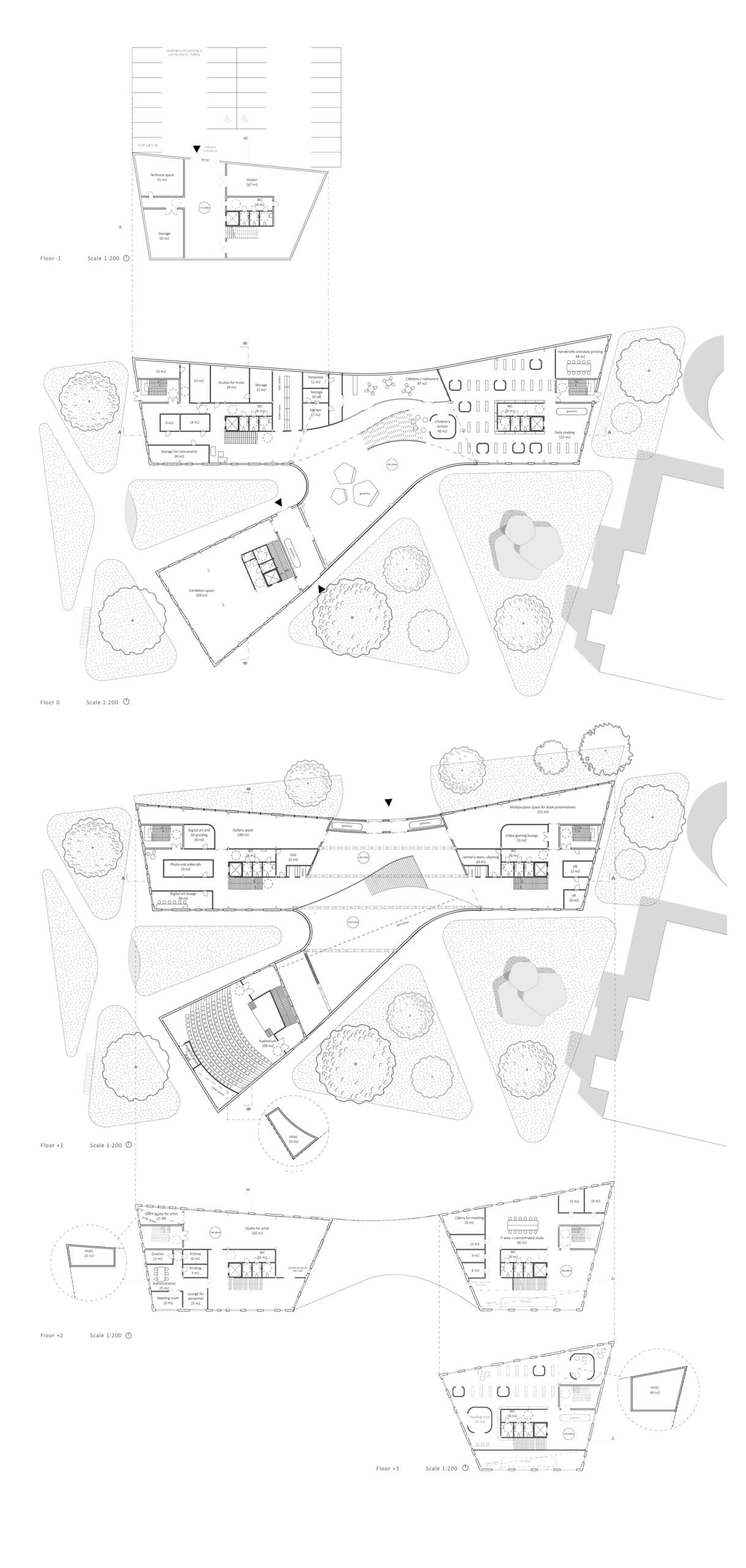 Three angular buildings hide an organic environment where functions overlap to form diverse spaces. Floors 1 and 2 of the building provide shared functions and the sound of living. When moving to the upper floors of the building, the hustle and bustle of everyday life can be left behind and spaces can be used to one’s own projects. Functions are designed so that everyone can find their preferred atmosphere and feeling.