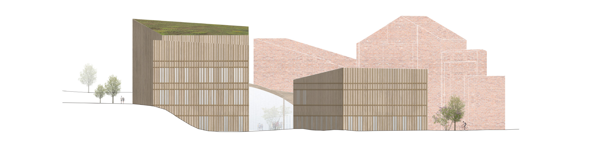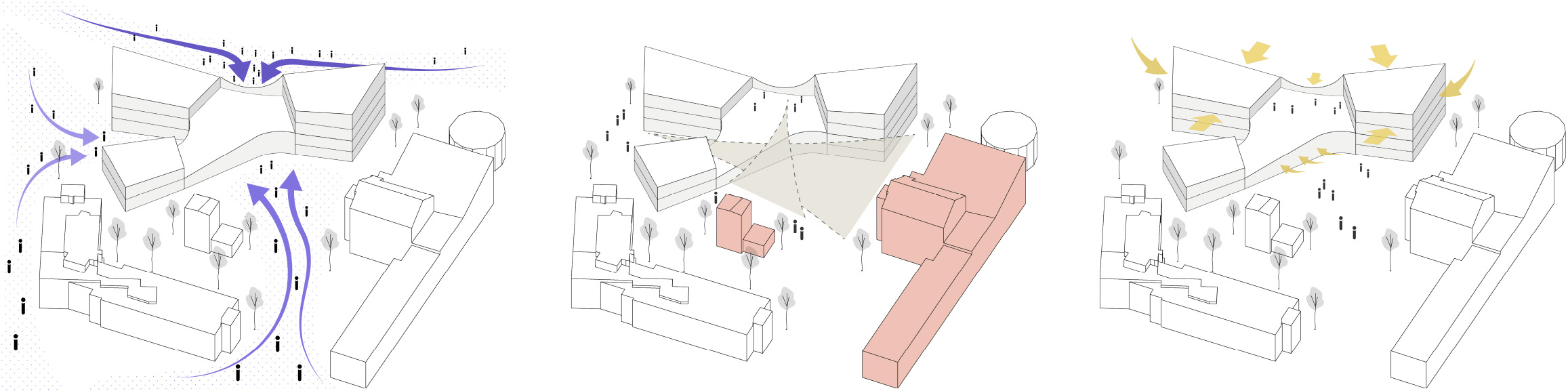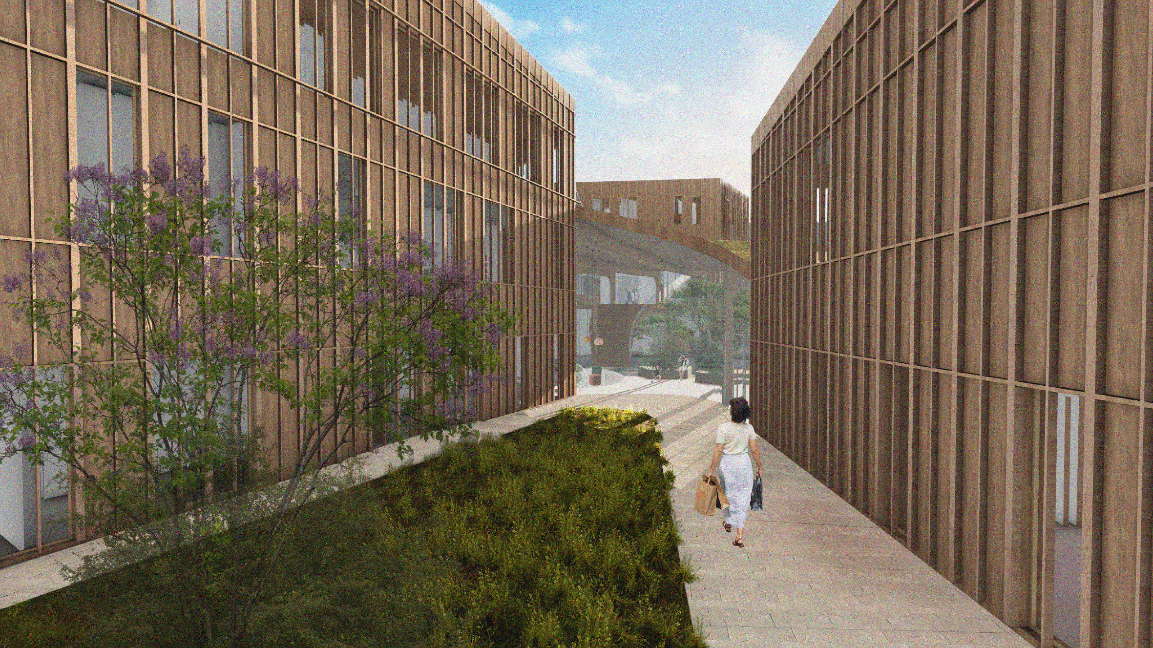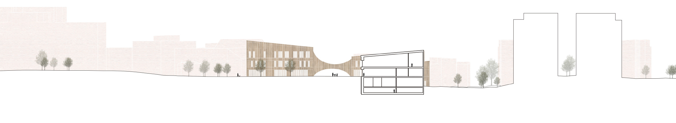 The design area has a central location in the urban network of the city of Tampere. Therefore, we decided to provide multiple entrances and build on multiple levels to ensure the view and connectivity. Natural sunlight played a major role in the massing and positioning of three buildings. Each building has a different height to avoid shading, and the building frame is kept between 14 and 21 meters, which allows the sun to travel through the building.