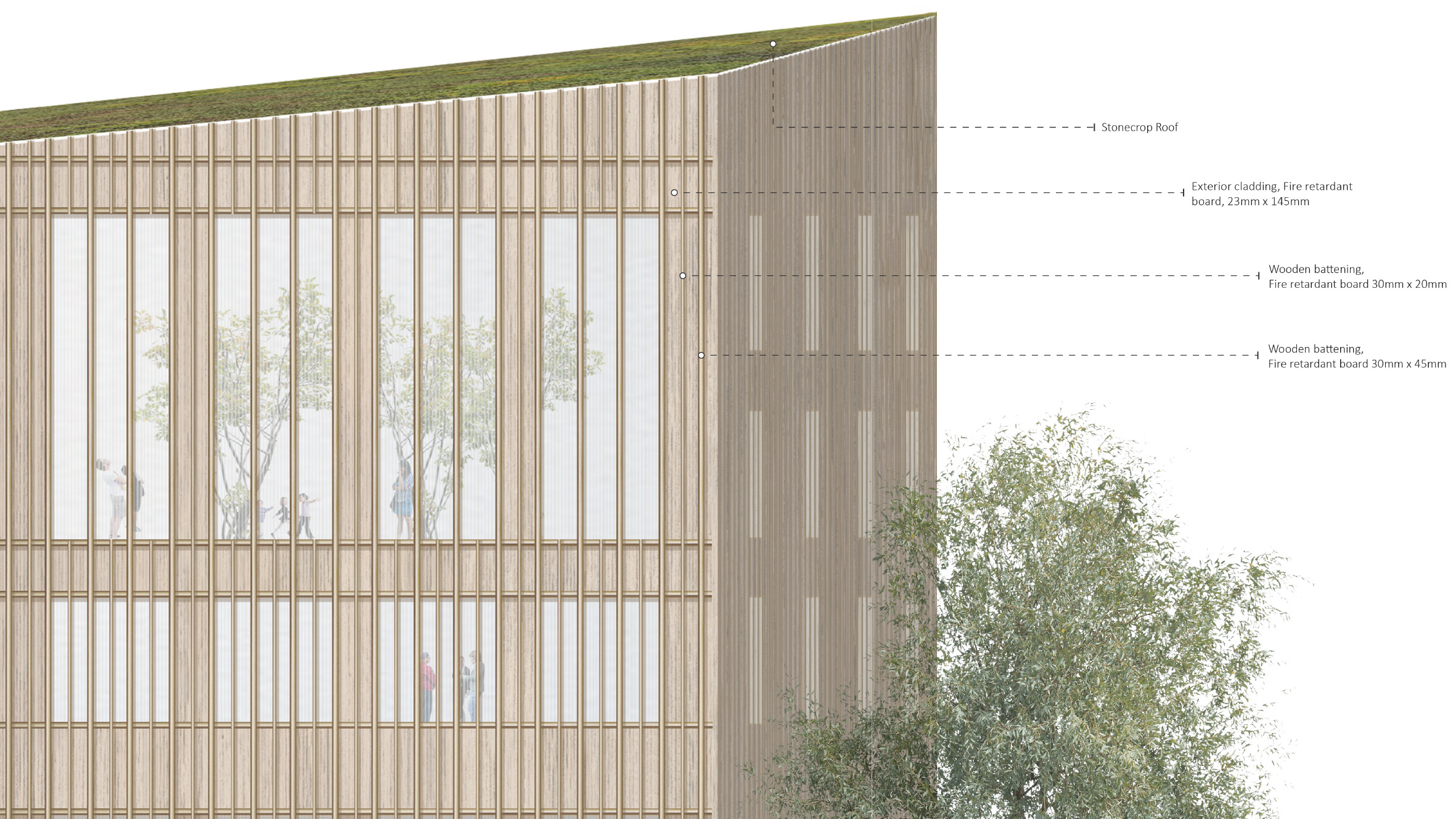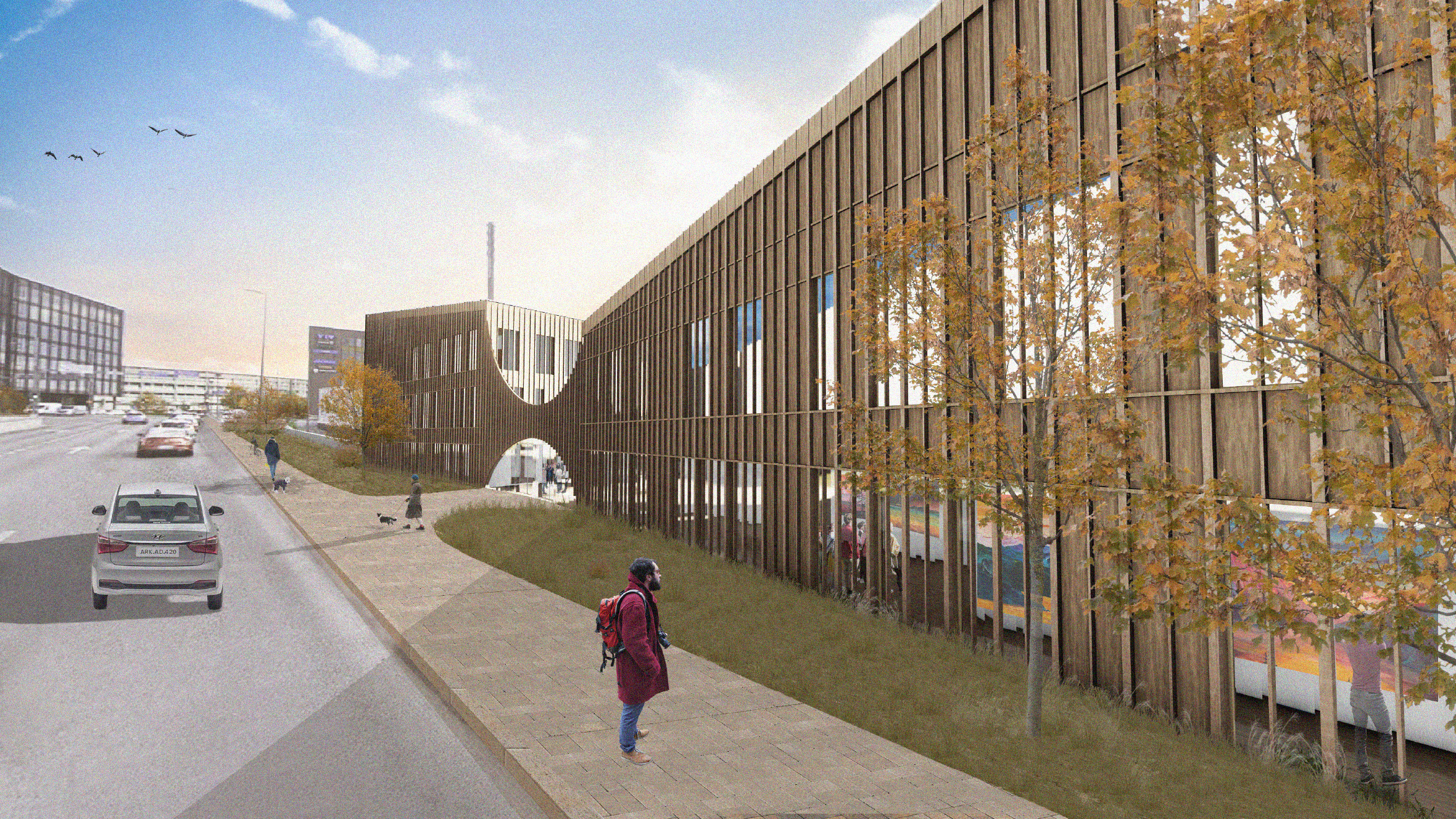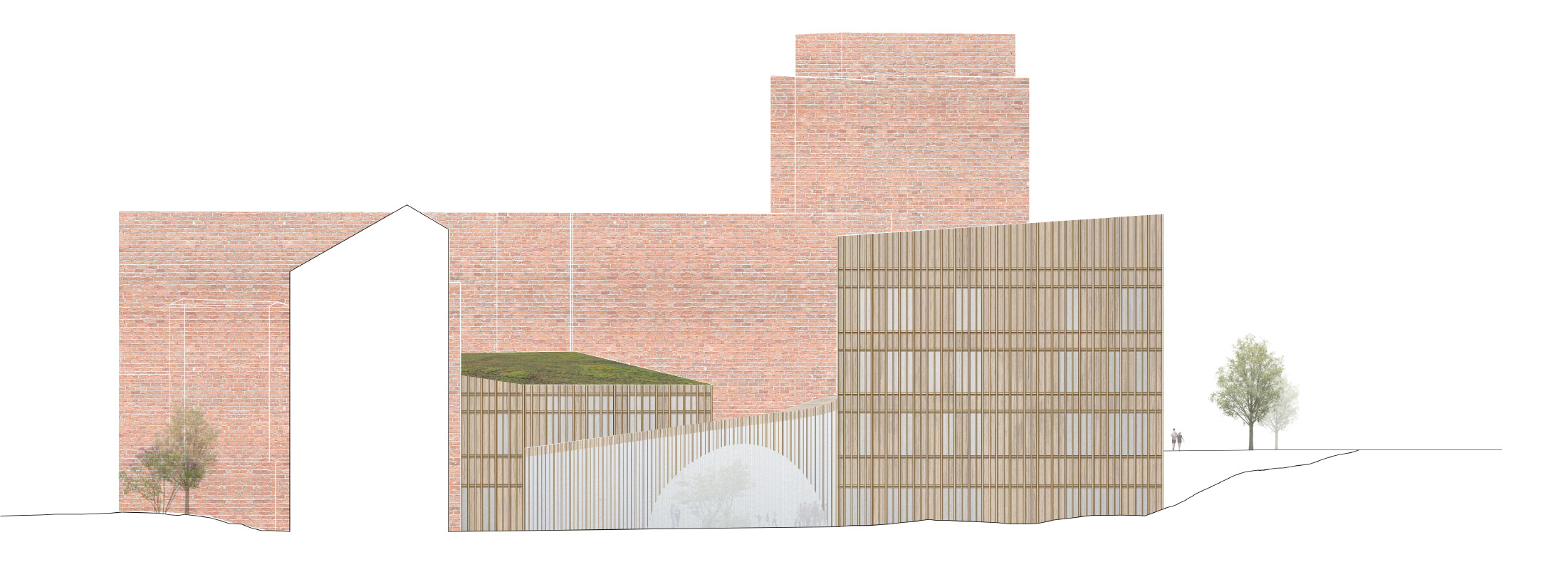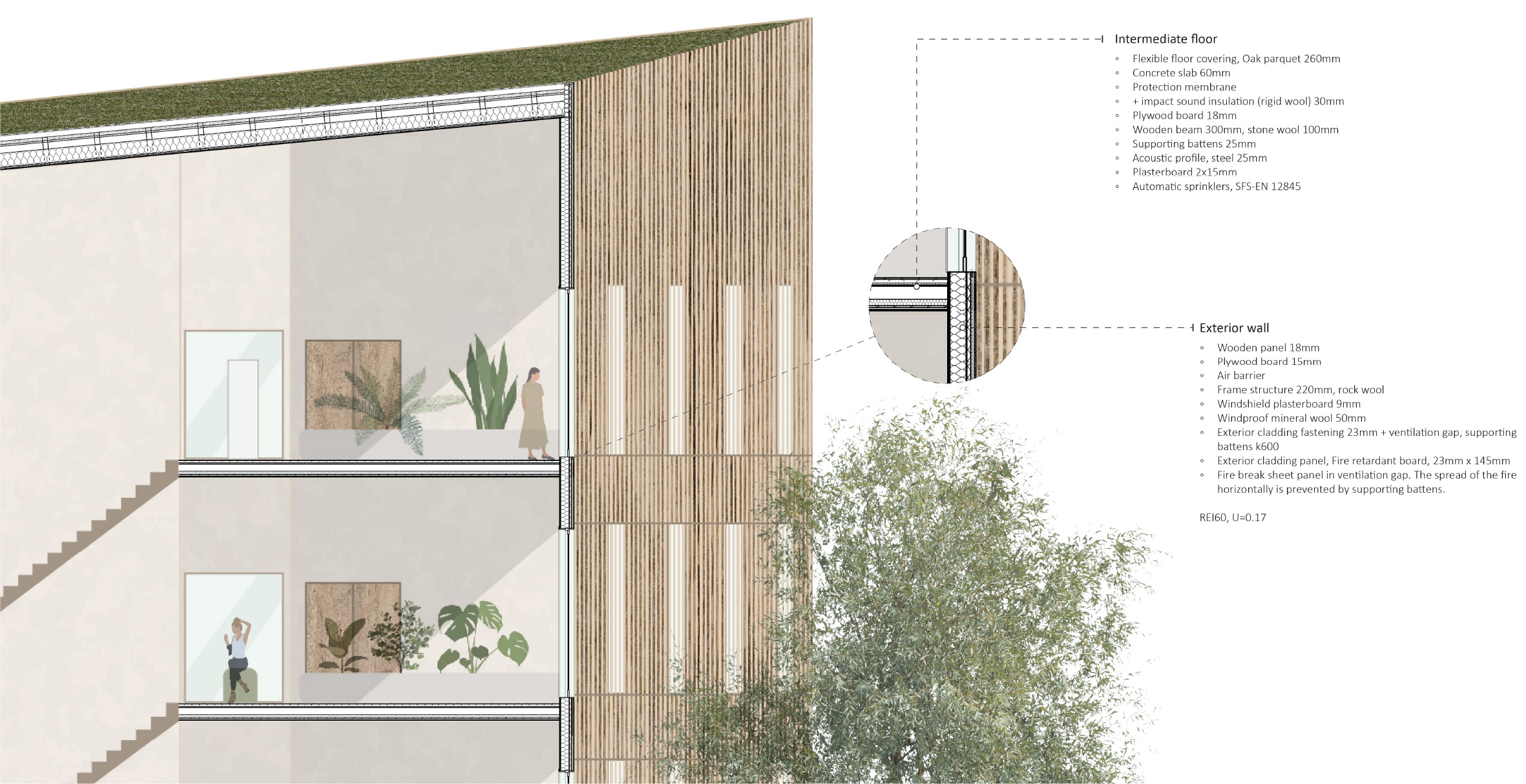 The design area has a central location in the urban network of the city of Tampere. Therefore, we decided to provide multiple entrances and build on multiple levels to ensure the view and connectivity. Natural sunlight played a major role in the massing and positioning of three buildings. Each building has a different height to avoid shading, and the building frame is kept between 14 and 21 meters, which allows the sun to travel through the building.