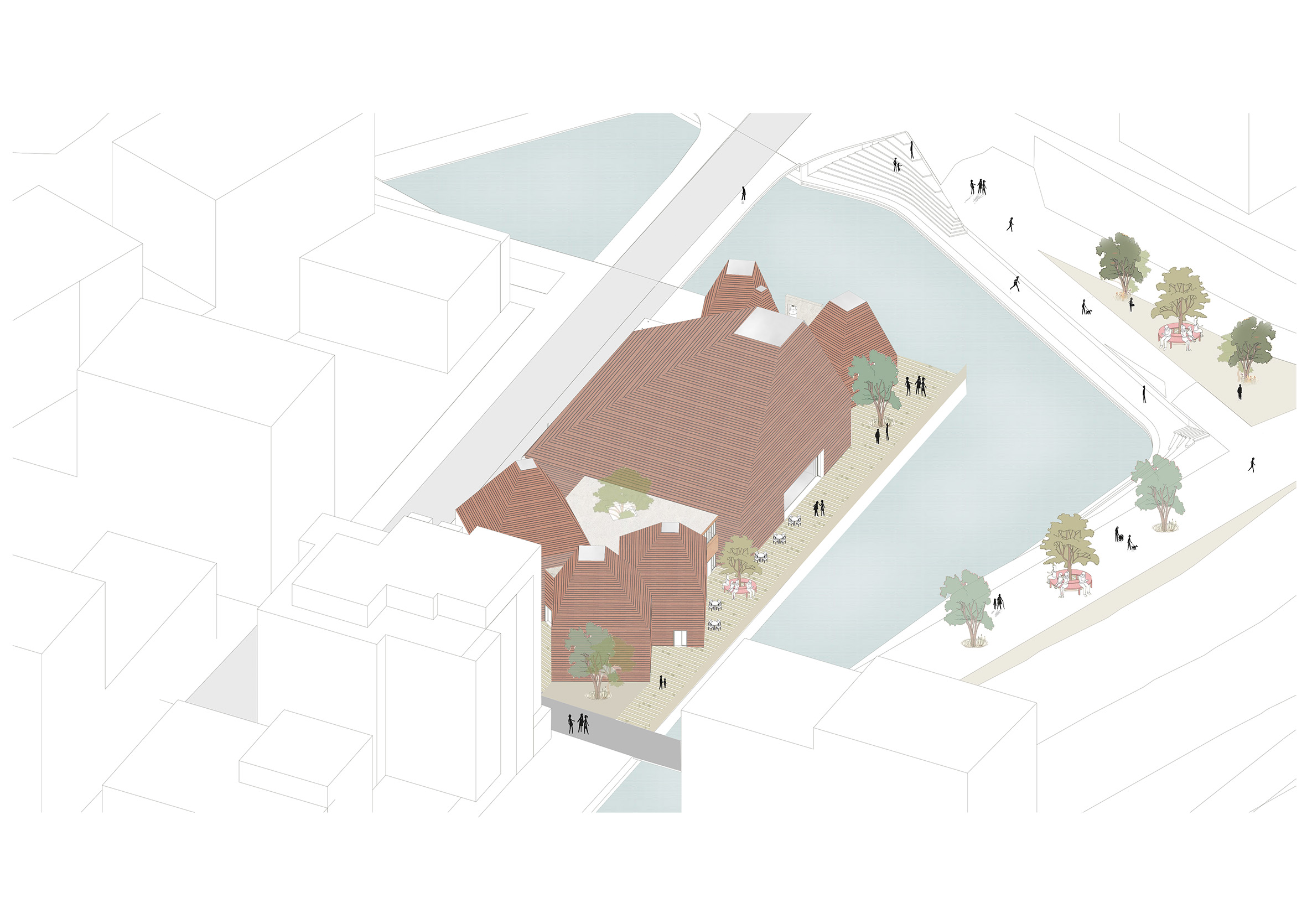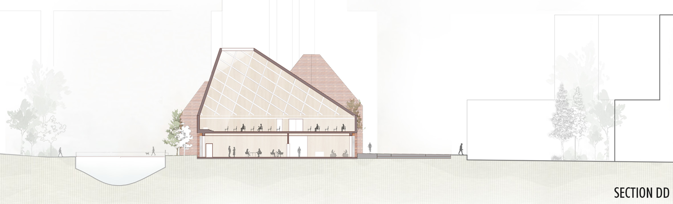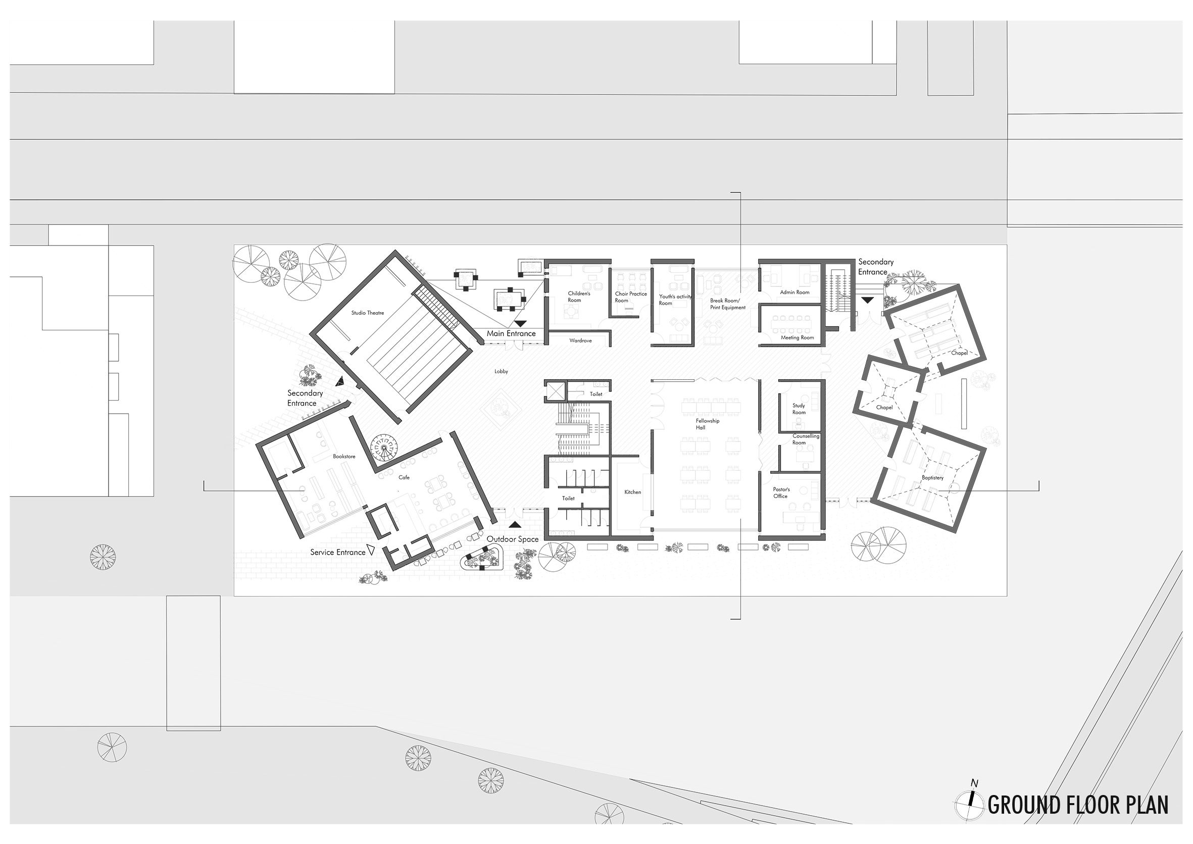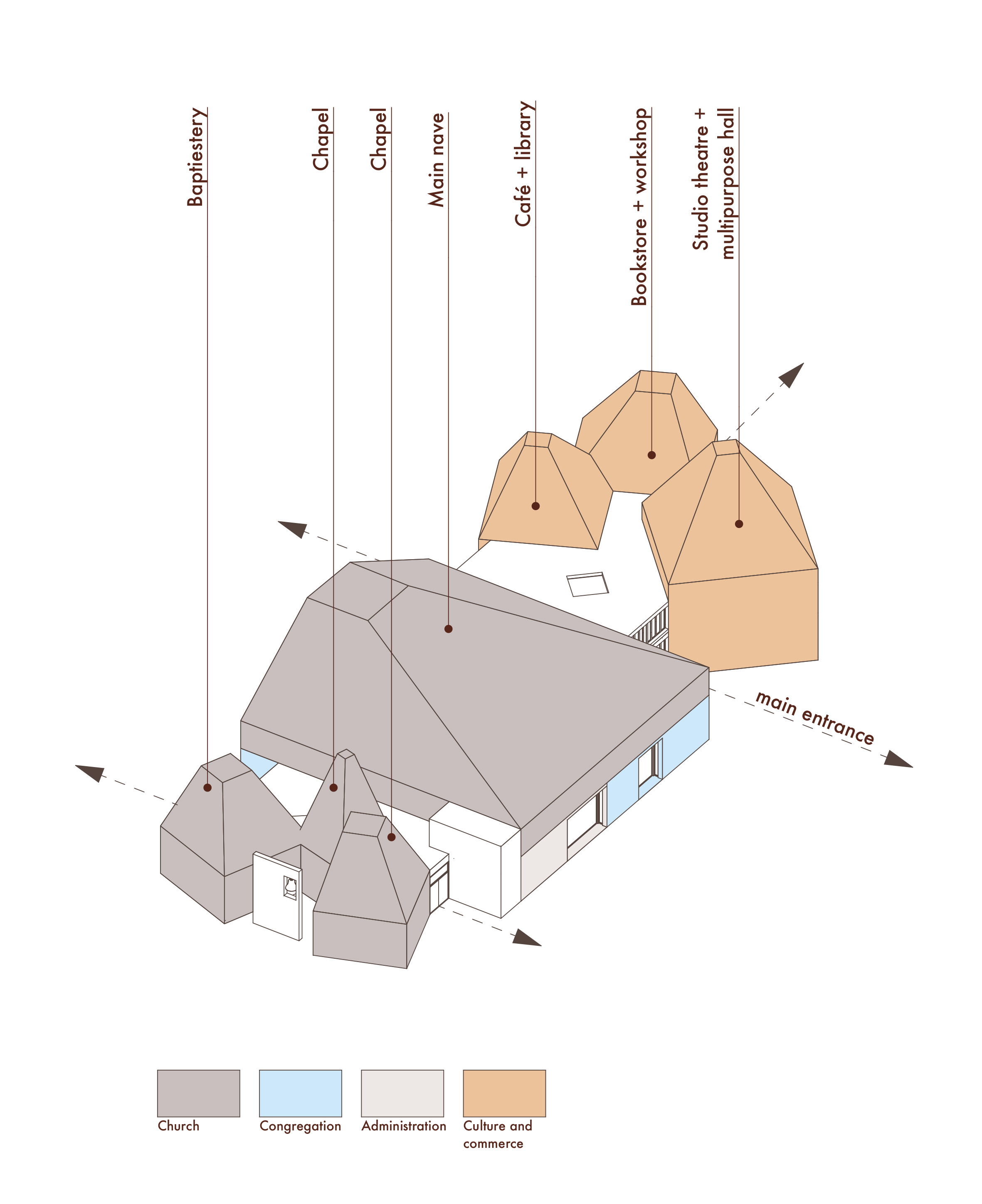The church also extends its vision of inclusivity through diverse outdoor spaces. A communal courtyard serves as a space for gathering. A quiet garden offers a place for silence and prayer, meanwhile, a lively social terrace at the café invites informal interaction and conversation, fostering connection and community.