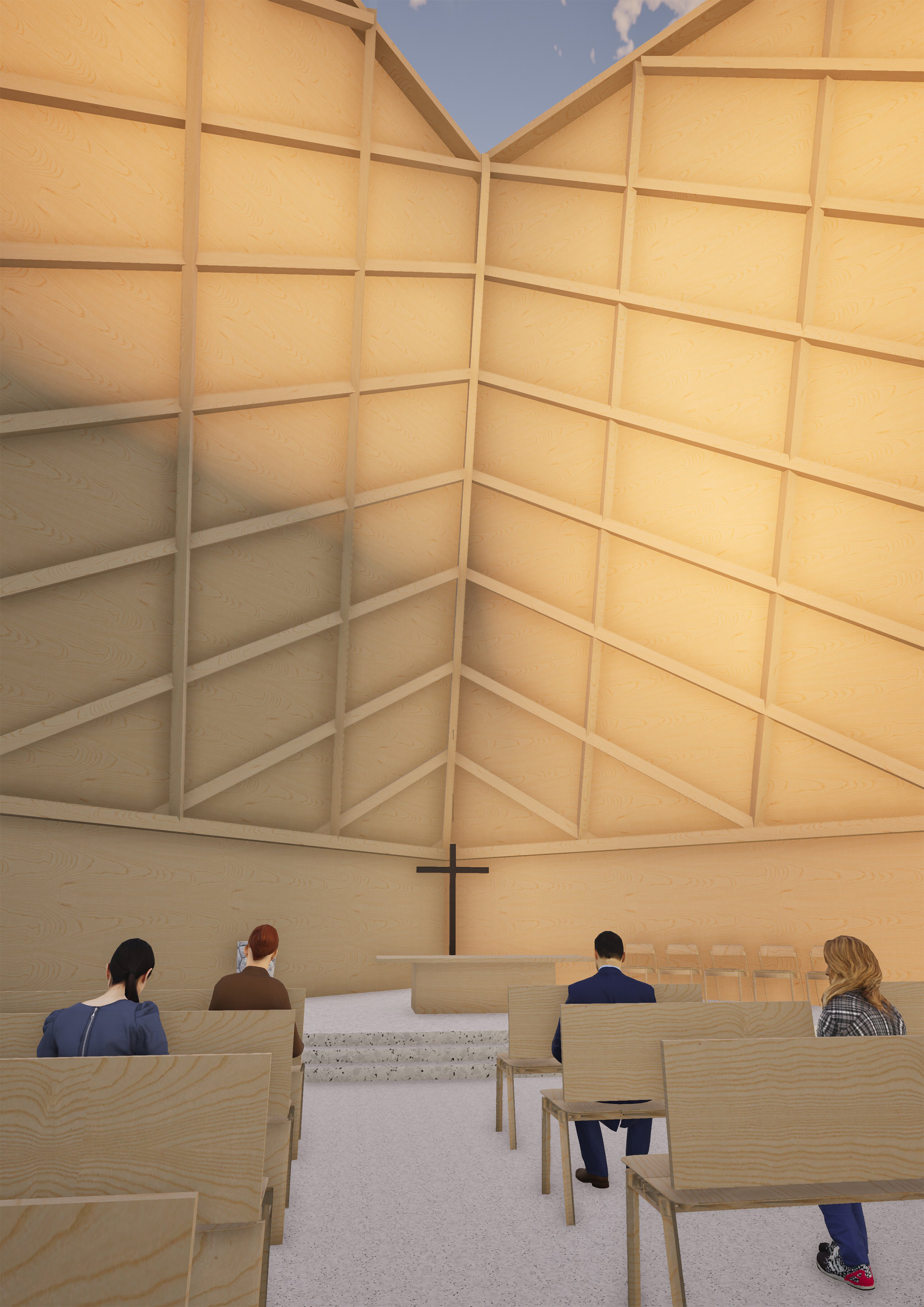Inspired by the way a mushroom opens and grows in the rain, this church becomes a symbol of inclusivity, justice, and warmth. The church imagines a space that grows not through physical expansion but through spirit and intention. Its design captures the lightness and strength of this natural form – rising from the earth and expanding to the sky. Connecting these two is a key architectural feature with a play of the natural light. The roof structure is crowned with a skylight, allowing light to shine the altar as well as the other mushrooms their spaces. This dialogue between light and shadow enhances the sense of wonder and spirituality, evoking the feeling of finding warmth and clarity after a storm.