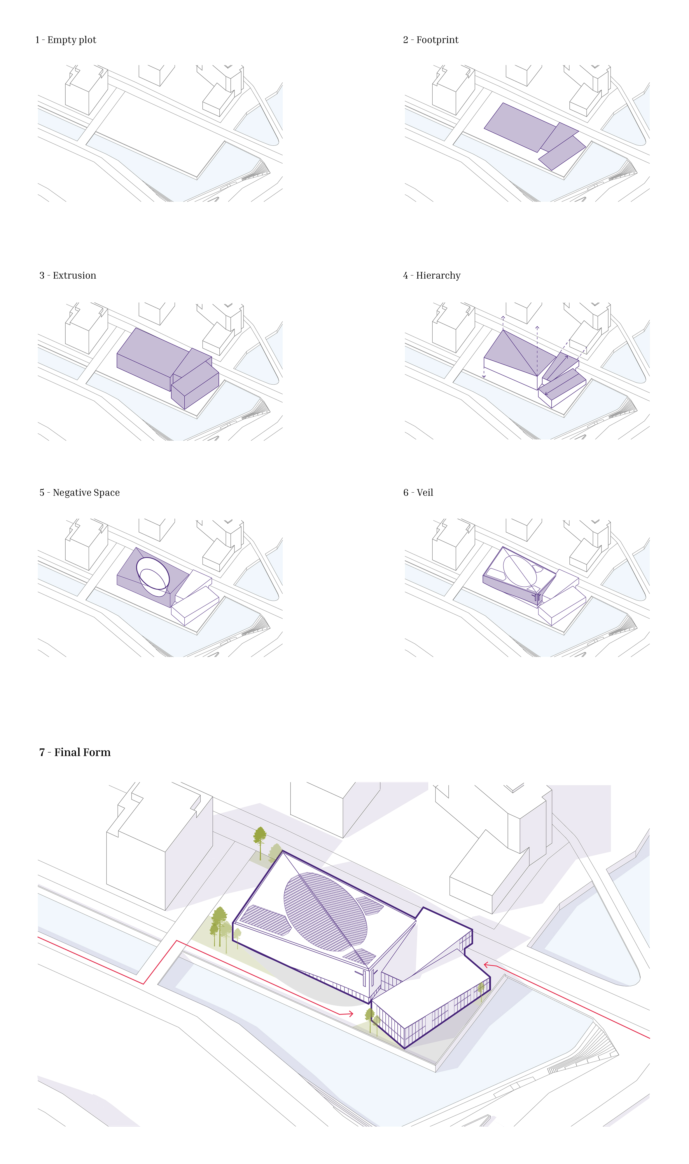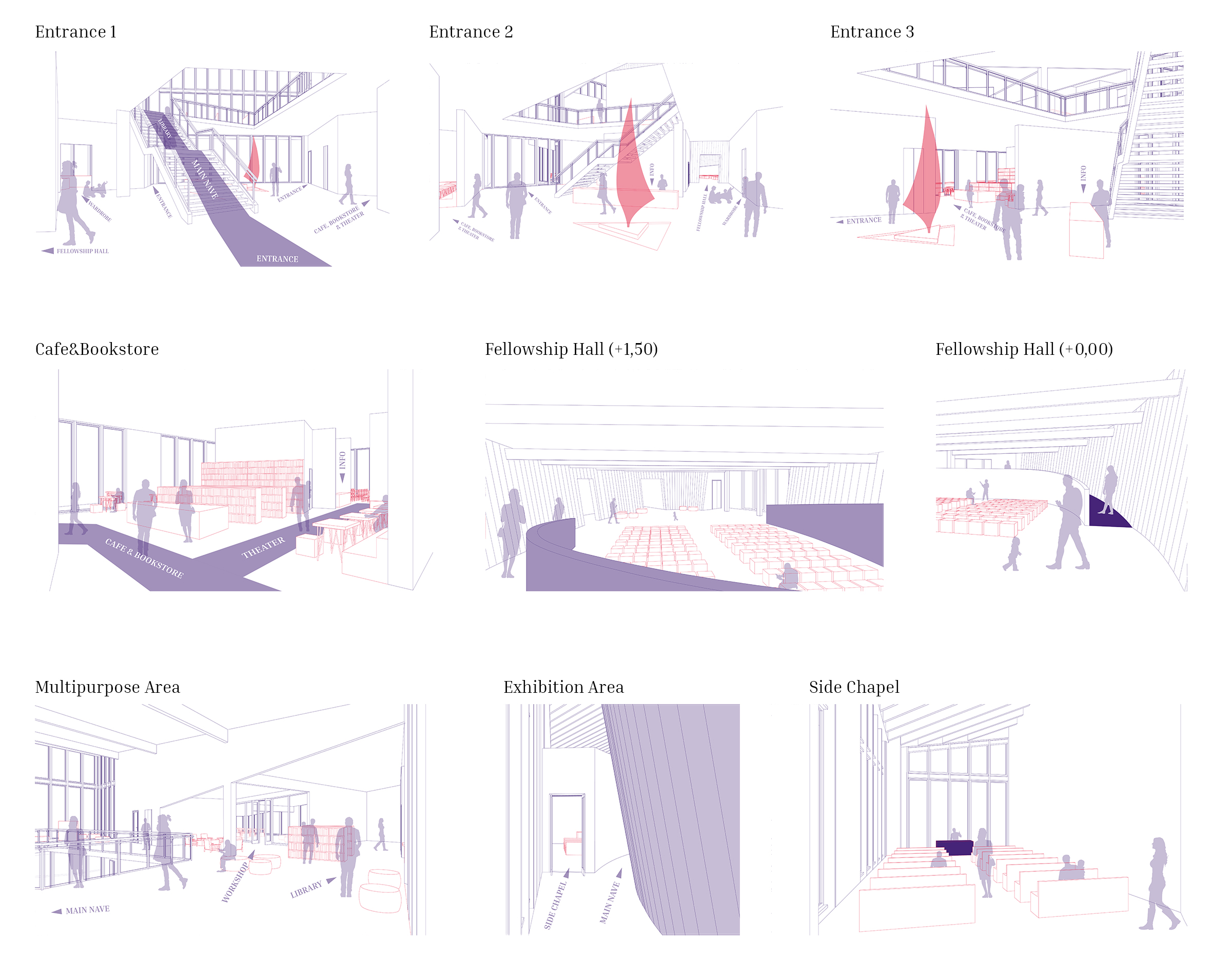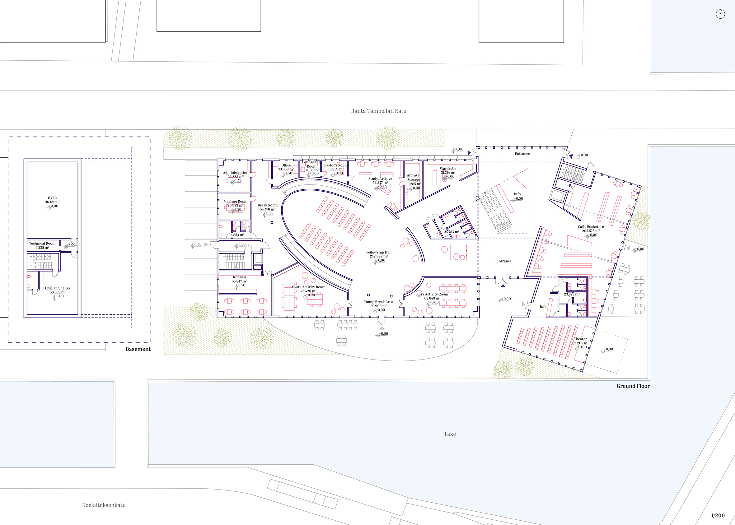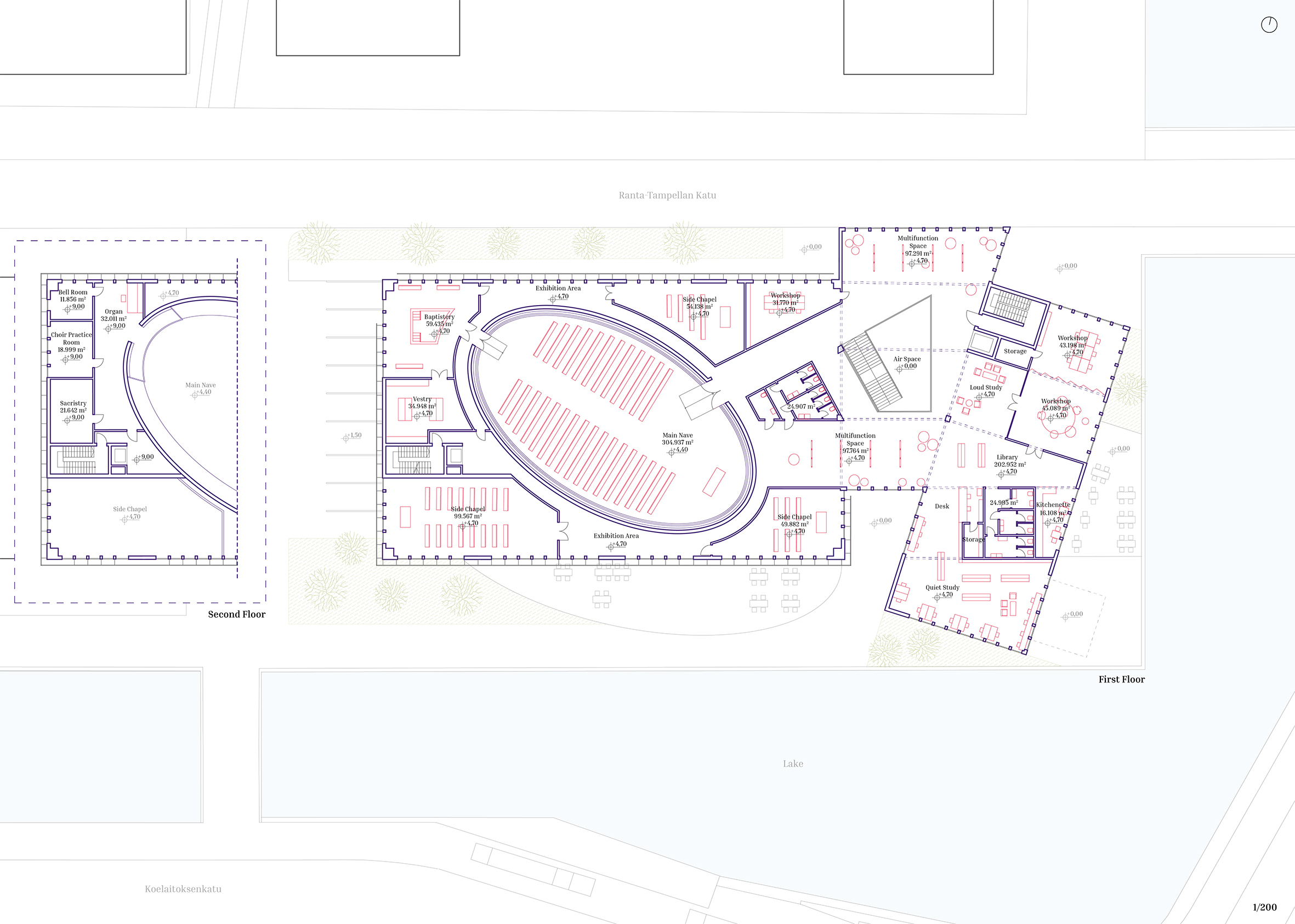 This architectural project envisions a modern-day church in Tampere, Finland, rooted in the biblical narrative of Noah’s Ark. Recognizing the exclusivity of the area, the design seeks to foster inclusivity by addressing contemporary global issues, such as climate change, flooding, and displacement. Drawing parallels between the Ark and the escalating challenges of climate crises and climate refugees, the project aims to create a space where individuals can gather, find safety, and nurture mutual understanding. The central concept positions the church as a metaphorical ship – a sanctuary of refuge and hope. Complementing this is the “harbor,” which houses commercial spaces, and the “dock,” a transitional area that bridges the church and harbor. This symbolic and physical integration reflects the ethos of connecting the sacred with the secular, creating a dynamic space that is welcoming, transformative, and accessible to all. Through its innovative use of metaphors and spatial design, the project not only addresses the urgent need for inclusivity but also emphasizes unity, resilience, and shared human experiences. It aspires to provide a safe haven where people from diverse backgrounds can come together, build connections, and reflect on the shared challenges and opportunities of the future. By blending functionality with meaning, this modern Noah’s Ark offers a beacon of hope and community in an evolving world.