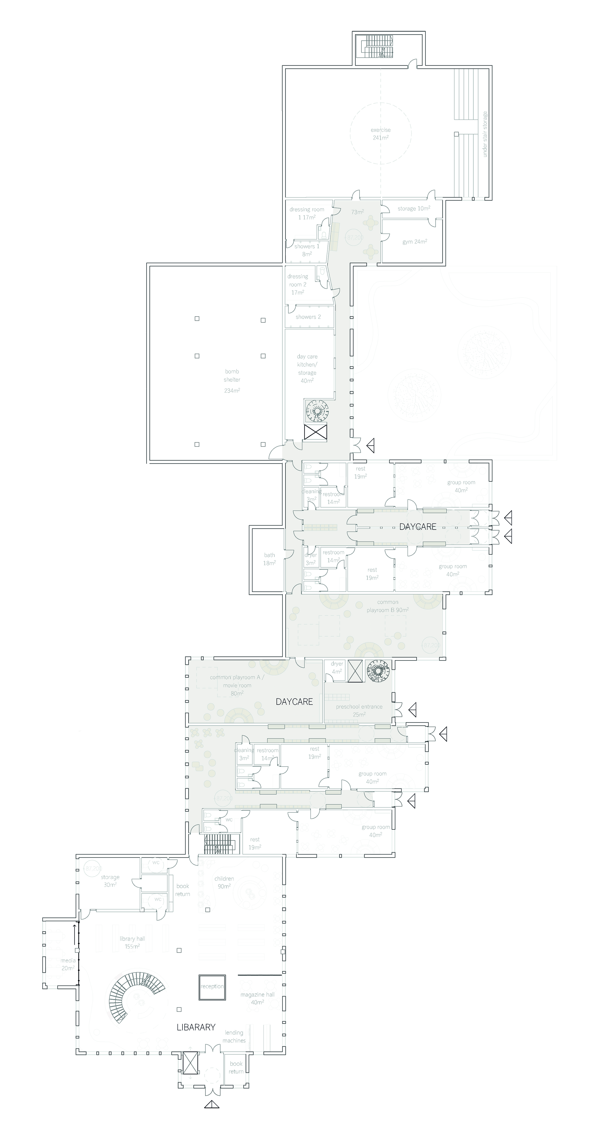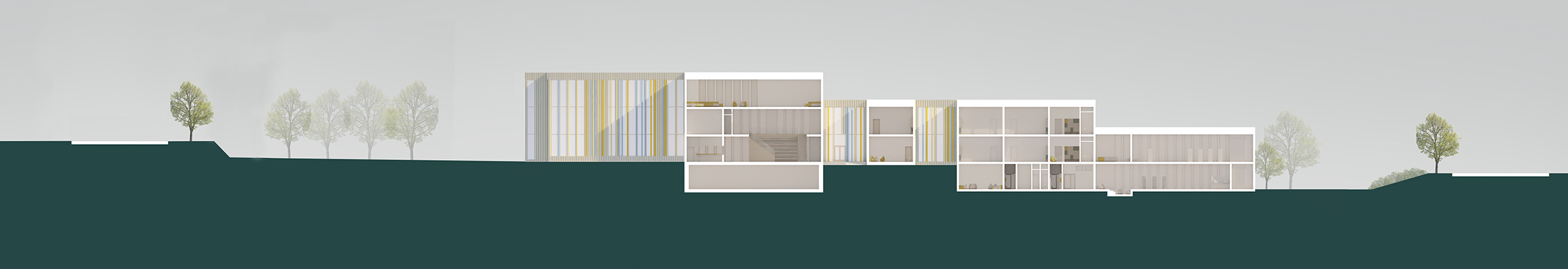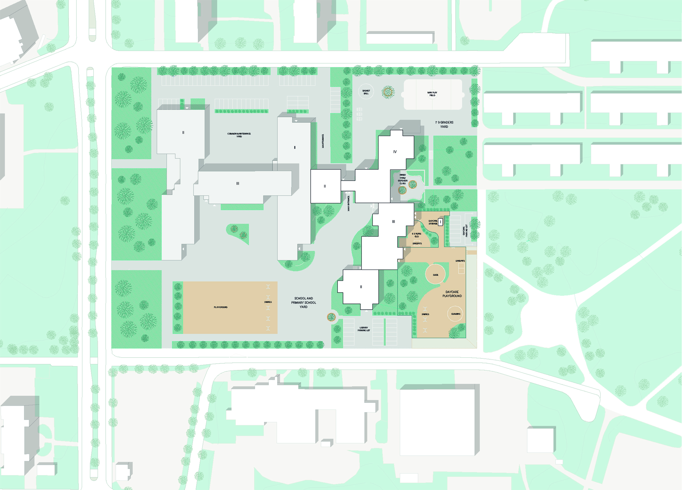 We have also taken advantage of the terrain level differences and modified the terrain to create the best light condition to the indoor and outdoor spaces and to divide the yard and spaces based on the users. Also the building mass flows gently down to the south creating lightness to the mass. The units are placed so that from daycare to the secondary school the mass grows up as the children grow.