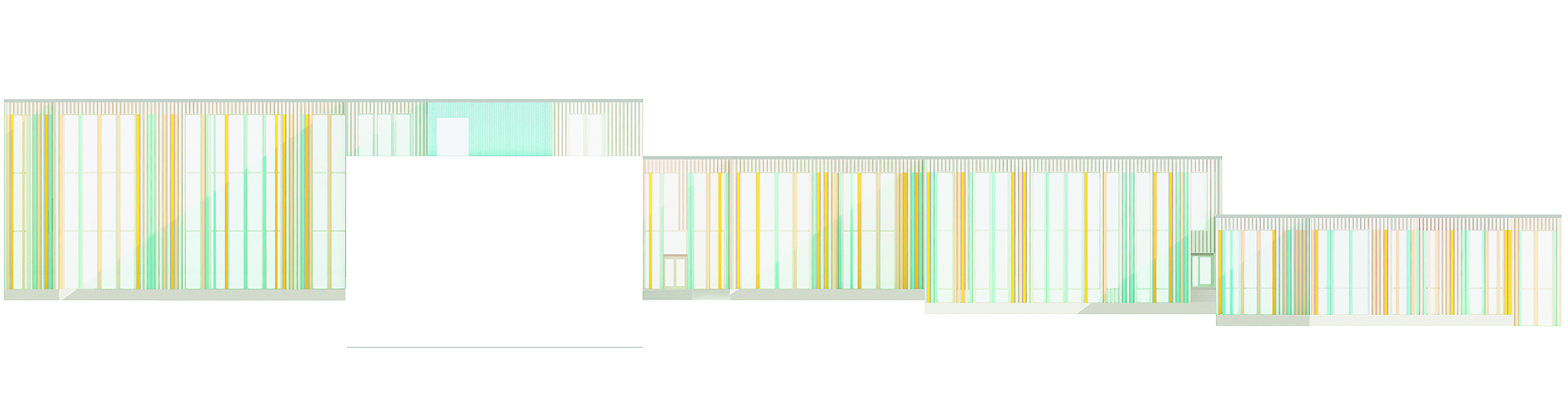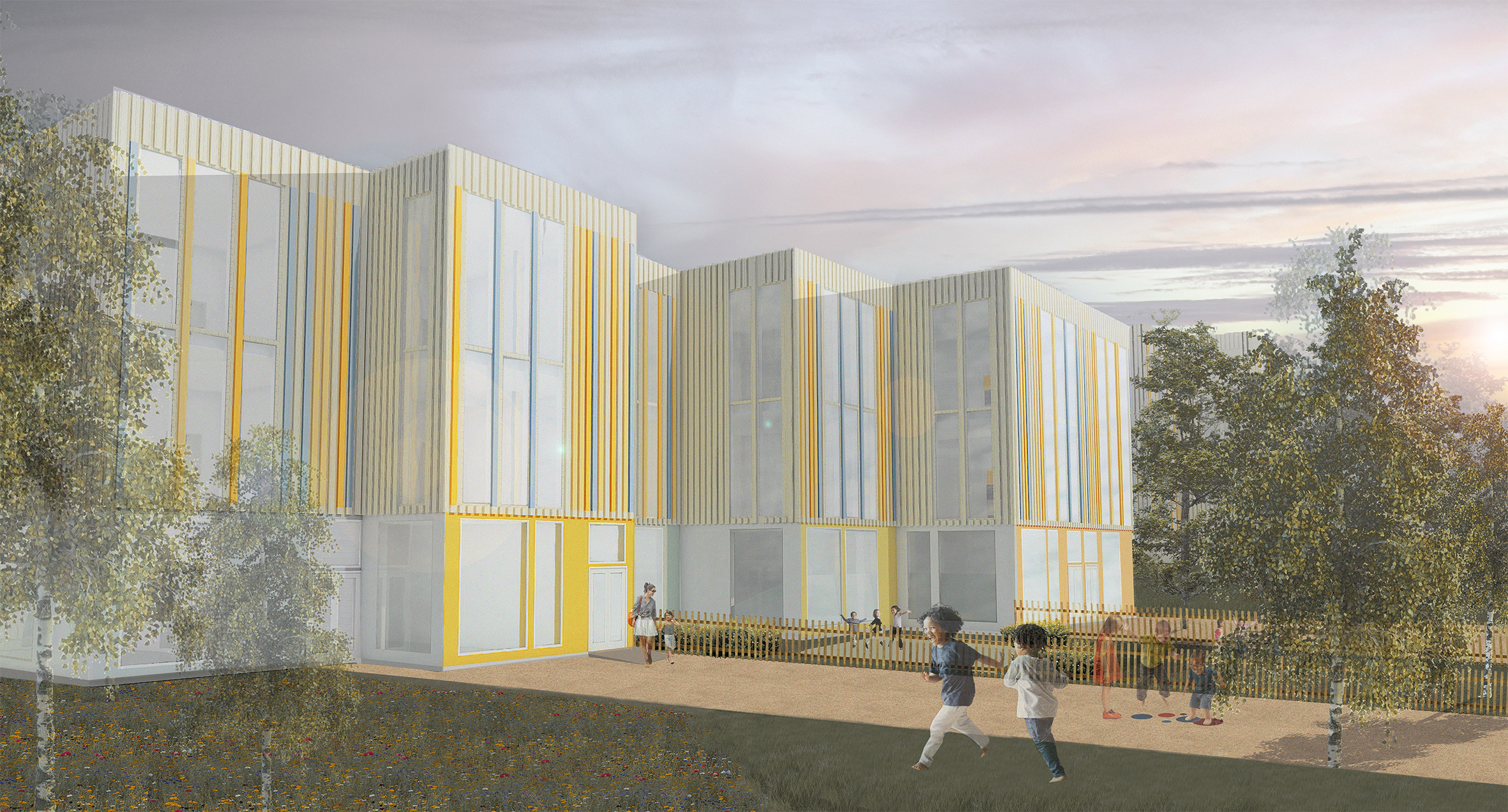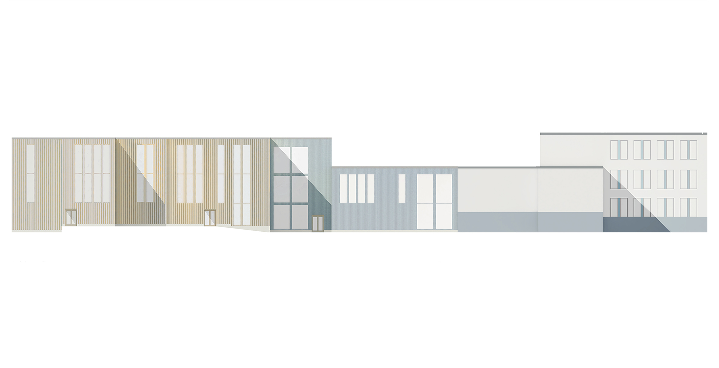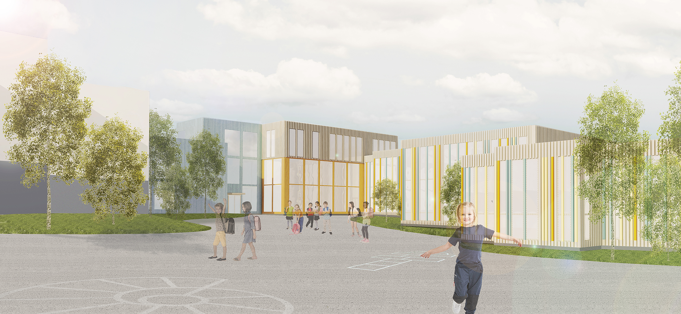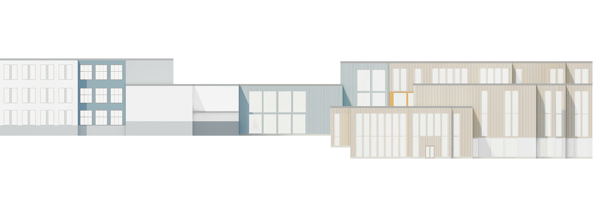 Wood has been used in the facades of the new school building, as it creates a light and contrasting atmosphere when combined with the old facade of Kaukajärvi School. It is also a domestic and ecological material. The colors are inspired by the blue tones of the old school building and are combined with warm yellow/orange tones to create an inspiring and playful school environment.