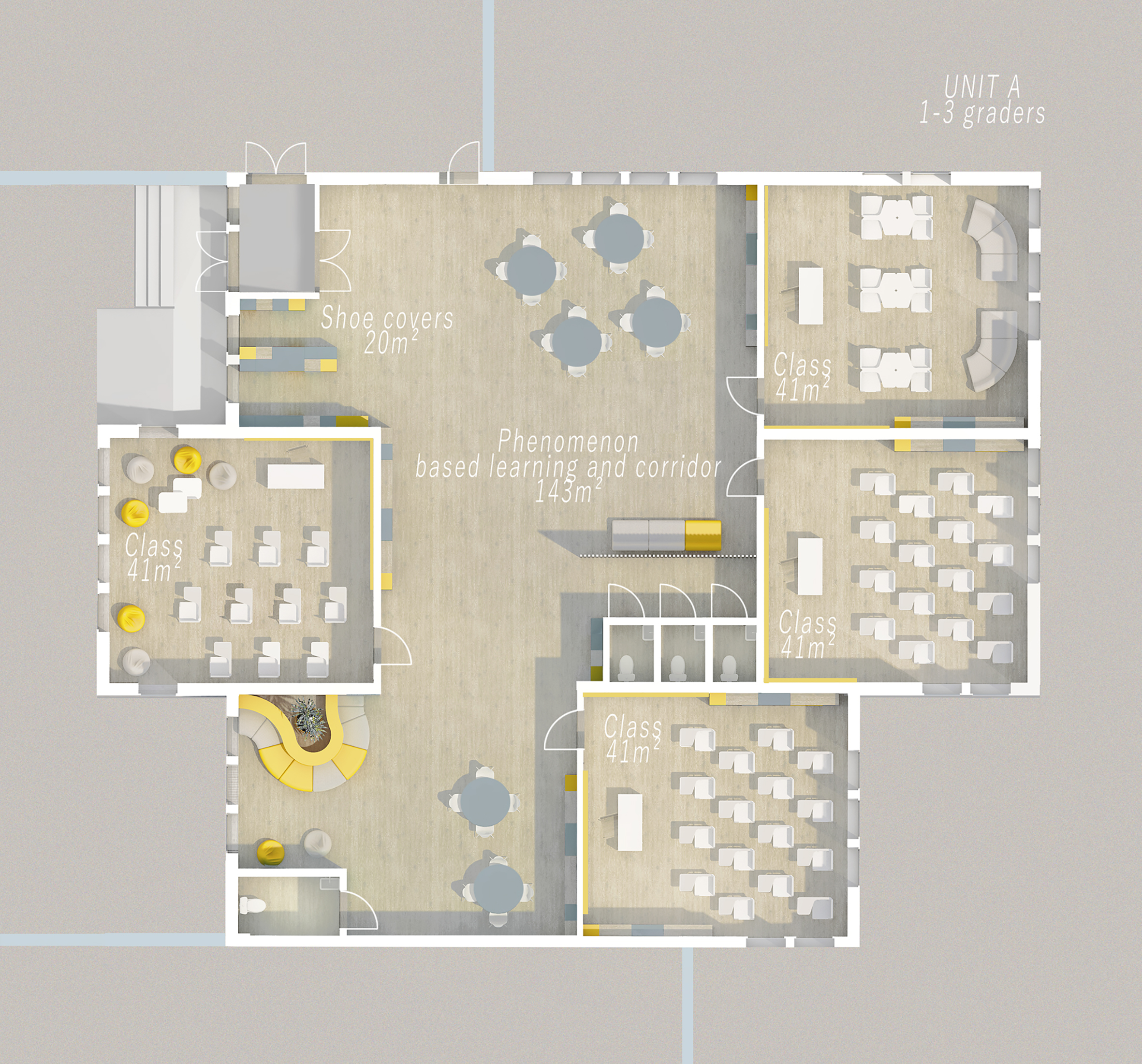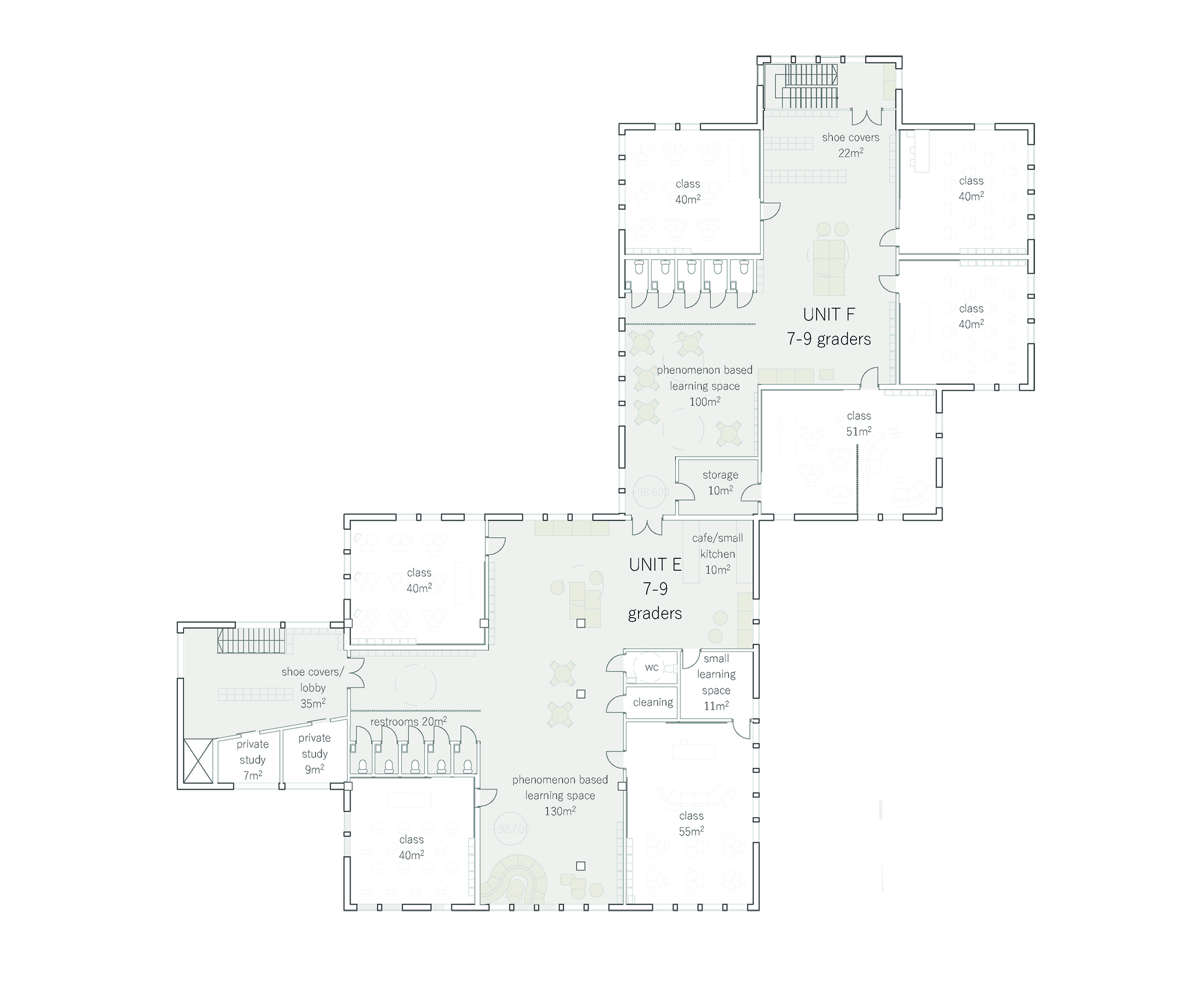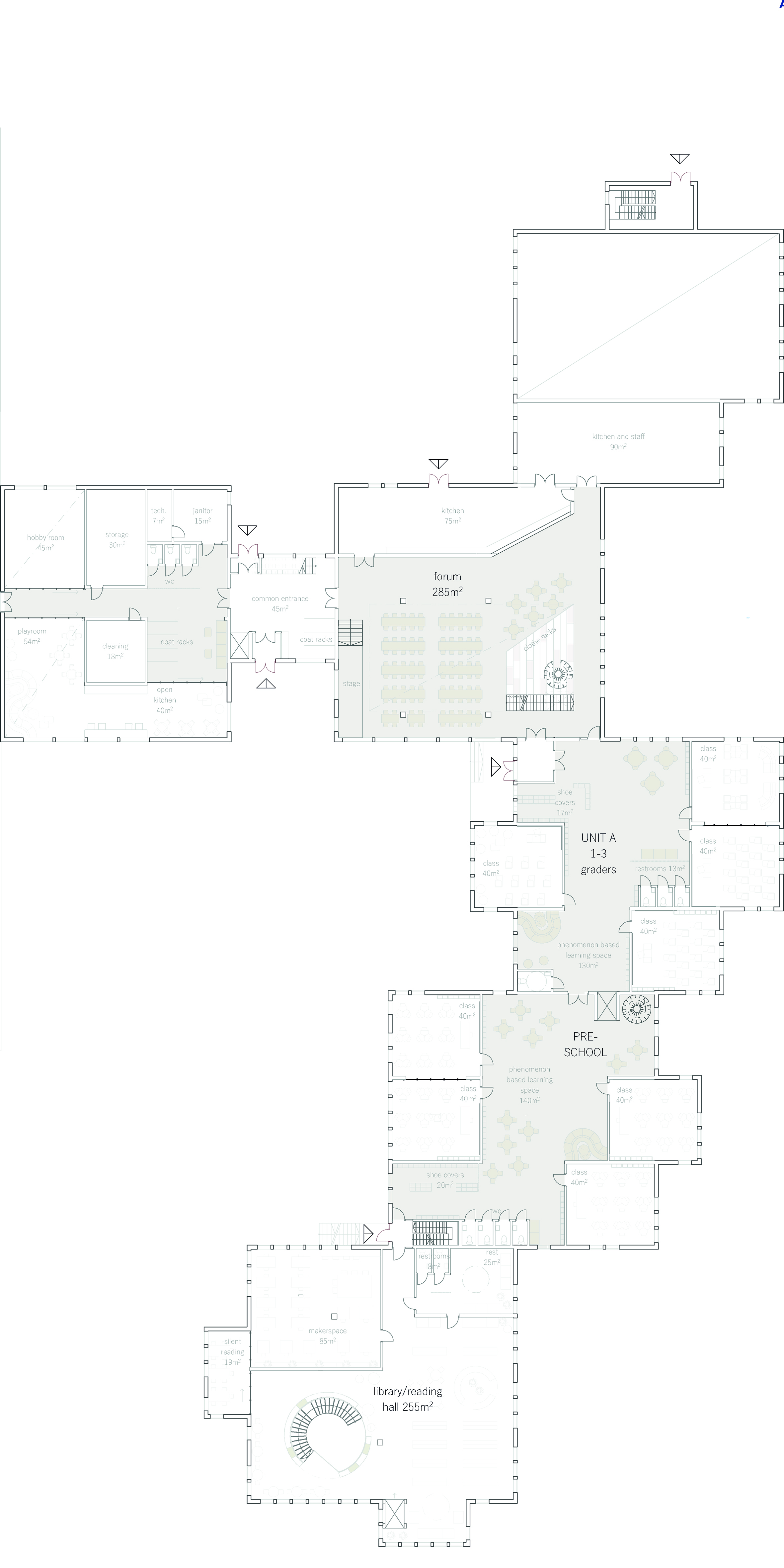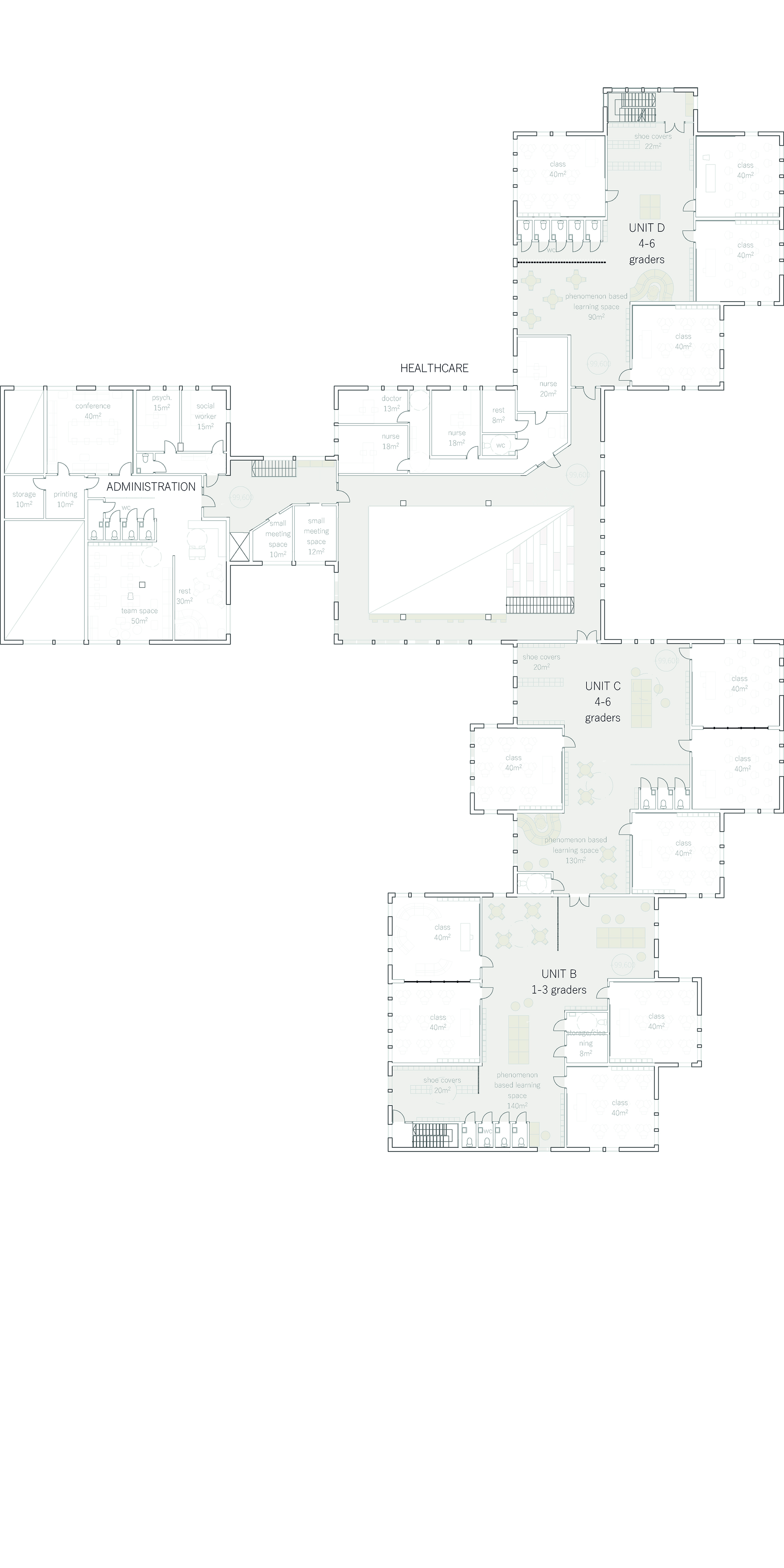 Our main concept and idea was to create inclusive and inspiring learning spaces. We wanted to approach the task with user based design and find the ideal solution for phenomenon based learning and diverse learning methods. We found it important that all of the spaces including the classrooms have lot of natural light, a spacious feel to them and different options and study corners for learning. We wanted the greenery of the nearby park to continue to the plot and be seen from the inside as well, as nature and greenery can benefit the well-being of the students and it adds to the openness and lightness of the units.