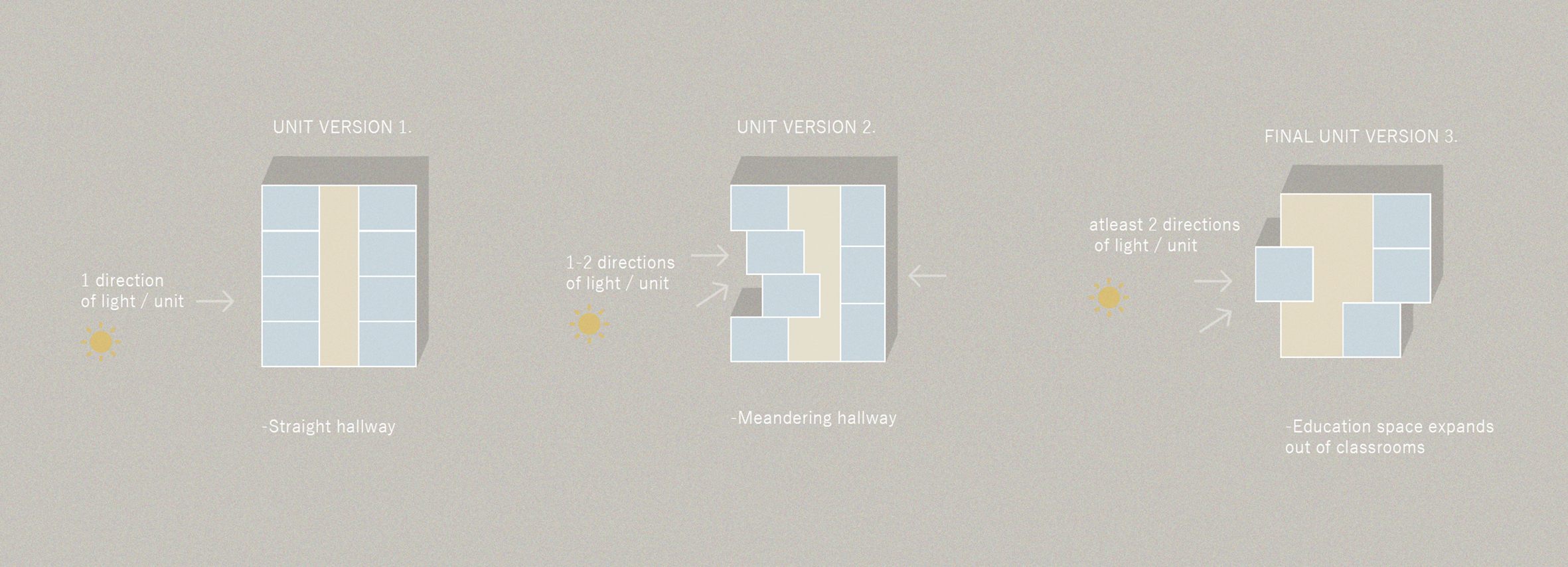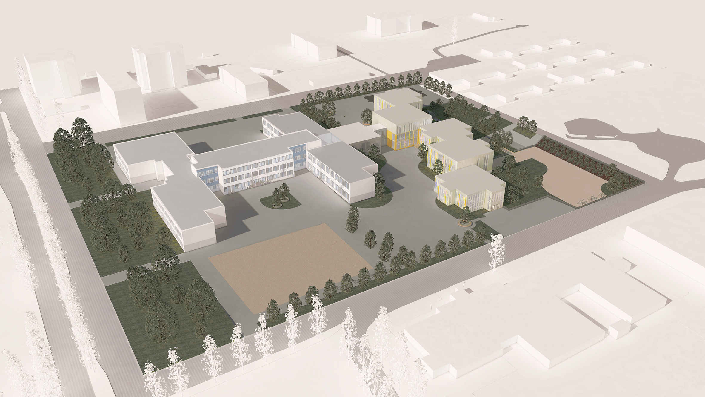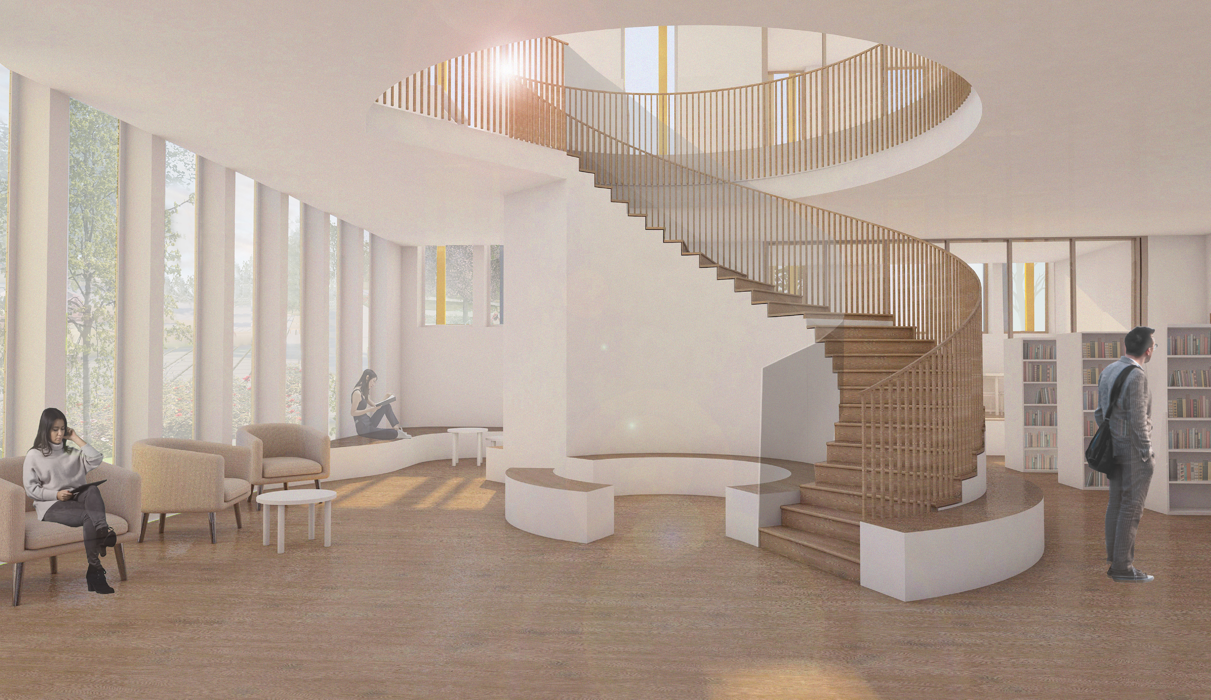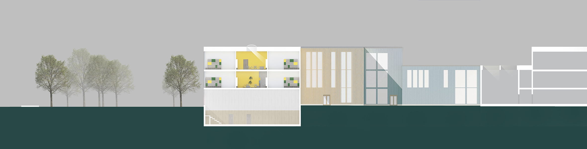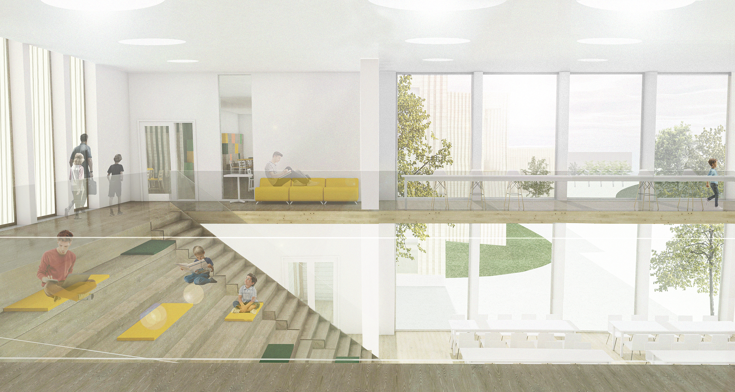 Our main concept and idea was to create inclusive and inspiring learning spaces. We wanted to approach the task with user based design and find the ideal solution for phenomenon based learning and diverse learning methods. We found it important that all of the spaces including the classrooms have lot of natural light, a spacious feel to them and different options and study corners for learning. We wanted the greenery of the nearby park to continue to the plot and be seen from the inside as well, as nature and greenery can benefit the well-being of the students and it adds to the openness and lightness of the units.