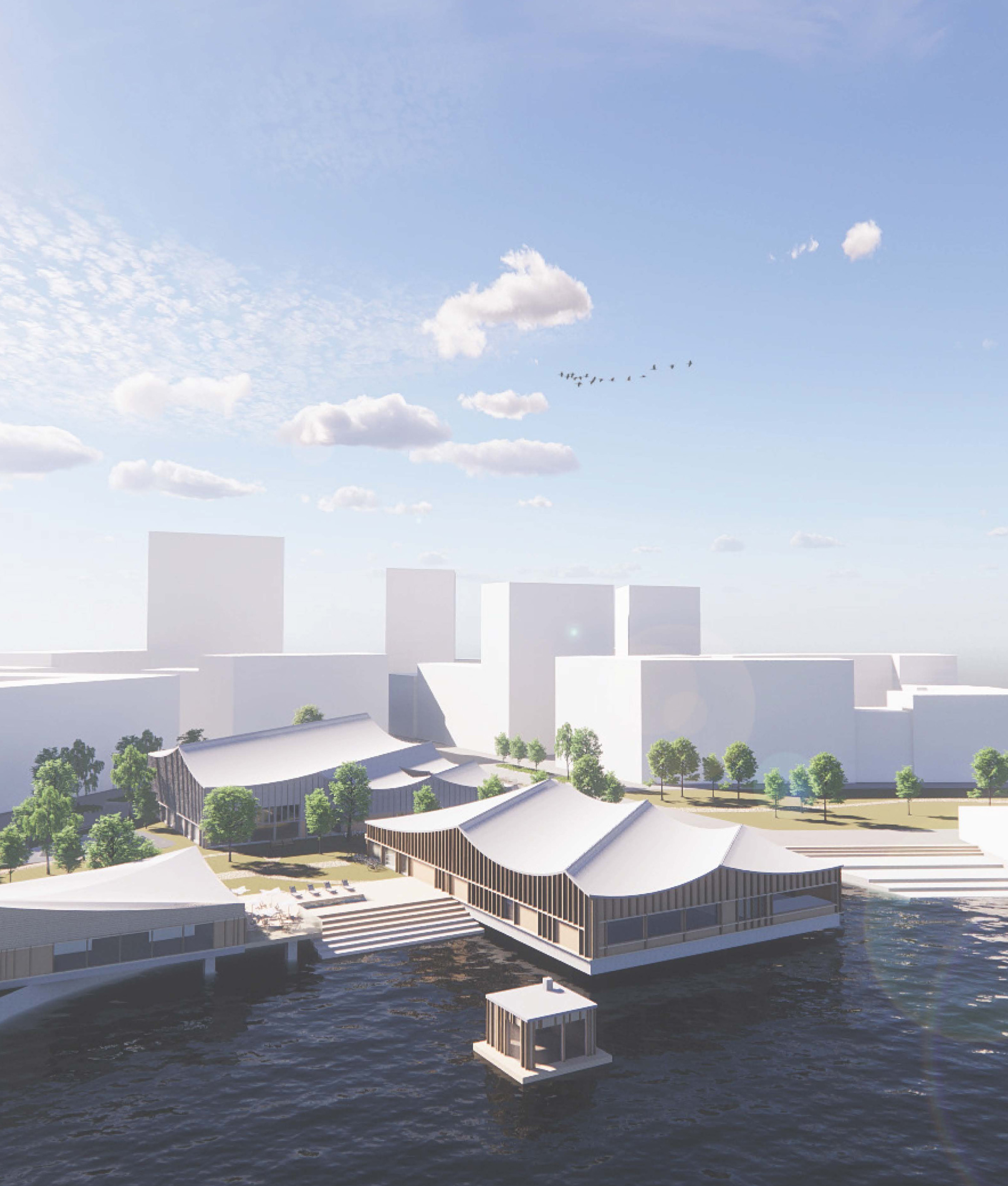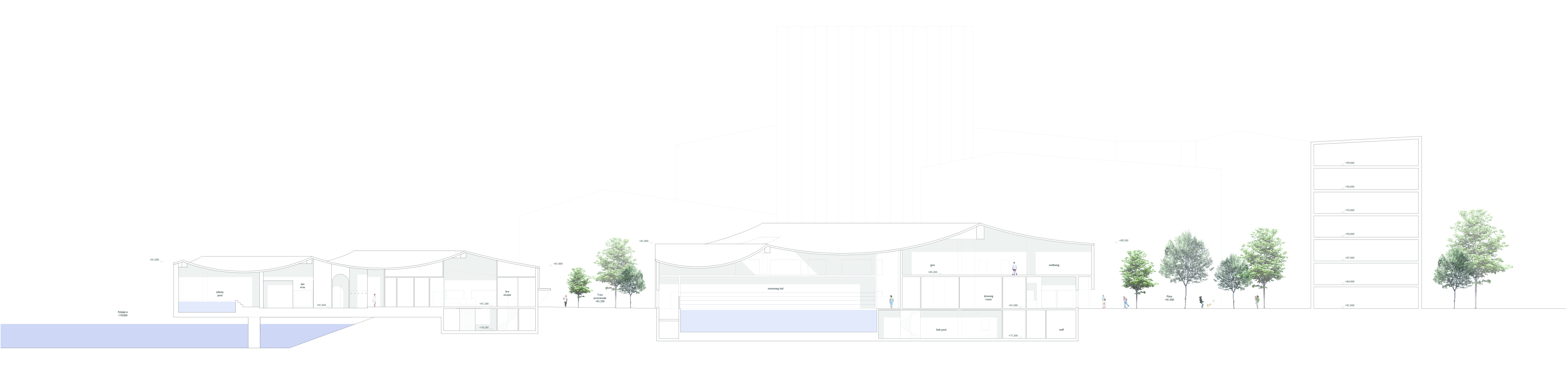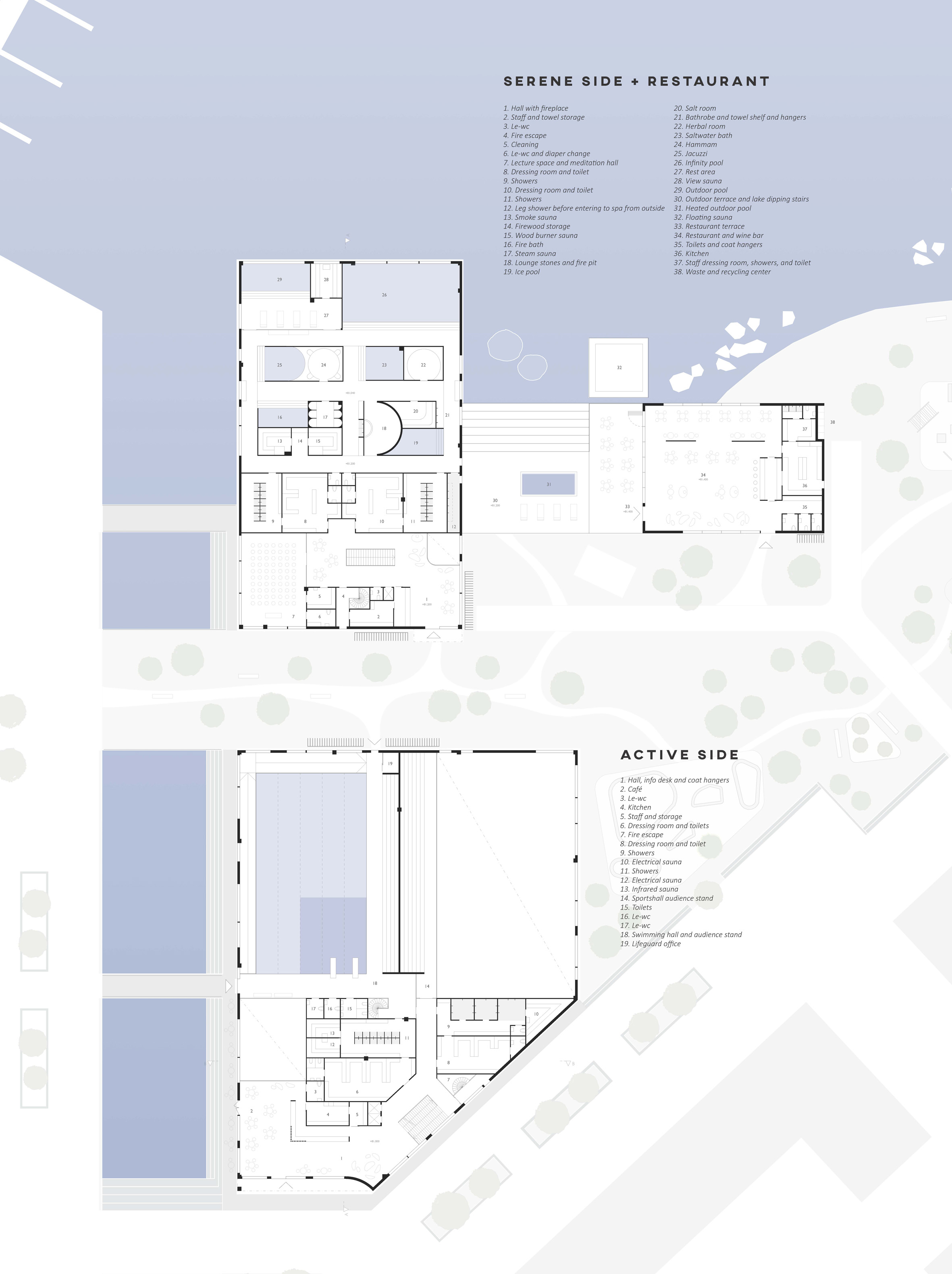 We wanted to make the building footprint as small as possible and orientate it towards the city centre to make it fit to the plot and surroundings as well as possible without blocking views from the neighbours. The relation to water is one of our main conceptual ideas and all of the three buildings have a view or an actual connection to water. All the spaces above the ground have views towards the Pyhäjärvi-lake and the canal while separated restaurant building and spa area has been built on top of the water creating instant connection for water sports and fresh lake breeze. The interesting wavy rooftop which is covering all the three buildings has taken inspiration of the water waves in front it. The Sports Centre near to the public plaza has three floors, one under the ground level and two above it. All spaces inside have plentiful of natural light coming inside. The serene side has two floors, one under the ground level and one above. The bath area is having less views to canal and to busy roads with soft rice-coloured windows to make it calm and relaxing place to the visitors.