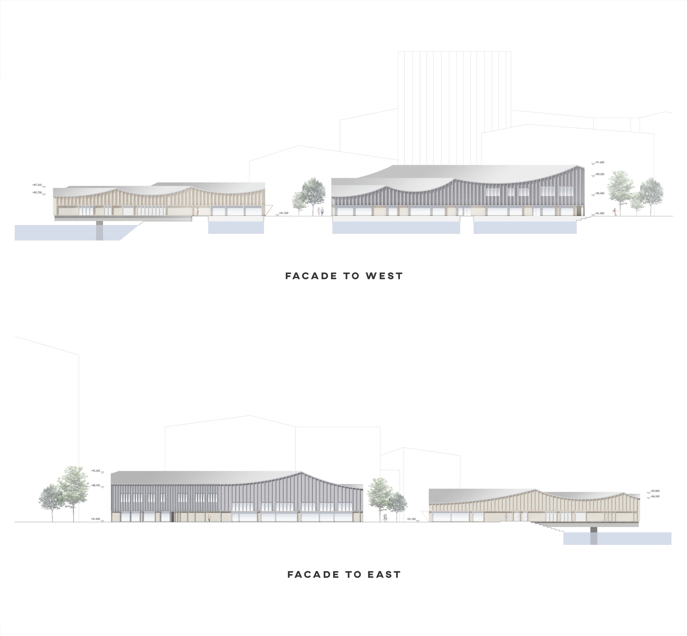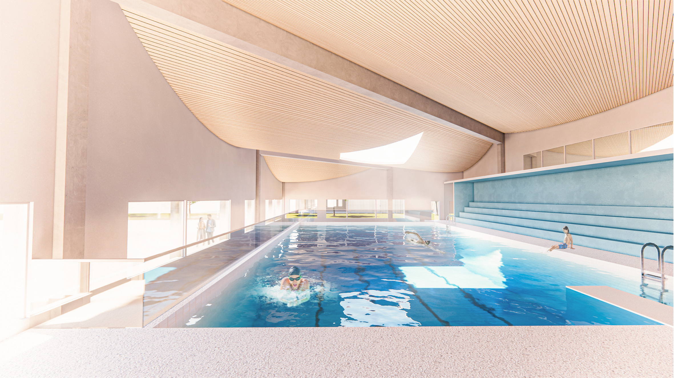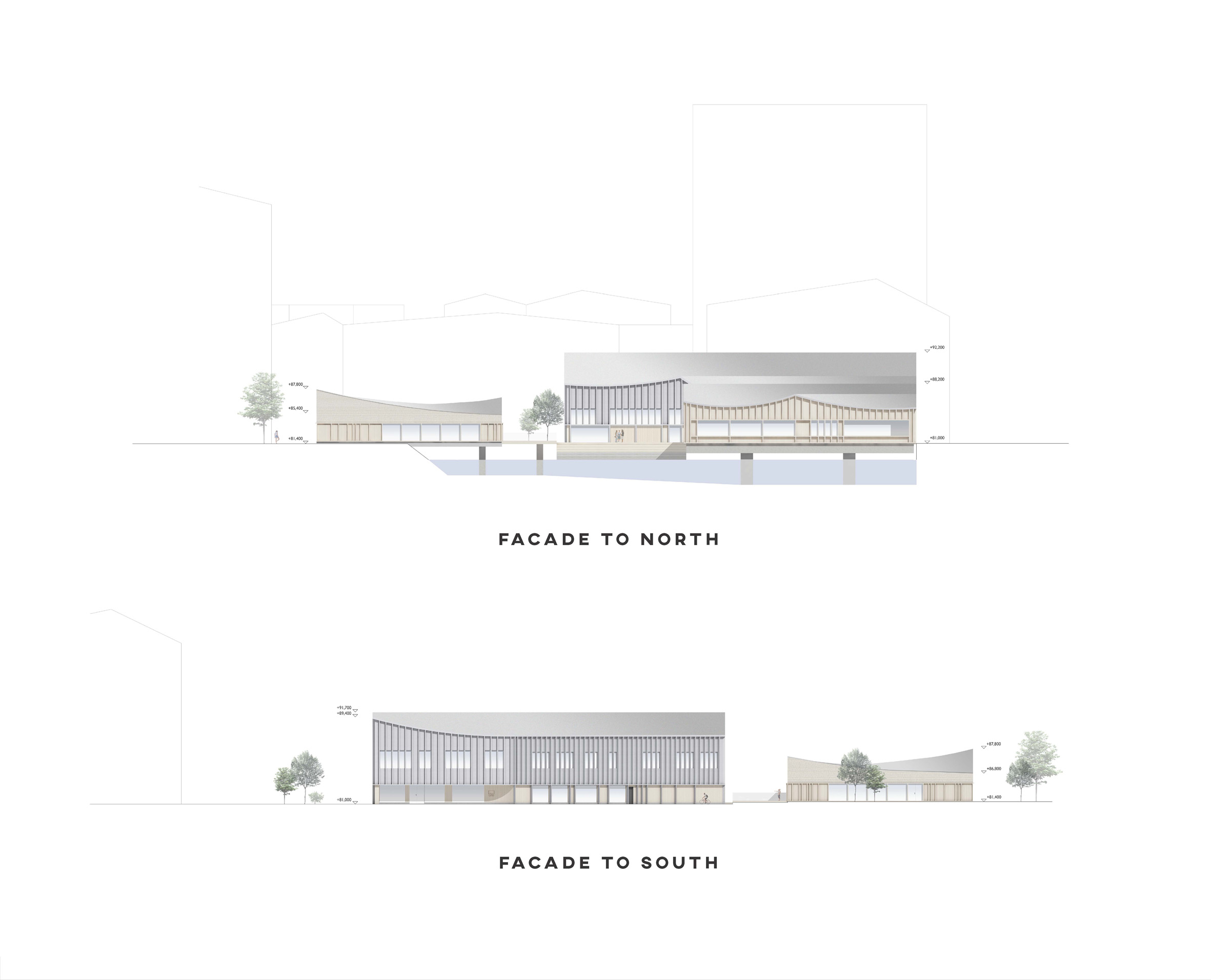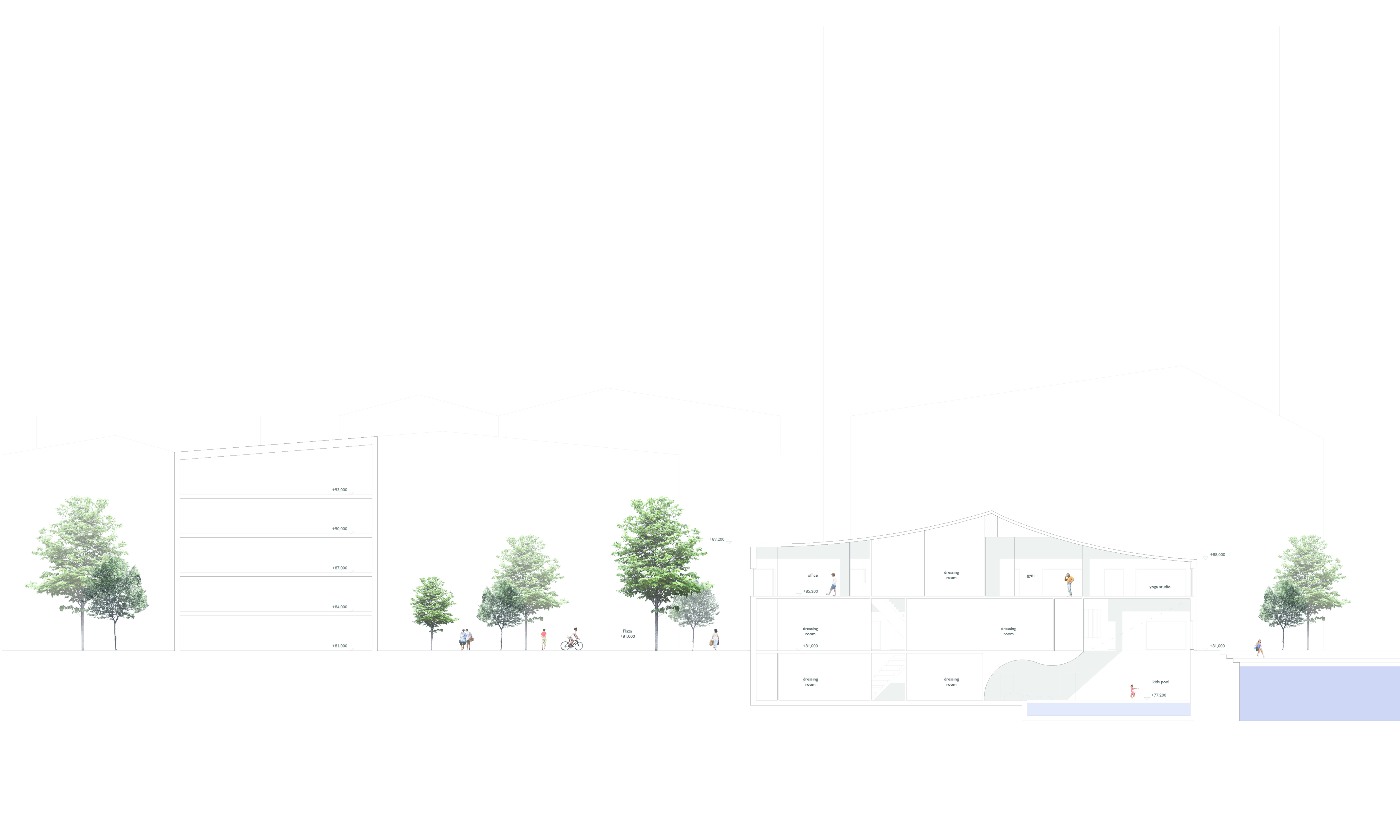 We wanted to make the building footprint as small as possible and orientate it towards the city centre to make it fit to the plot and surroundings as well as possible without blocking views from the neighbours. The relation to water is one of our main conceptual ideas and all of the three buildings have a view or an actual connection to water. All the spaces above the ground have views towards the Pyhäjärvi-lake and the canal while separated restaurant building and spa area has been built on top of the water creating instant connection for water sports and fresh lake breeze. The interesting wavy rooftop which is covering all the three buildings has taken inspiration of the water waves in front it. The Sports Centre near to the public plaza has three floors, one under the ground level and two above it. All spaces inside have plentiful of natural light coming inside. The serene side has two floors, one under the ground level and one above. The bath area is having less views to canal and to busy roads with soft rice-coloured windows to make it calm and relaxing place to the visitors.