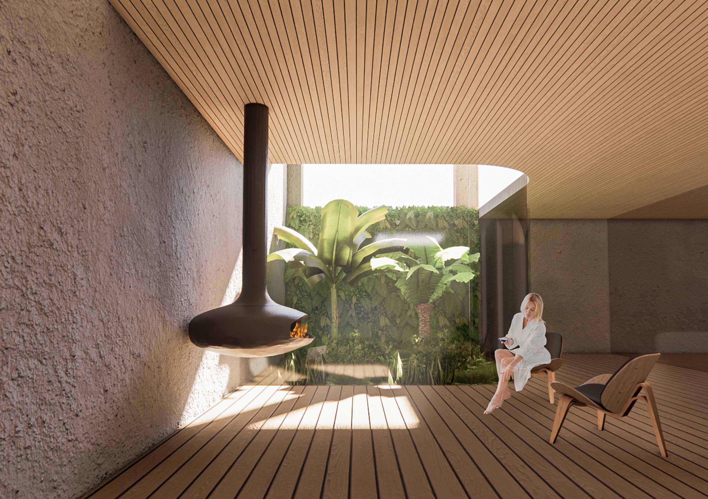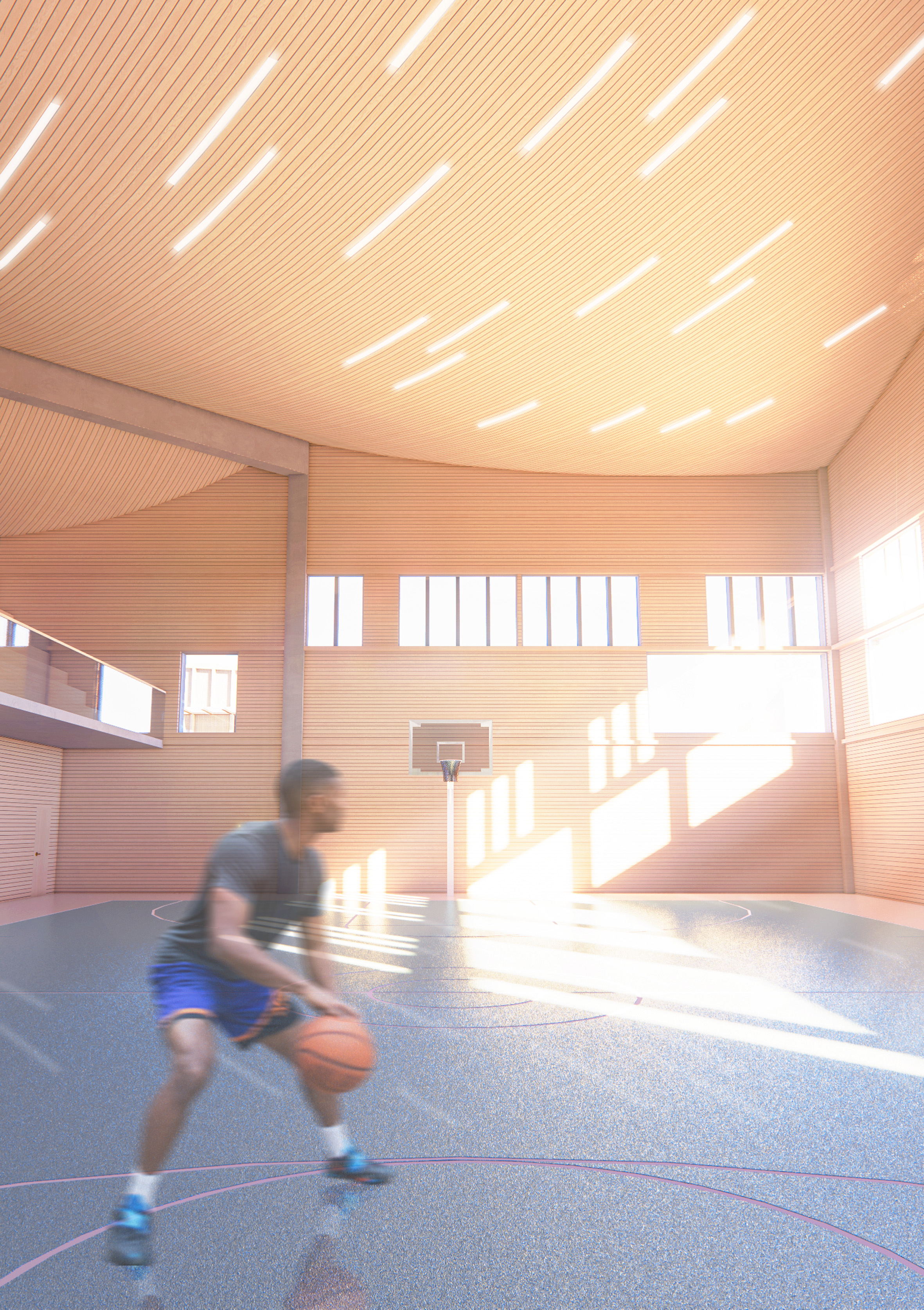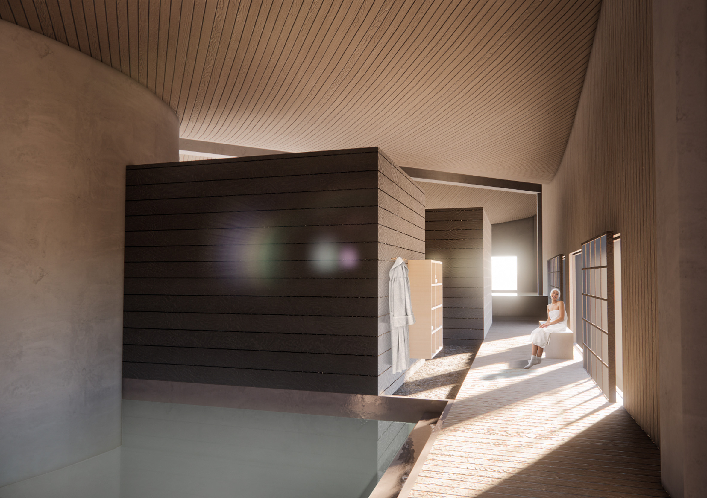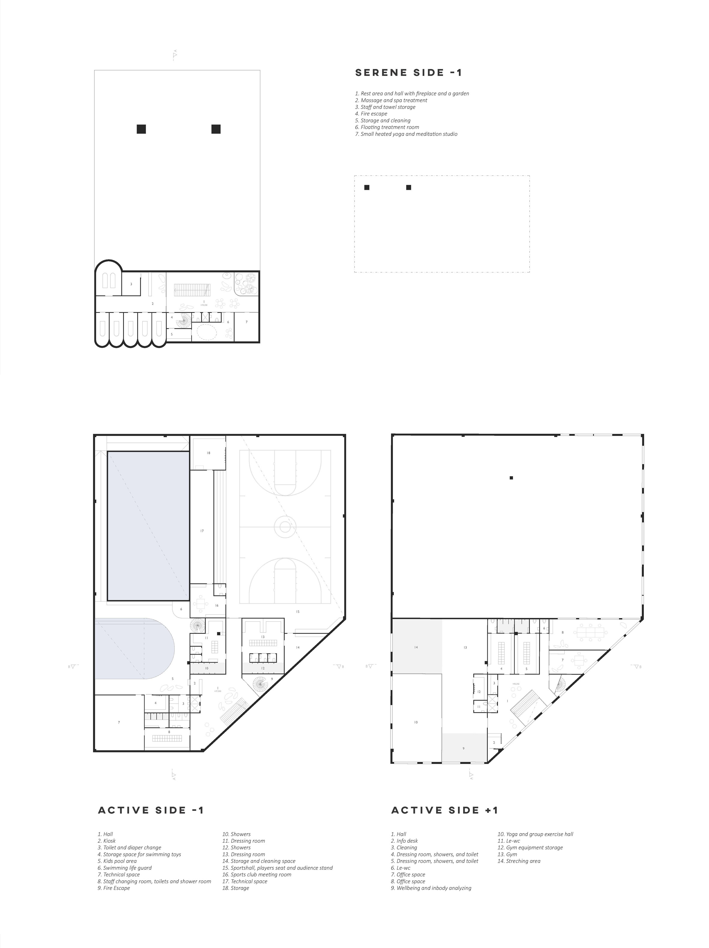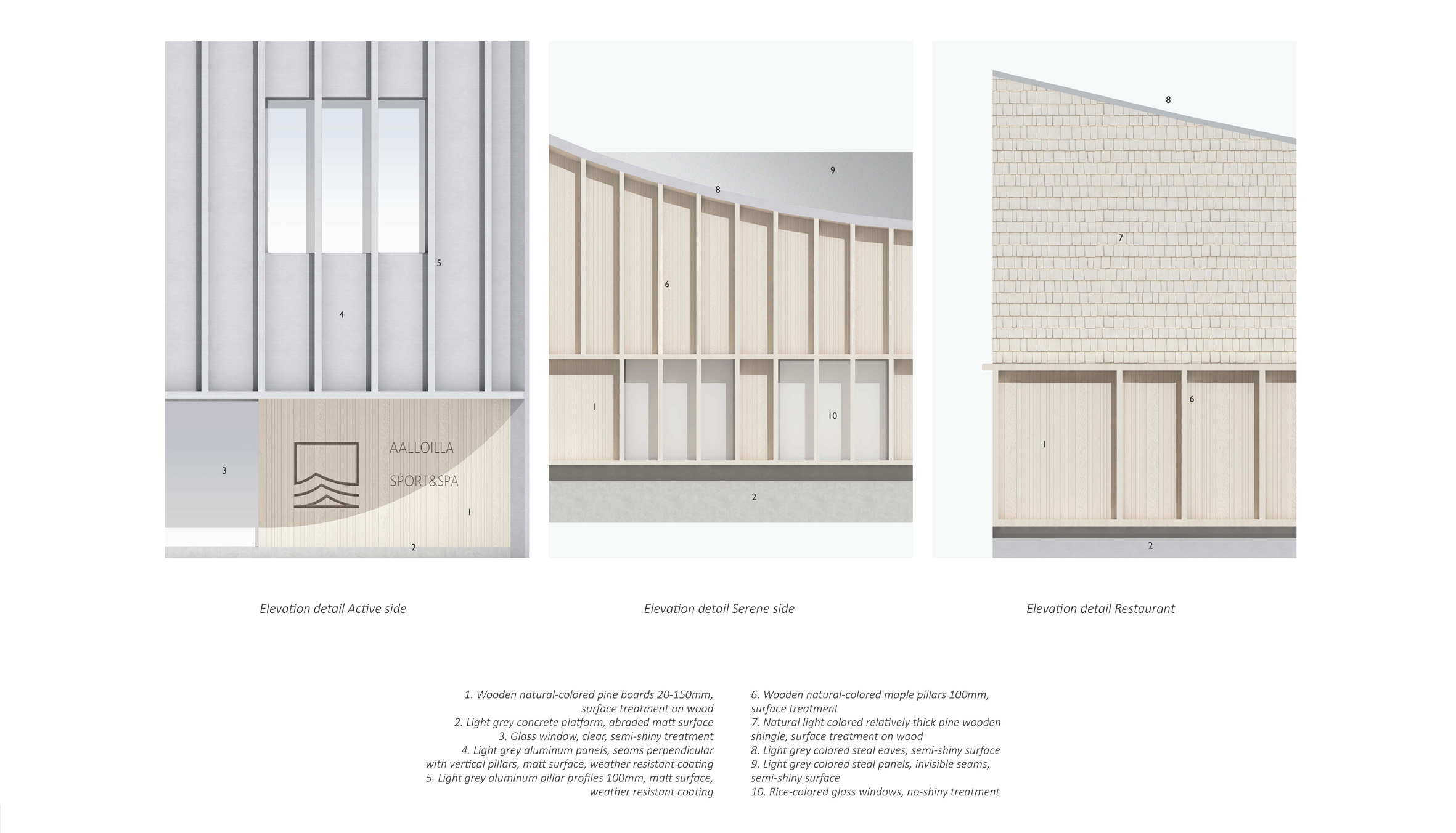 Our design process for AALLOILLA Sports & Spa Centre in Viinikanlahti started with analysing what people are willing to achieve with their free time. One important goal for free time is to regain the energy that was lost during the week of work and to “recharge the batteries” for the upcoming week. The way to ensure the stress of work, increase health in both mind and body, is to have physical activity and calm rest, muscle-care, and meditation. In our concept and architectural idea, we have separated active side and serene side to their own buildings to have unique visual atmosphere, sound and material theme and feeling in them. The active side has more bright stimulating colours, lively sounds of music and people in the building and airy dynamic atmosphere with a smell of chlorine and main materials. On the other hand, the serene side has more natural materials and soft tones in indoor spaces and little unique and mysterious spaces with a soft light. The holy and relaxing atmosphere is filled with a smell of candles, wood, nature, salt water and fire.
