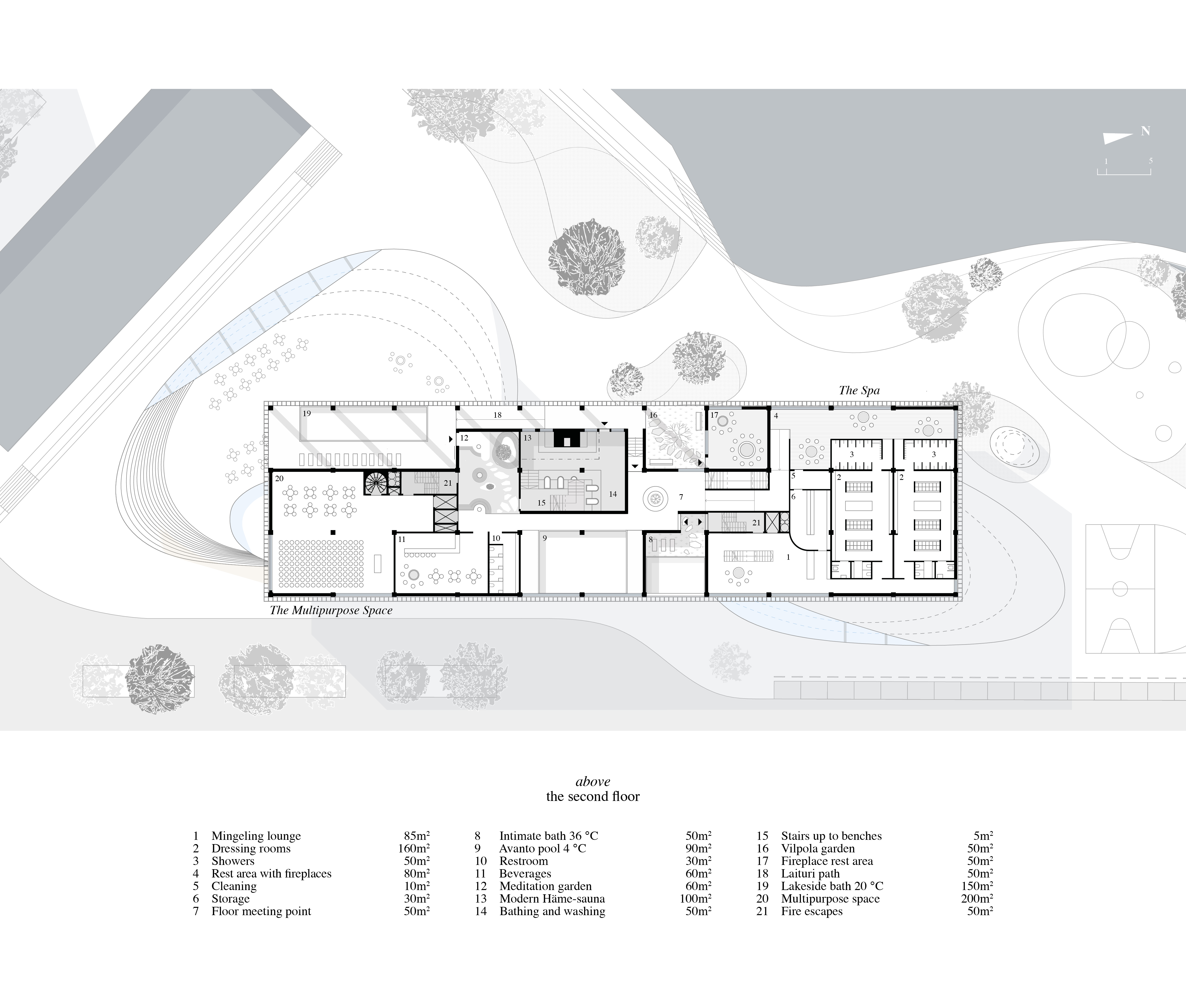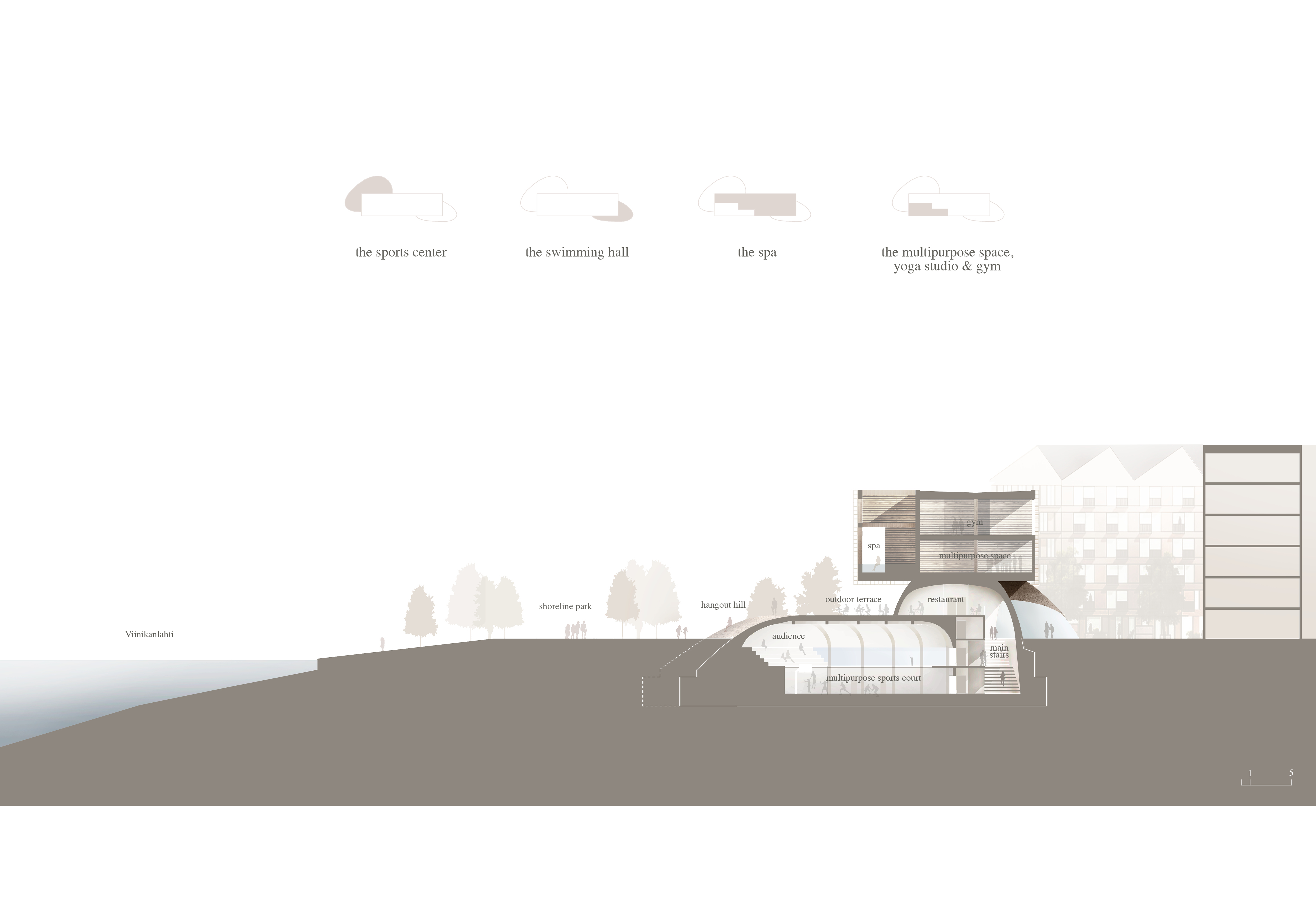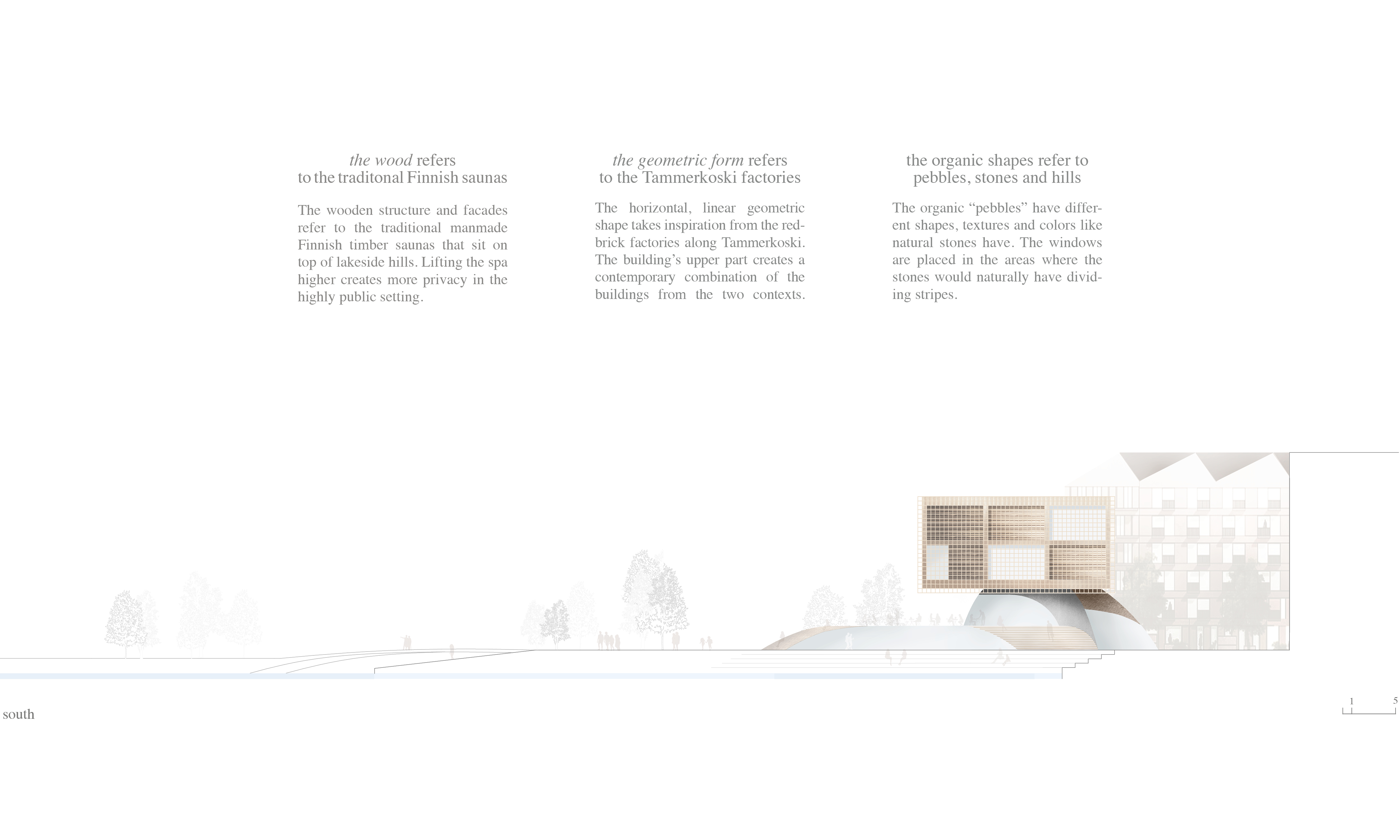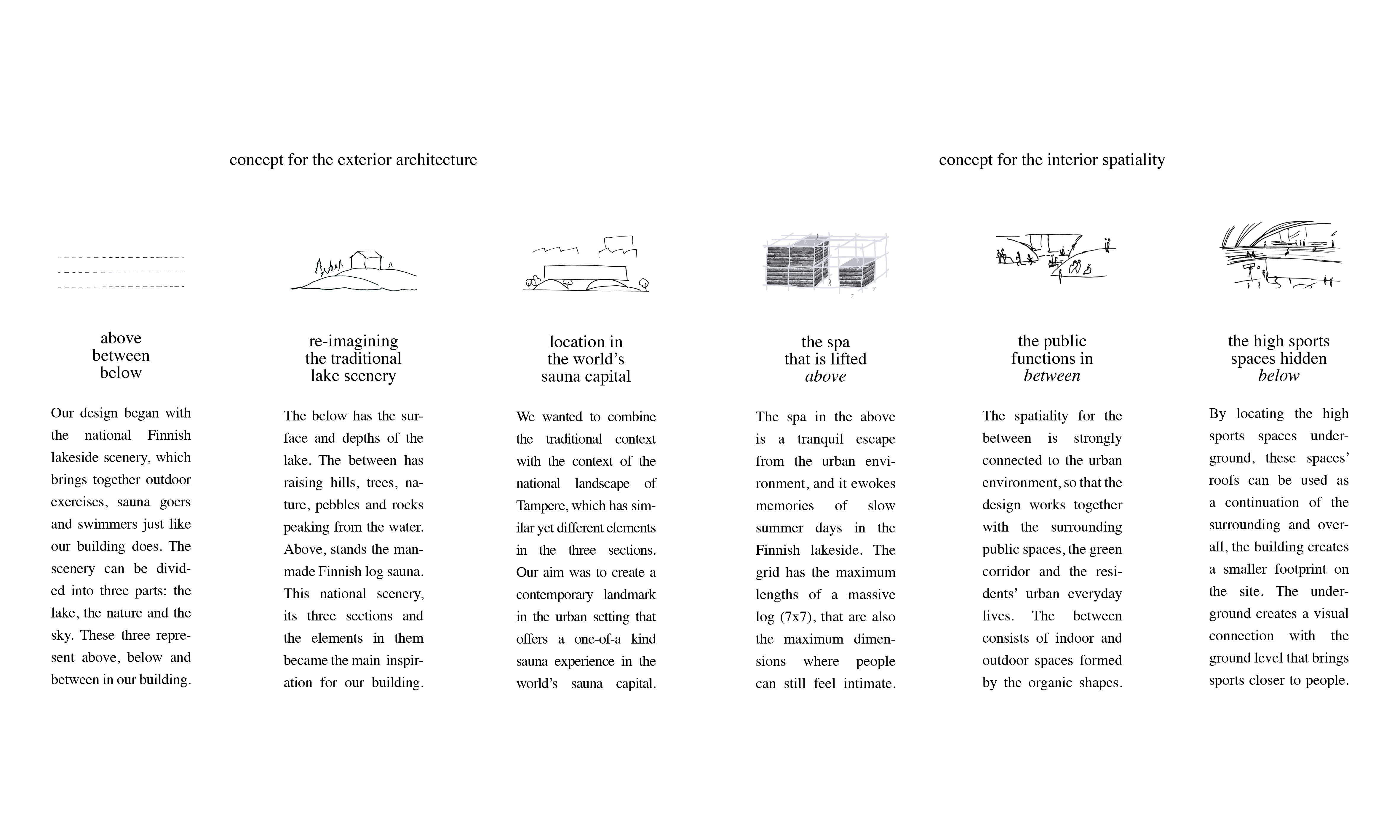 The name of the design and the main concept come from the Finnish national lakeside scenery, which brings together outdoor exercisers, sauna goers and swimmers just like our new building would. The familiar lakeside view can be divided into three parts: lake below, nature between and sky above. The above – between – below re-imagines and combines these three parts and the elements they hold in the Finnish lakeside scenery and also in the national Finnish scenery of Tammerkoski.