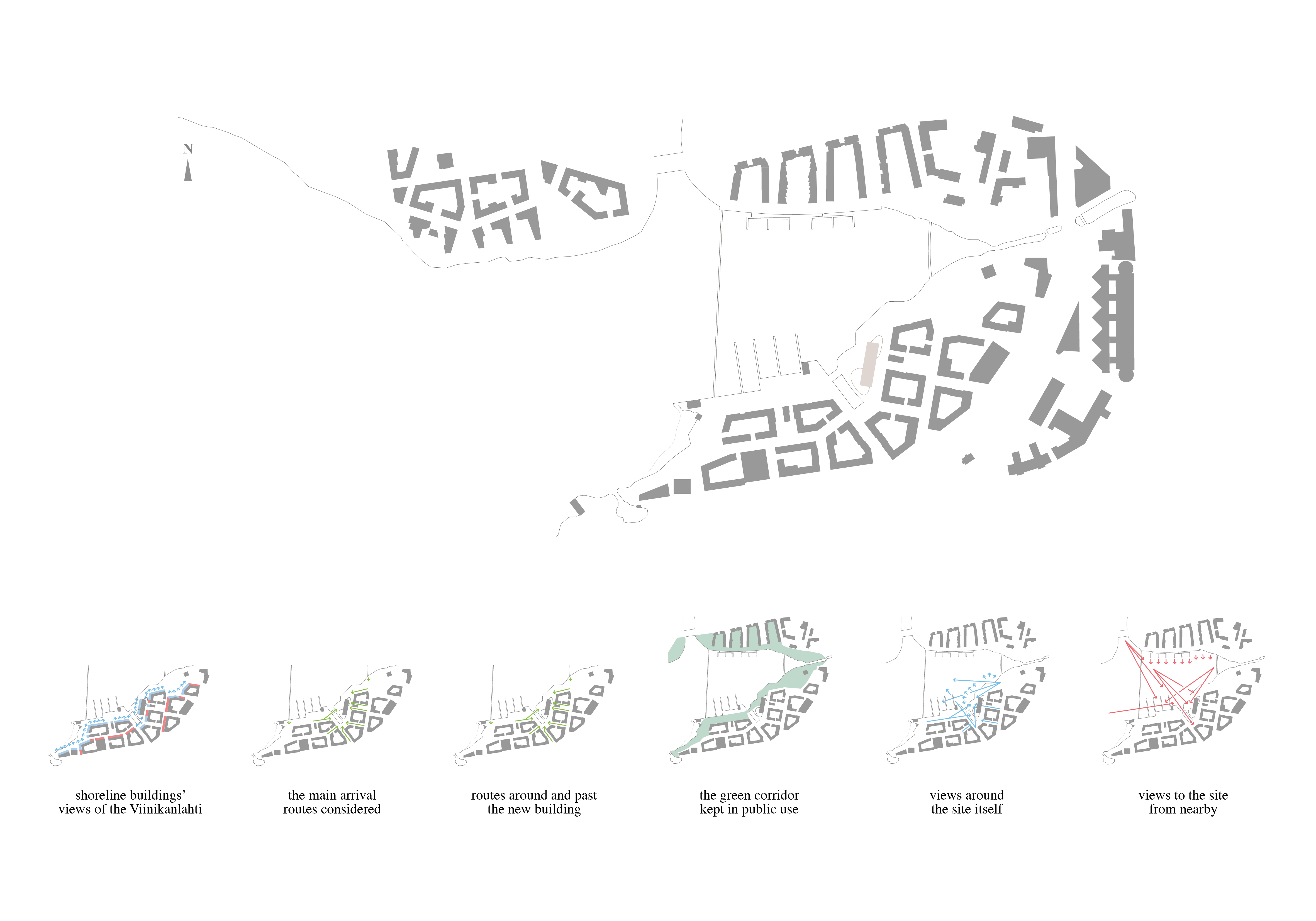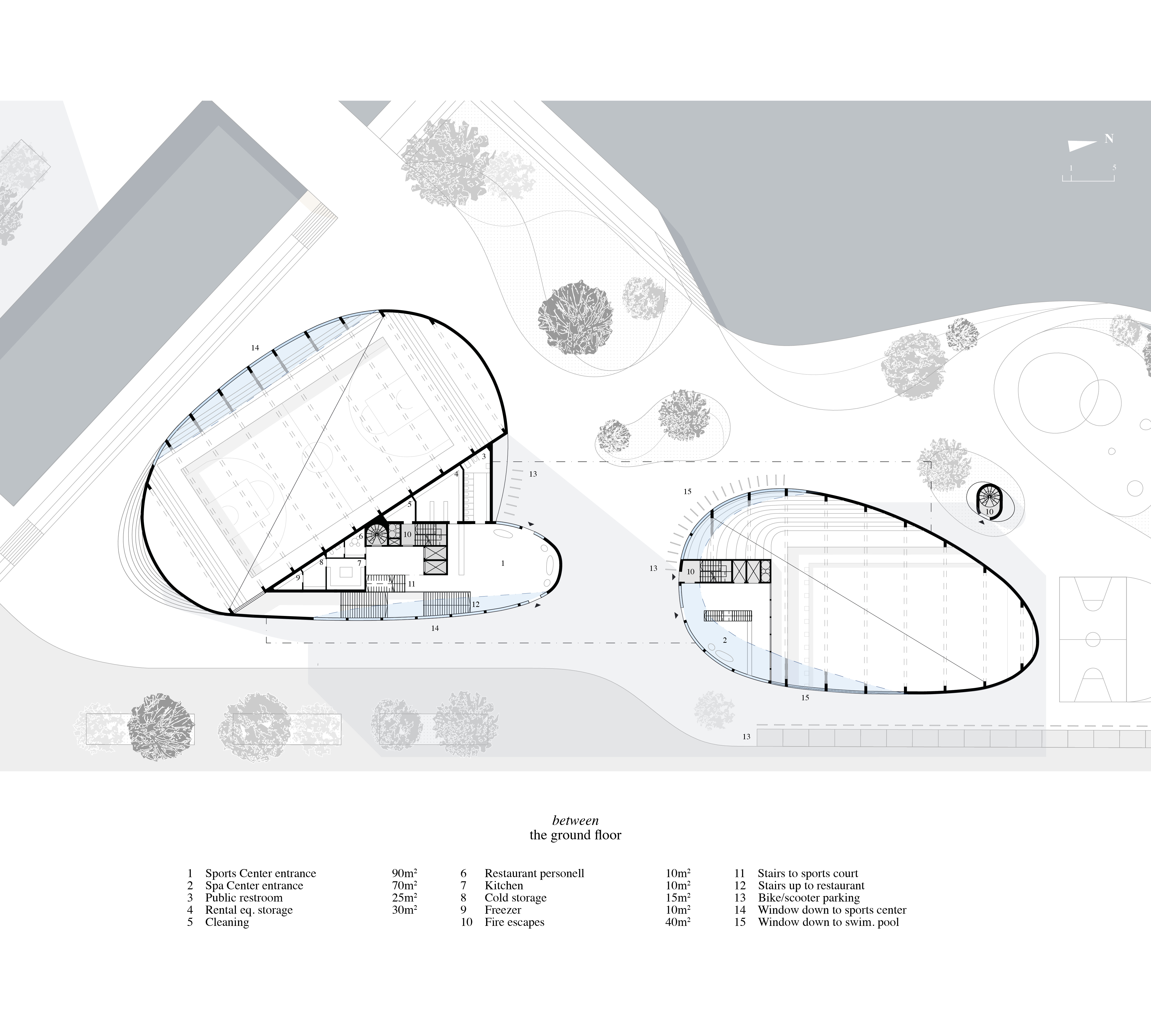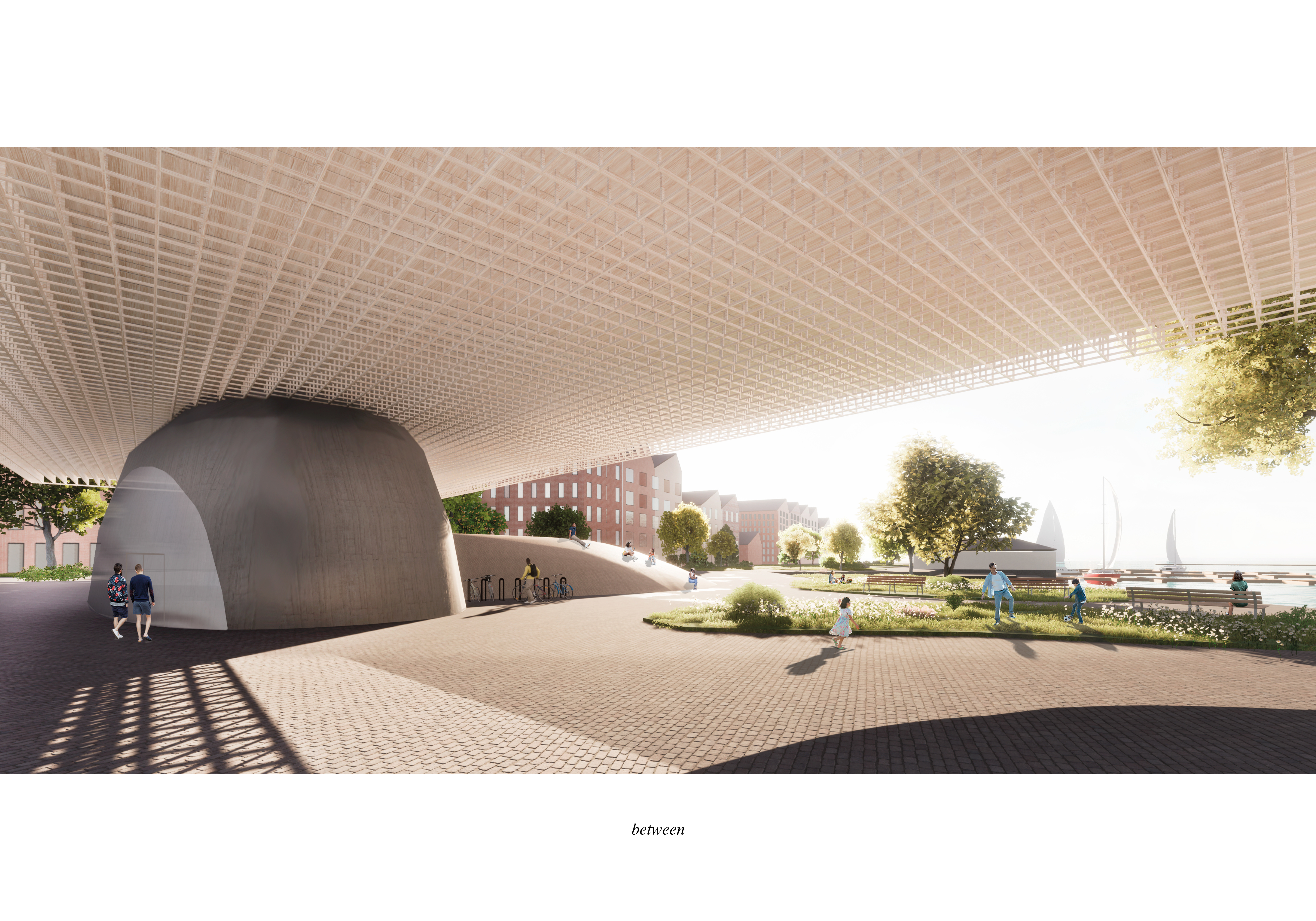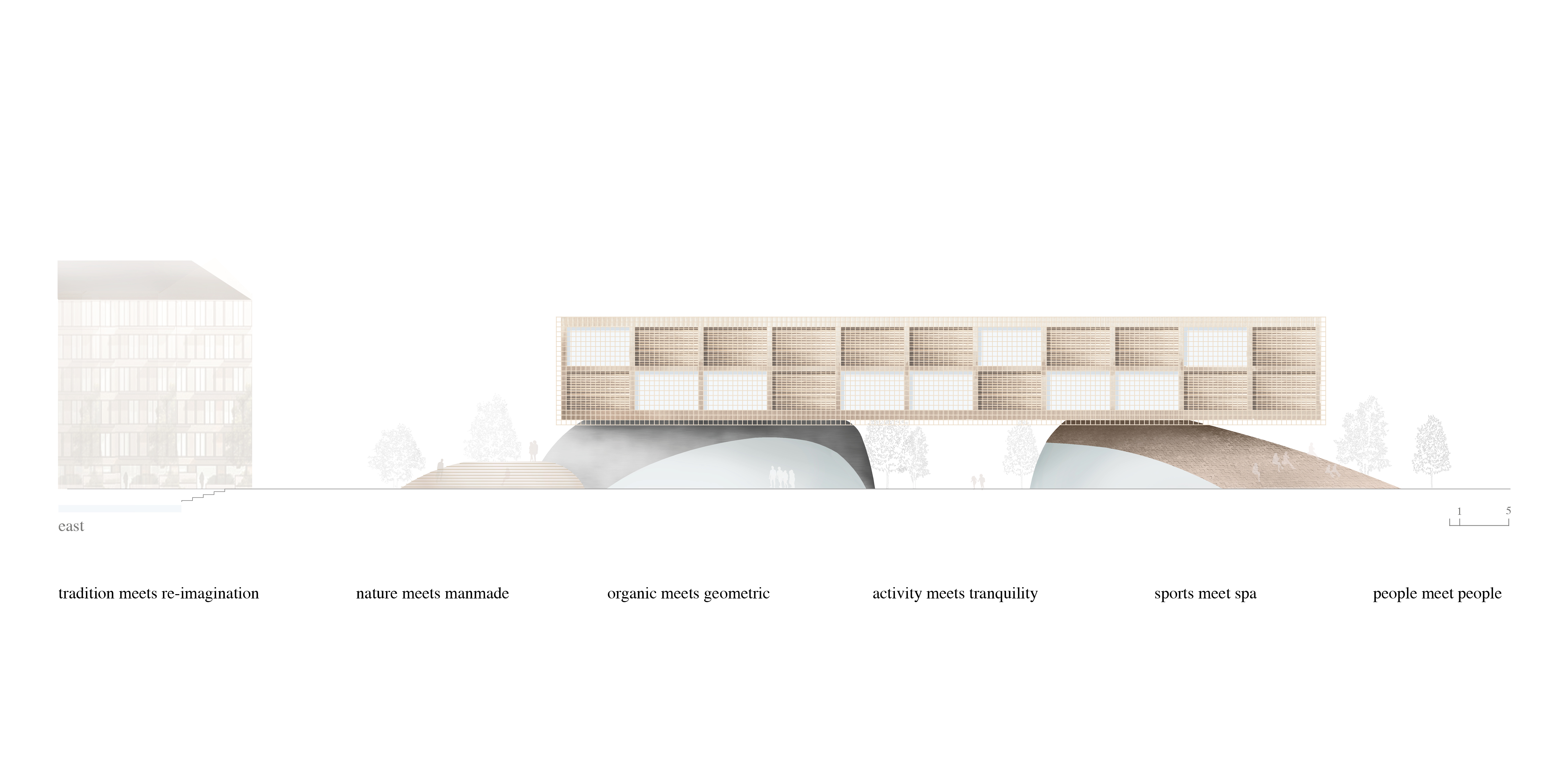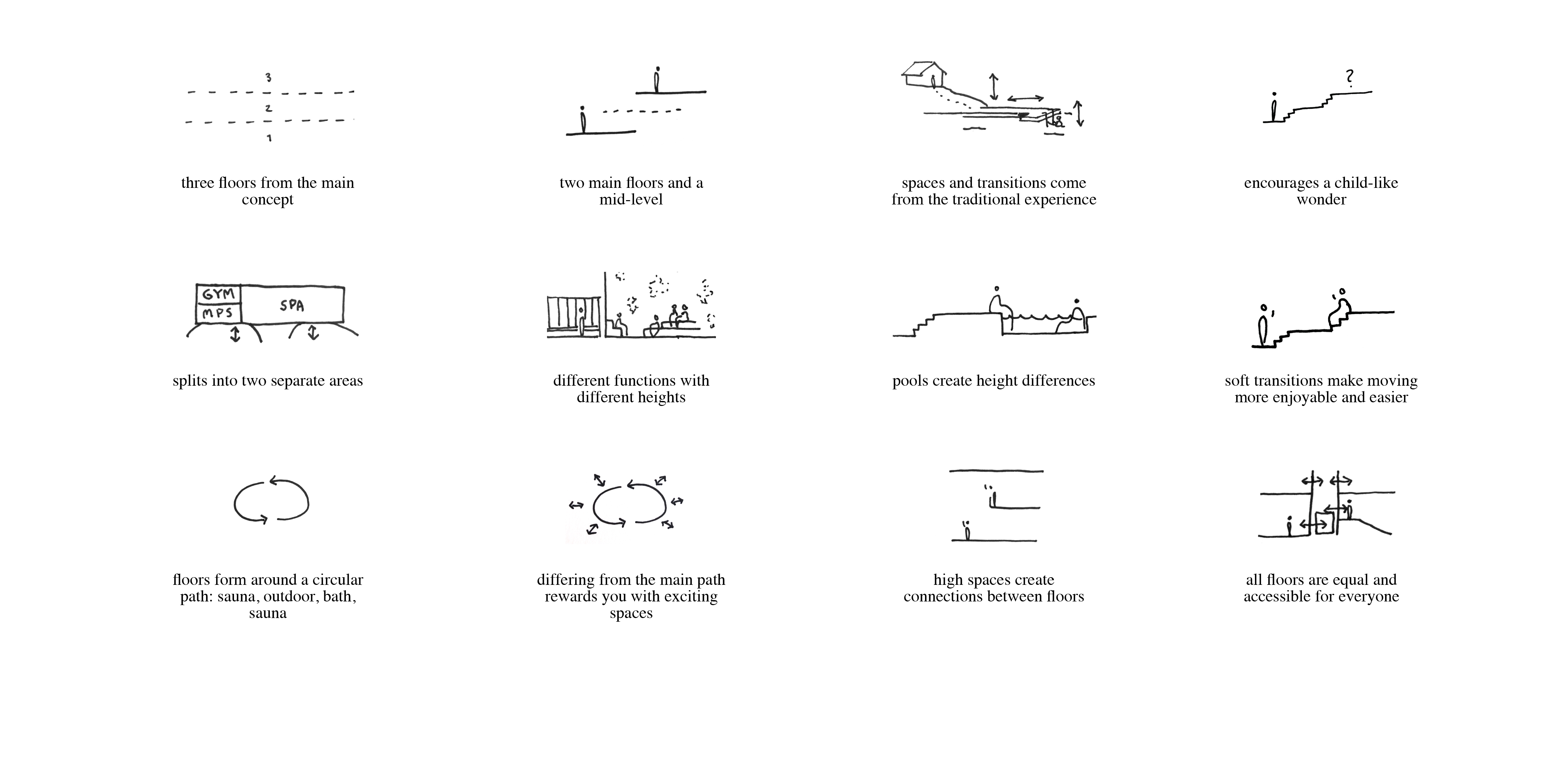 The name of the design and the main concept come from the Finnish national lakeside scenery, which brings together outdoor exercisers, sauna goers and swimmers just like our new building would. The familiar lakeside view can be divided into three parts: lake below, nature between and sky above. The above – between – below re-imagines and combines these three parts and the elements they hold in the Finnish lakeside scenery and also in the national Finnish scenery of Tammerkoski.