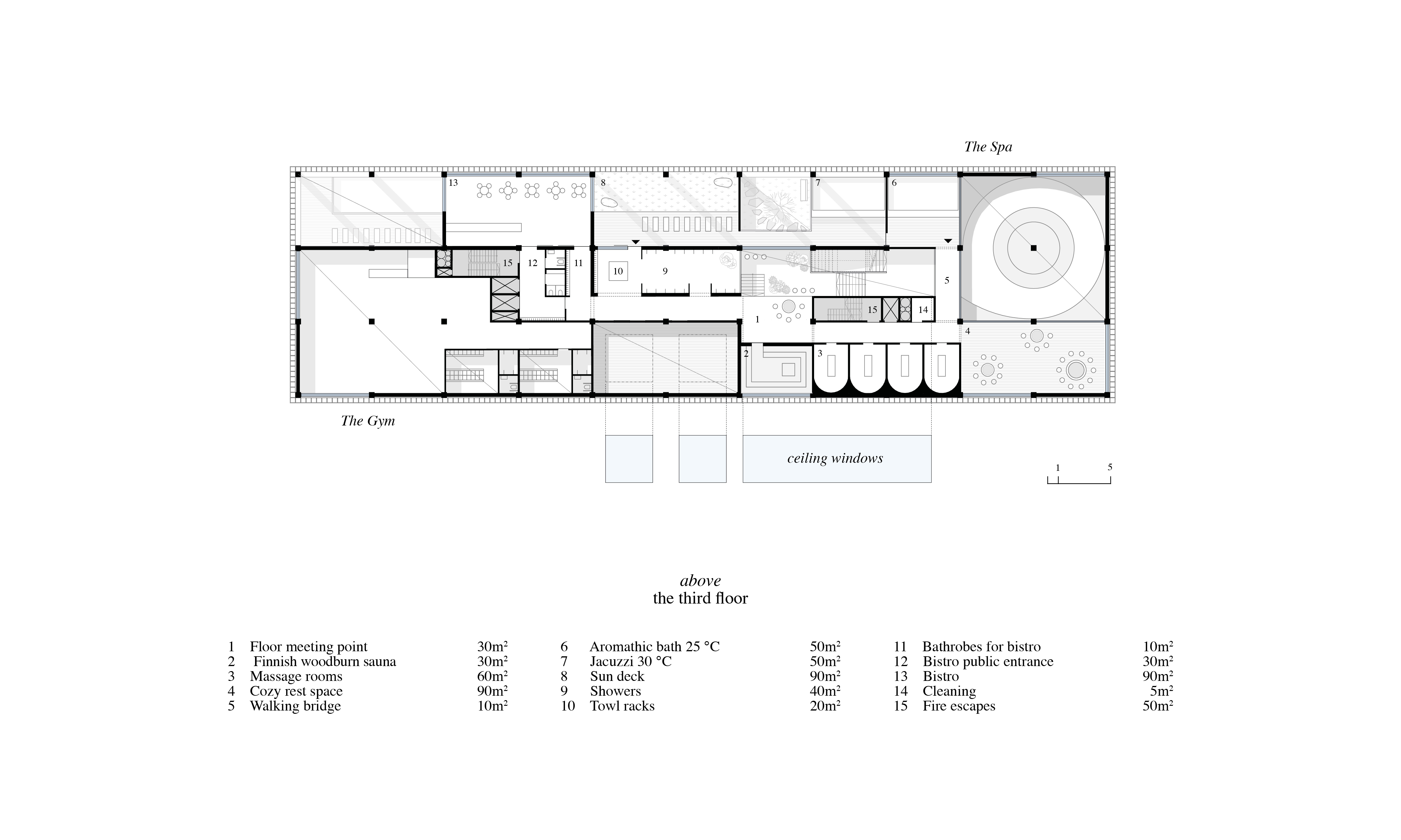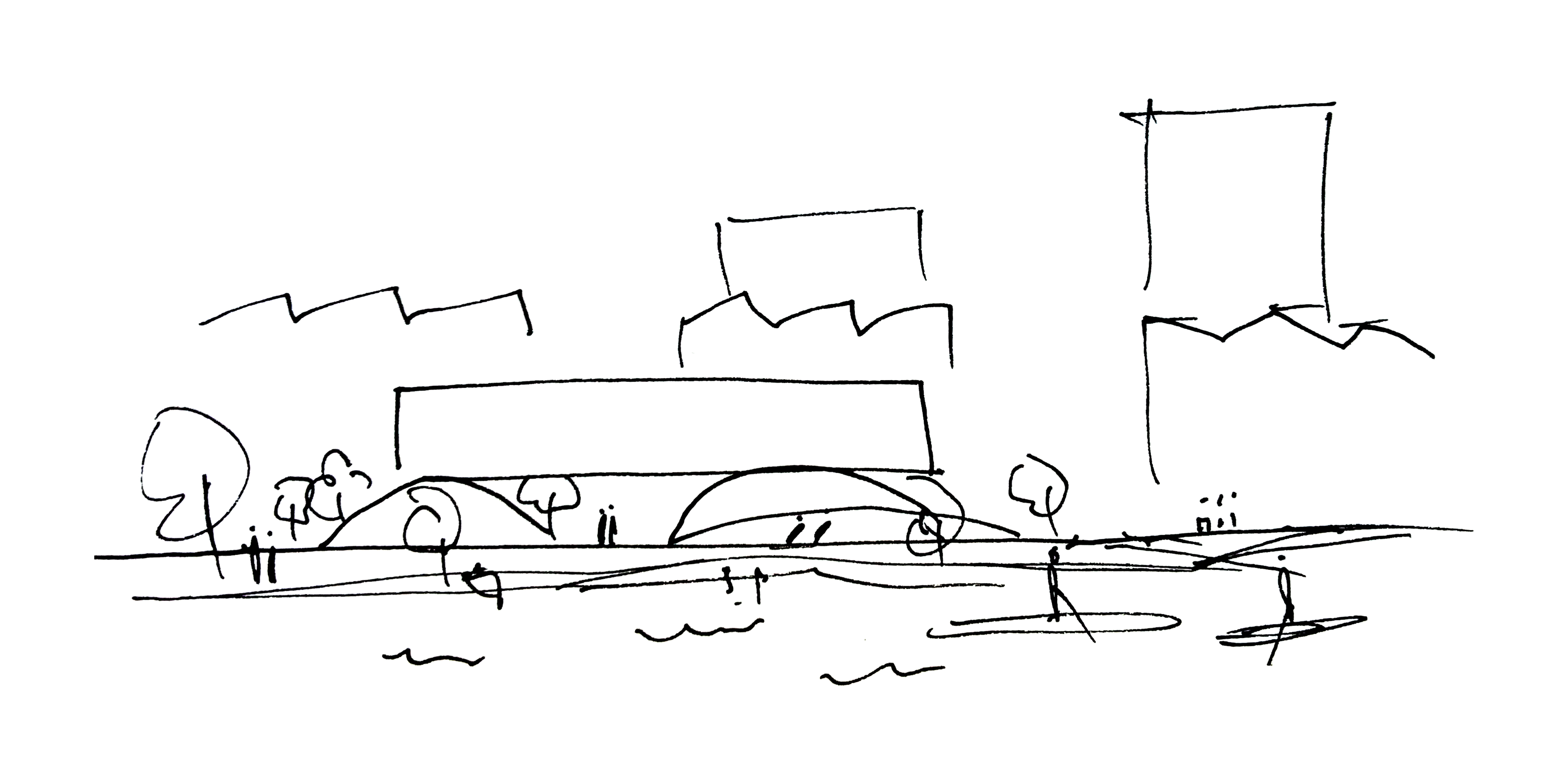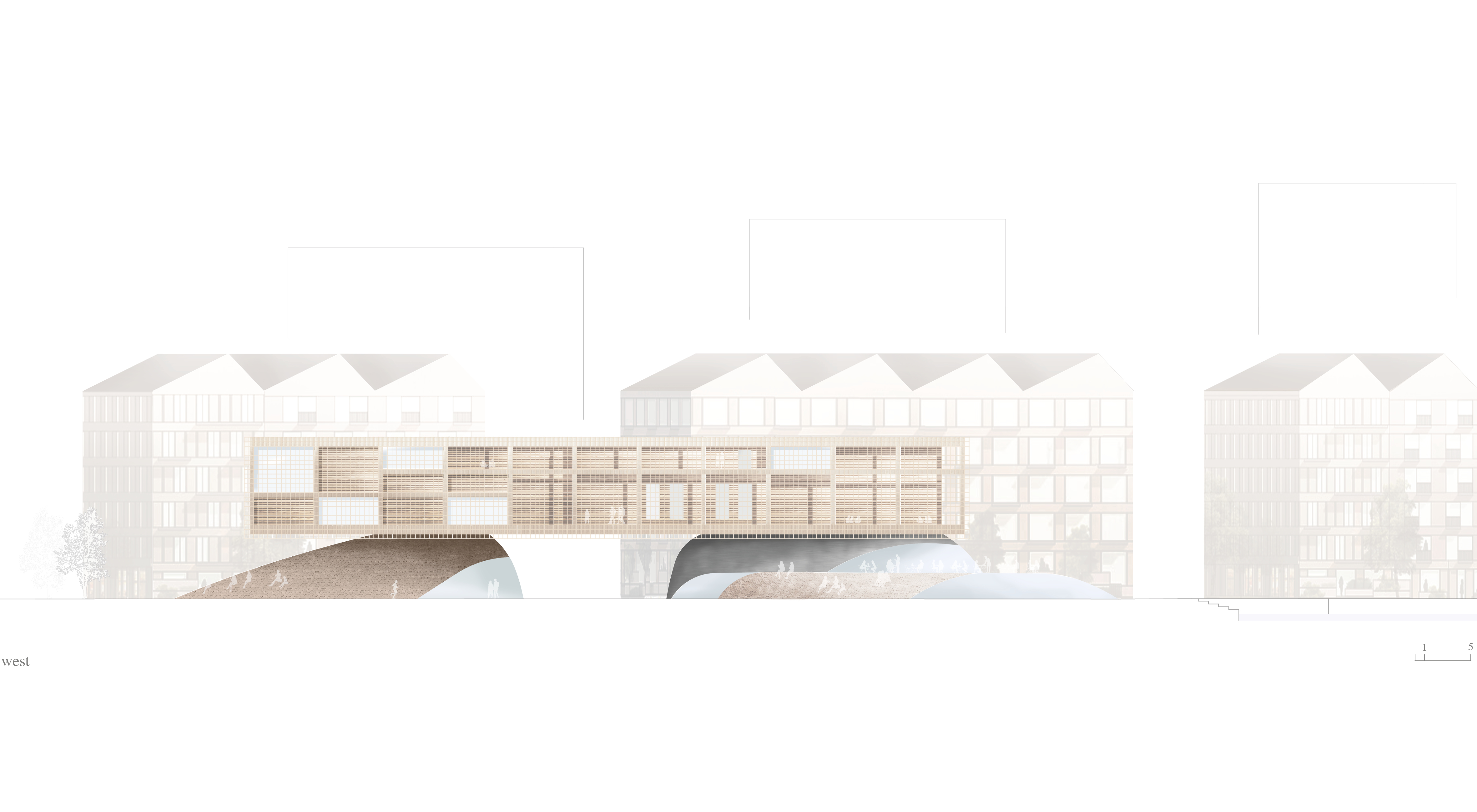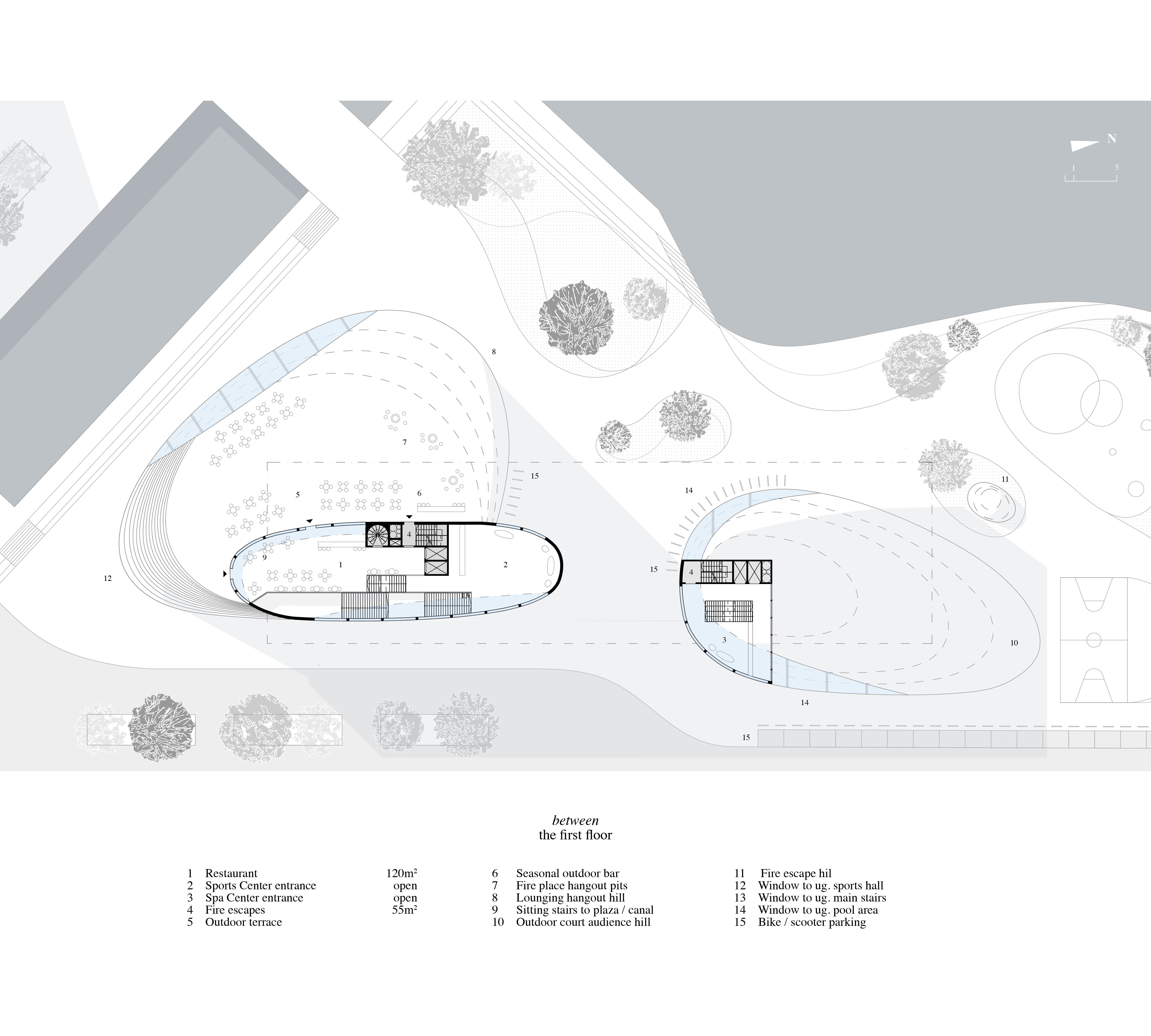 The name of the design and the main concept come from the Finnish national lakeside scenery, which brings together outdoor exercisers, sauna goers and swimmers just like our new building would. The familiar lakeside view can be divided into three parts: lake below, nature between and sky above. The above – between – below re-imagines and combines these three parts and the elements they hold in the Finnish lakeside scenery and also in the national Finnish scenery of Tammerkoski.