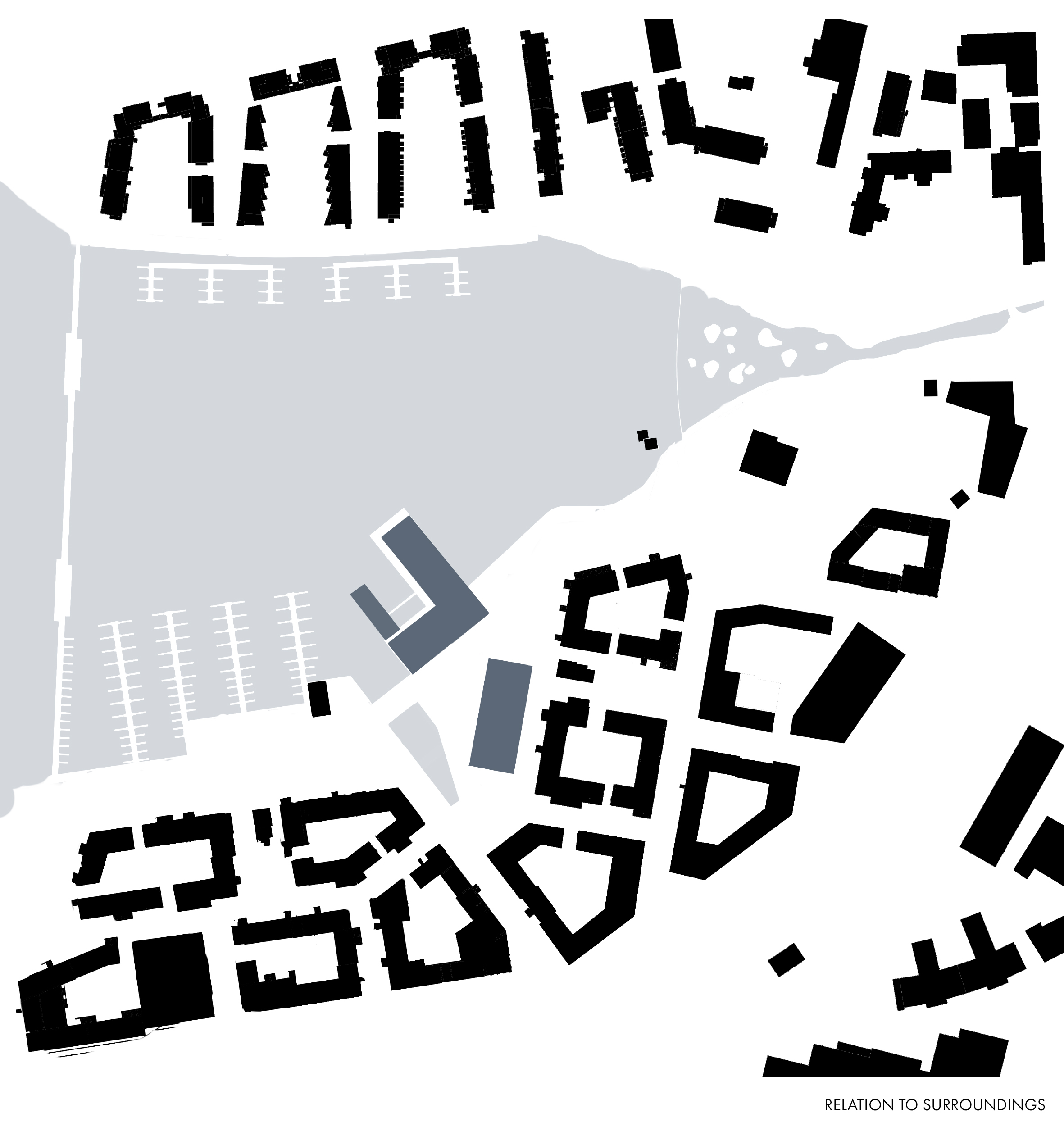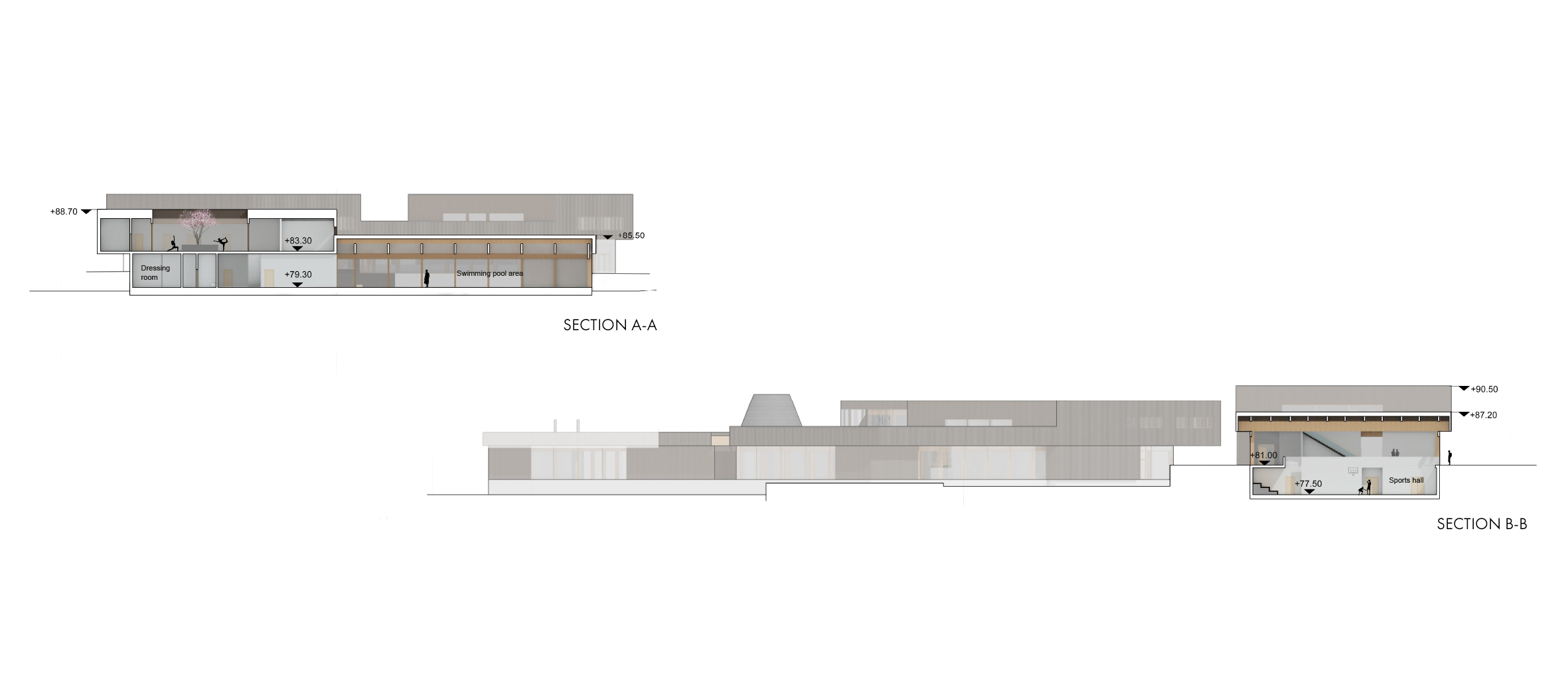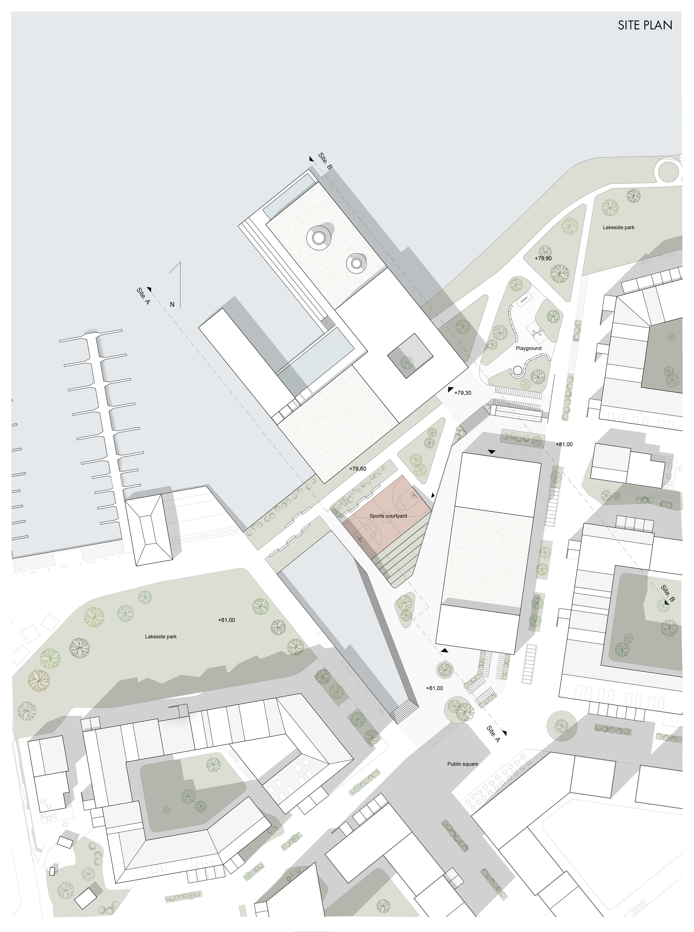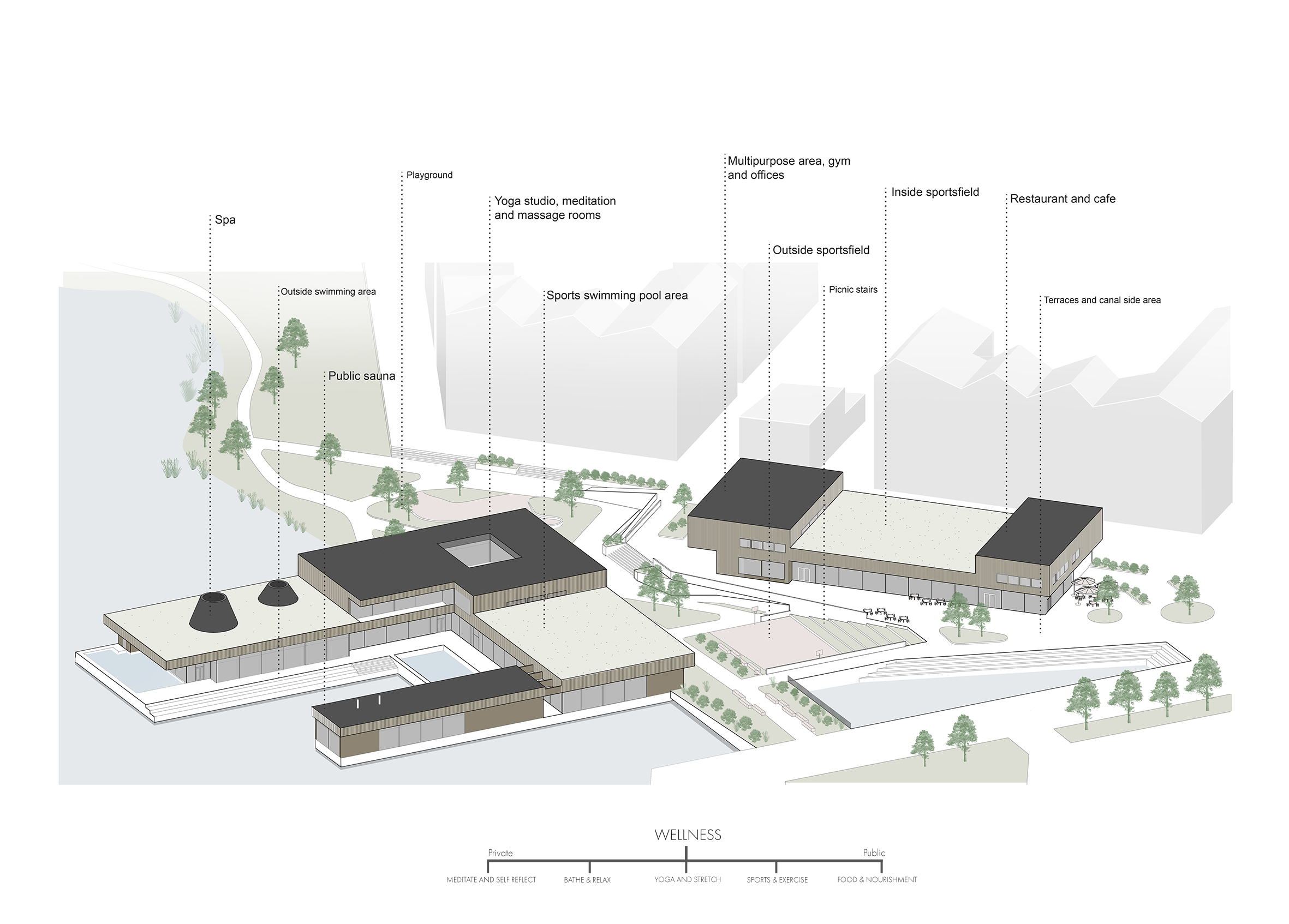 The more public functions, such as a restaurant, sports field, multipurpose space and café, are placed in the building closer to the urban structure. With water being a calming element, the more private and meditative functions are situated on top of the lake. An outside sports field is placed between the two buildings and together with glass facades it creates a connection between the sports hall and swimming pool.