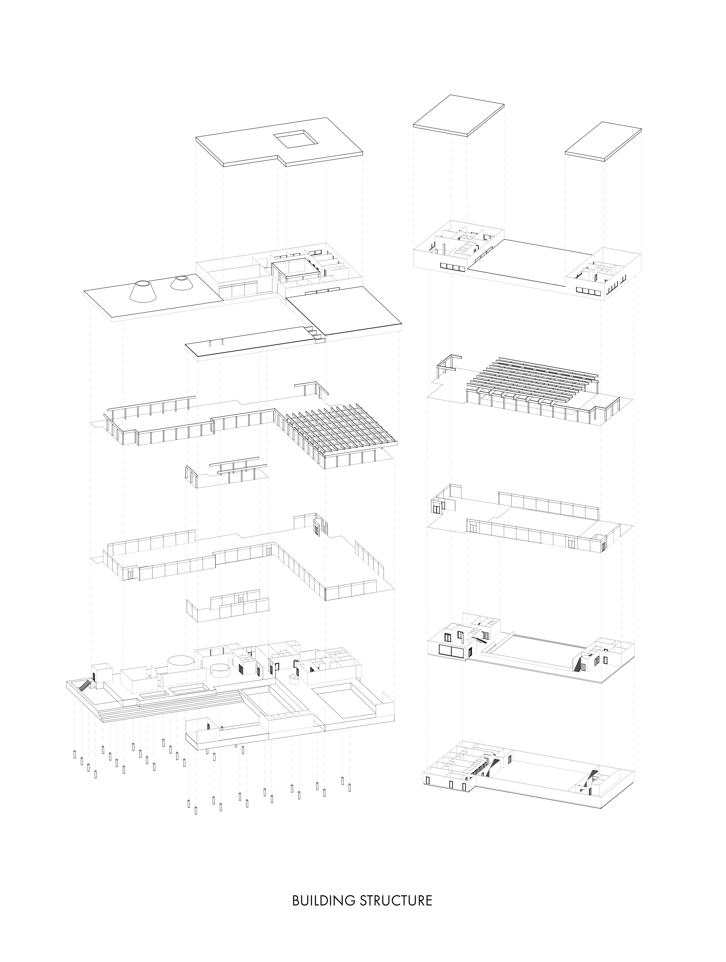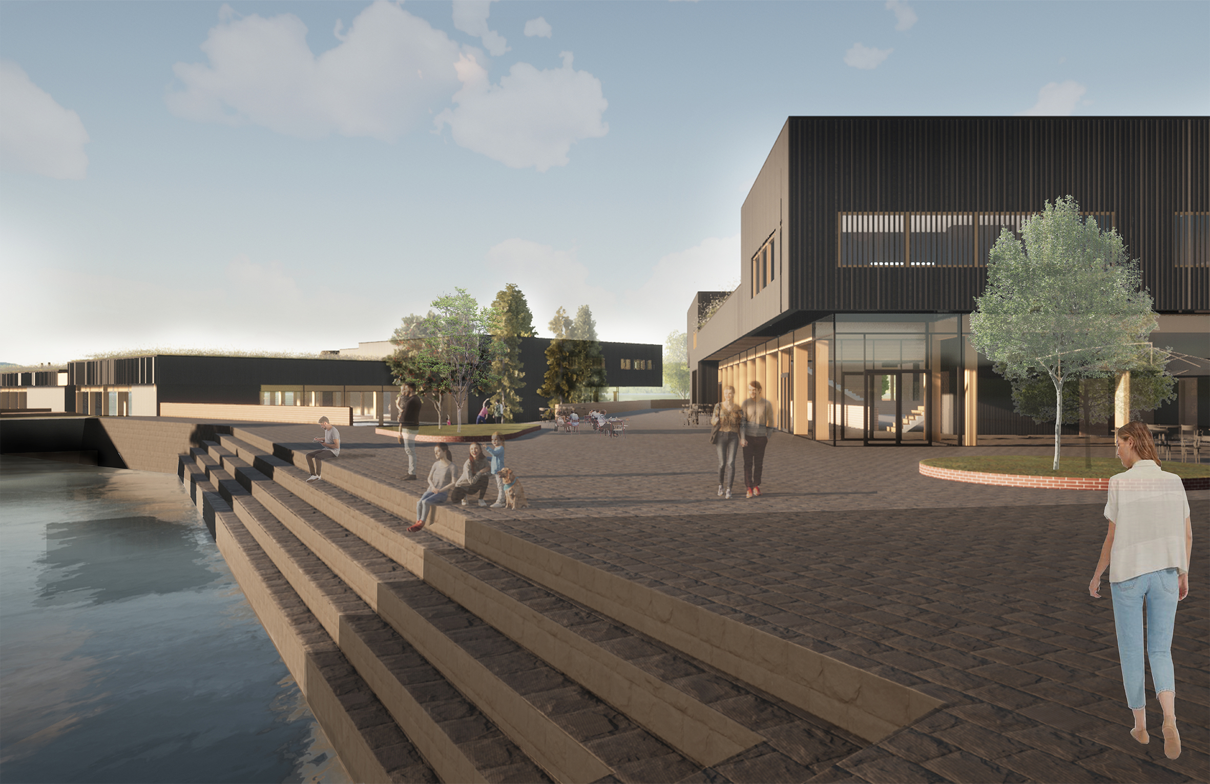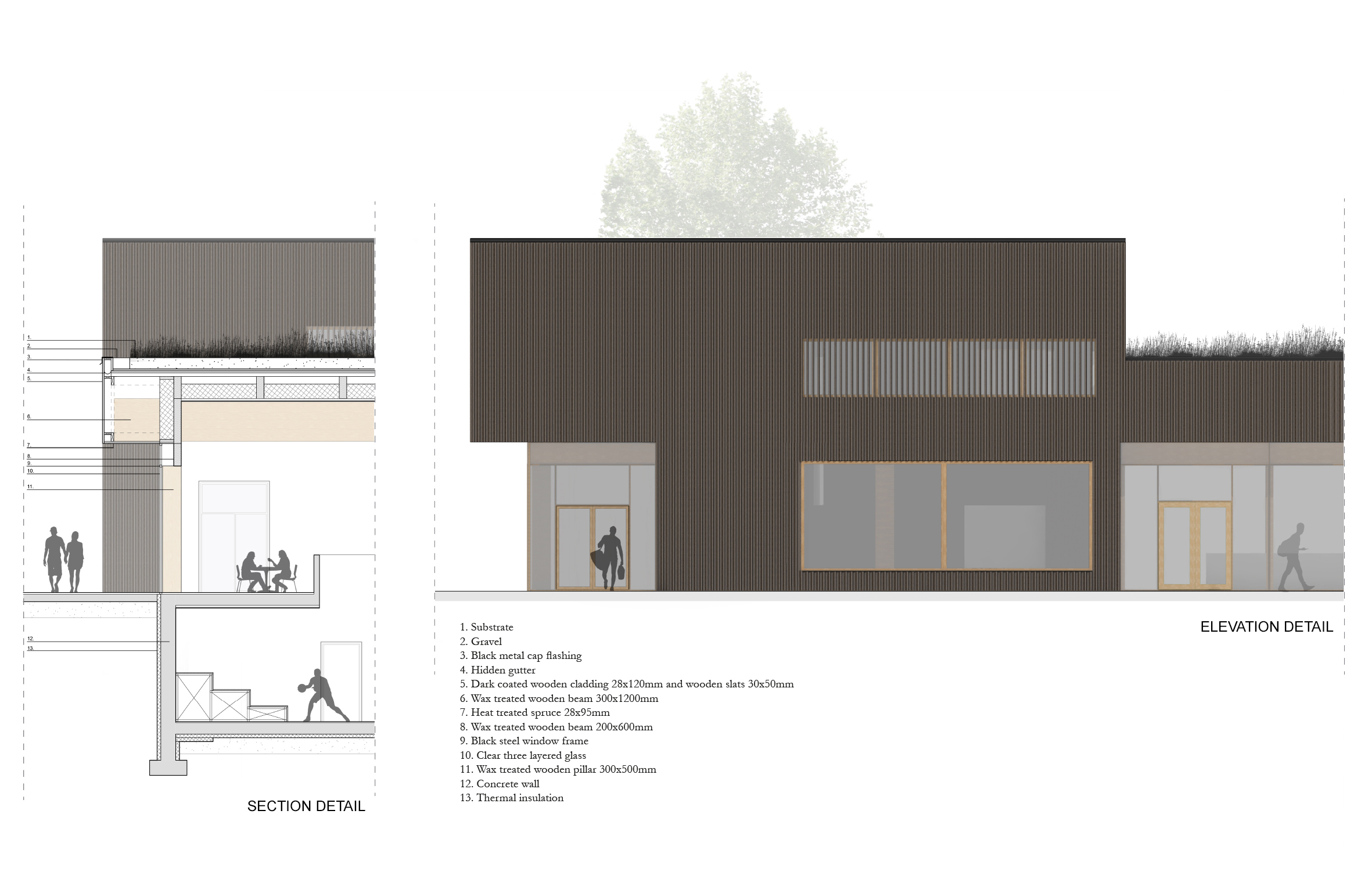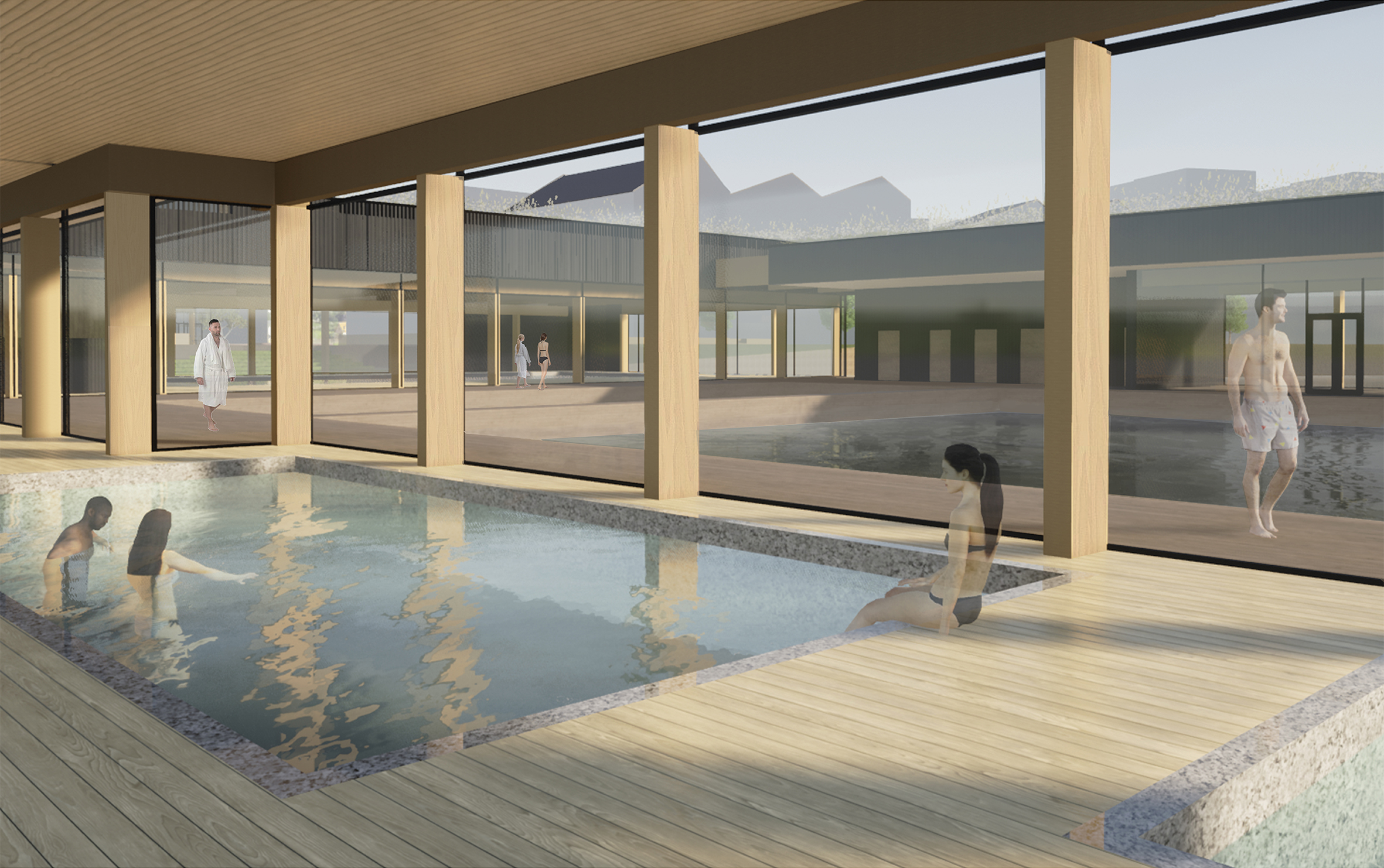 The more public functions, such as a restaurant, sports field, multipurpose space and café, are placed in the building closer to the urban structure. With water being a calming element, the more private and meditative functions are situated on top of the lake. An outside sports field is placed between the two buildings and together with glass facades it creates a connection between the sports hall and swimming pool.