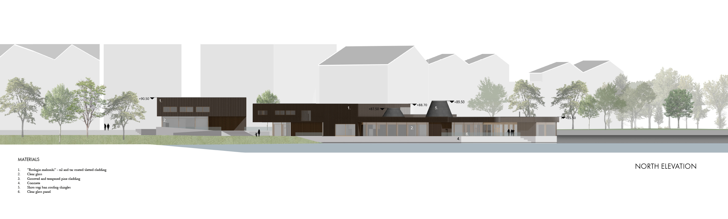 The two buildings are situated in the green zone that circles the lake side. They blend into it with their low, horizontal masses and meadow roofs while connecting the Pyhäjärvi lake’s natural edge to the residential areas urban edge. The buildings got inspiration from old Finnish lakeshore swimming facilities and Swedish bath houses, their atmosphere, wooden material and horizontal deck-like shapes that reach on top of the water. Finnish sauna tradition is also very present in materials, simplicity and atmosphere.