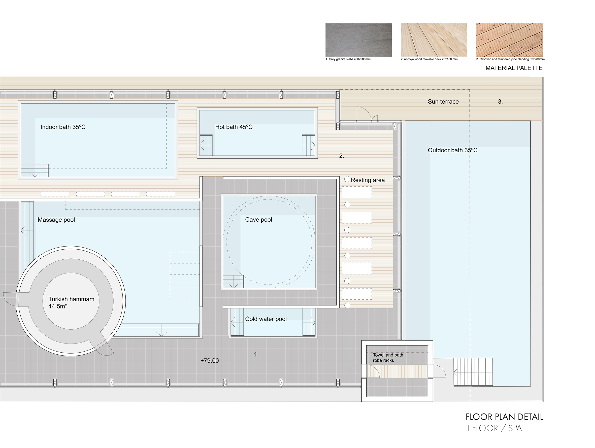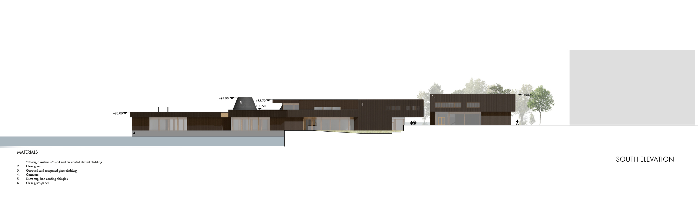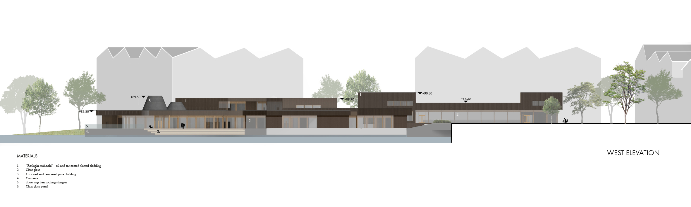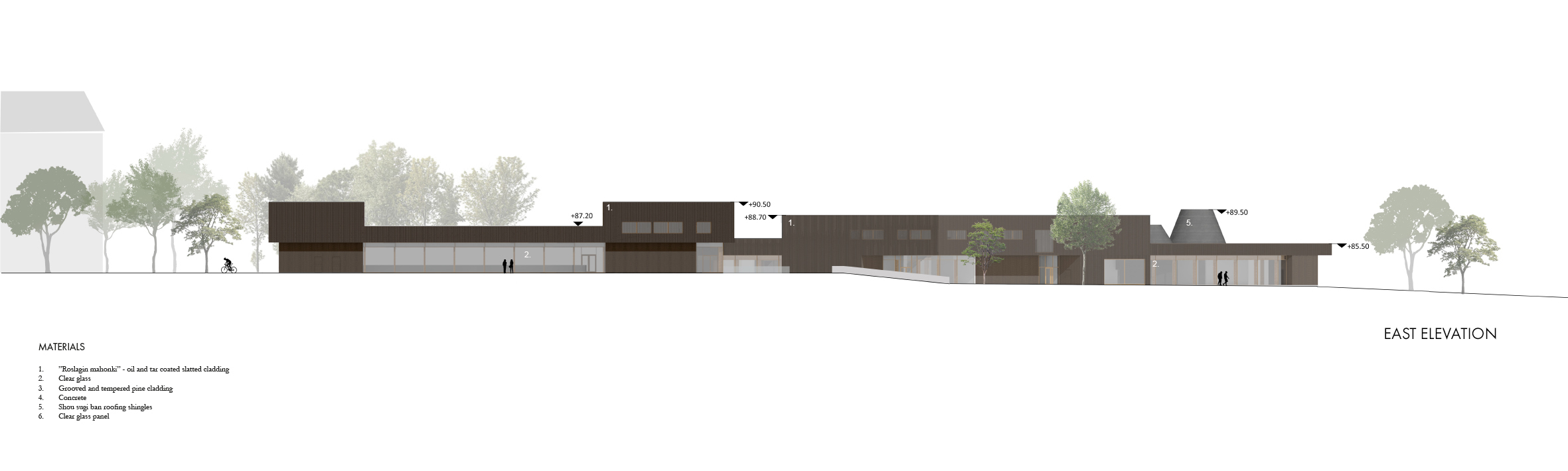 The complex, formed by two buildings, provides a setting for social activities in the form of sports, dining and saunas, as well as spaces for self-reflection during meditation and bathing. The aim was to create a uniform entity, that connects naturally all the different functions and spaces required in the design task.