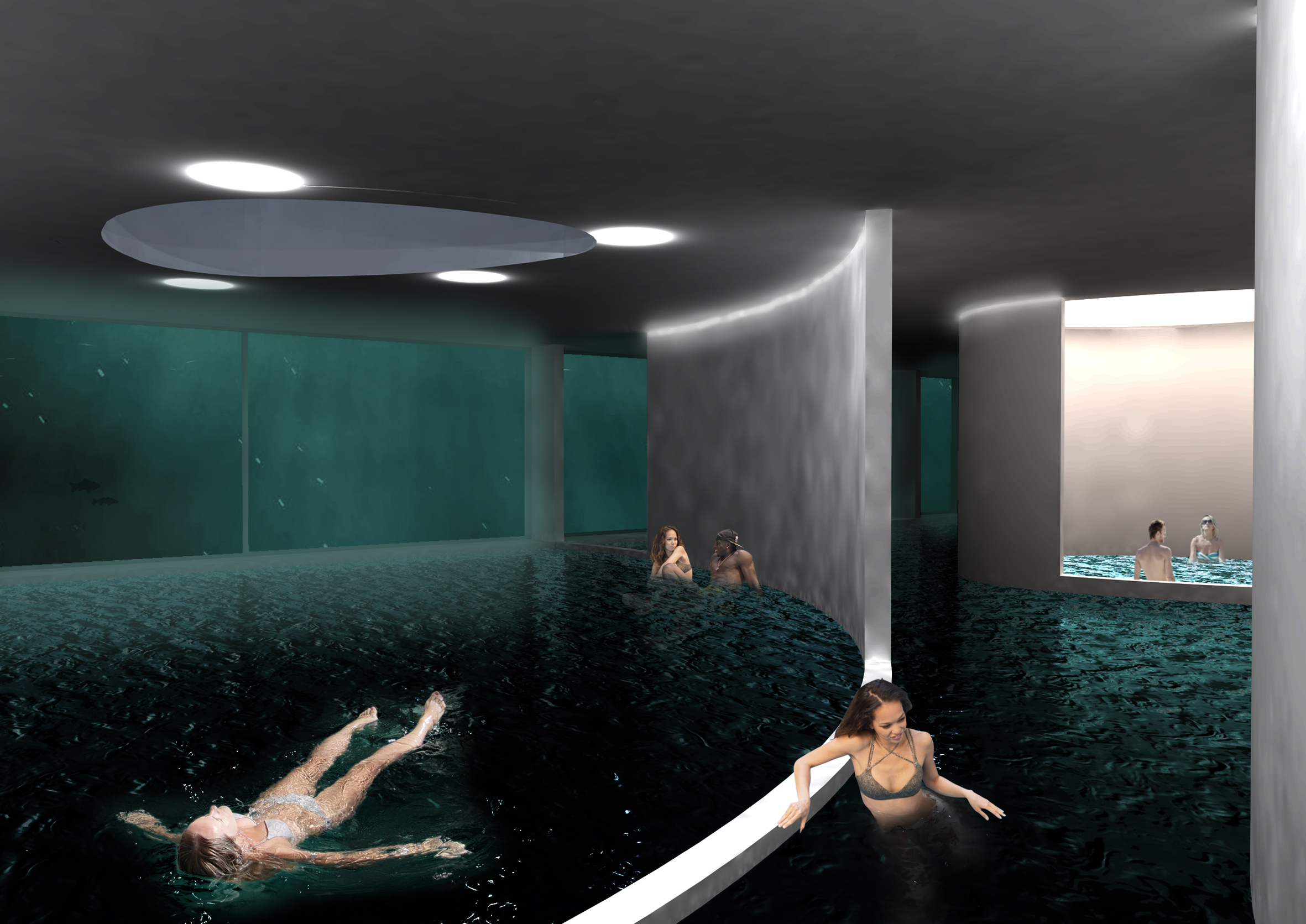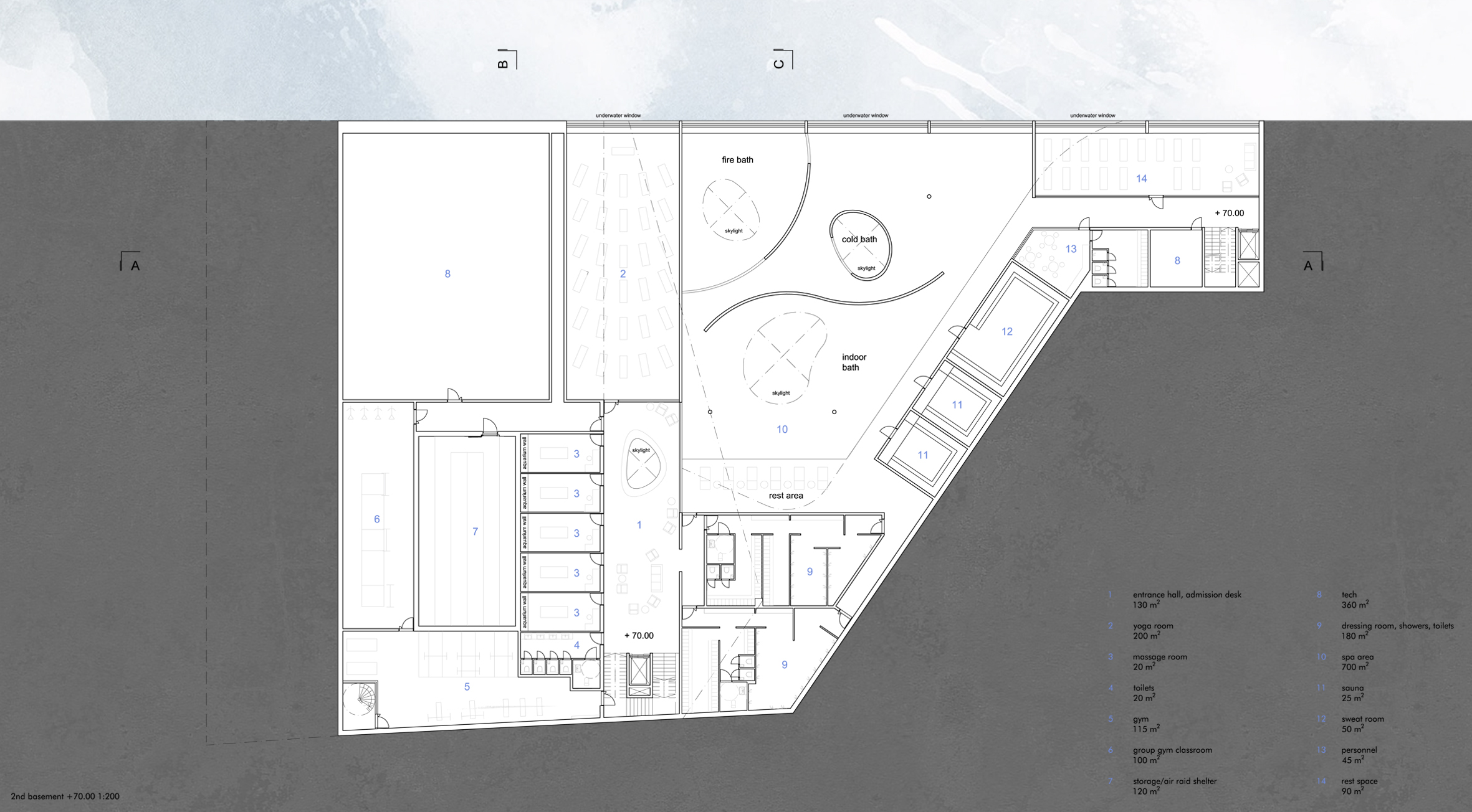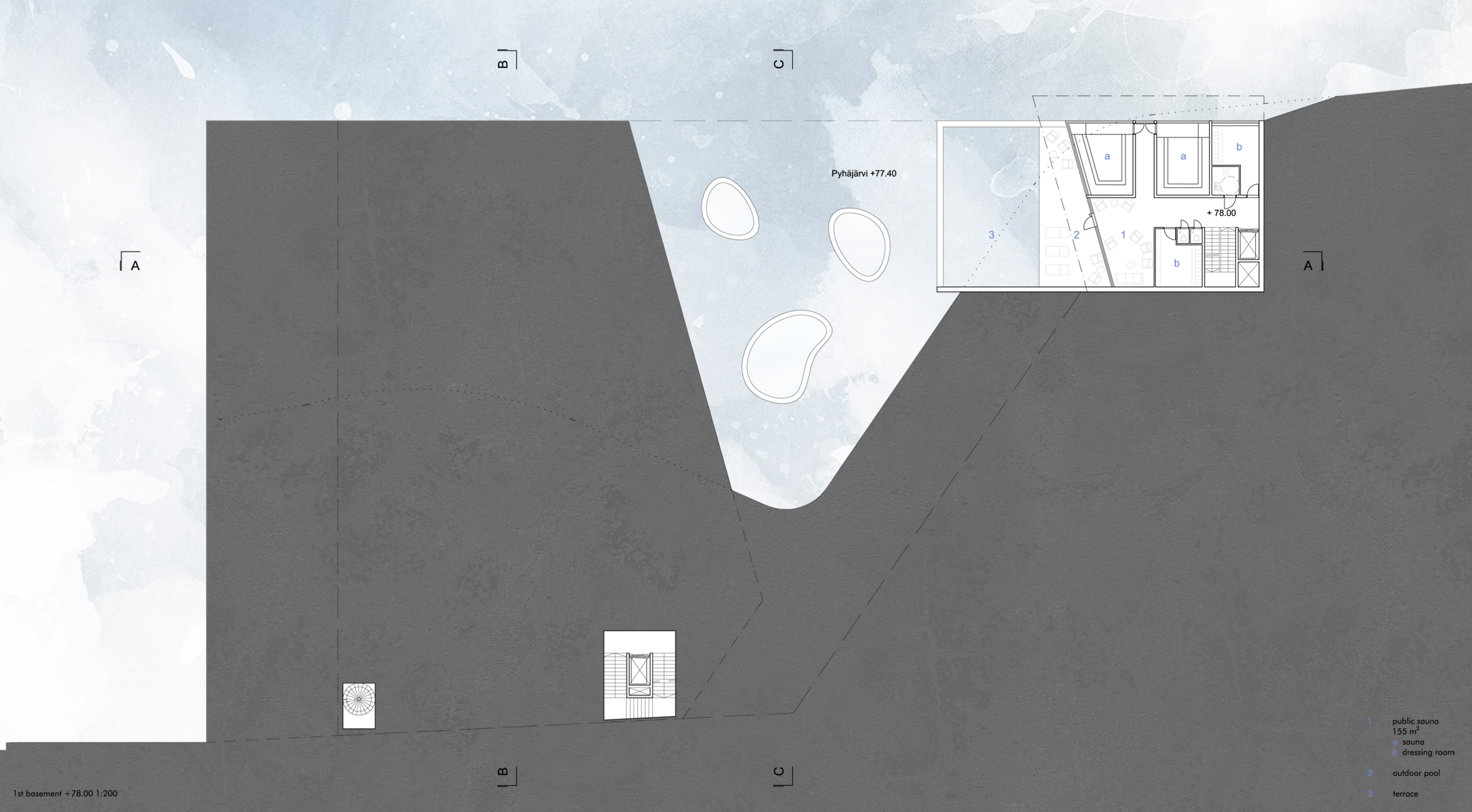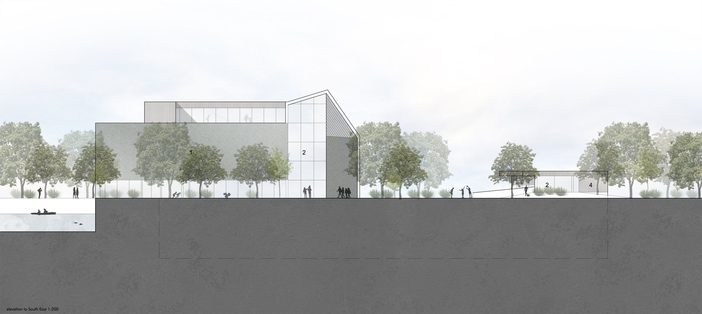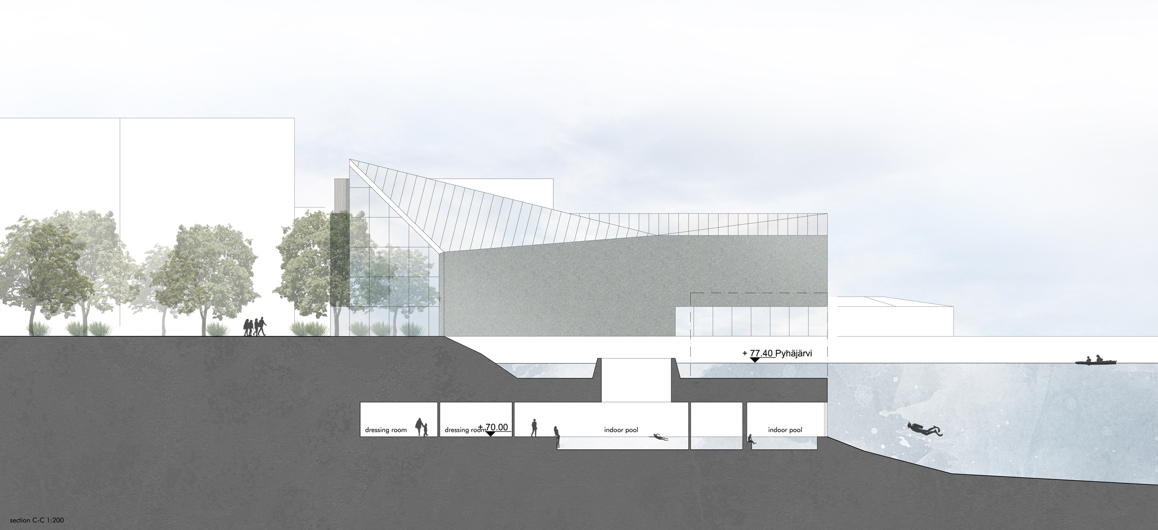The building consists of three storeys and two basement levels, and the mass is in two parts that are connected to each other underground. The wellbeing centre is located on the second basement and the basement is under the lake. Natural light to the basement will come through skylights that pop over the lake surface. There will also be some windows under the lake for atmosphere.
