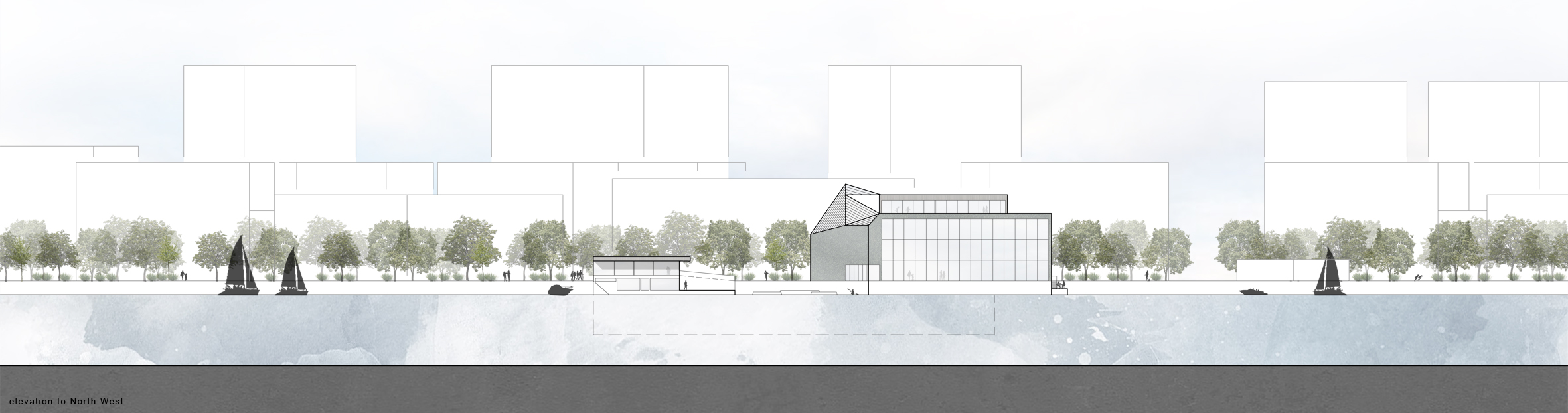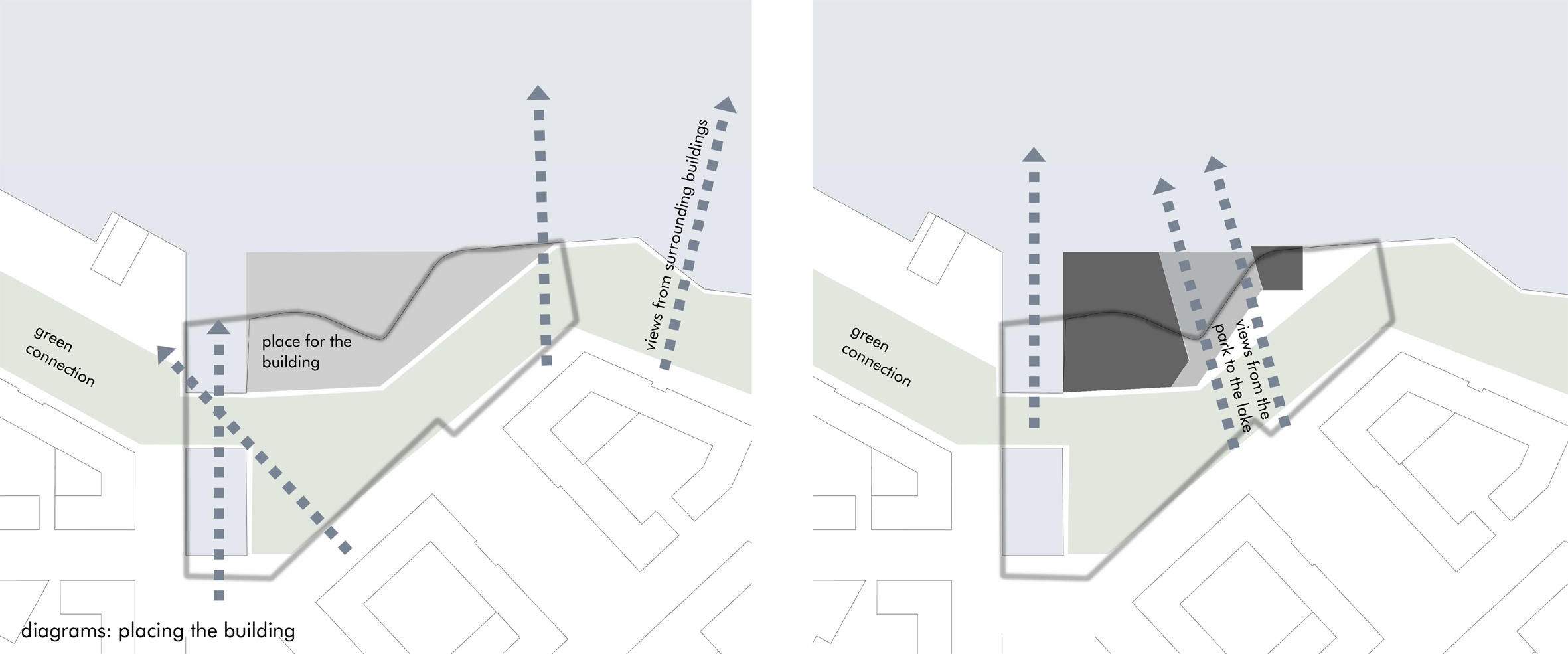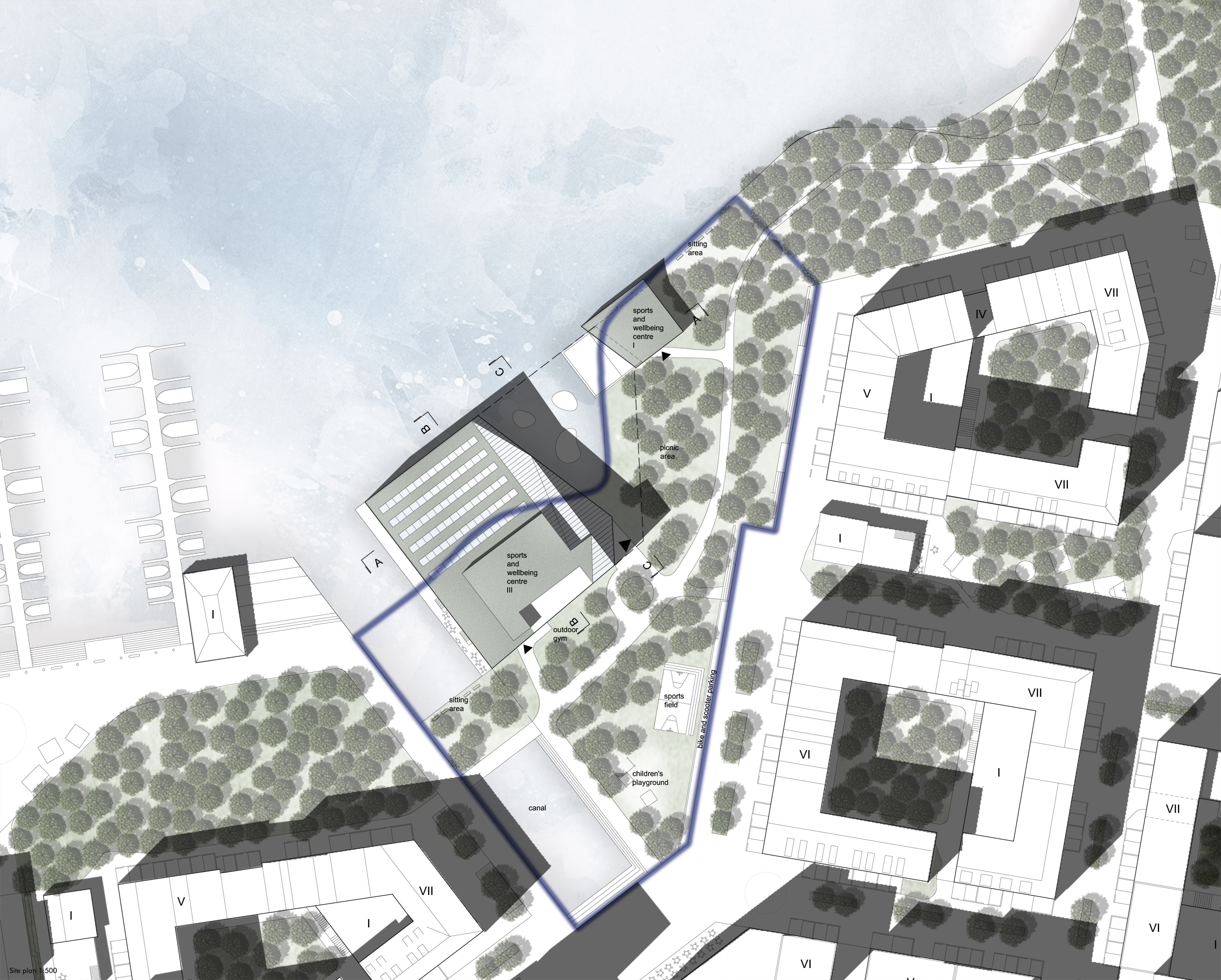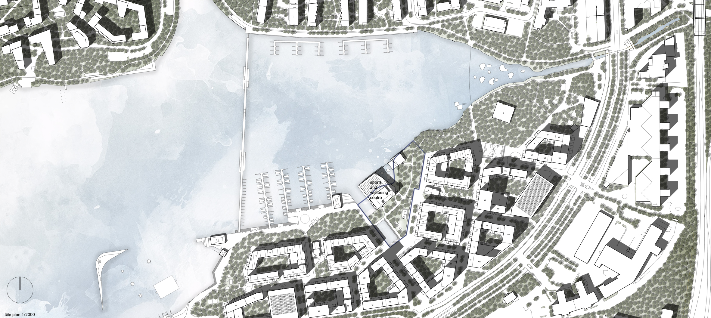 The sports and wellbeing centre is located next to the canal and above the shoreline. The continuance of the green corridor by the shoreline dictated the place of the building. By placing the building near the shoreline, the park was able to be brought to the plaza and the residential buildings. The sports and wellbeing centre has a direct access to the lake and the entrance to the building will be through the nature.