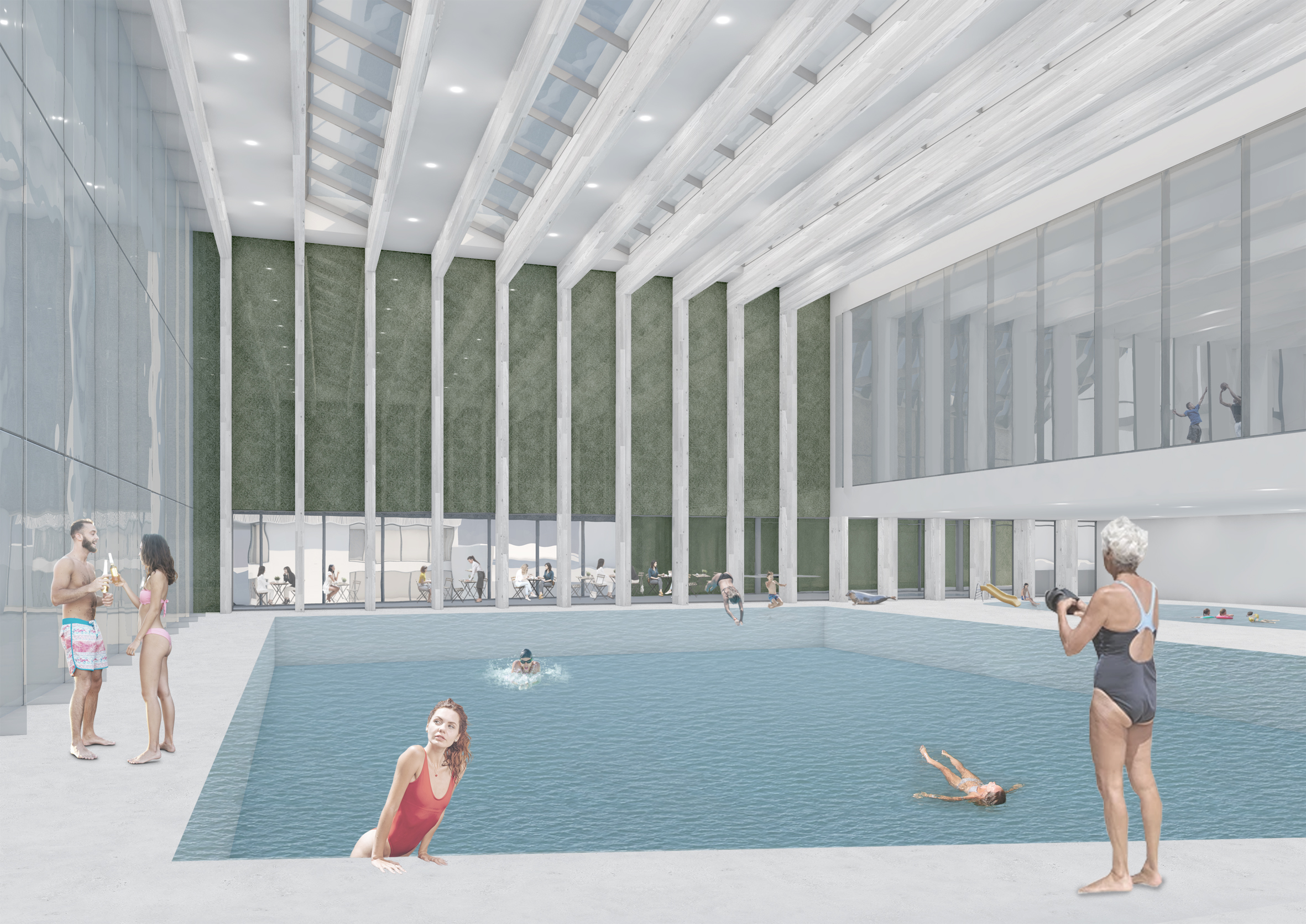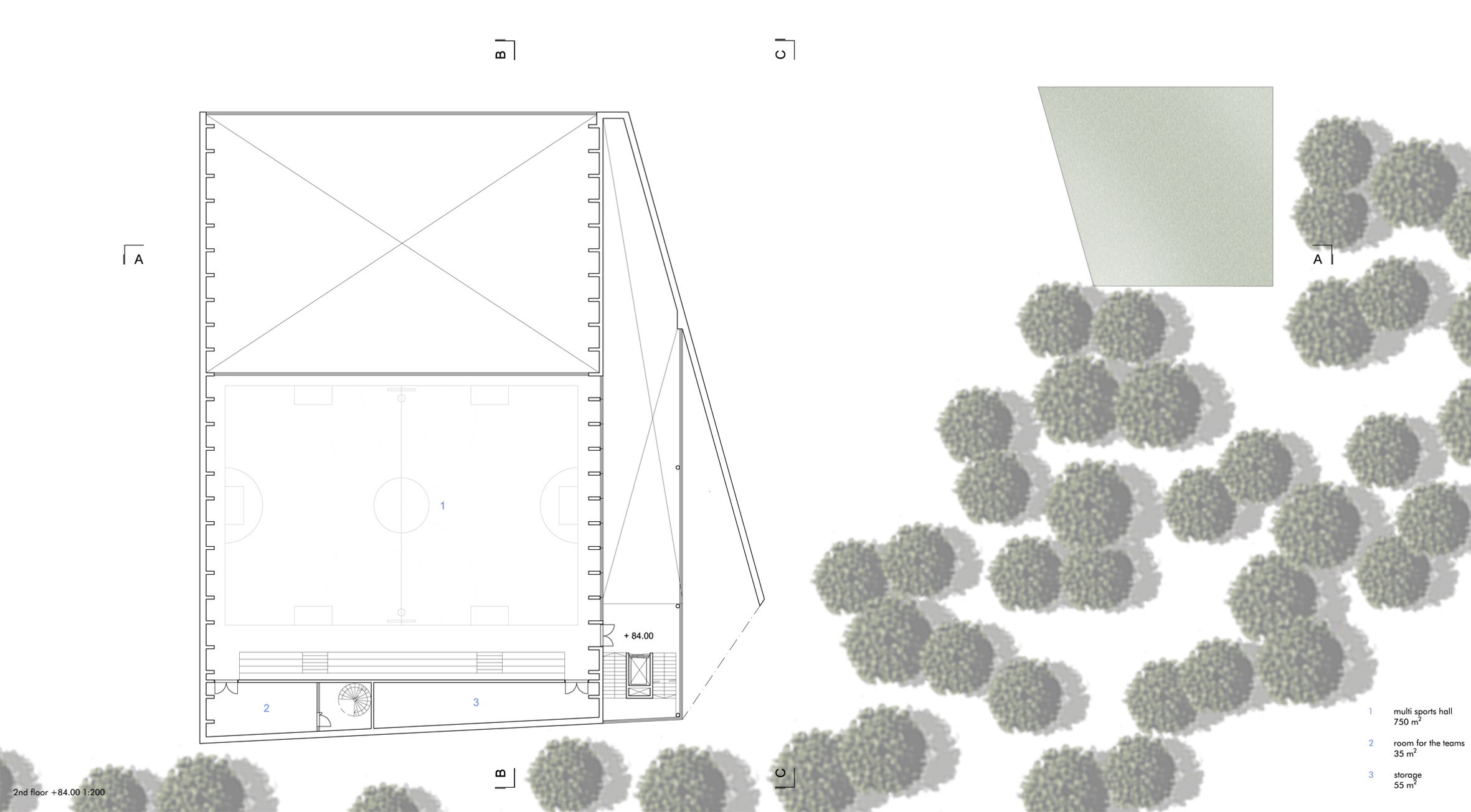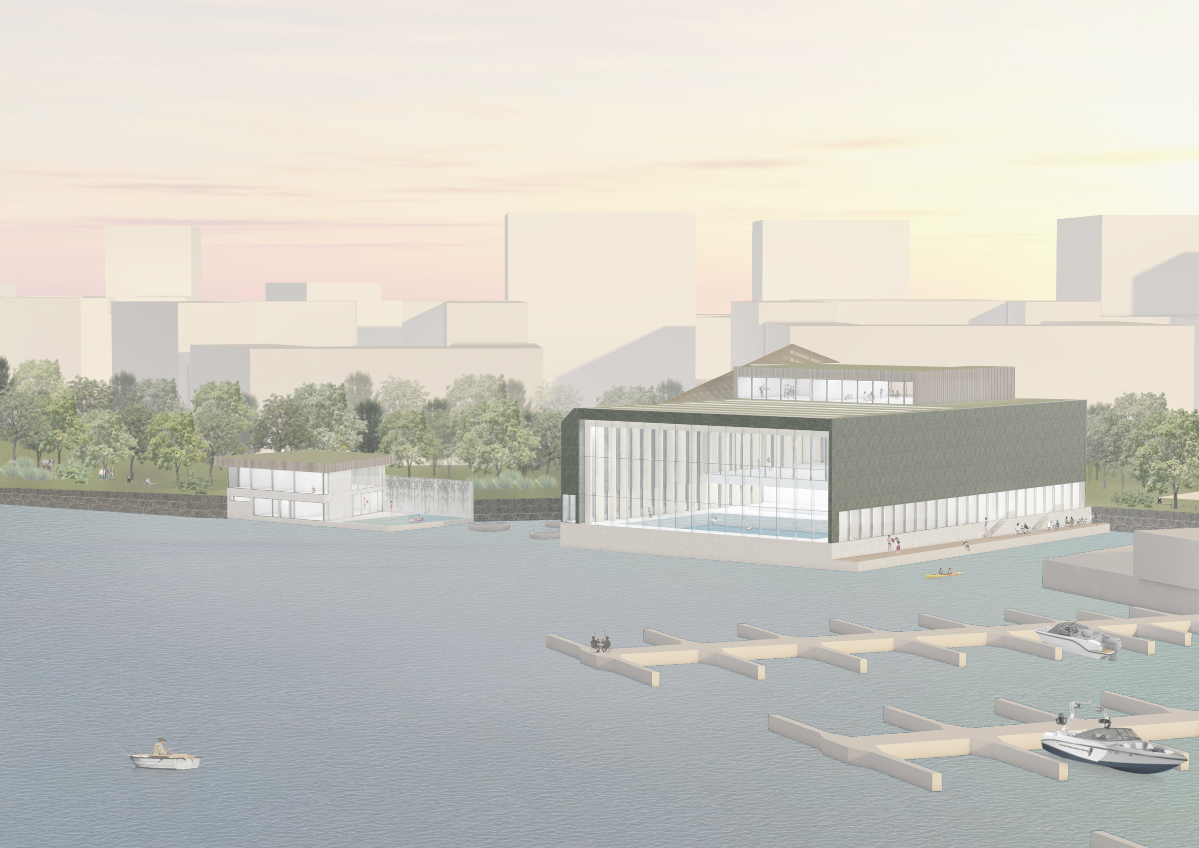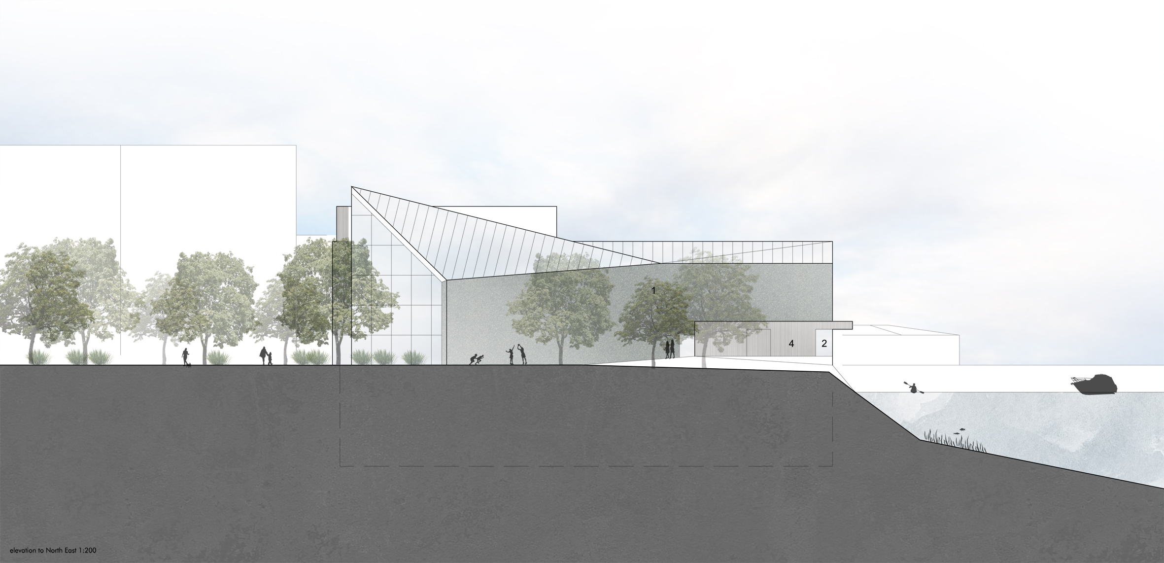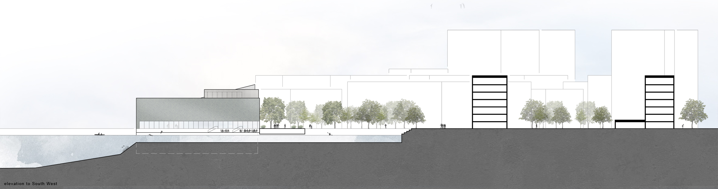 The sports and wellbeing centre is located next to the canal and above the shoreline. The continuance of the green corridor by the shoreline dictated the place of the building. By placing the building near the shoreline, the park was able to be brought to the plaza and the residential buildings. The sports and wellbeing centre has a direct access to the lake and the entrance to the building will be through the nature.