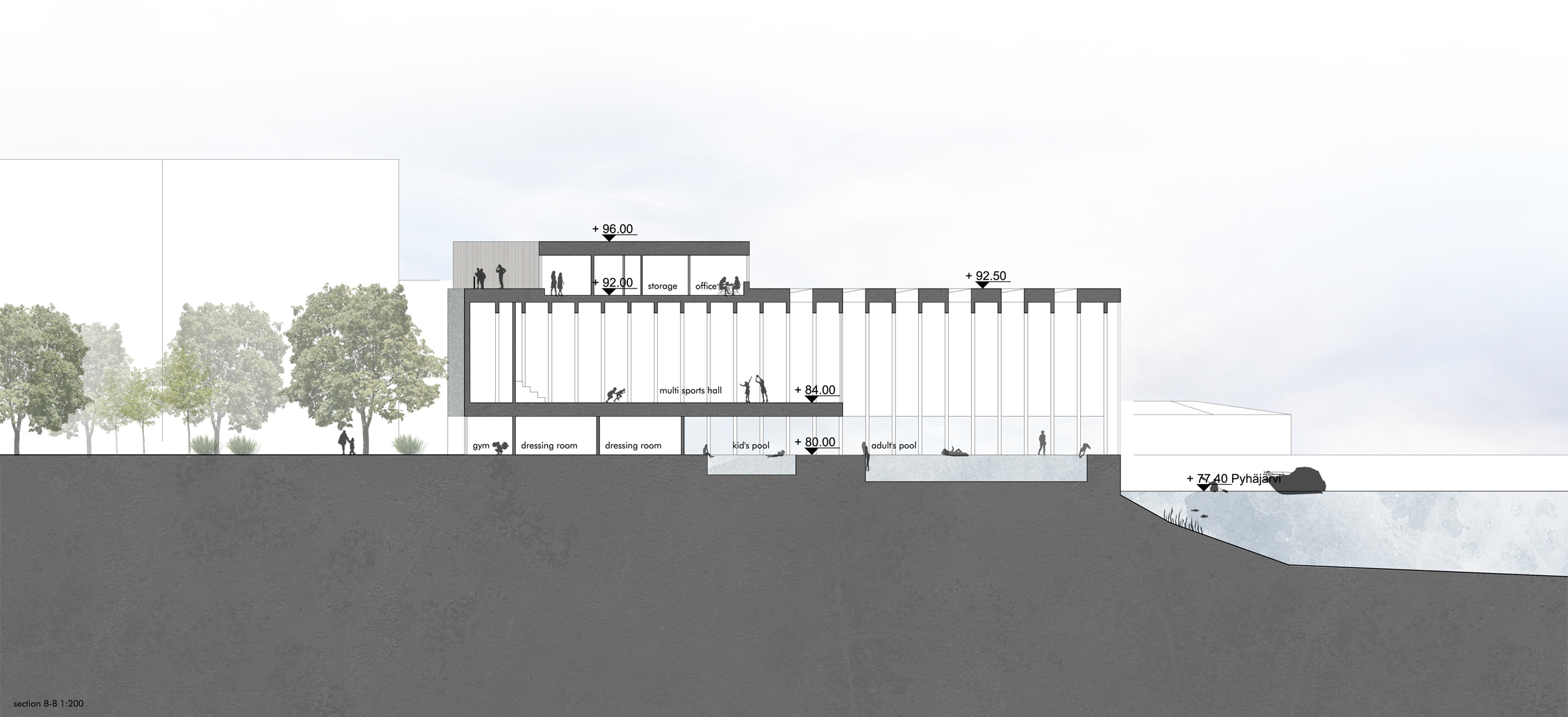 Finland is a country of thousands of lakes and also known for its forests. Puistossa means in the park in Finnish, and the word represents the main idea in this sports and wellbeing centre. Puistossa is a place surrounded by nature, both water and land. It is a place where people can go and relax as well as do sports. It is a place to be quiet but also a place to meet friends. Puistossa is meant to take nature closer to the busy city people.