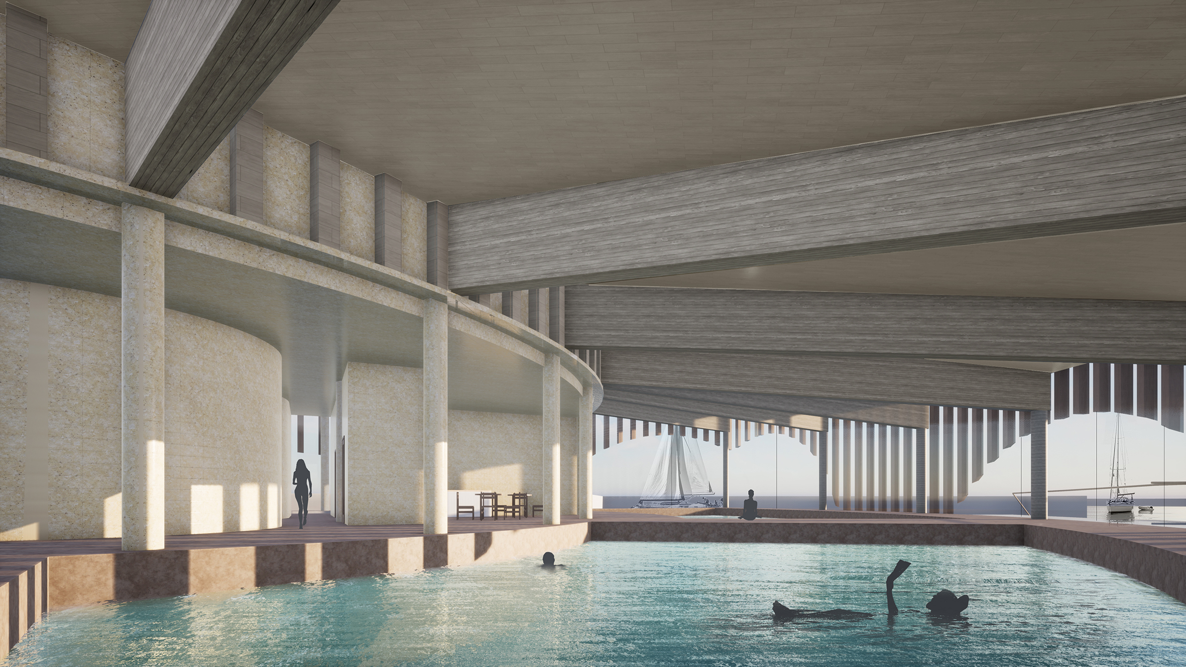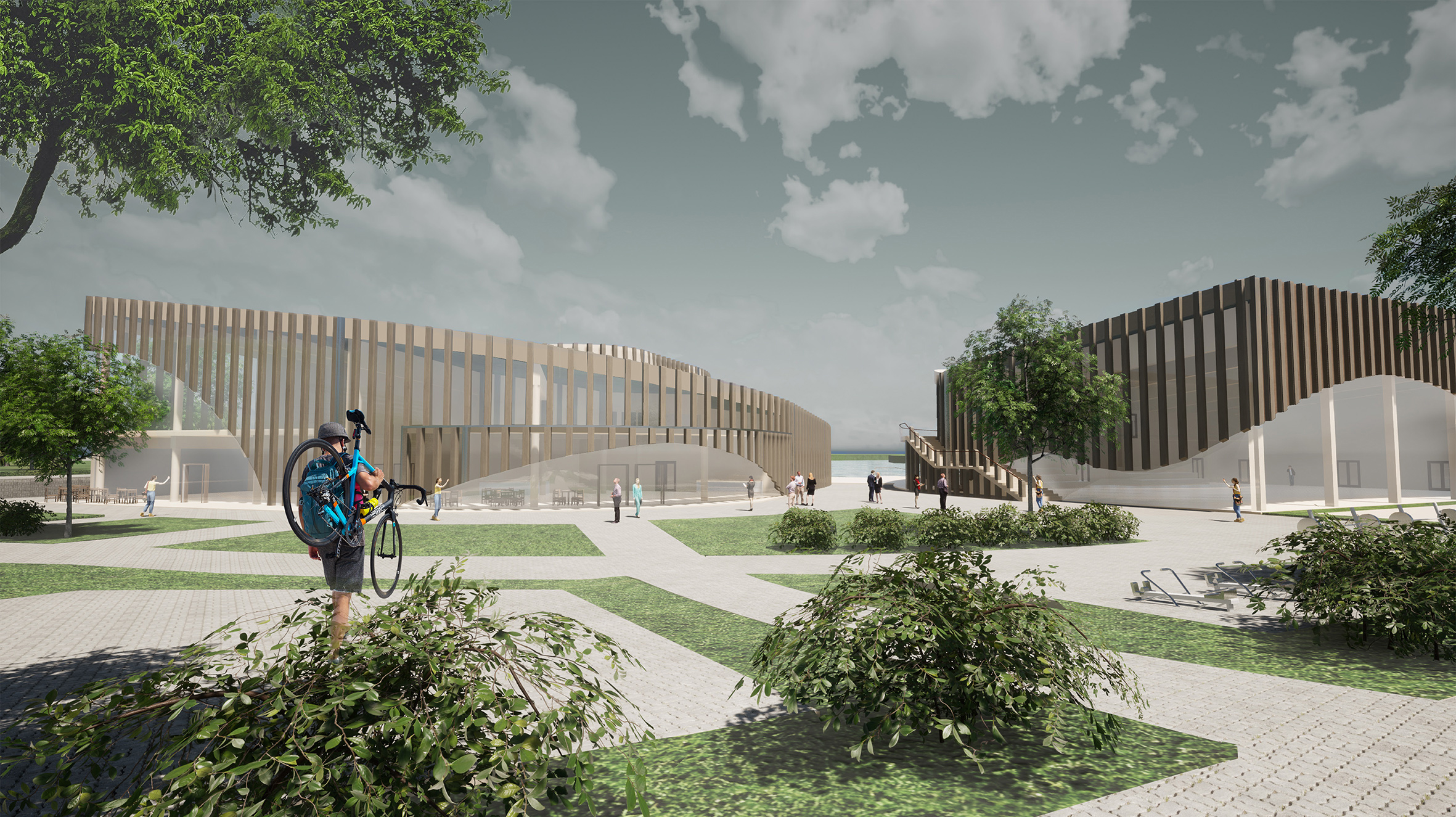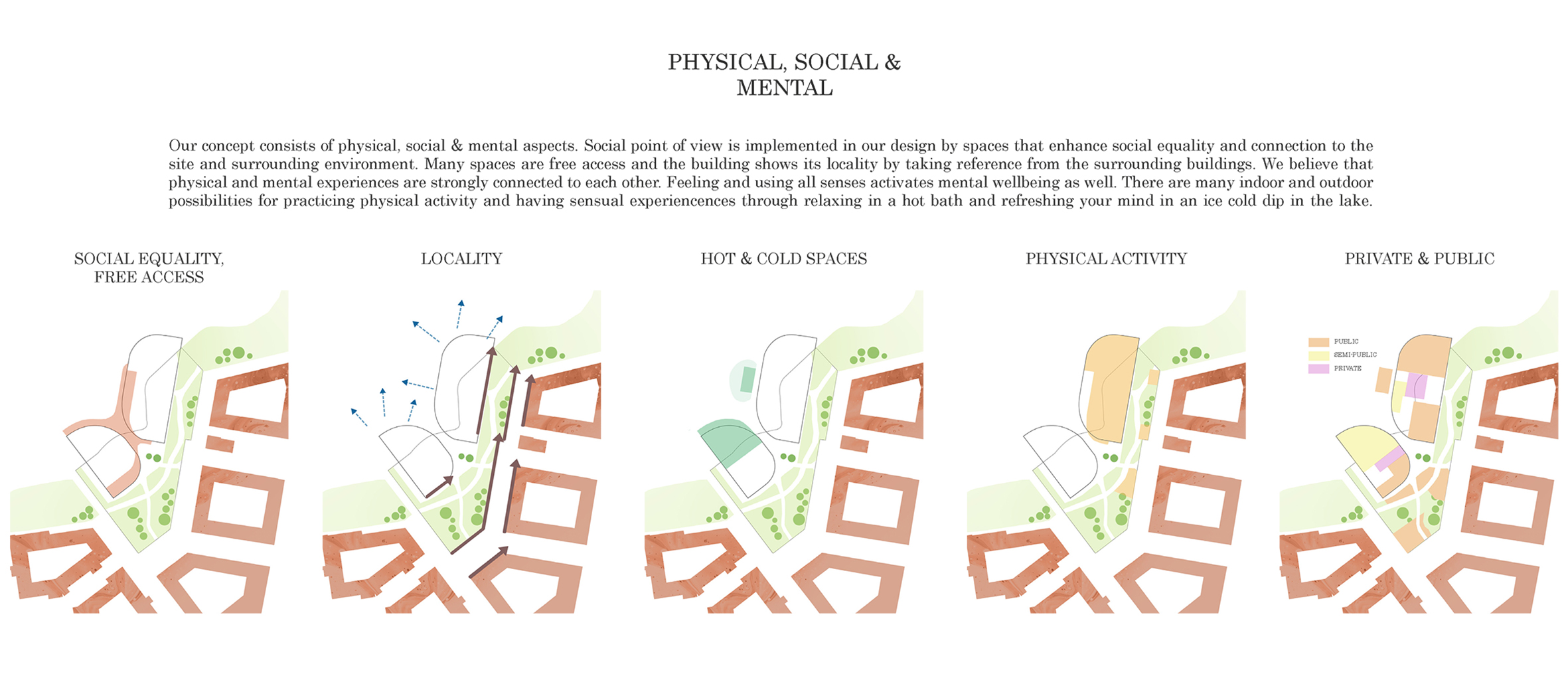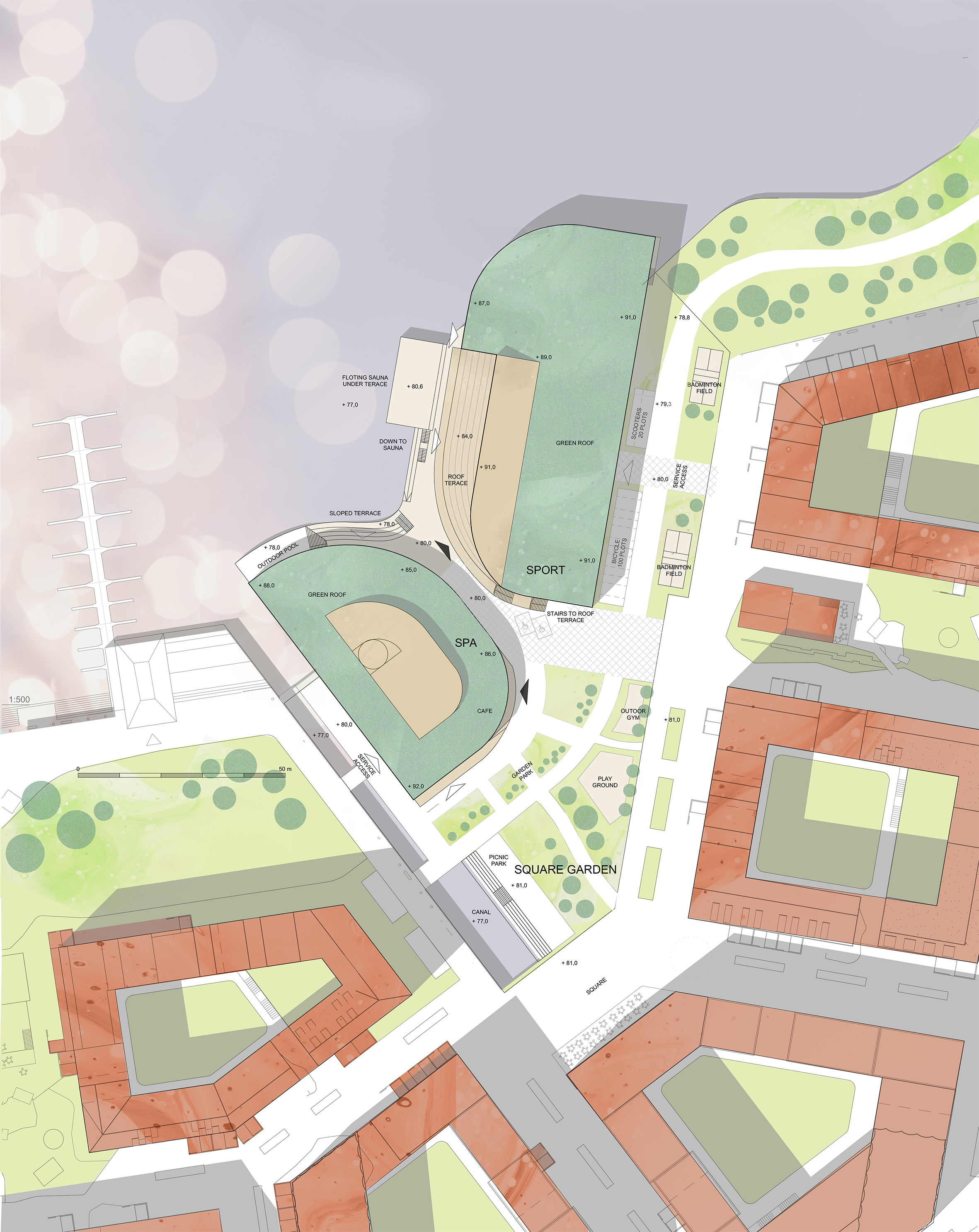 The concept RESURFACE encourages to feel and focus on the essentials of life. Physical, mental and especially social aspects of life are in the core of our design. Many parts of the center are open to all without admission. People can take over the place by being in, on, under and in between the building.