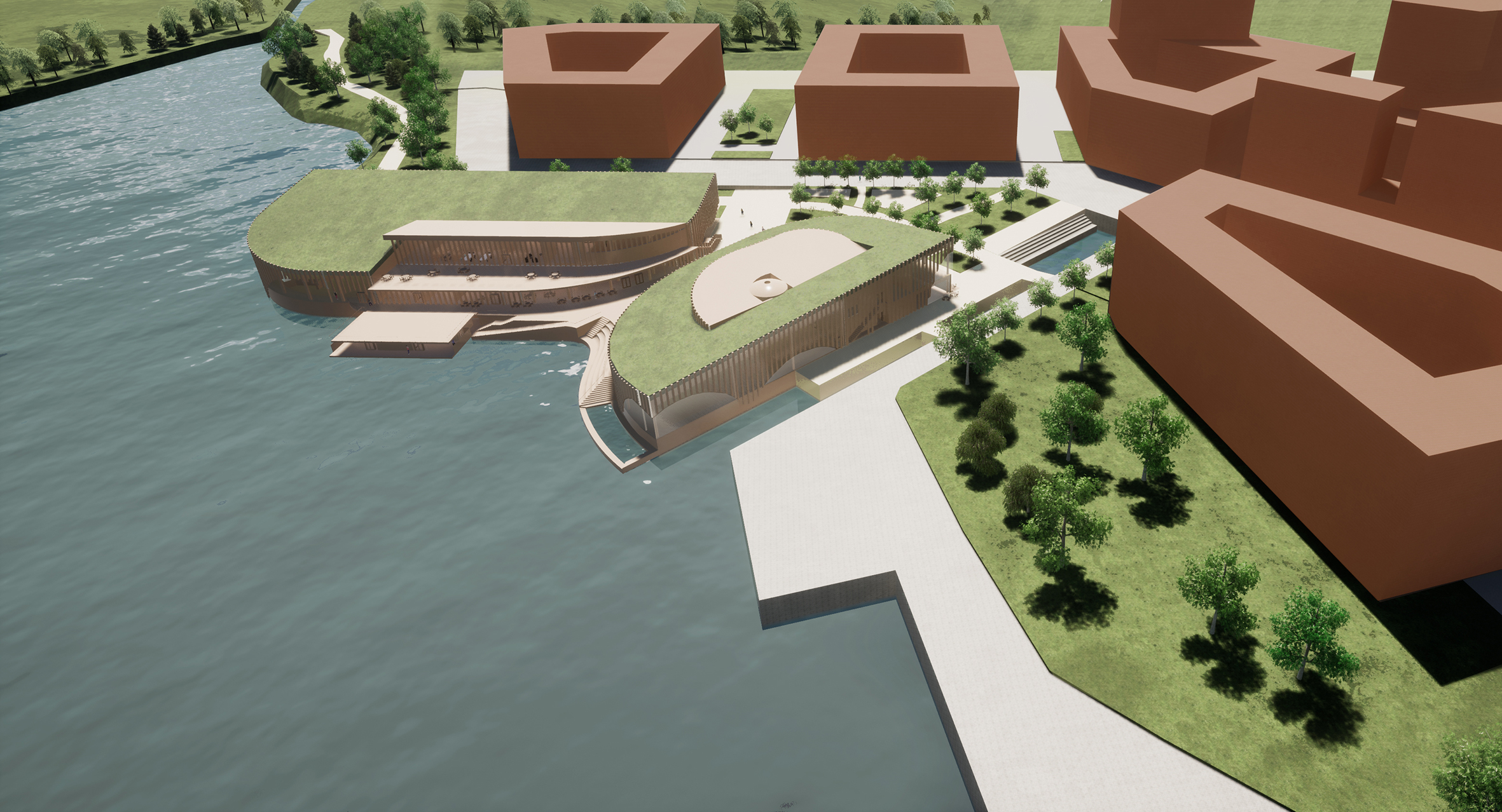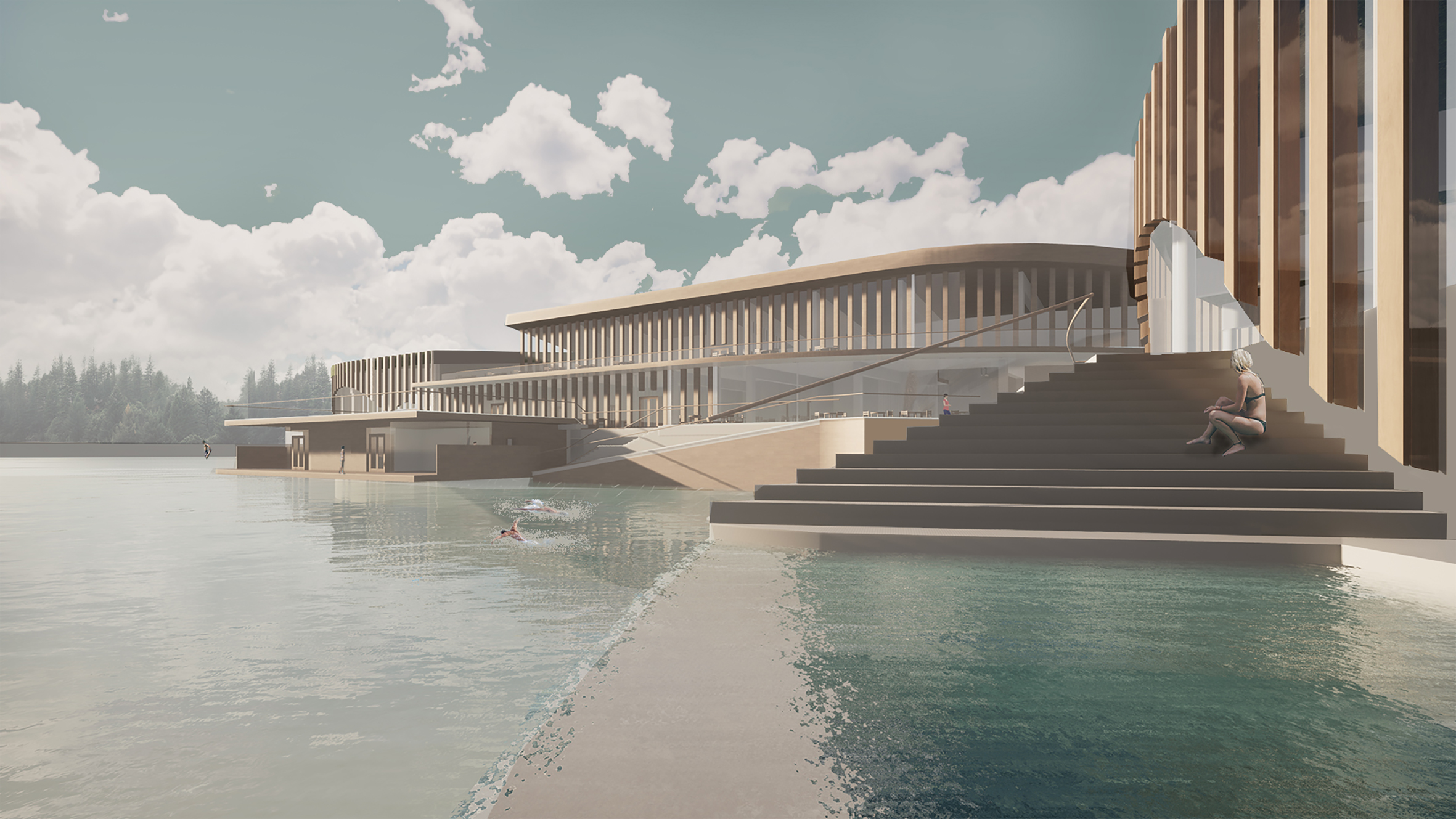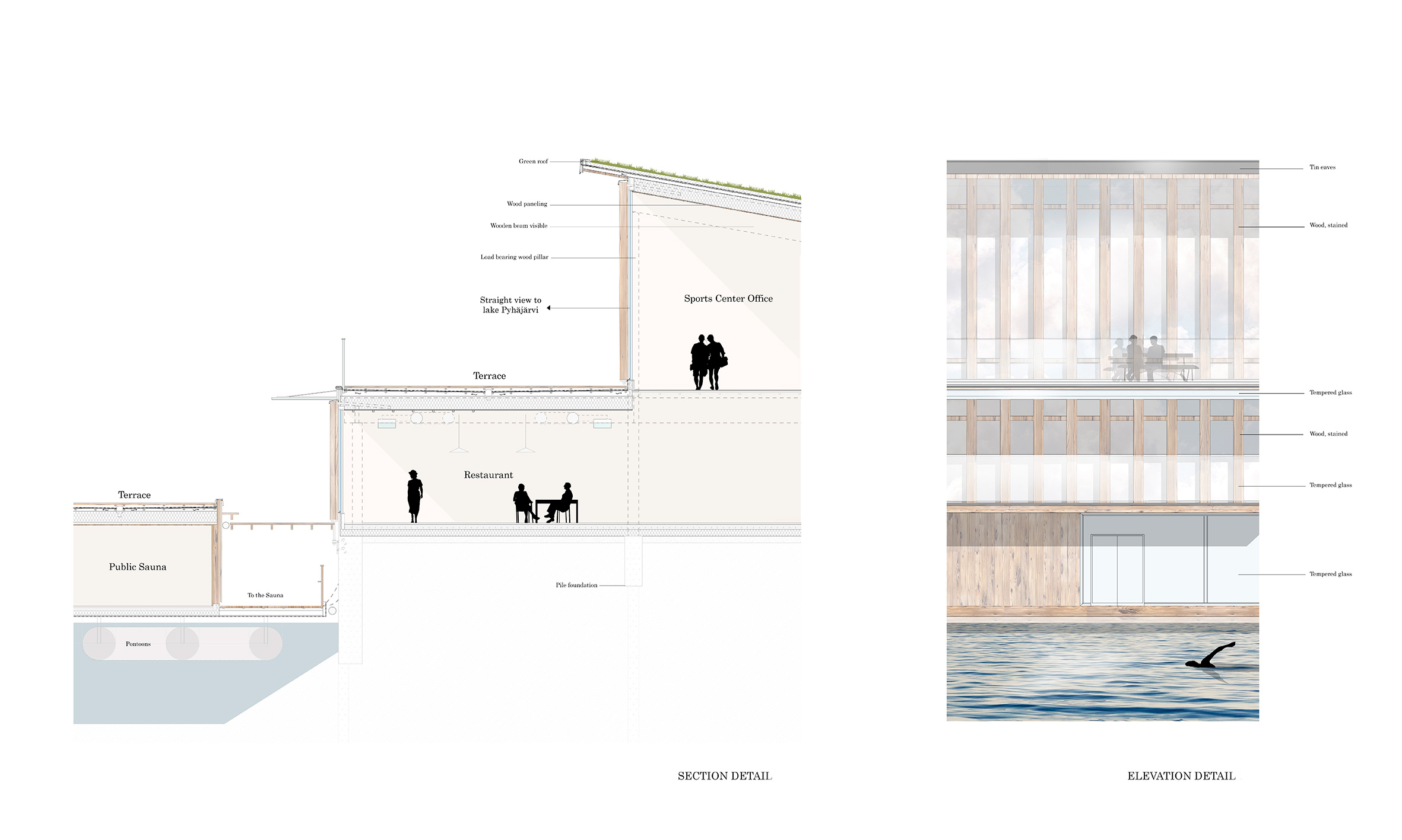 Positioning the building partly on top of the water enables great panoramic views from the building to the city, Pyhäjärvi and Pyynikki. The positioning also makes the continuity of the green corridor by the lake possible. Square Garden between the building and the square enable large open multipurpose outdoor space by the canal.