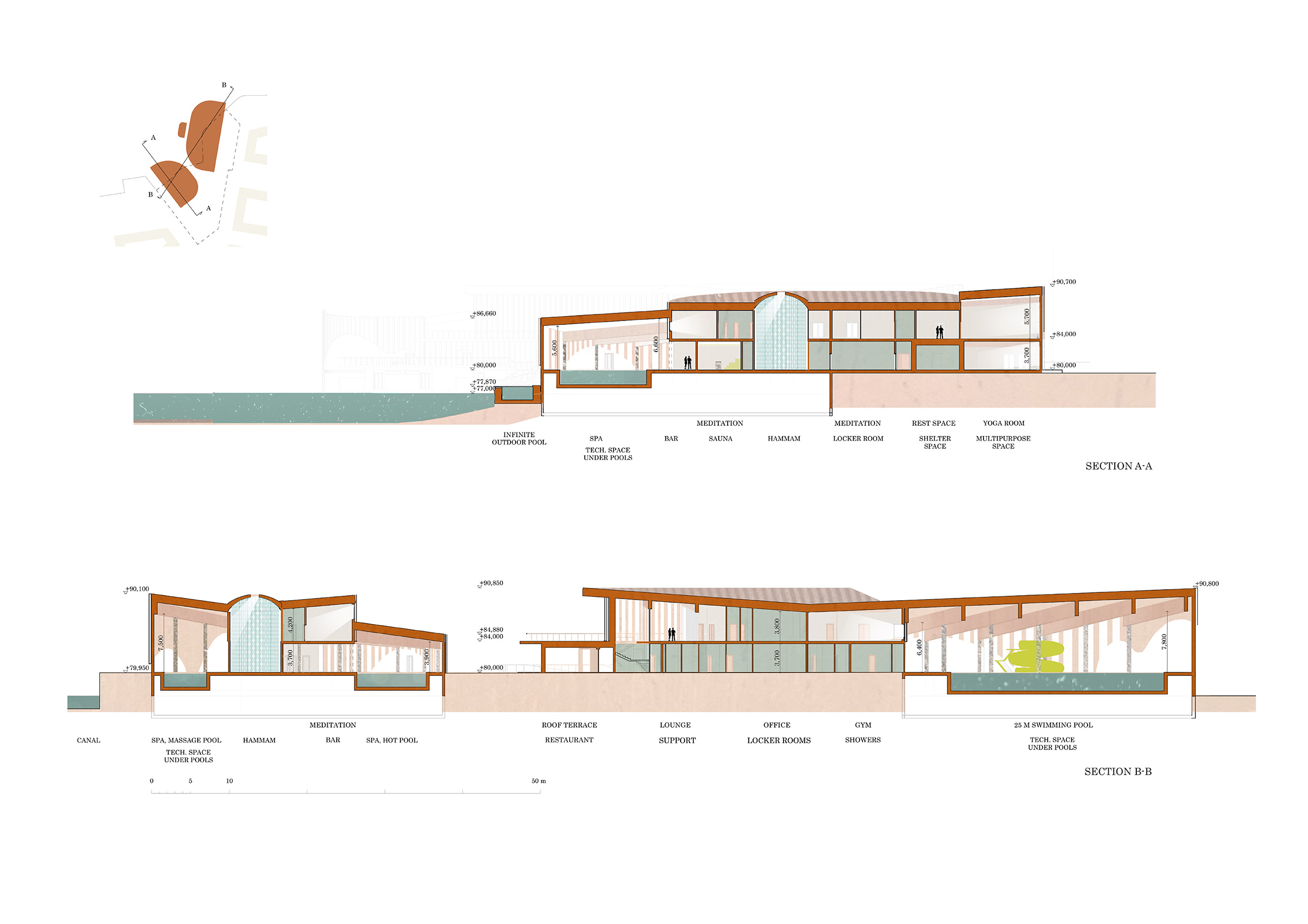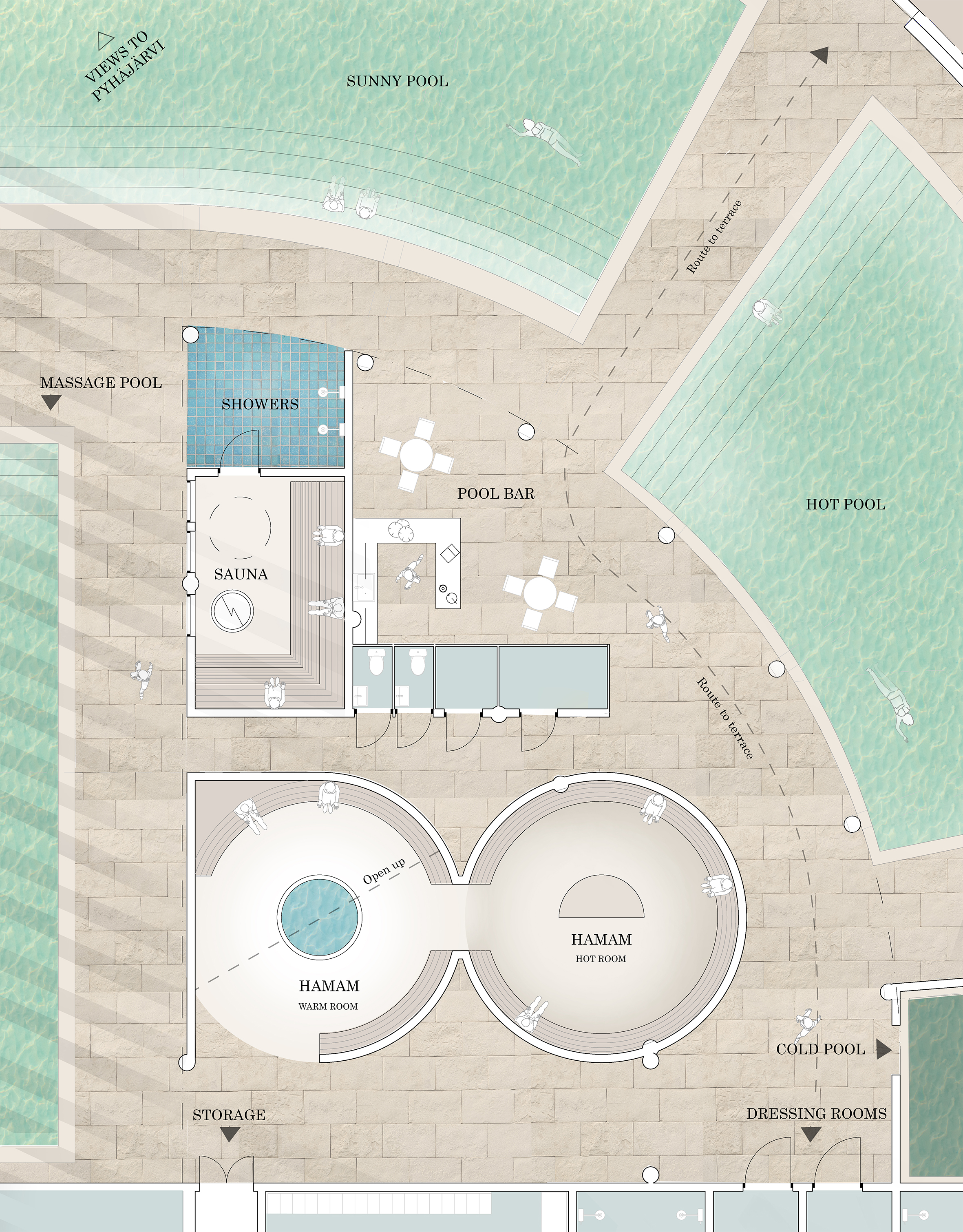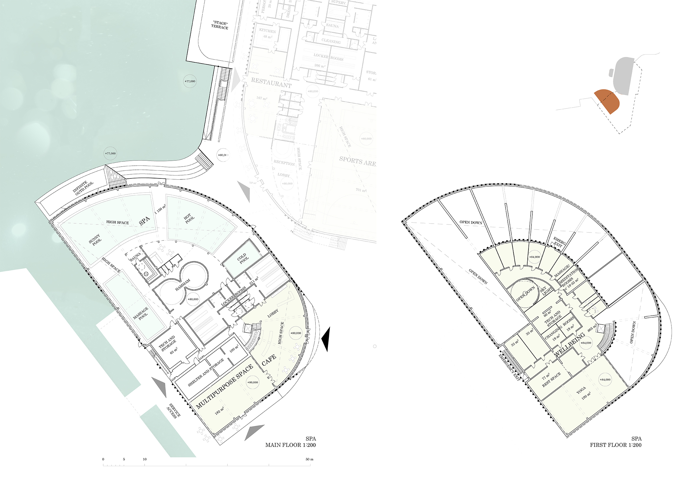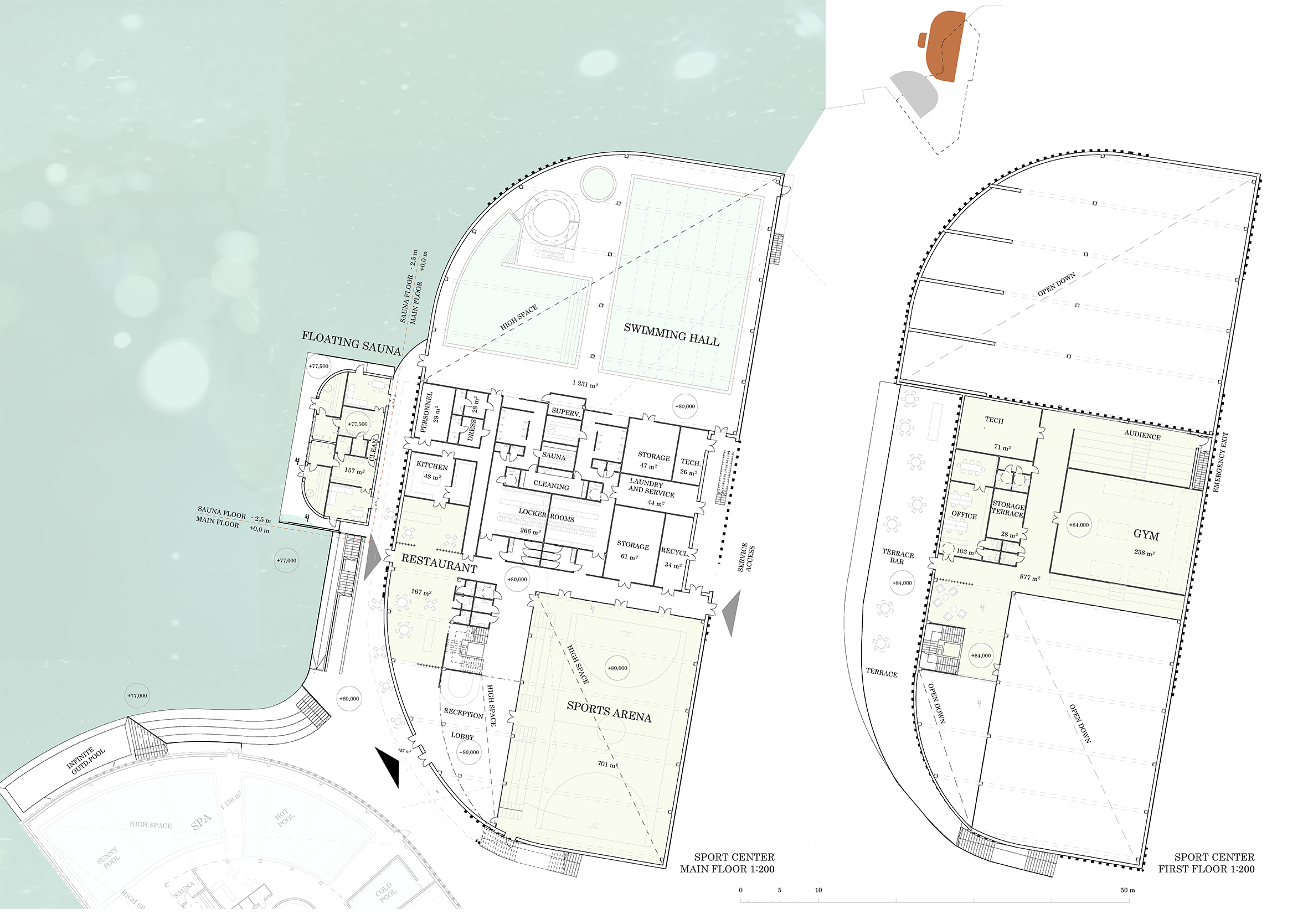 Net floor area in Spa building is 2 550 m² (gross 2 900 m²) and in Sport center 3 500 m² (gross 4 300 m²). Total area is 6 050 m² (gross 7 200 m²). Addition to that there are large terraces and usable roofs. Large technical spaces for water filtering below pools are not included in the numbers.