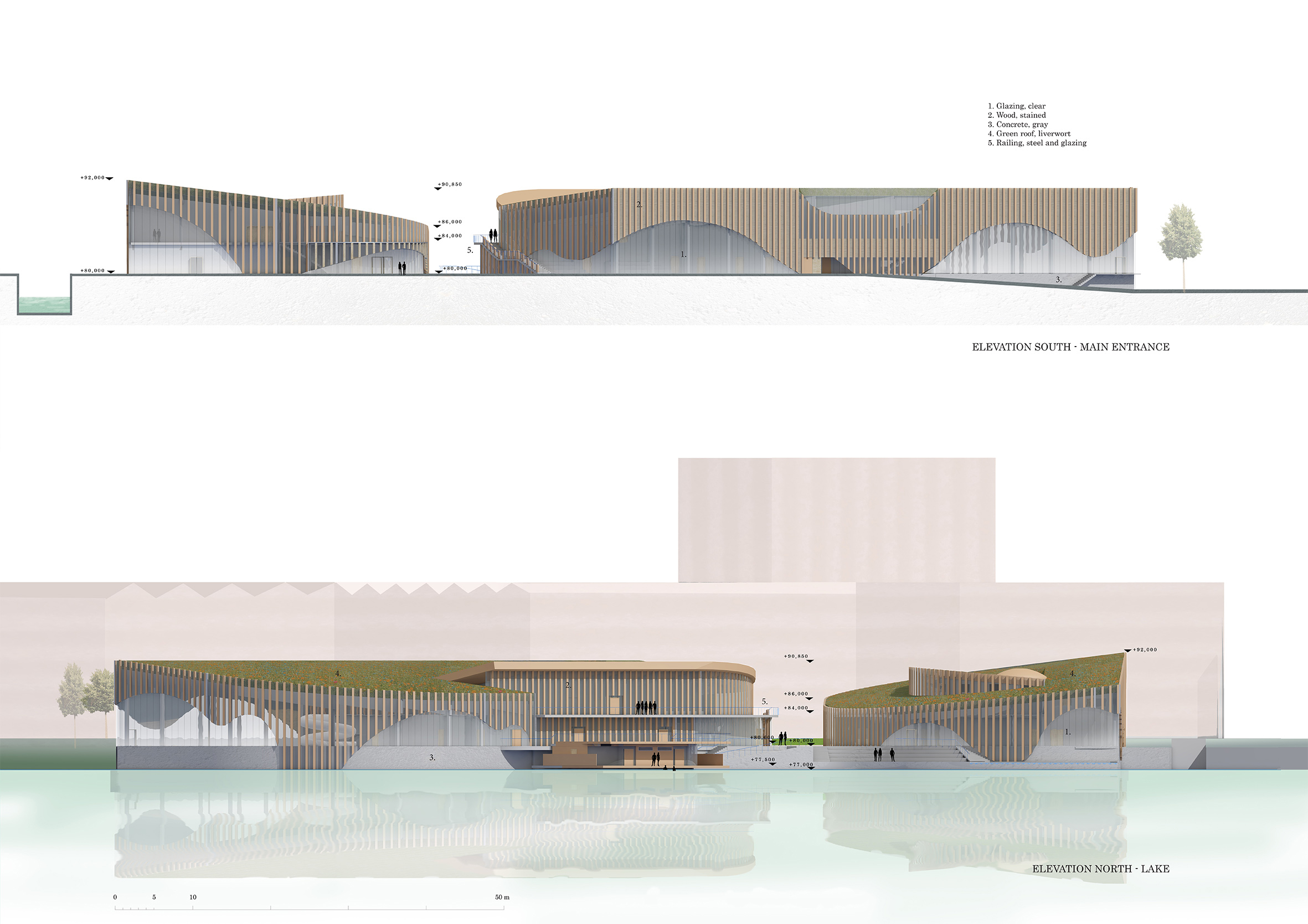 The two building masses are relatively simple. The special places between Sport and Spa are natural locations for entrance and enjoyment. Tilted roofs and altering facades create diverse and interesting spaces inside and outside of the building.