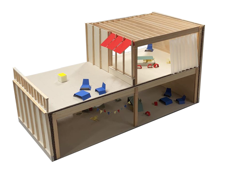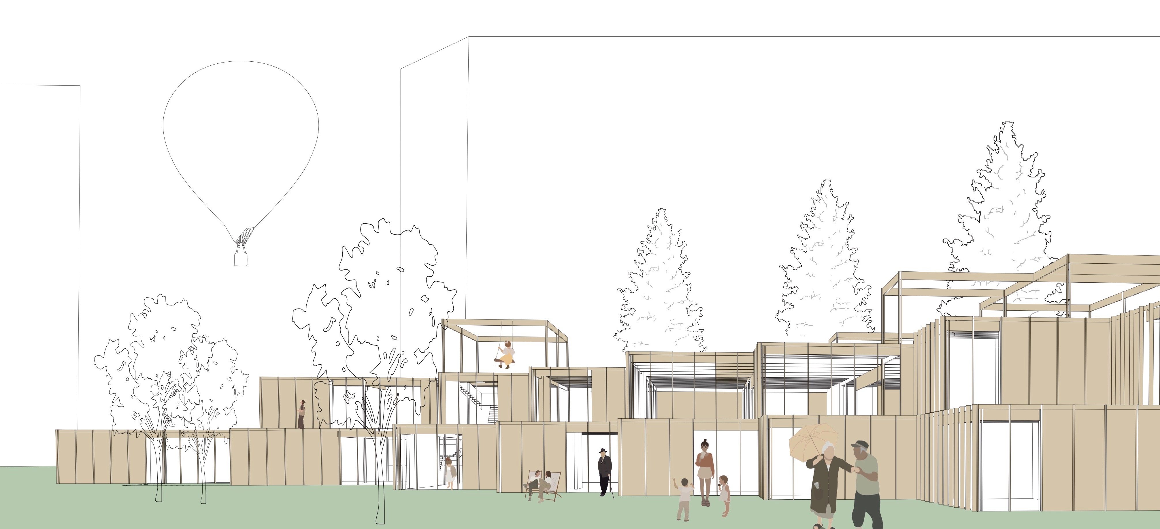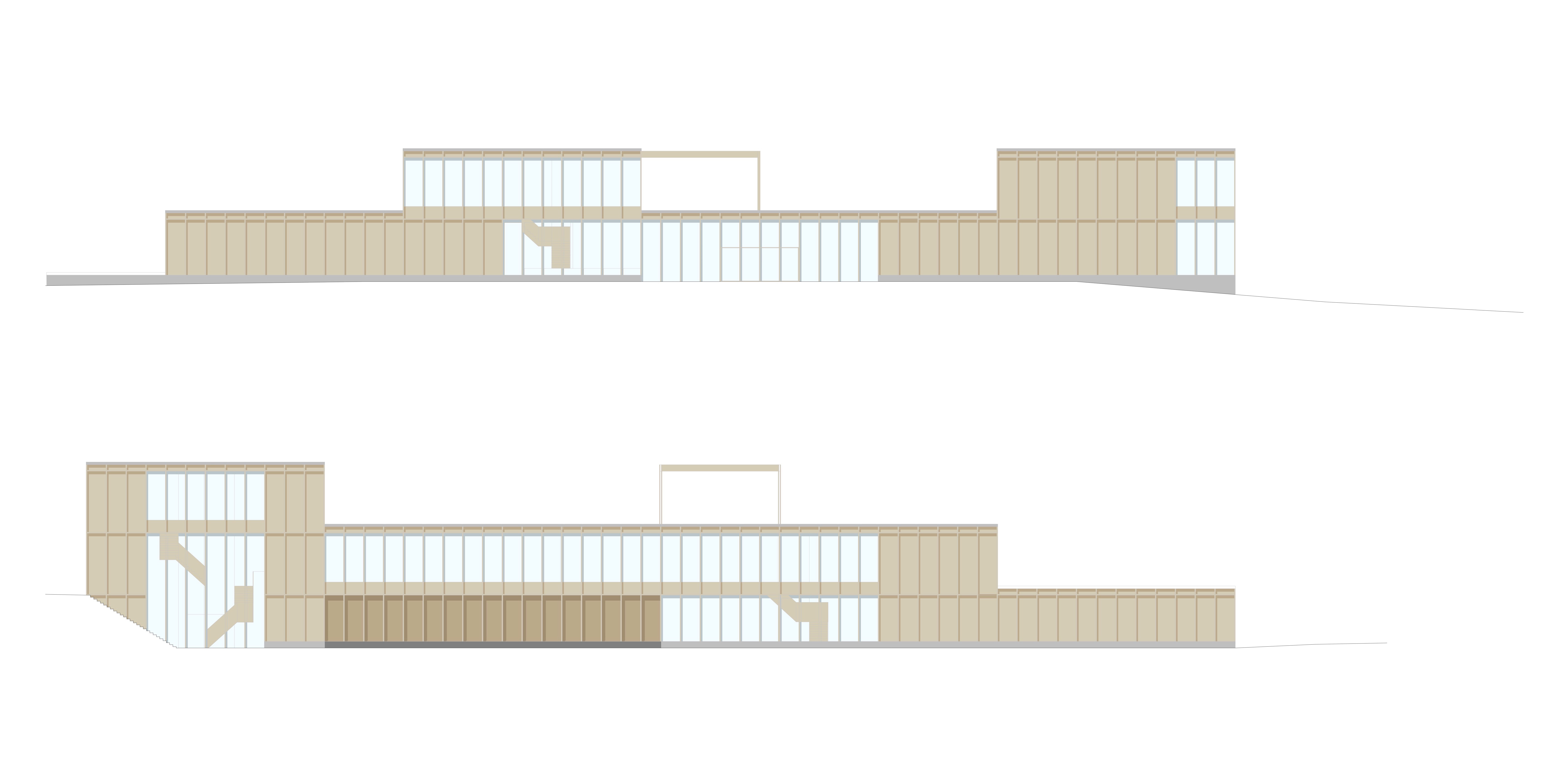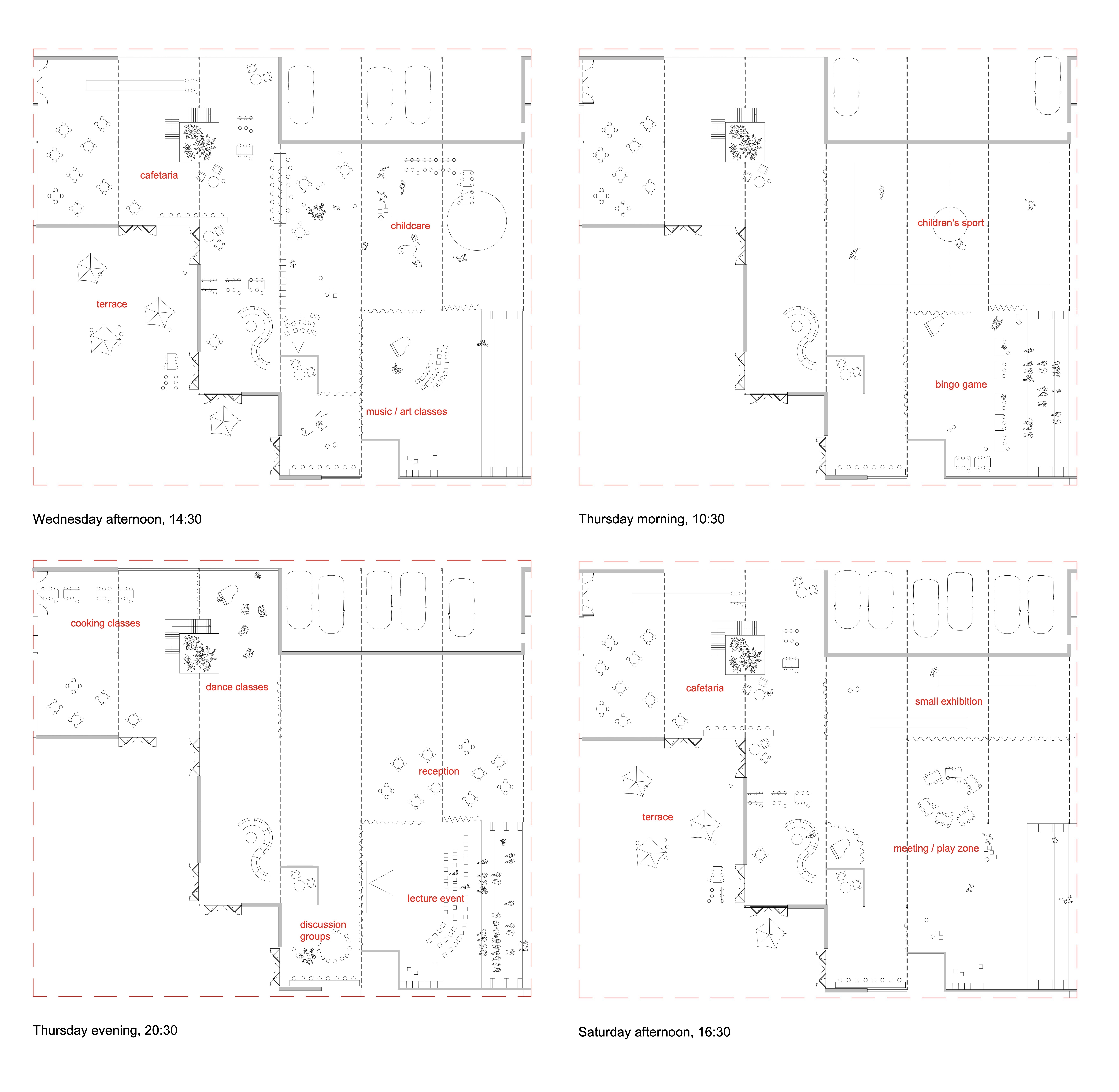Our design starts from the creation of zones instead of rooms and separated spaces. With a flexible and interchangeable floorplan, we want to encourage the interchanging and interacting of the different user groups. By creating this form of the building, the space opens up to the outside world and thereby opening the inner world as it emerges from it as reciprocity. The square-like modules follow the ratio of the site and allow to add and remove inner and outer spaces in the way needed. It can develop to a bigger or smaller building in the future, just by repeating or removing units. The building forms a chain of further associations that leads to the quality of the shared public space taking on another dimension. The interchangeable space leads to the interacting between people. The 8.5×8.9 m models form a timber skeletal structure, they act as a filler and can be infilled by prefab façade systems to create closed or open modules with glass or wood. The height of a standard module is four meters, some double height spaces define bigger spaces that are used as entrance hall and auditorium. The auditorium functions as the heart of the building as it is used in flexible ways and connected to the rest of the building. The interior space becomes a gathering space, and area where people can take ownership. This translates also in the use of low-tech, user-operated facilities such as the windows, sunscreens and curtains to close off certain spaces.