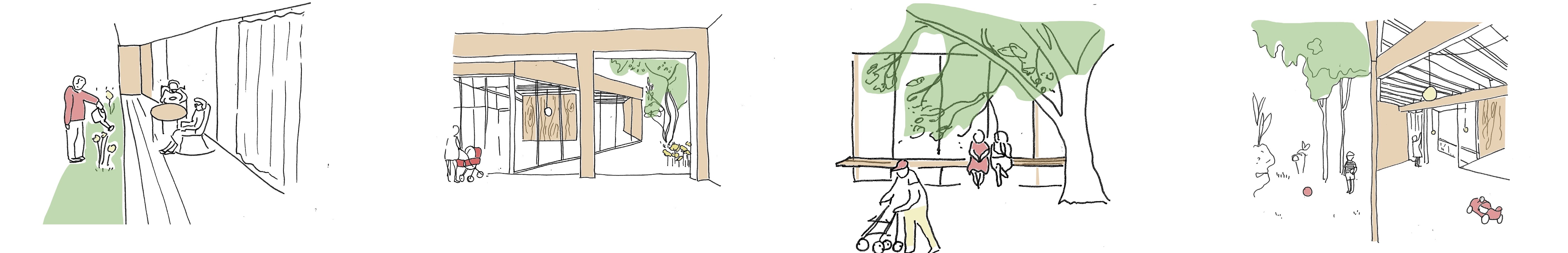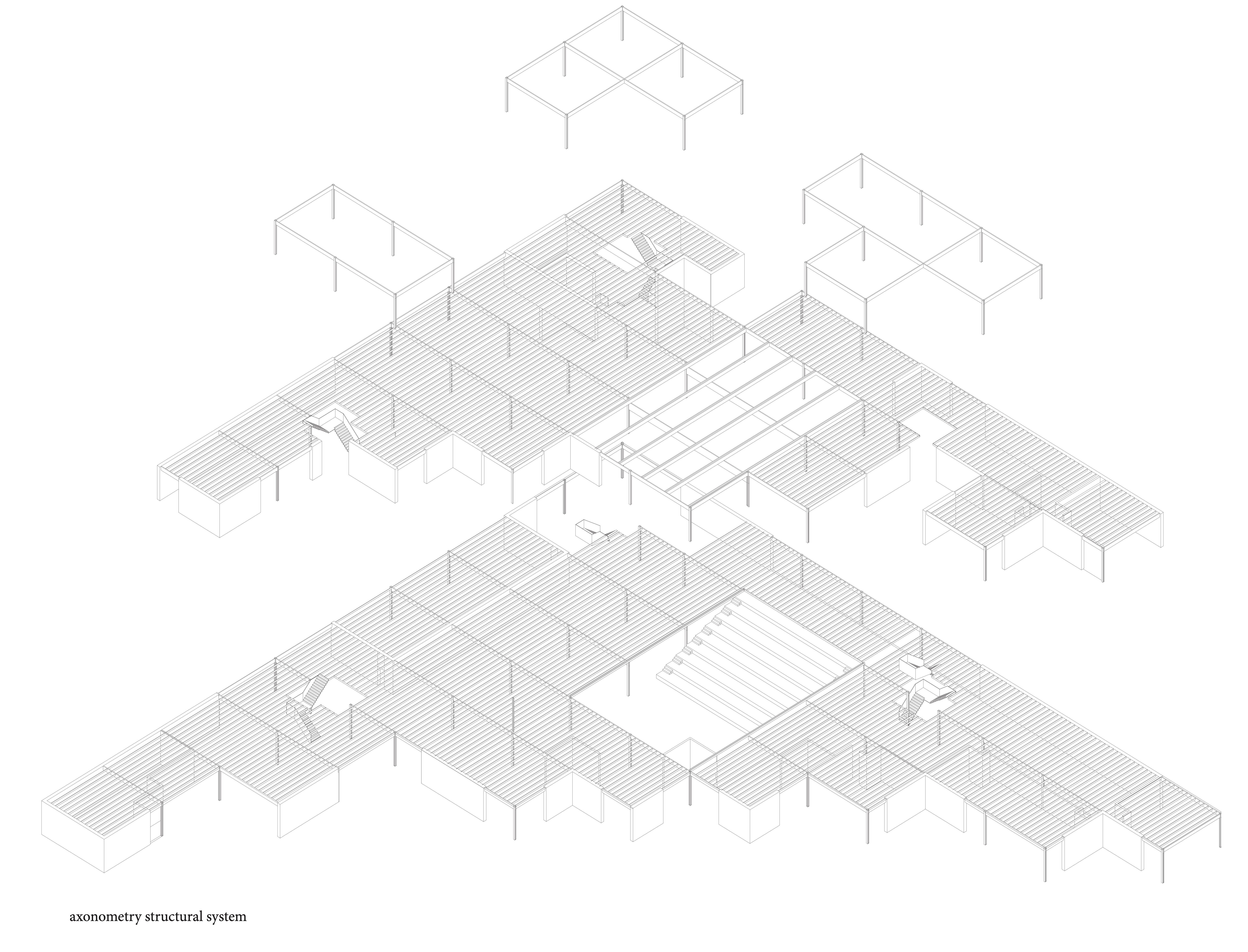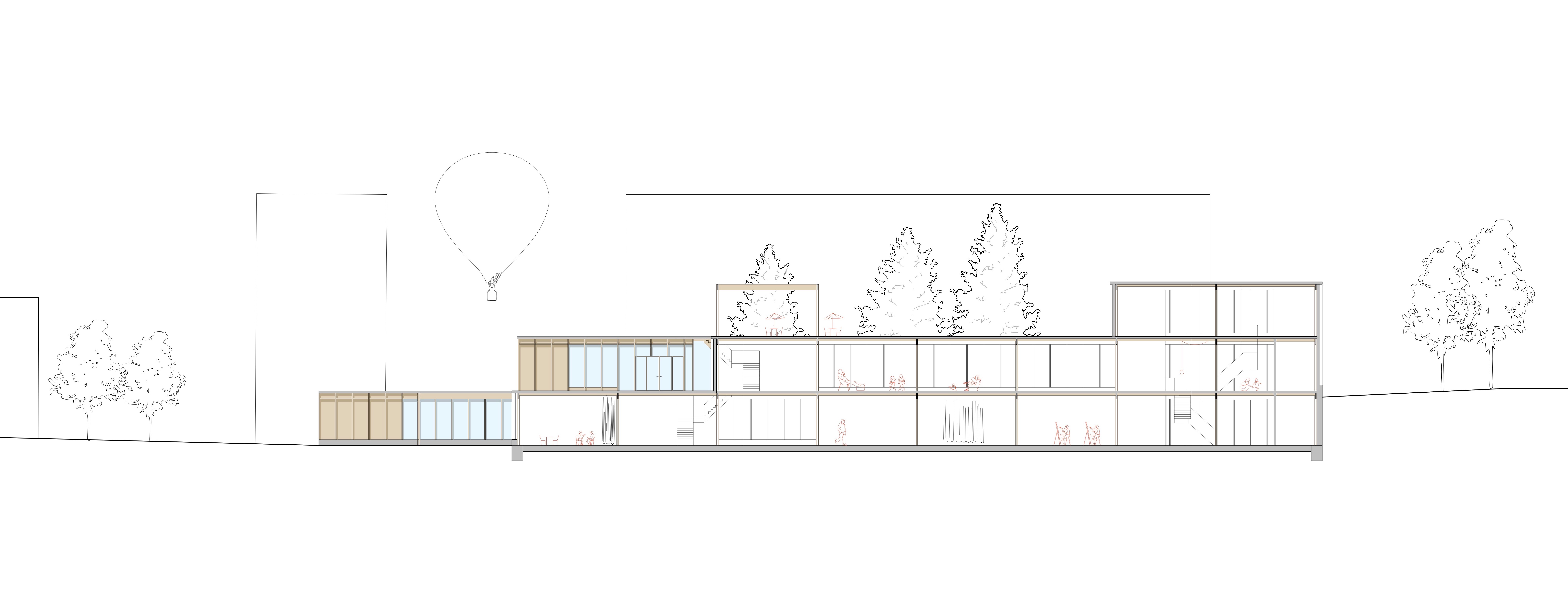 Our design starts from the creation of zones instead of rooms and separated spaces. With a flexible and interchangeable floorplan, we want to encourage the interchanging and interacting of the different user groups. By creating this form of the building, the space opens up to the outside world and thereby opening the inner world as it emerges from it as reciprocity. The square-like modules follow the ratio of the site and allow to add and remove inner and outer spaces in the way needed. It can develop to a bigger or smaller building in the future, just by repeating or removing units. The building forms a chain of further associations that leads to the quality of the shared public space taking on another dimension. The interchangeable space leads to the interacting between people. The 8.5×8.9 m models form a timber skeletal structure, they act as a filler and can be infilled by prefab façade systems to create closed or open modules with glass or wood. The height of a standard module is four meters, some double height spaces define bigger spaces that are used as entrance hall and auditorium. The auditorium functions as the heart of the building as it is used in flexible ways and connected to the rest of the building. The interior space becomes a gathering space, and area where people can take ownership. This translates also in the use of low-tech, user-operated facilities such as the windows, sunscreens and curtains to close off certain spaces.