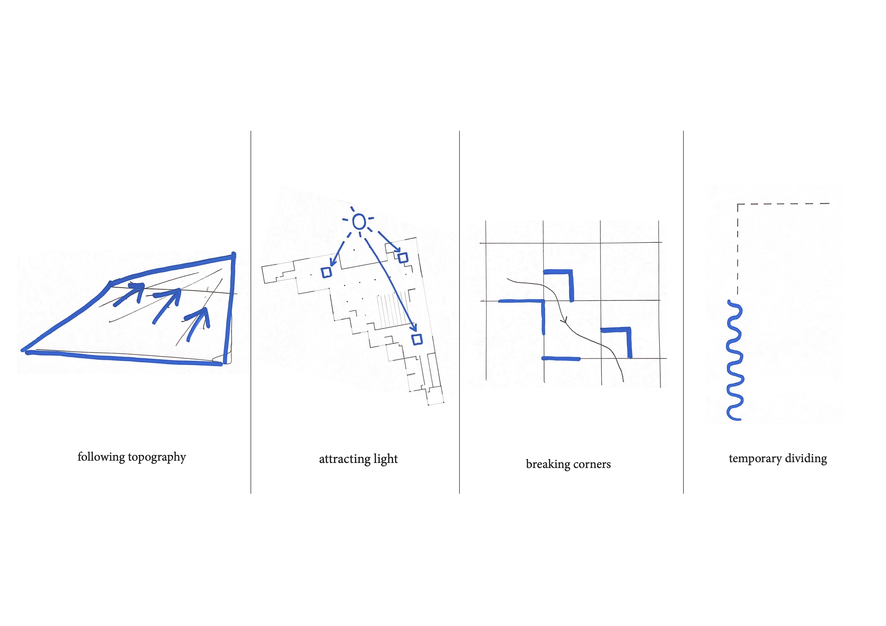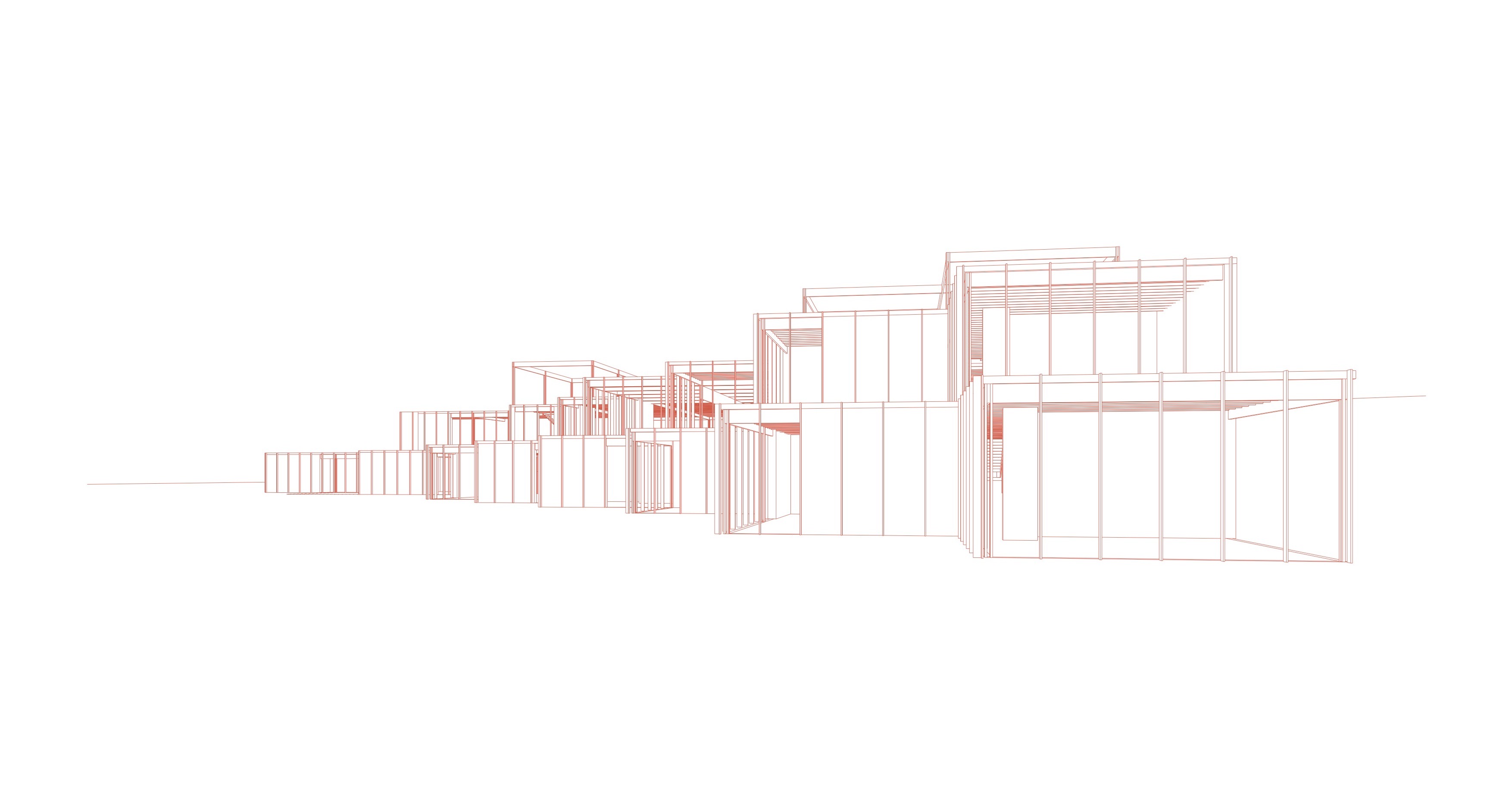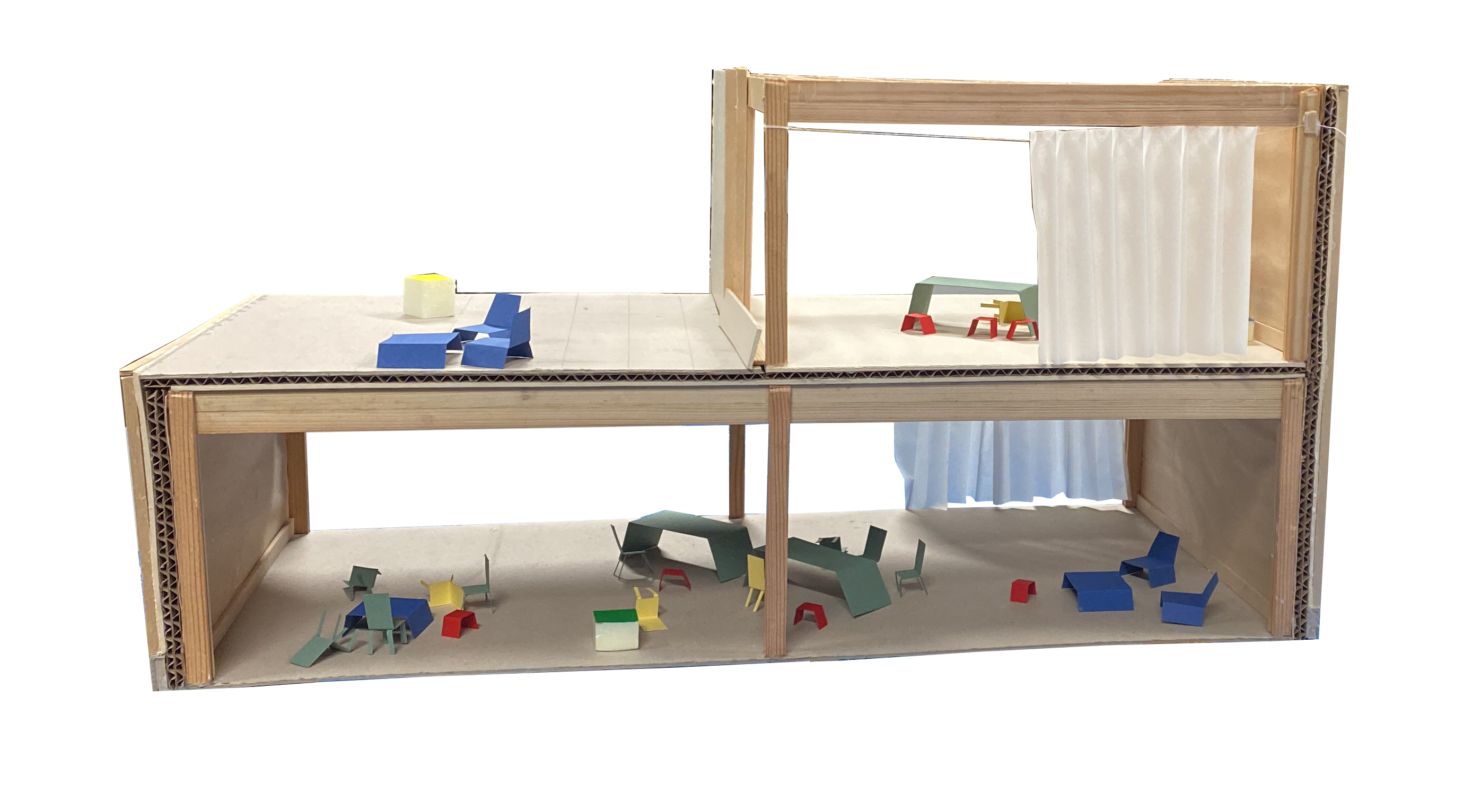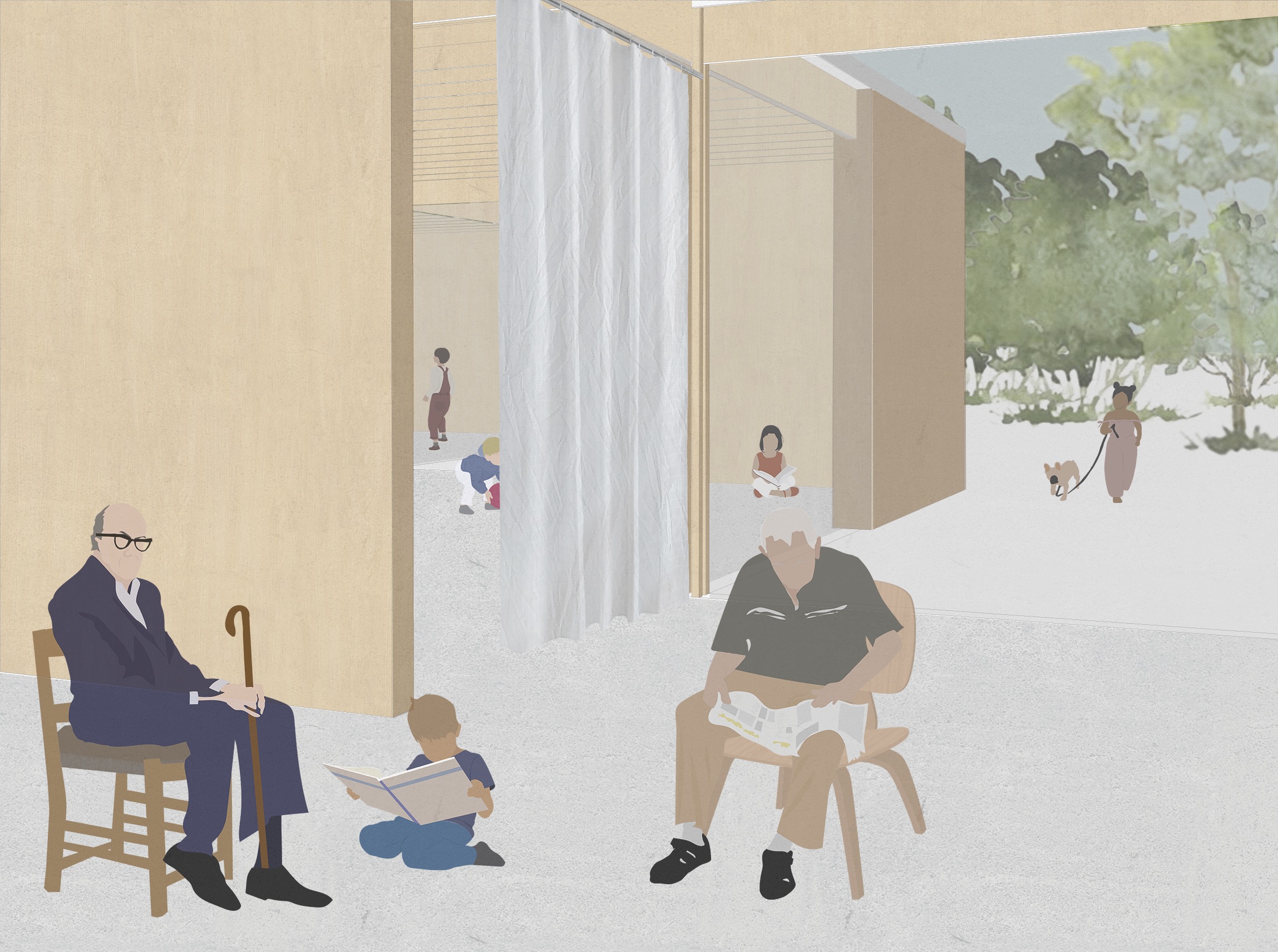 Our design starts from the creation of zones instead of rooms and separated spaces. With a flexible and interchangeable floorplan, we want to encourage the interchanging and interacting of the different user groups. By creating this form of the building, the space opens up to the outside world and thereby opening the inner world as it emerges from it as reciprocity. The square-like modules follow the ratio of the site and allow to add and remove inner and outer spaces in the way needed. It can develop to a bigger or smaller building in the future, just by repeating or removing units. The building forms a chain of further associations that leads to the quality of the shared public space taking on another dimension. The interchangeable space leads to the interacting between people. The 8.5×8.9 m models form a timber skeletal structure, they act as a filler and can be infilled by prefab façade systems to create closed or open modules with glass or wood. The height of a standard module is four meters, some double height spaces define bigger spaces that are used as entrance hall and auditorium. The auditorium functions as the heart of the building as it is used in flexible ways and connected to the rest of the building. The interior space becomes a gathering space, and area where people can take ownership. This translates also in the use of low-tech, user-operated facilities such as the windows, sunscreens and curtains to close off certain spaces.