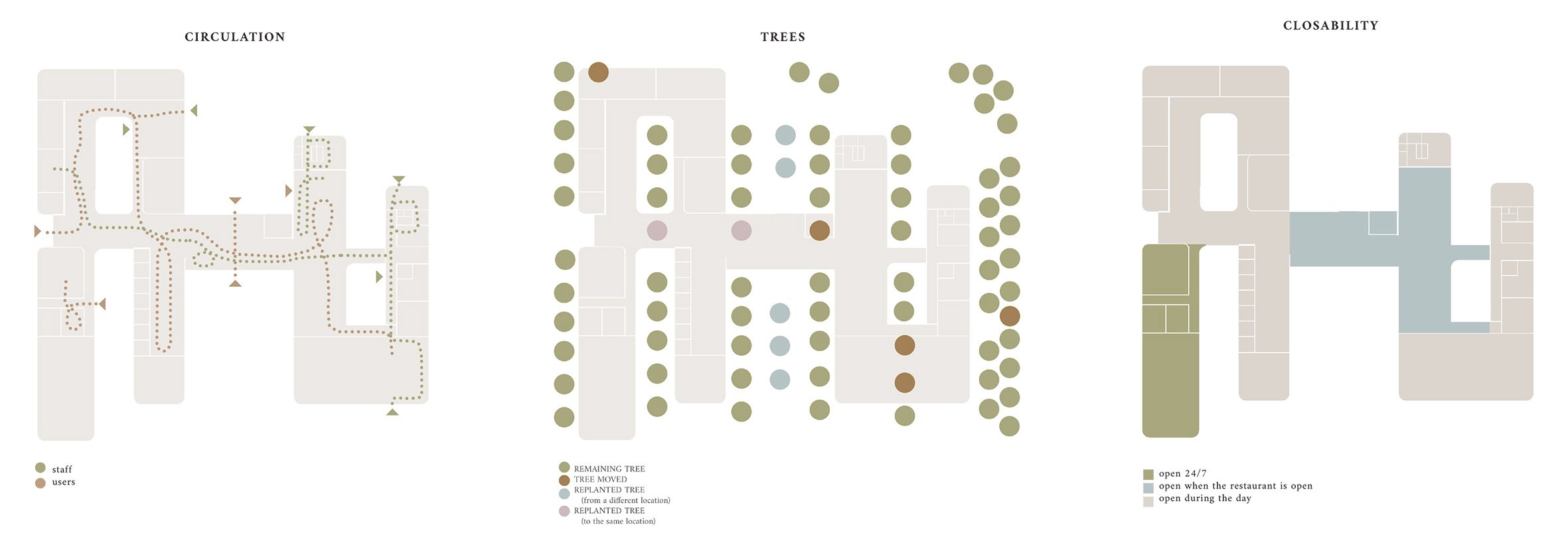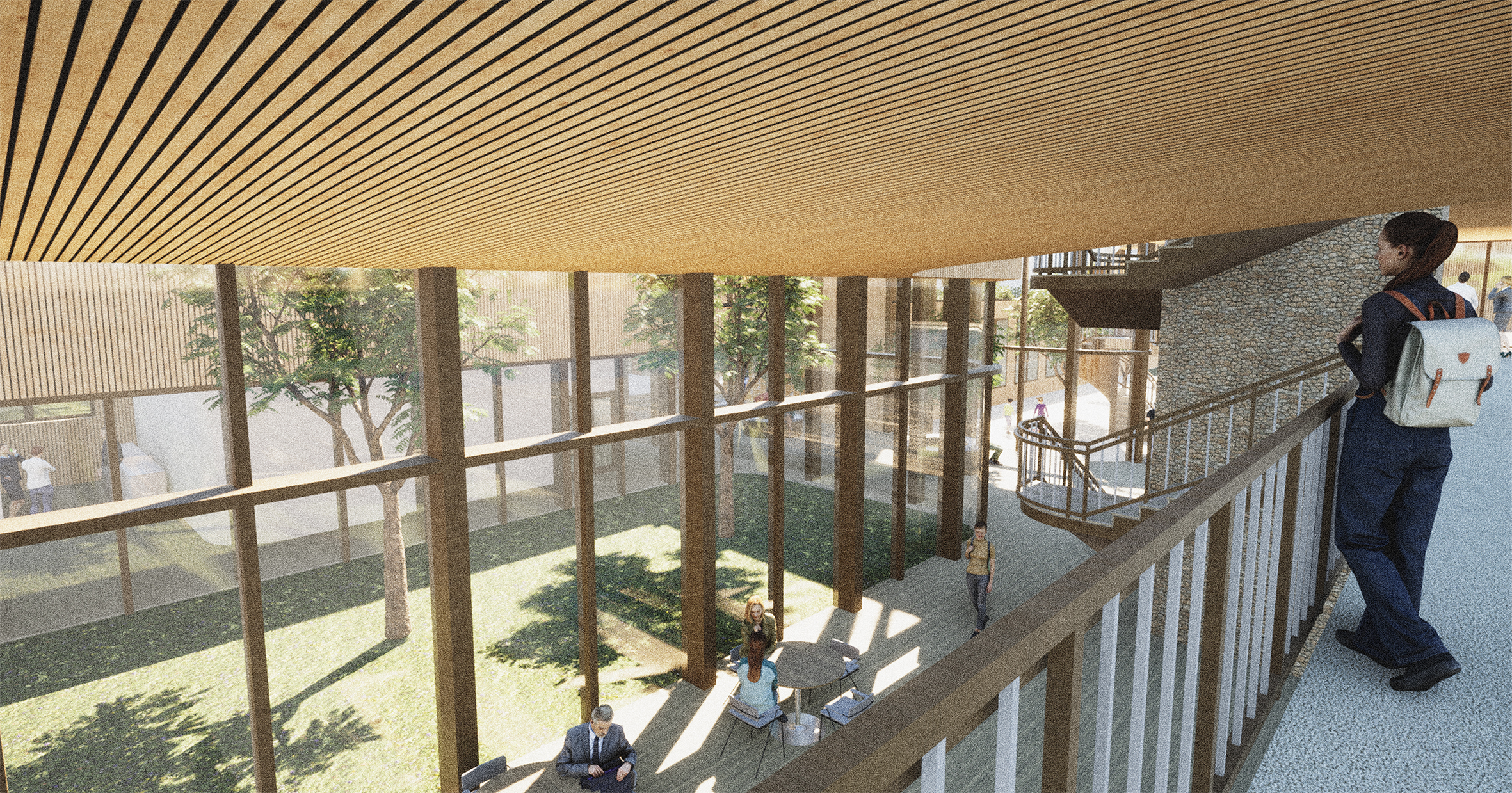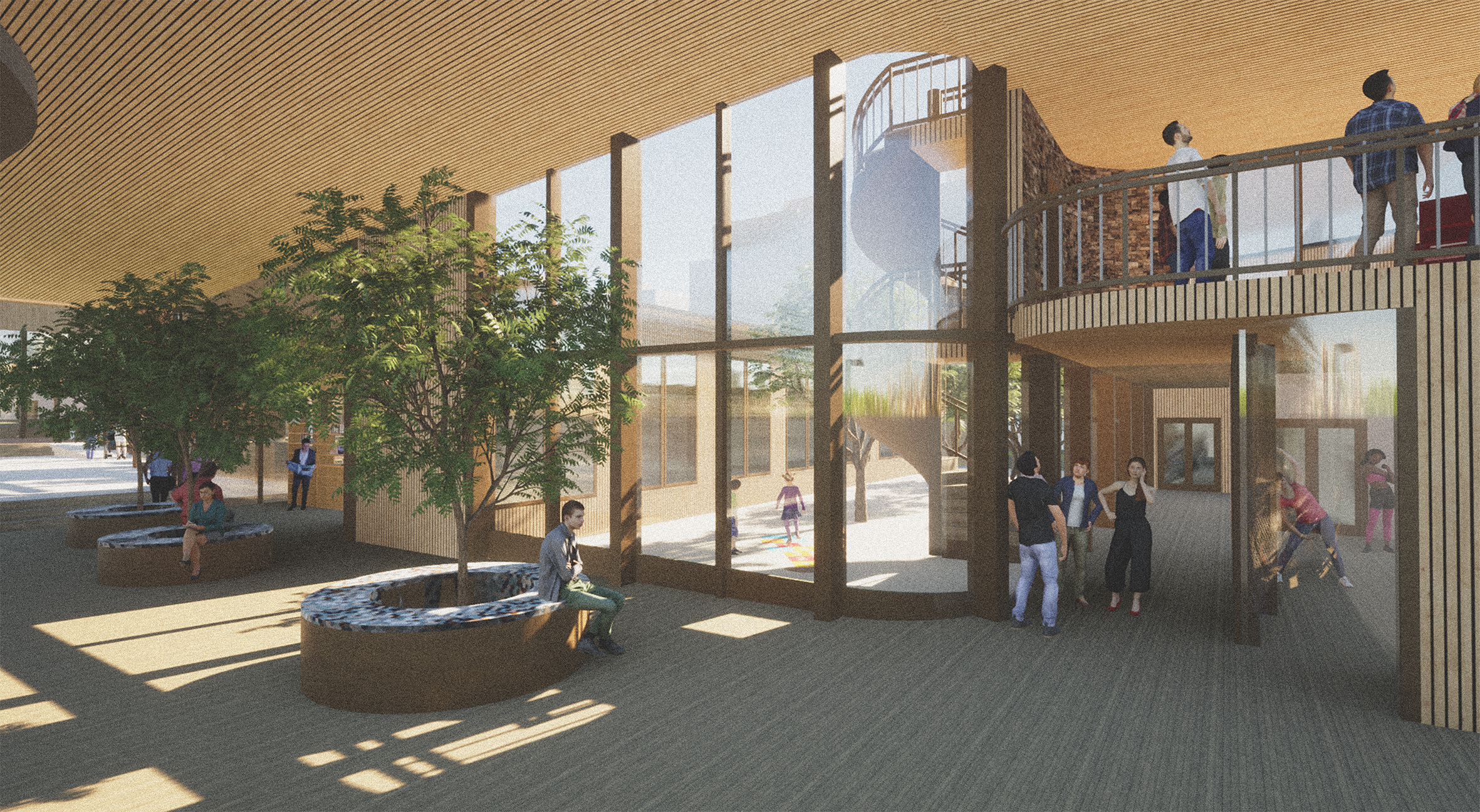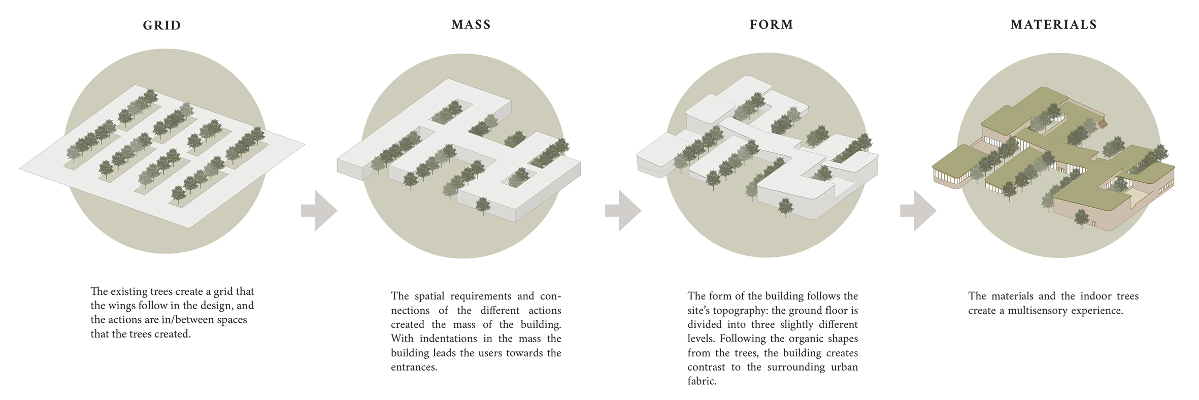 In the three main sides the spaces are located along the main corridor in wings that follow the tree grid. Atriums between spaces offer natural light and delight to surrounding spaces and strengthen the feel of community when users can see what is happening in nearby spaces. Round corners strengthen the organic theme in the building.