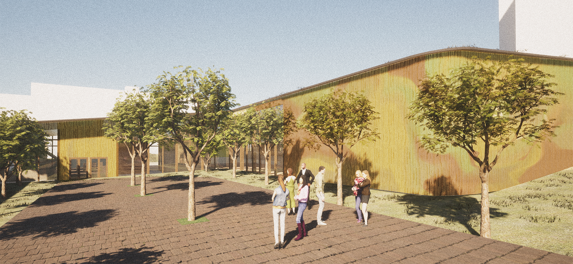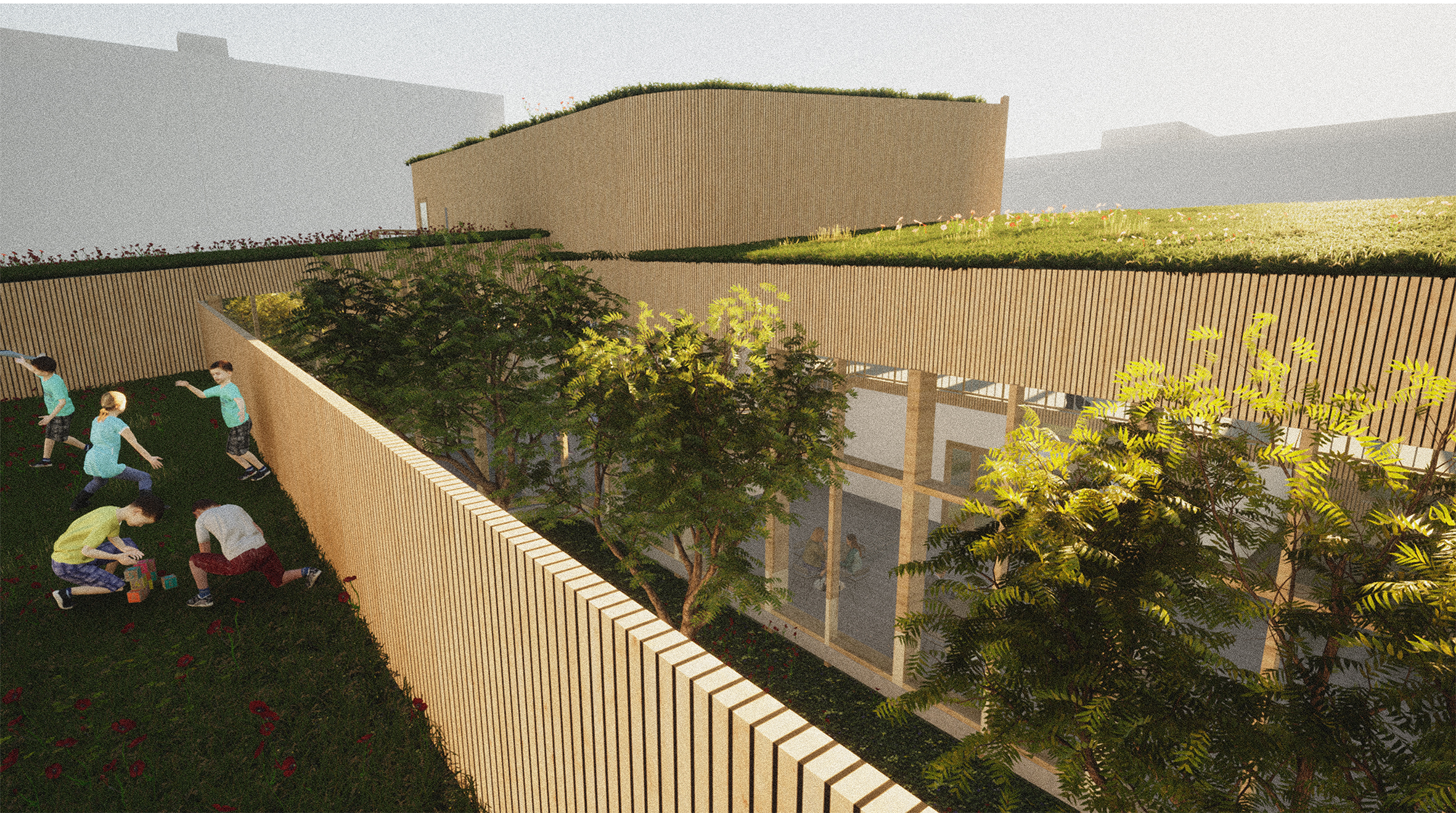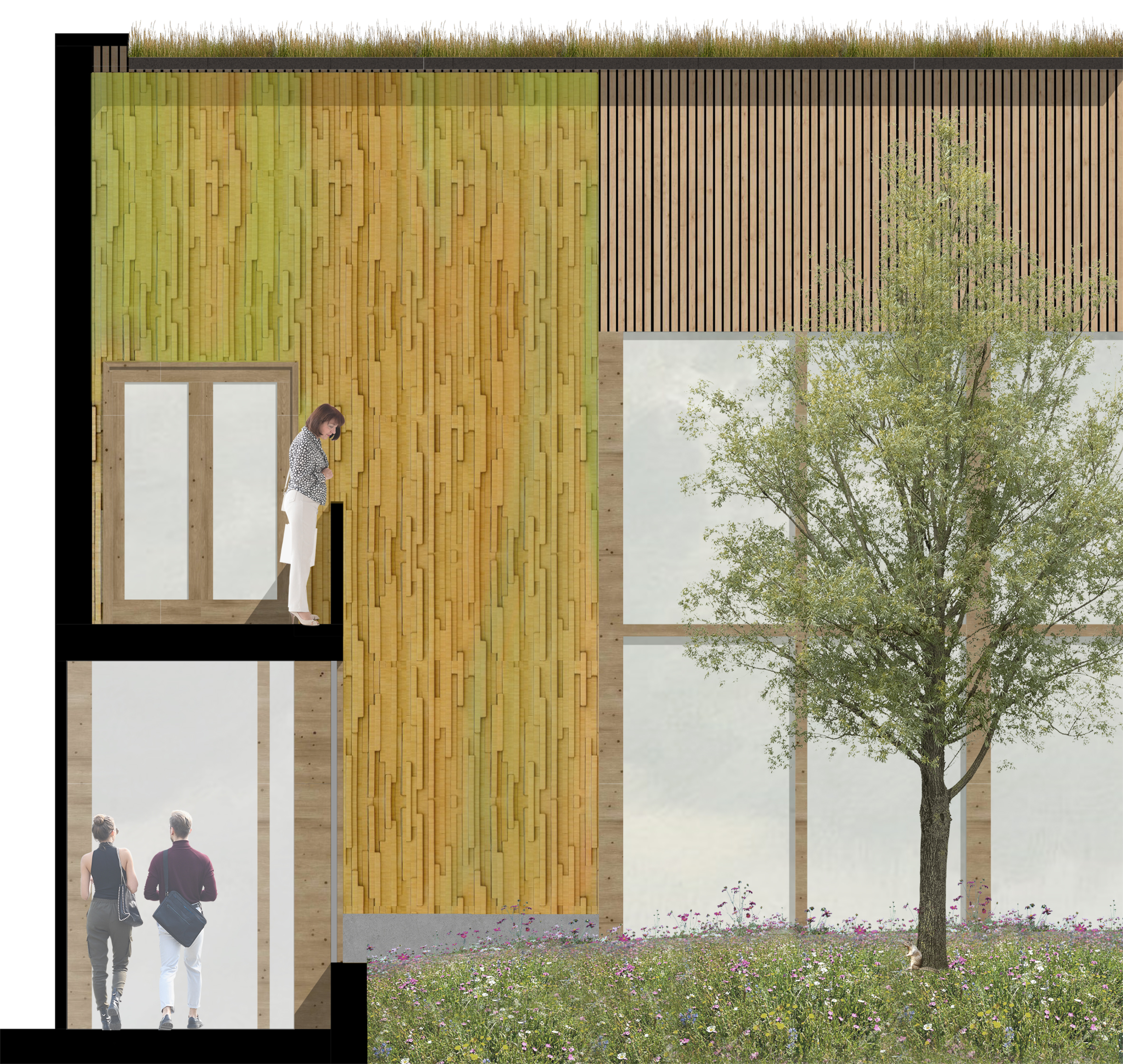 Materials are selected to create a multisensory experience for the users. Materialistic choices create different atmospheres in different spaces and create diverse entity. Wood is used in the facades to support the tree-theme and as it’s ecological choice. Entrances are highlighted with colorful wooden relief walls, and the wood is recycled.