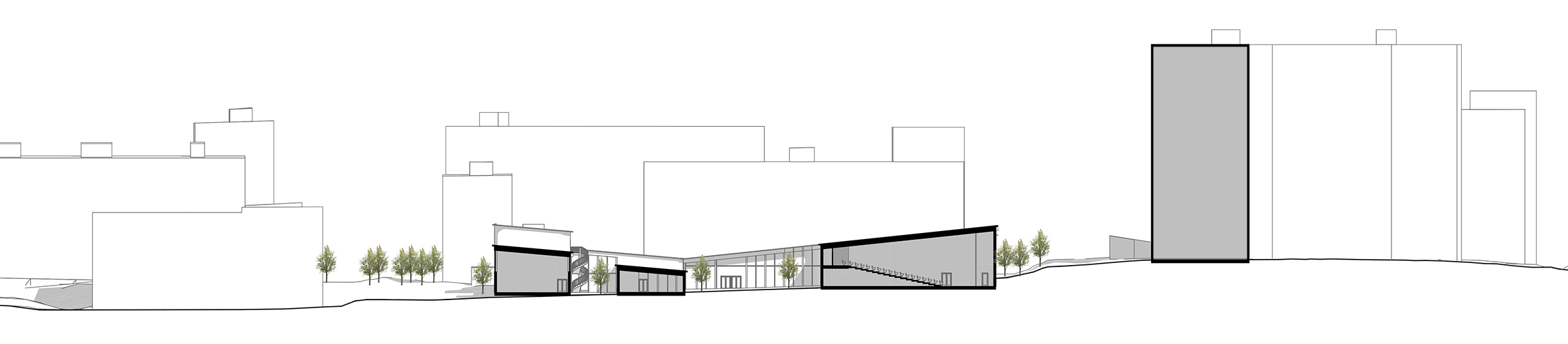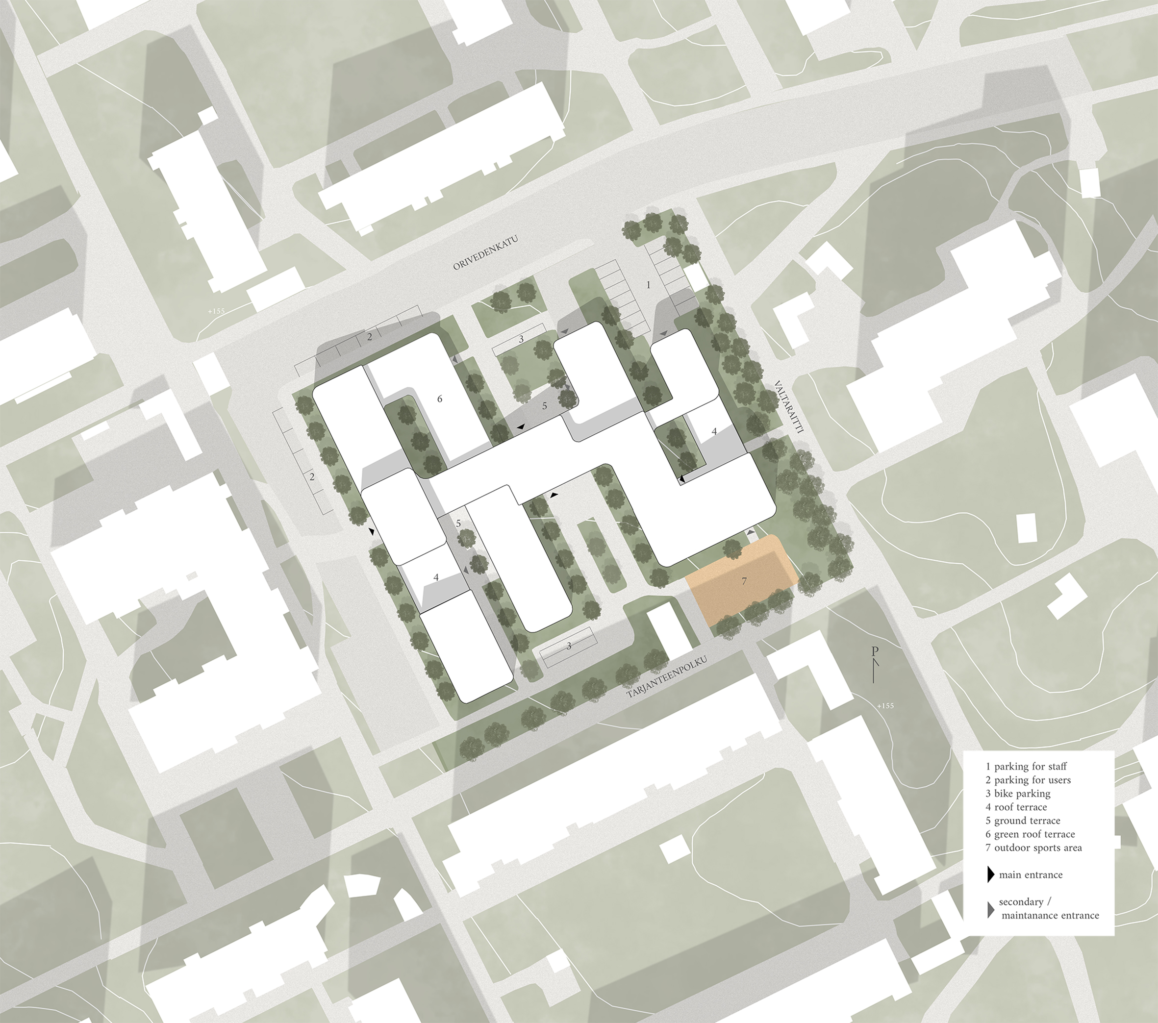 In TREEPTYCH the goal is to utilize the site and its existing environment as far as possible. Research shows that it can take more than thirty years for a tree to turn into a carbon sink. So it’s worthwhile from a building’s carbon footprint point of view to preserve the existing trees. In our site, it wasn’t possible to preserve all of the trees on their places, but the ones we had to touch are planted to new spots on the site.