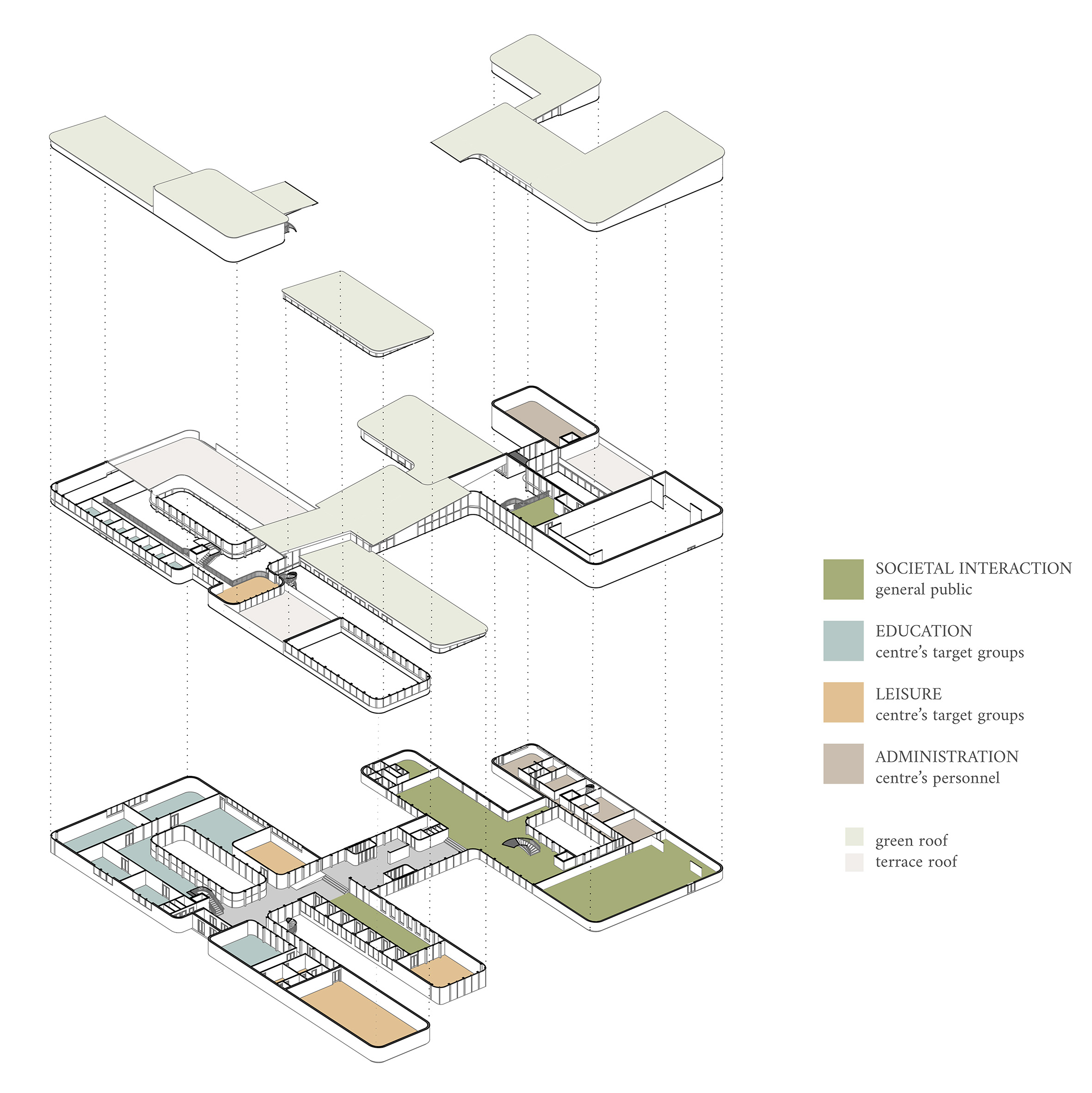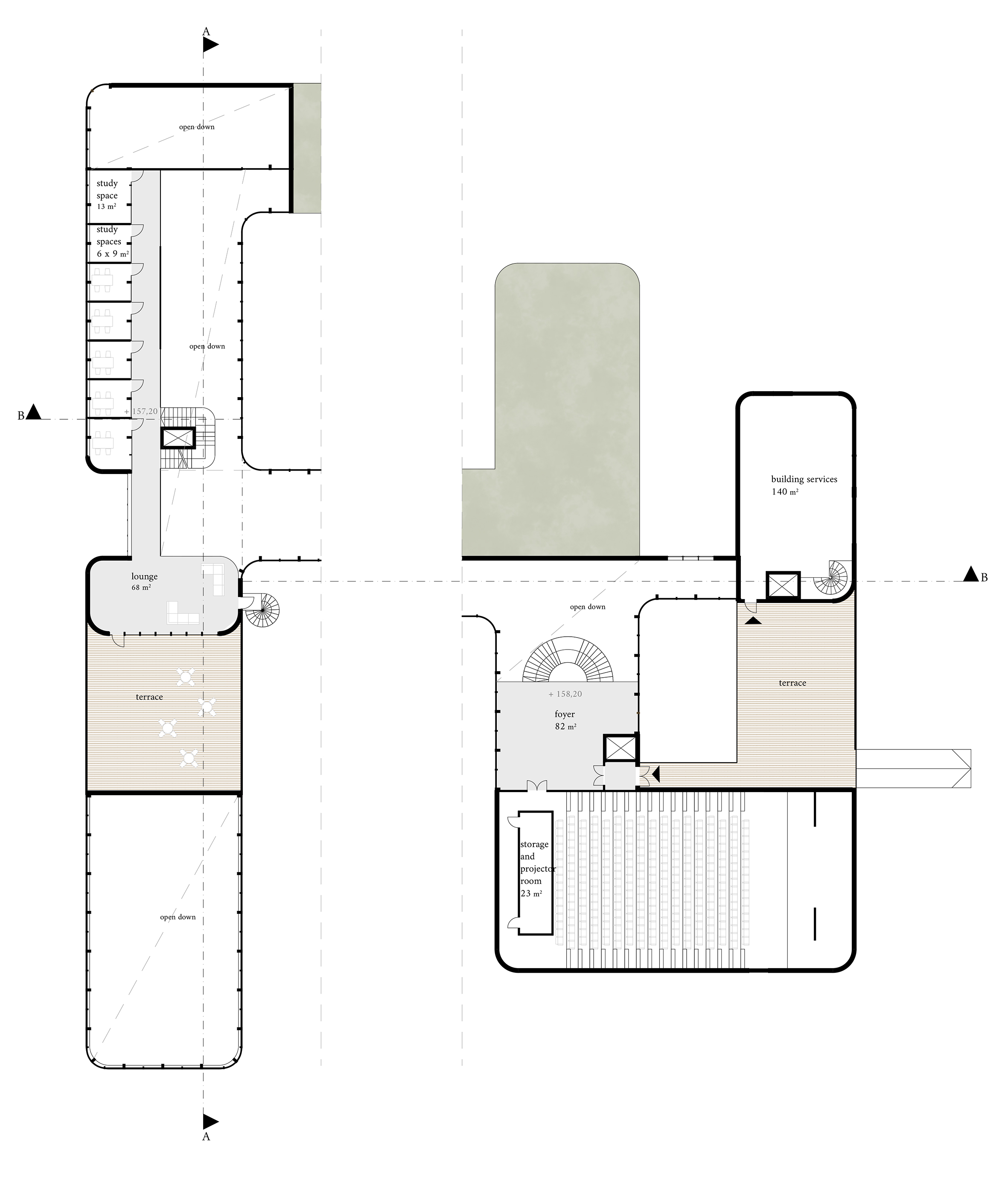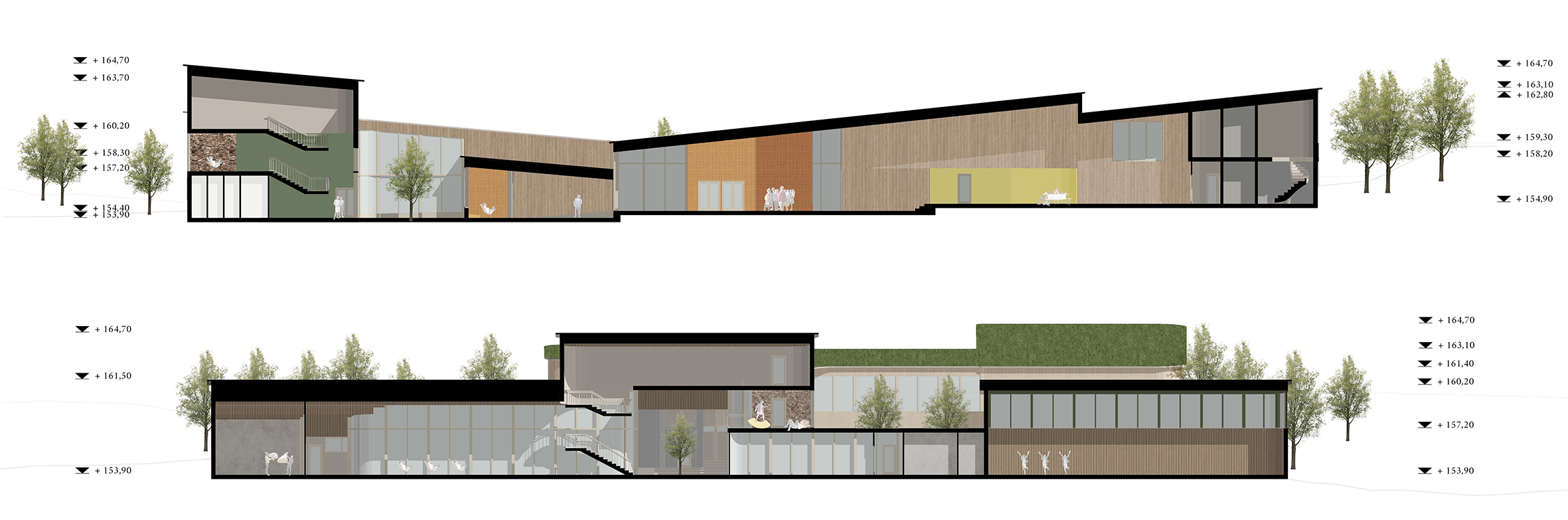 TREEPTYCH is formed by two main sides that surround the main entrance hall: more formal culture and administration spaces, and educational and hobby spaces. The building’s form was determined by the existing site and its features but creates unique and diverse architecture that benefits the environment.