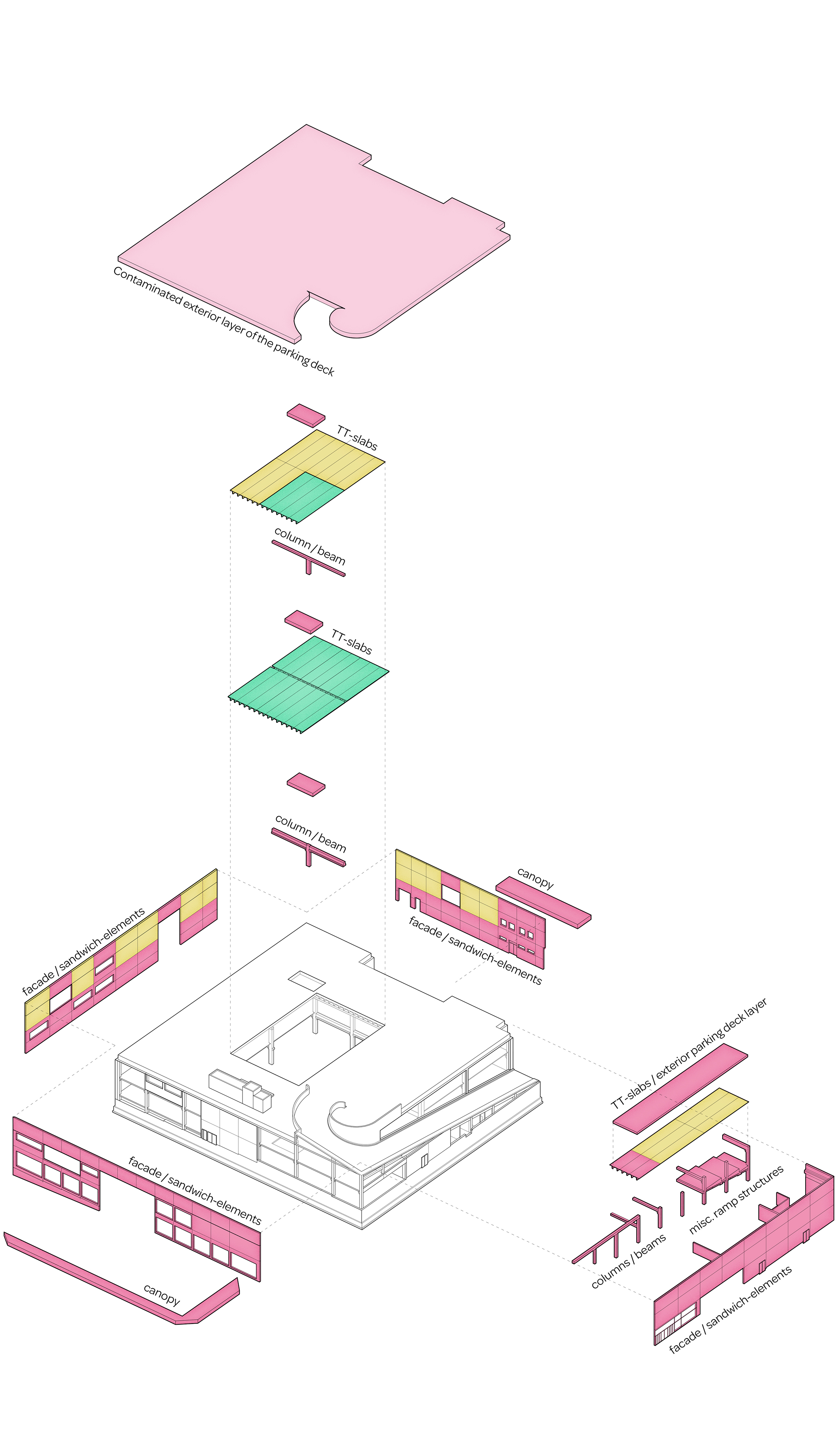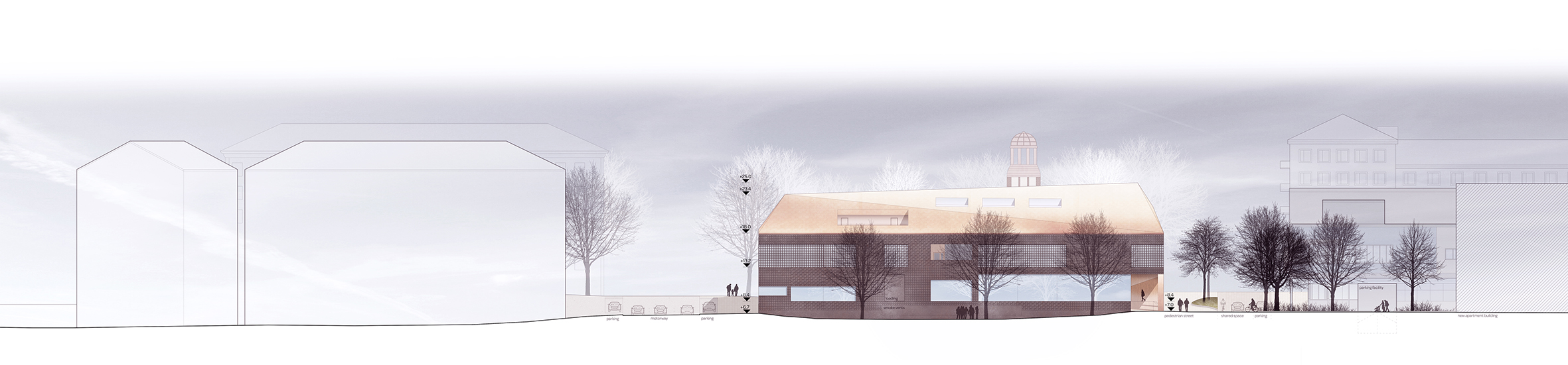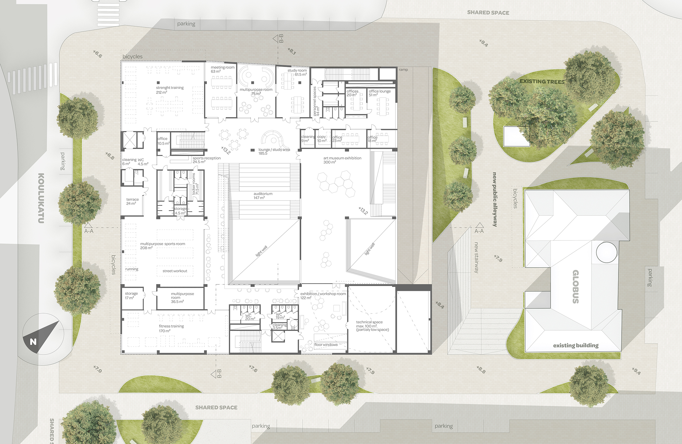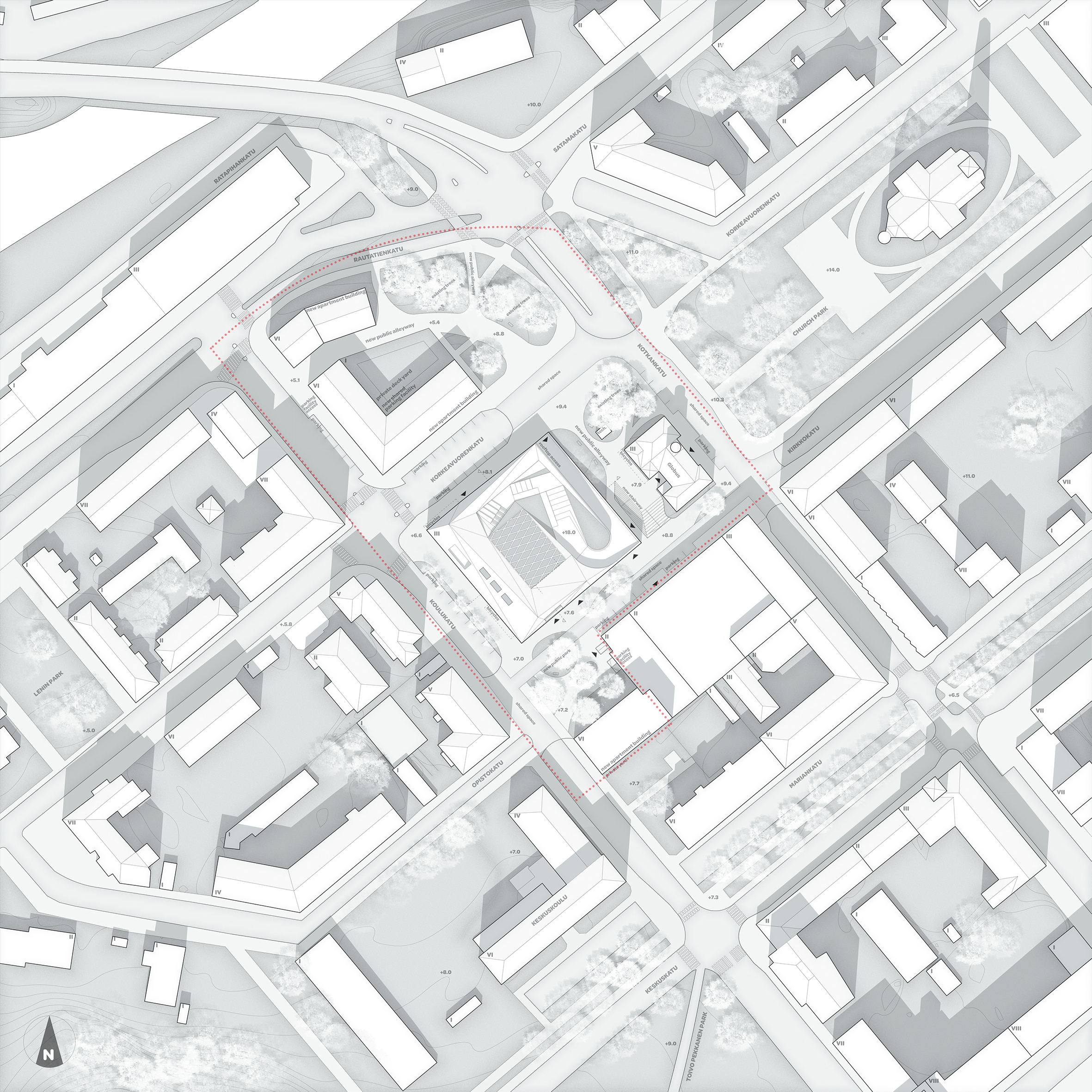 The core subject of the thesis is the adaptive reuse of the former Euromarket building which is suffering from underutilization. The building’s functional and structural properties are analyzed leading to the formation of a new multifunctional concept comprising of educational and sports facilities as well as a new art museum. The new architectural concept adds a top-floor annex and transforms the former automobile access ramp into a pedestrian connection leading to a new rooftop deck garden. The stark transformation creates new functionality and adds architectural finesse to the facades and form of the existing building. The result acts as the flagship of the regeneration of the surrounding urban neighborhood.