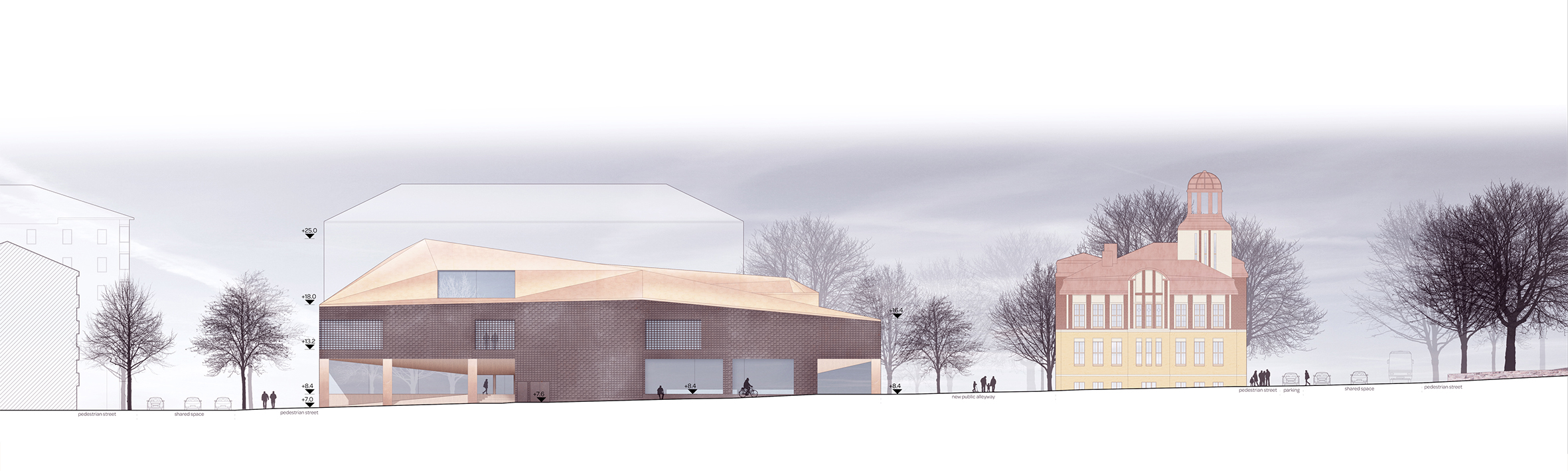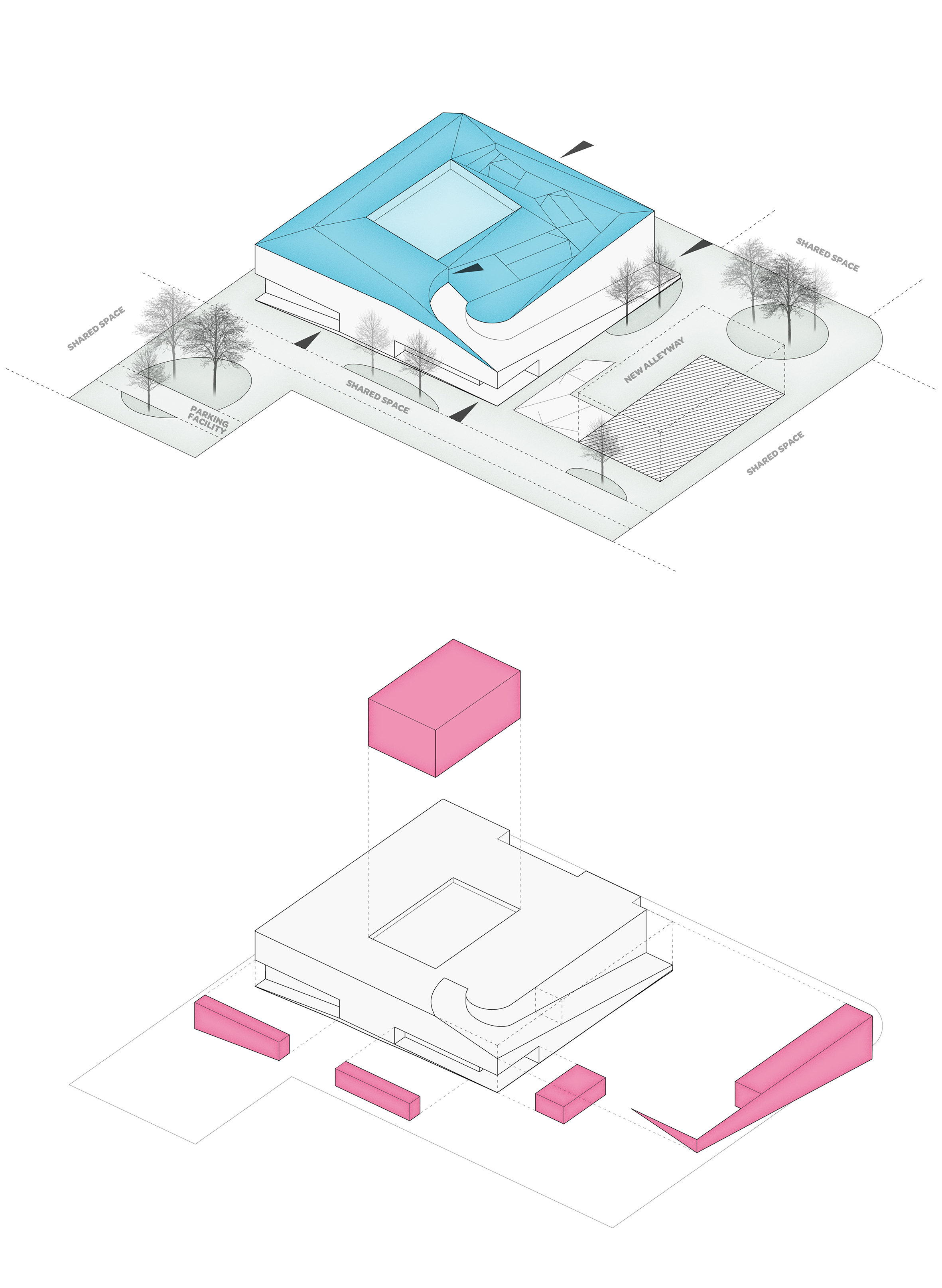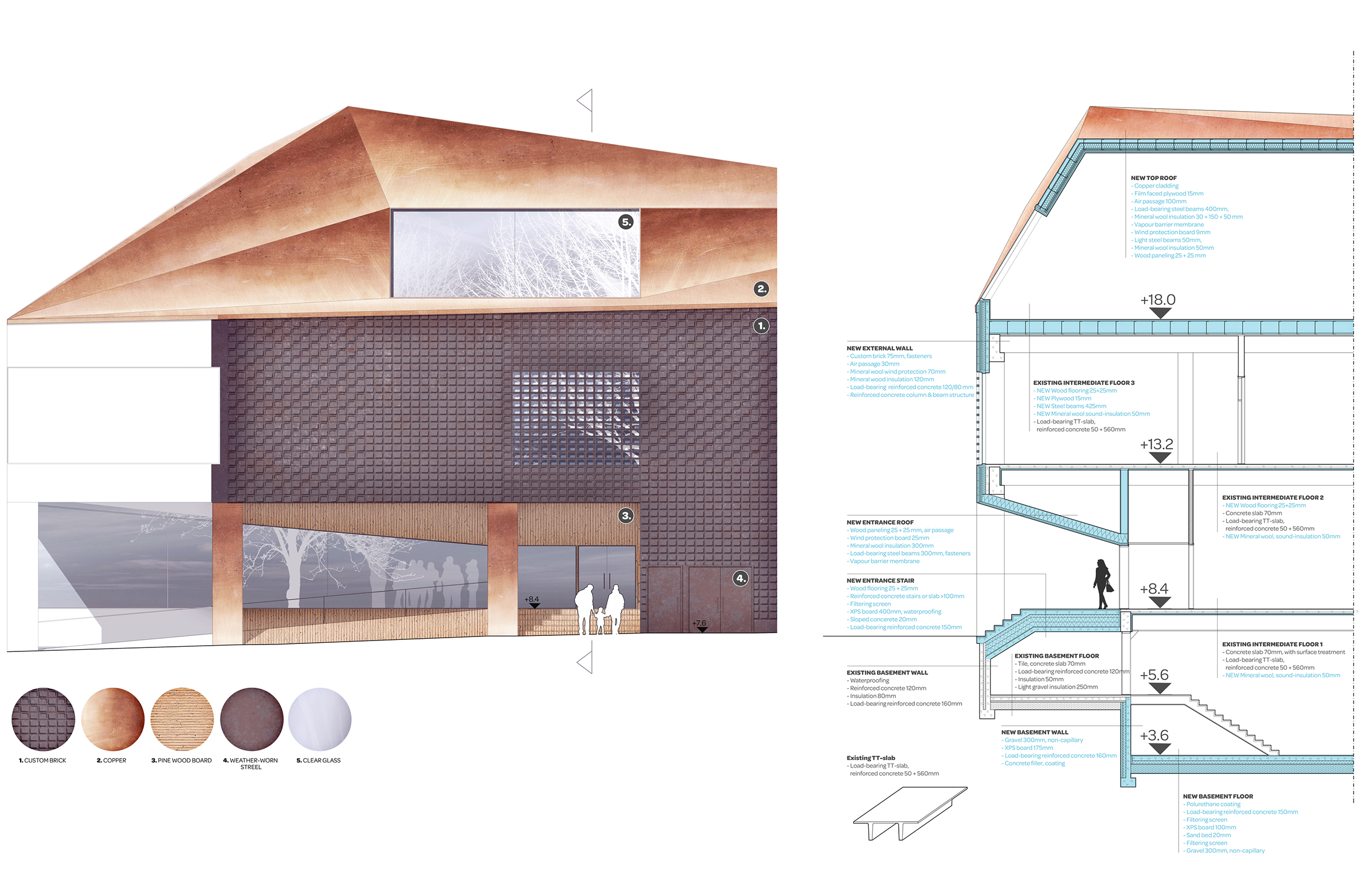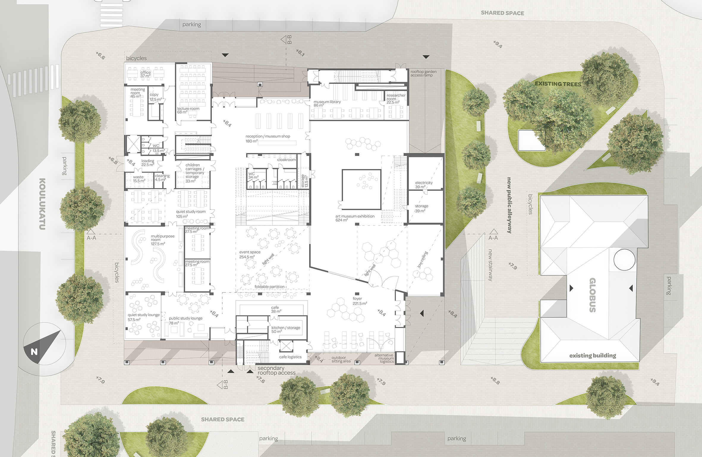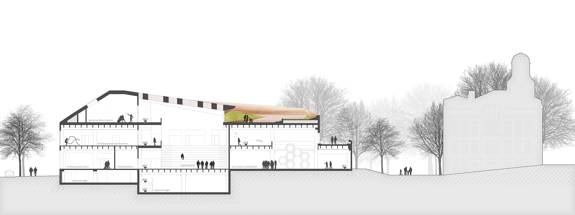The core subject of the thesis is the adaptive reuse of the former Euromarket building which is suffering from underutilization. The building’s functional and structural properties are analyzed leading to the formation of a new multifunctional concept comprising of educational and sports facilities as well as a new art museum. The new architectural concept adds a top-floor annex and transforms the former automobile access ramp into a pedestrian connection leading to a new rooftop deck garden. The stark transformation creates new functionality and adds architectural finesse to the facades and form of the existing building. The result acts as the flagship of the regeneration of the surrounding urban neighborhood.