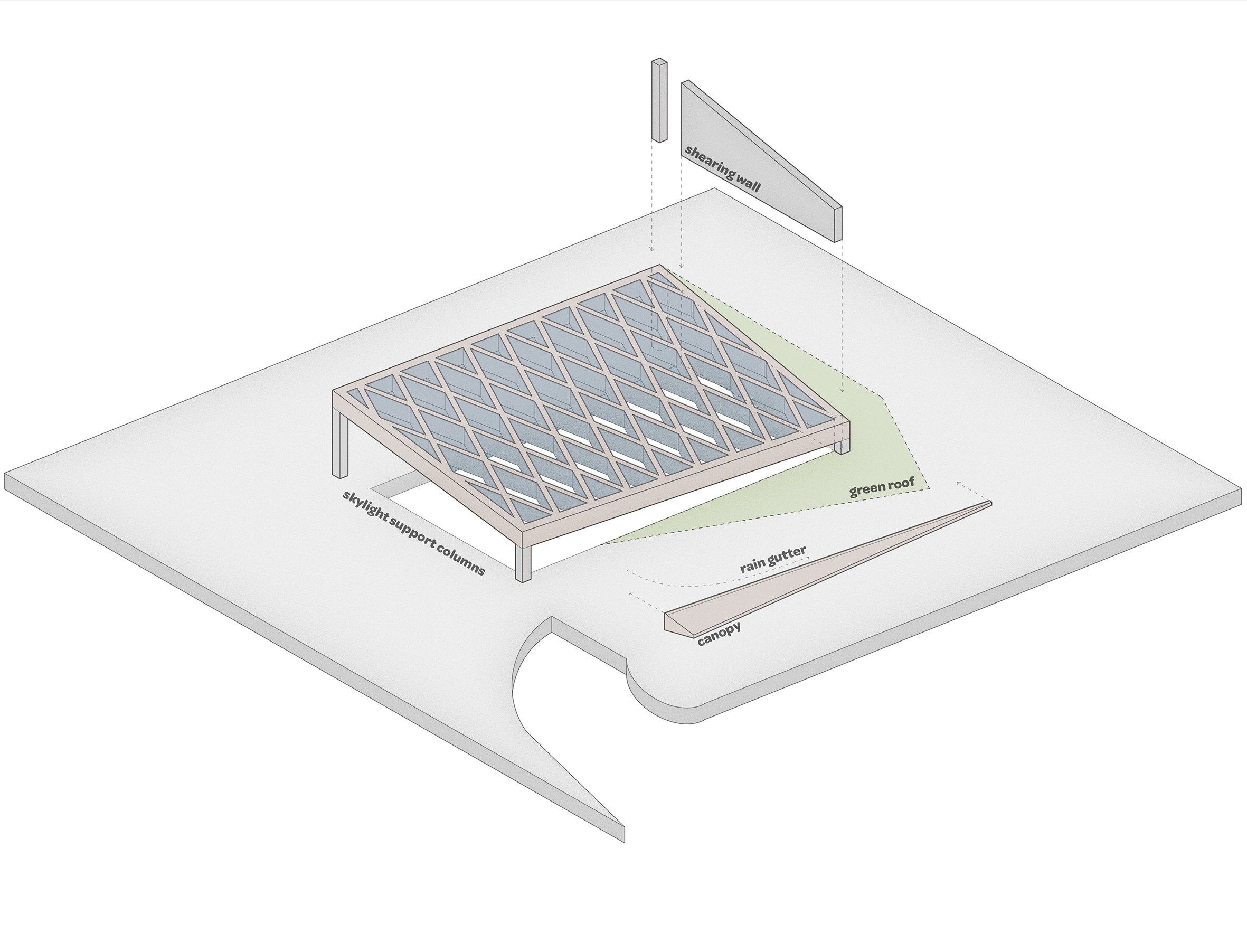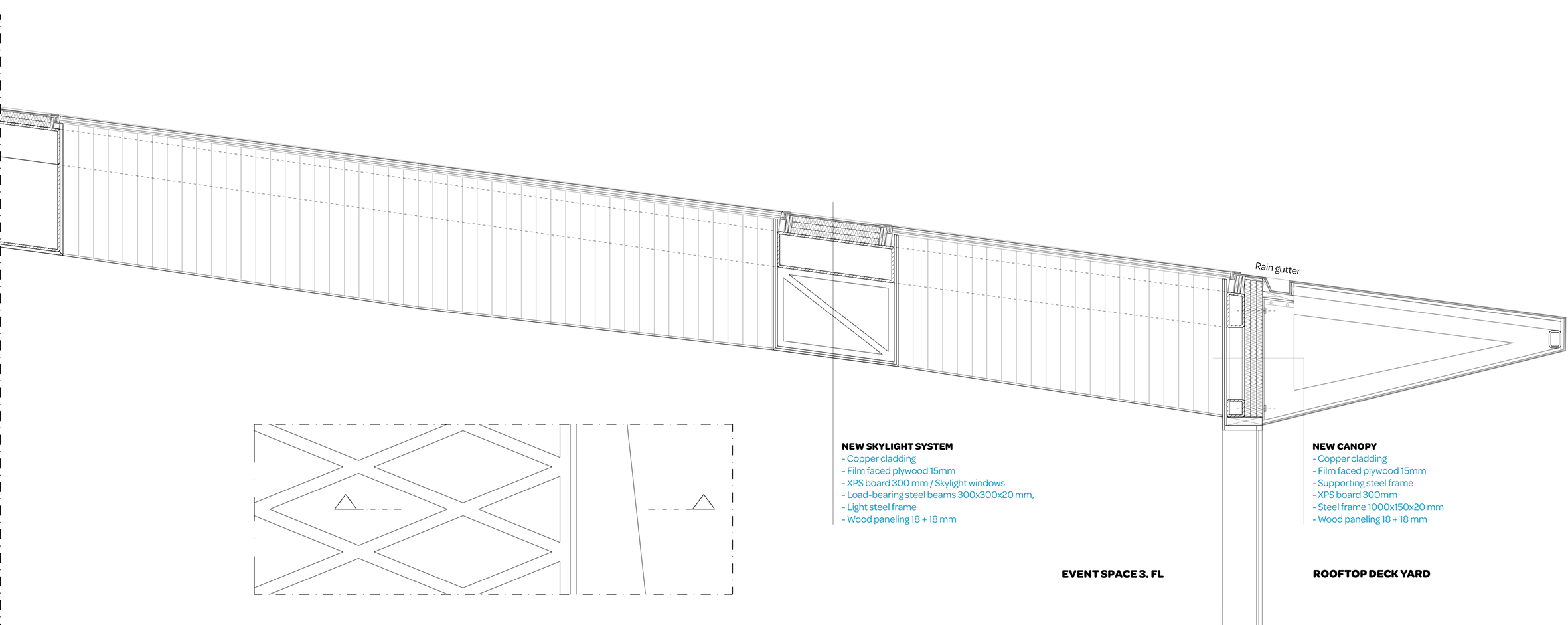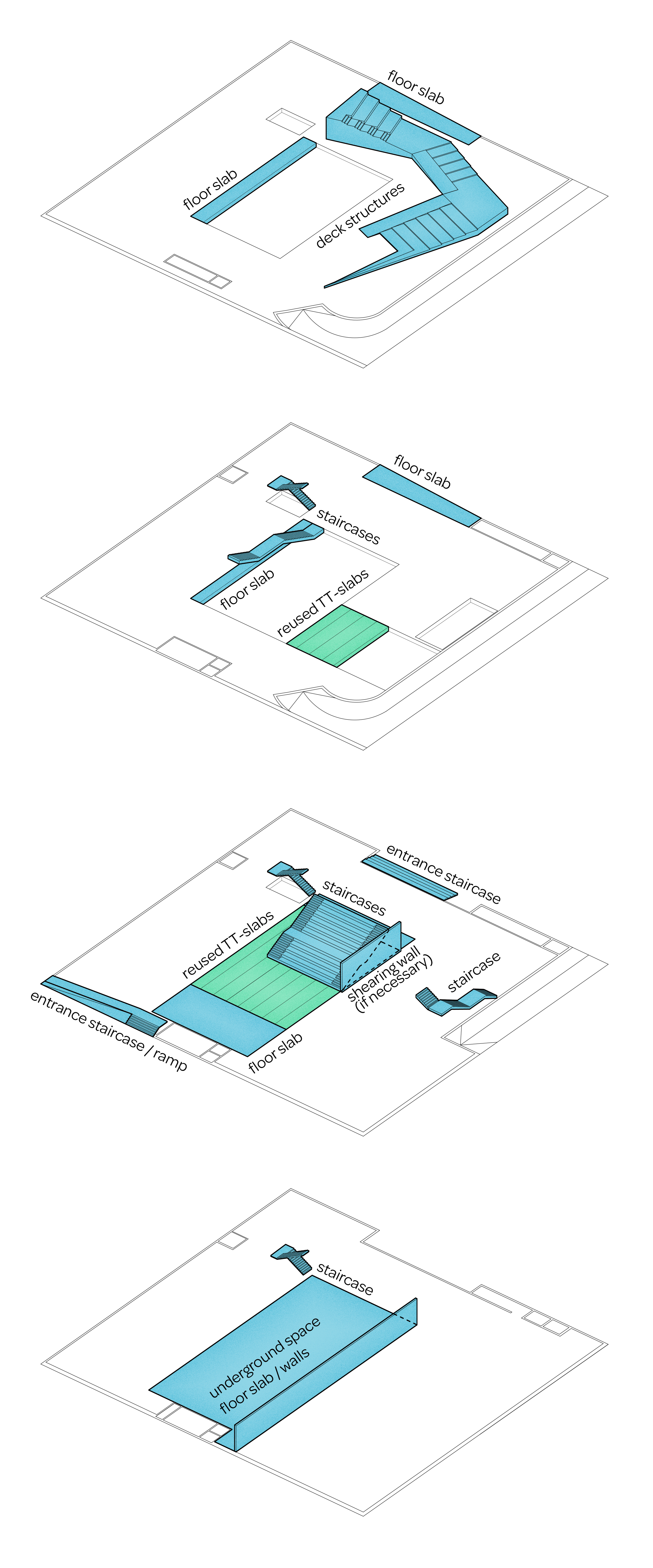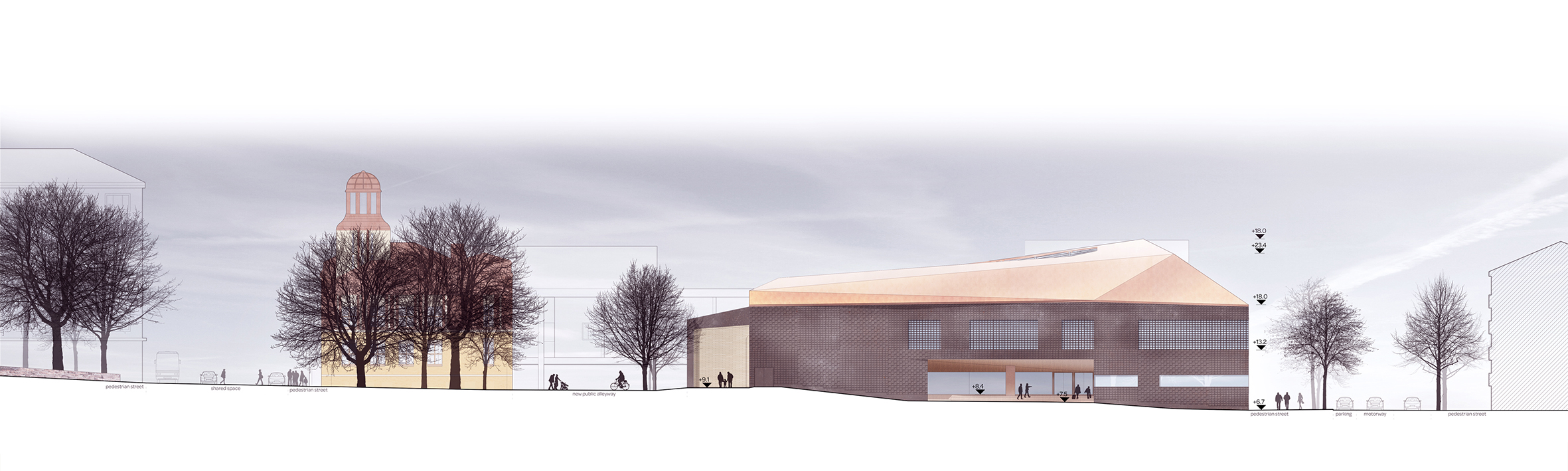 The core subject of the thesis is the adaptive reuse of the former Euromarket building which is suffering from underutilization. The building’s functional and structural properties are analyzed leading to the formation of a new multifunctional concept comprising of educational and sports facilities as well as a new art museum. The new architectural concept adds a top-floor annex and transforms the former automobile access ramp into a pedestrian connection leading to a new rooftop deck garden. The stark transformation creates new functionality and adds architectural finesse to the facades and form of the existing building. The result acts as the flagship of the regeneration of the surrounding urban neighborhood.