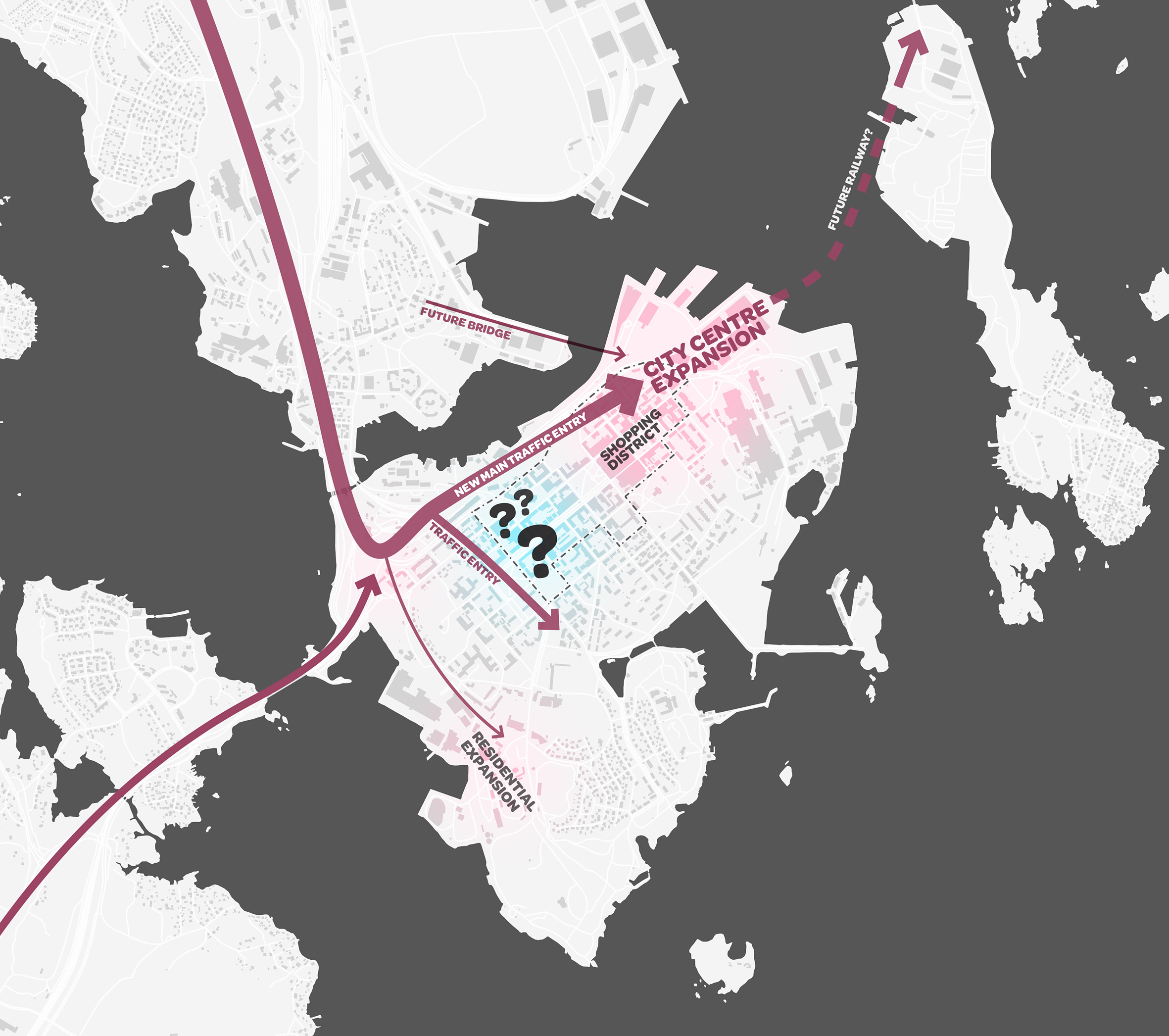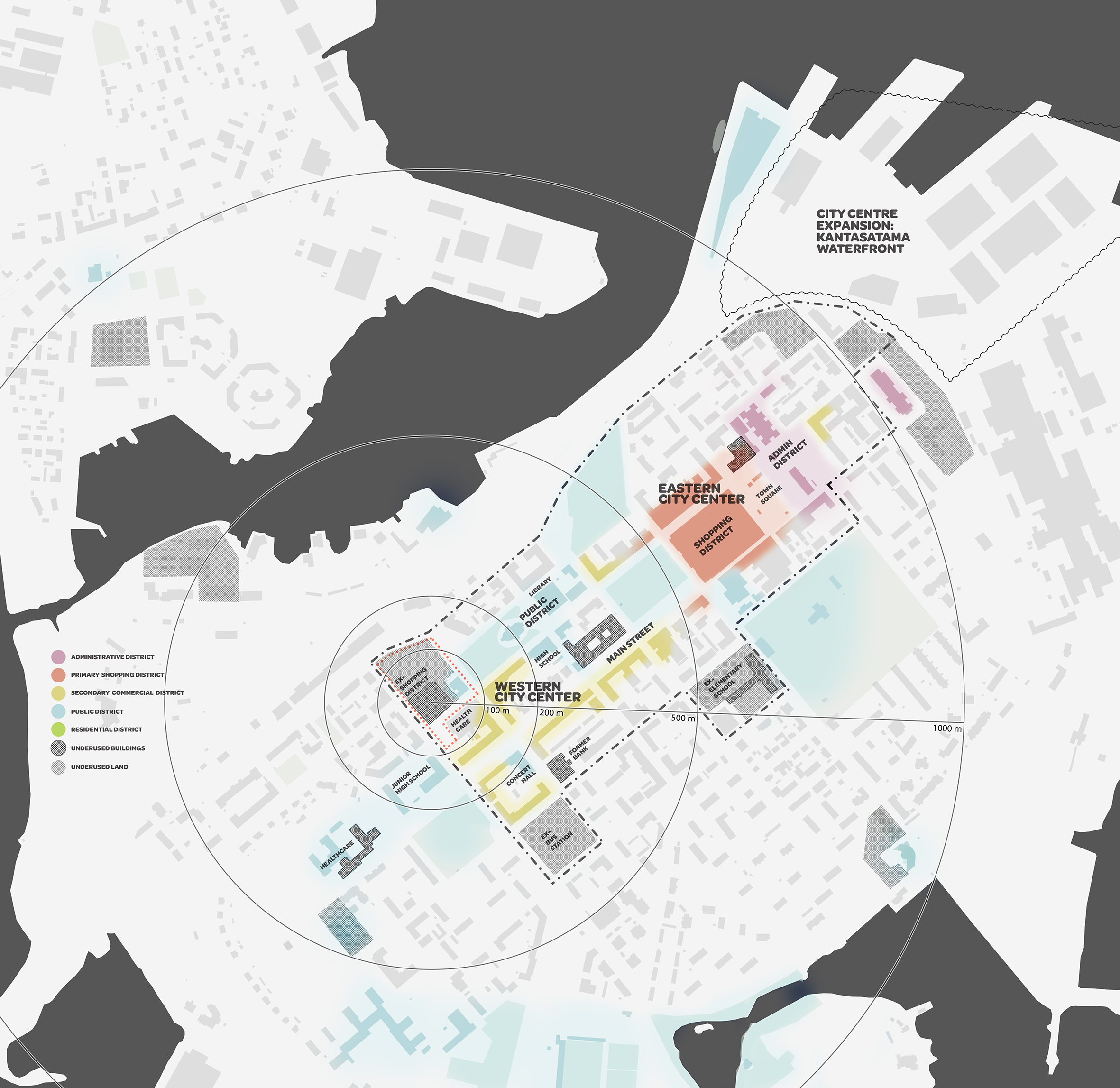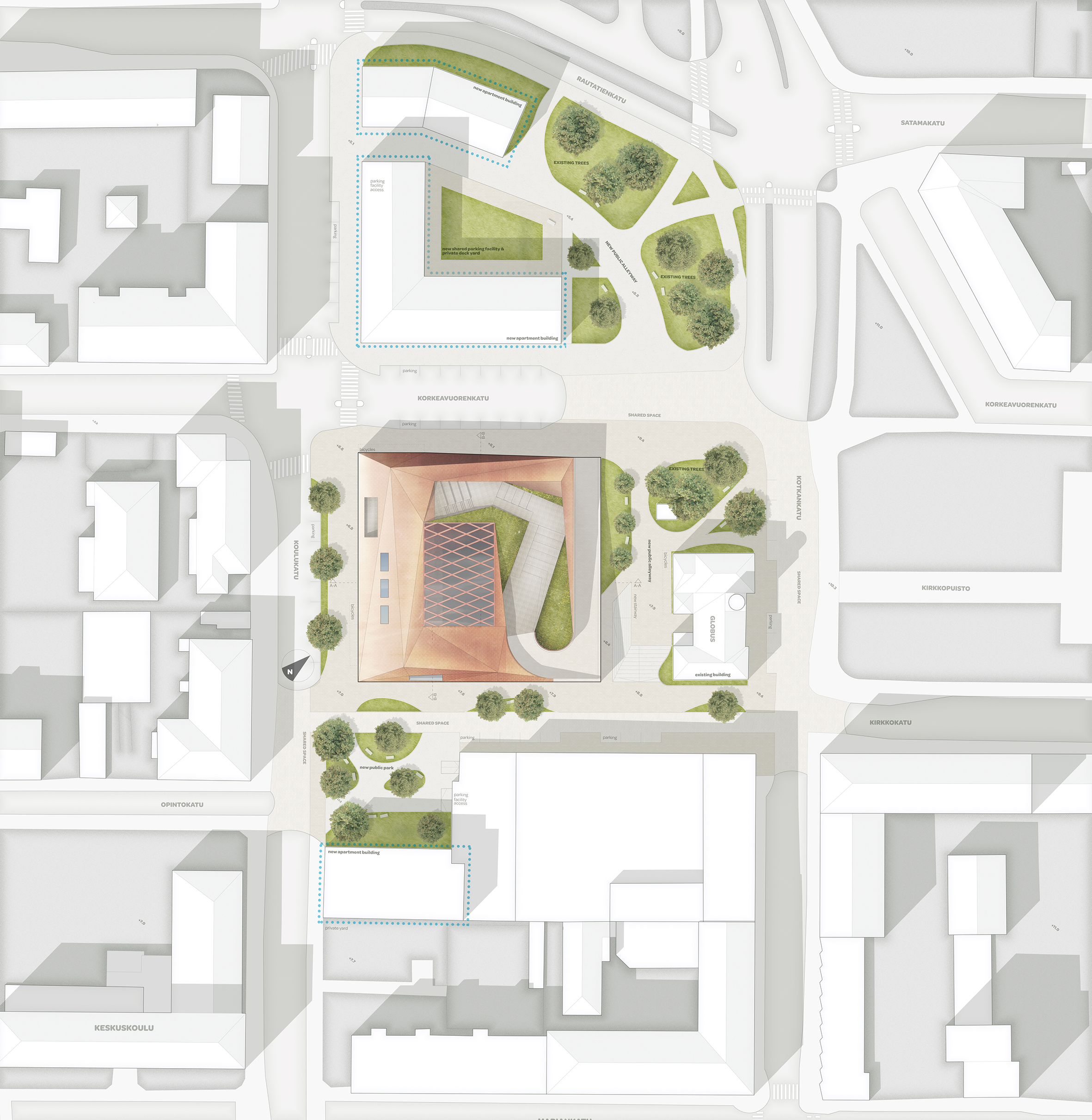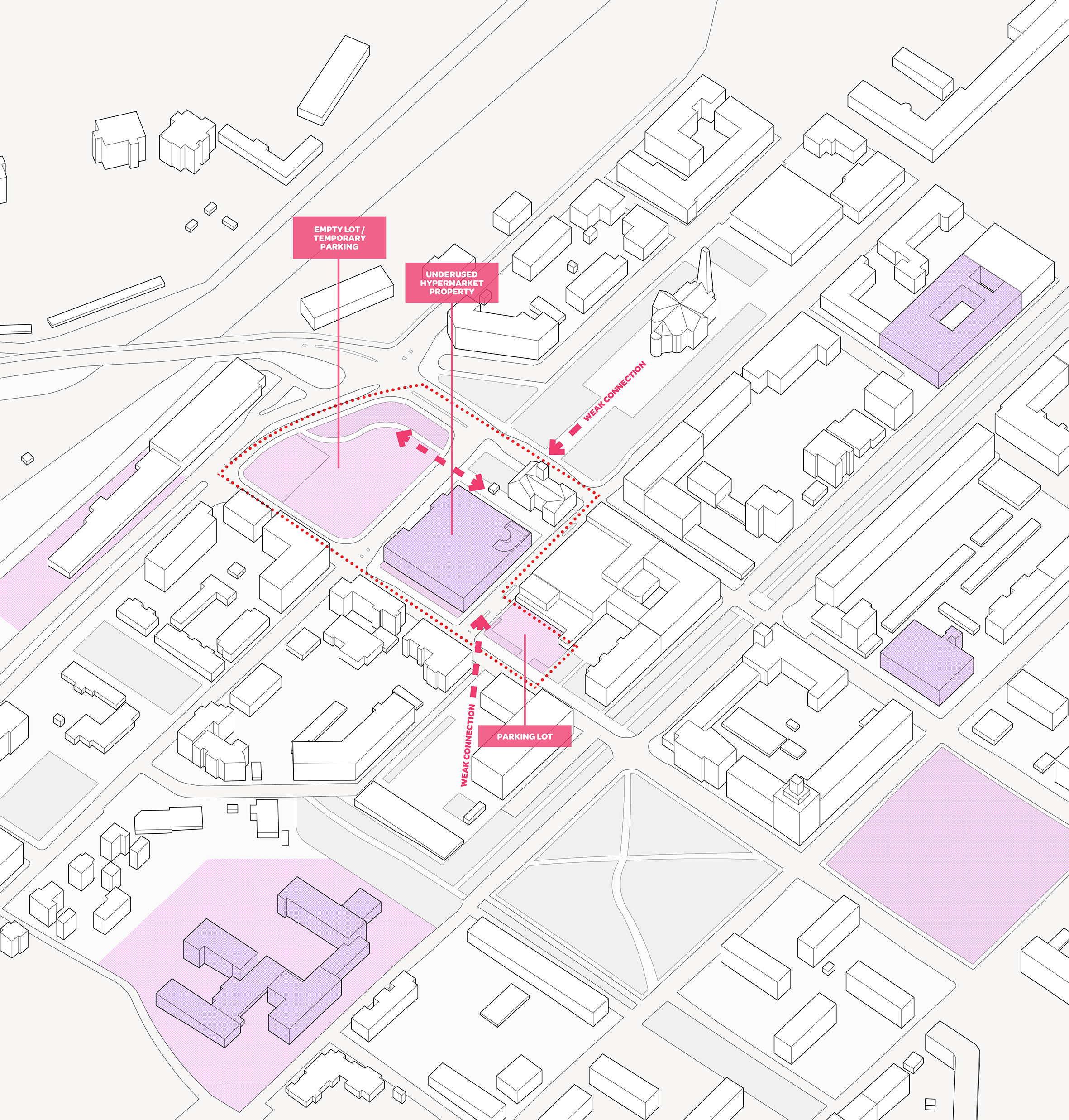 The general subject of the thesis is the regeneration of a former commercial district in the western part of the Kotka city center. As part of larger socio-economic changes, the area consisting of a former hypermarket building, an abolished service station and a high school building, faces problems of underuse and loss of identity. The work addresses these challenges by analyzing the urban environment and forming an understanding of the spatial and functional problems affecting the area in the present and near future. The vision for the area is developed with acknowledging the prospective urban changes of the city center. The proposition, a new urban hub, connects the surrounding districts, adds new redevelopments and creates a comfortable urban environment.