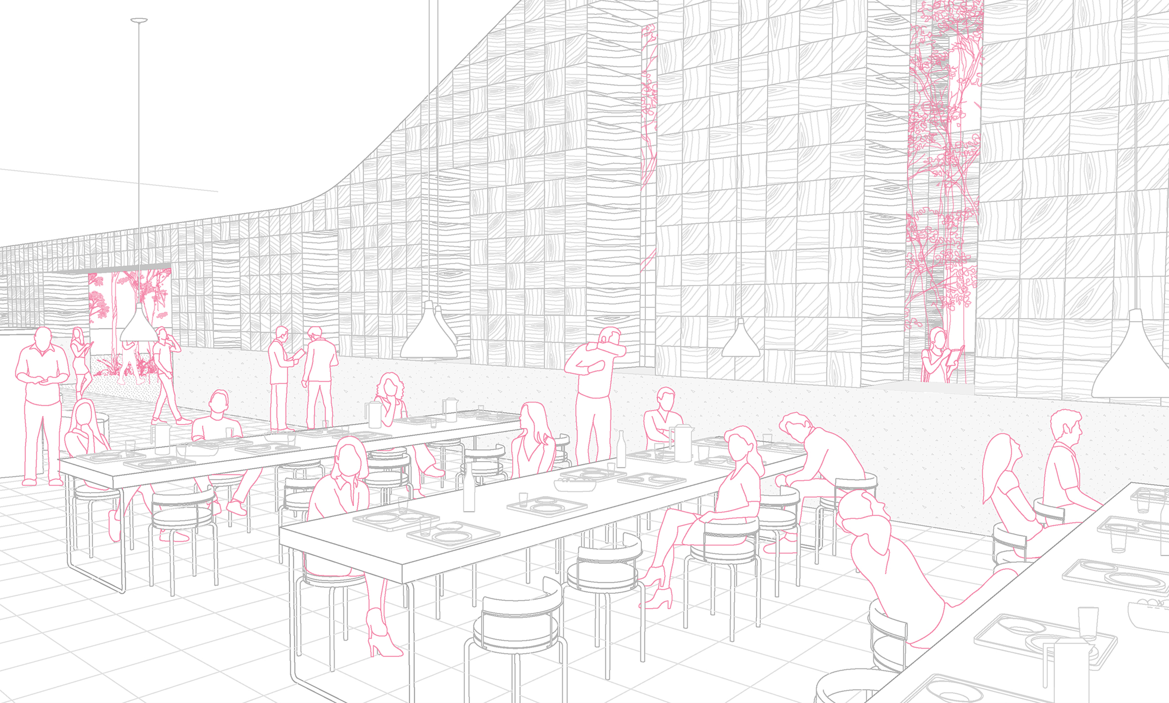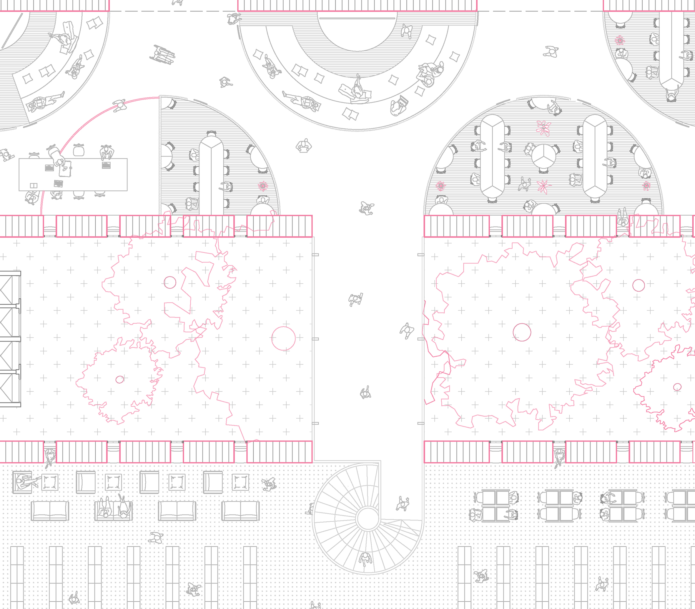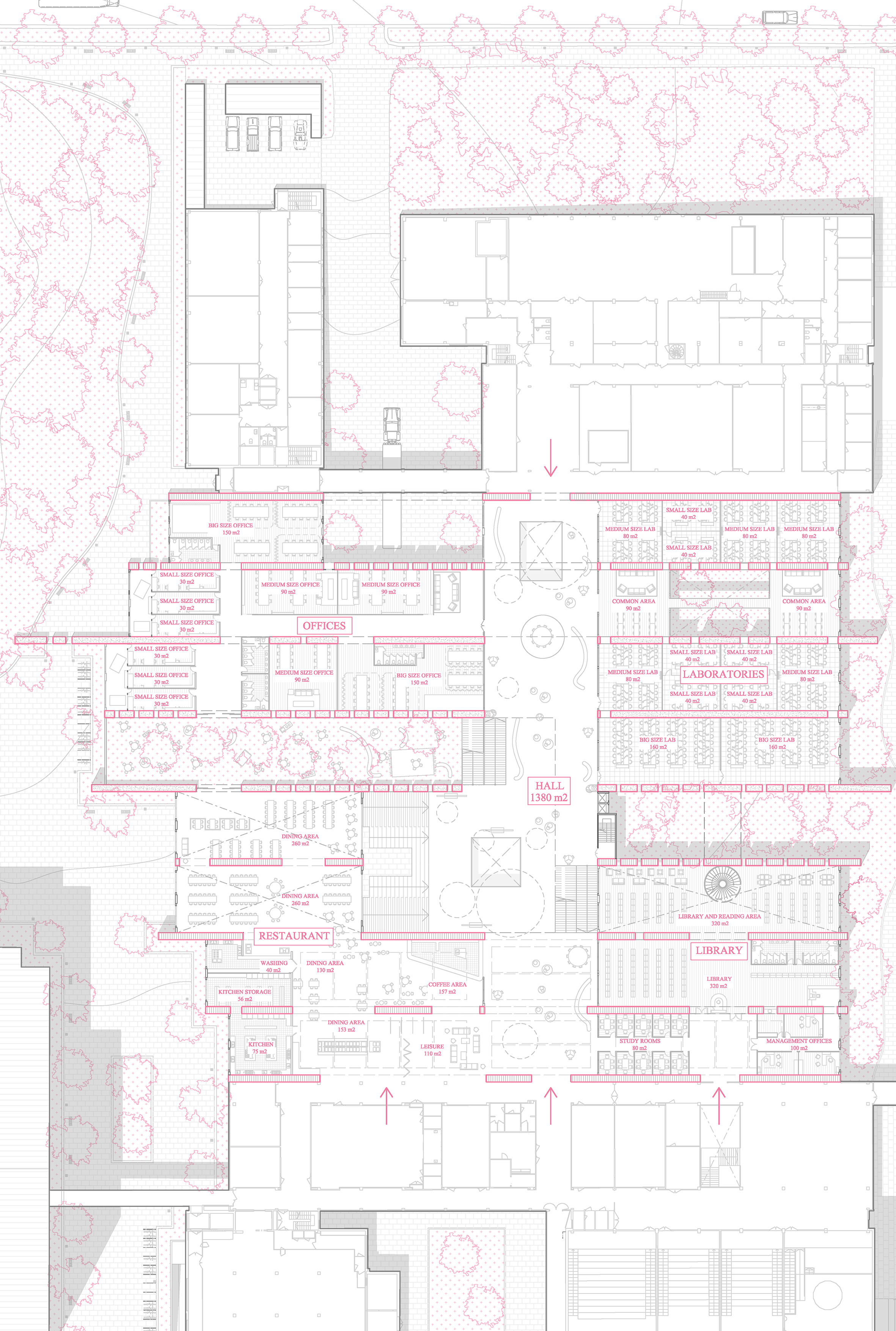 Once inside the building the user finds one big space with a lot of natural light that unifies all the volume with full height and connects physically all the spaces inside. But, a part from acting as a distributor and a connector with the rest of the university, the hall is the main social attraction, so through the concept of nature and experimentation, an installation made with bubbles held by tensors and with vegetation inside is created inside the building, letting people interact with it.