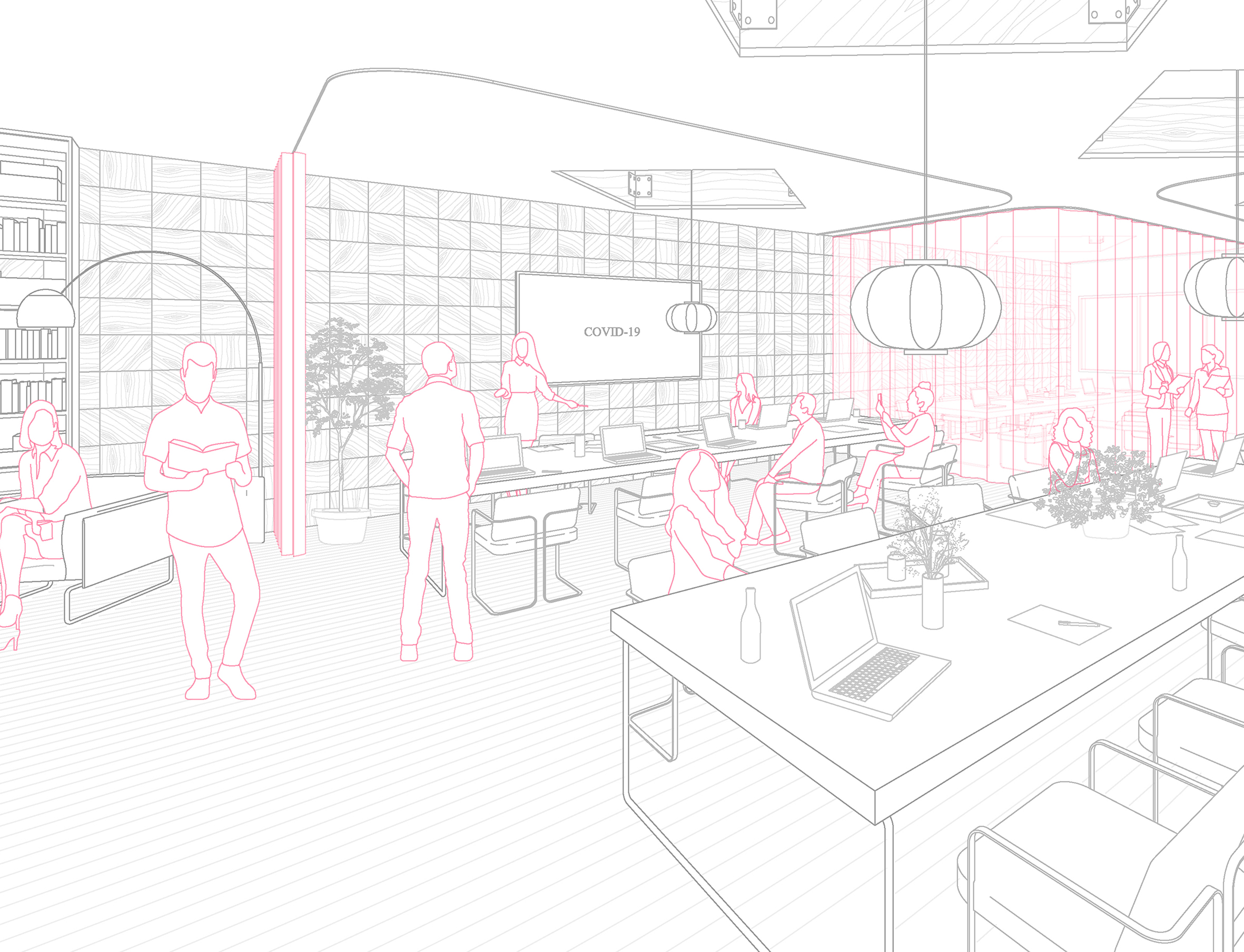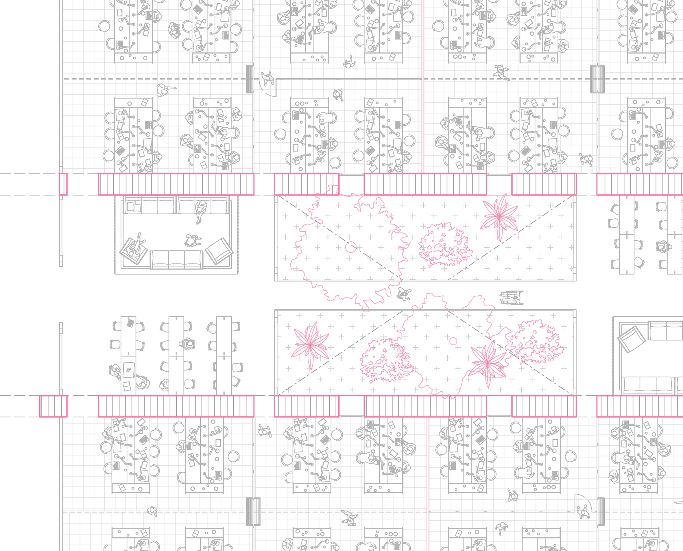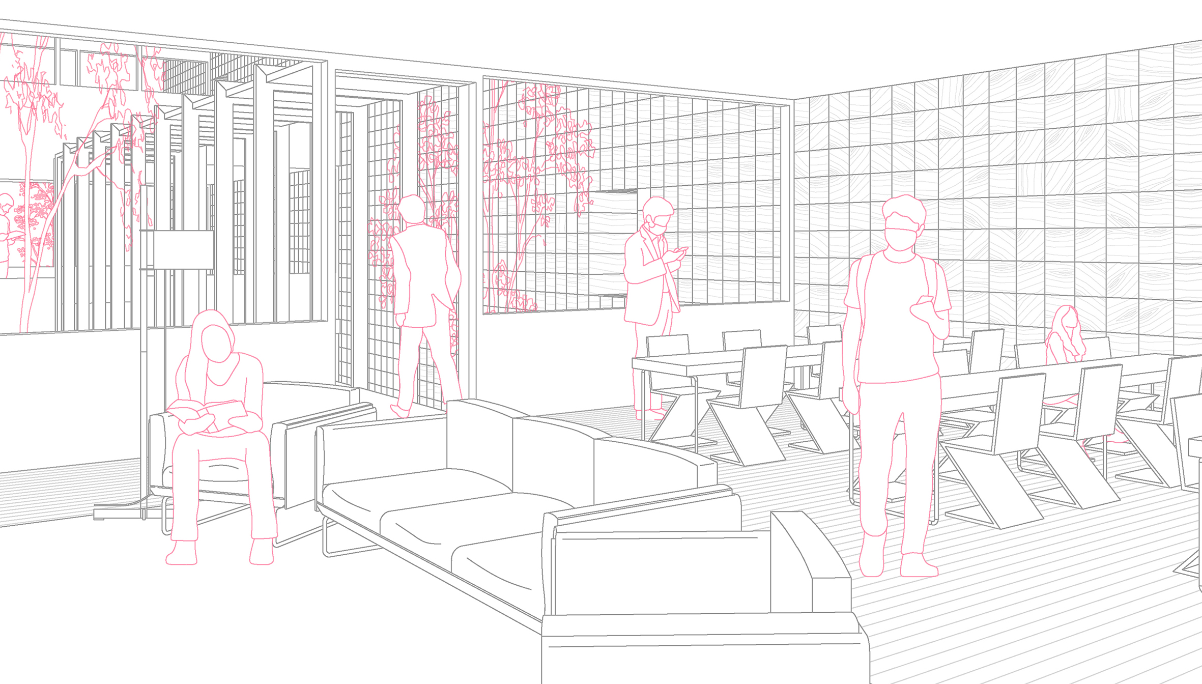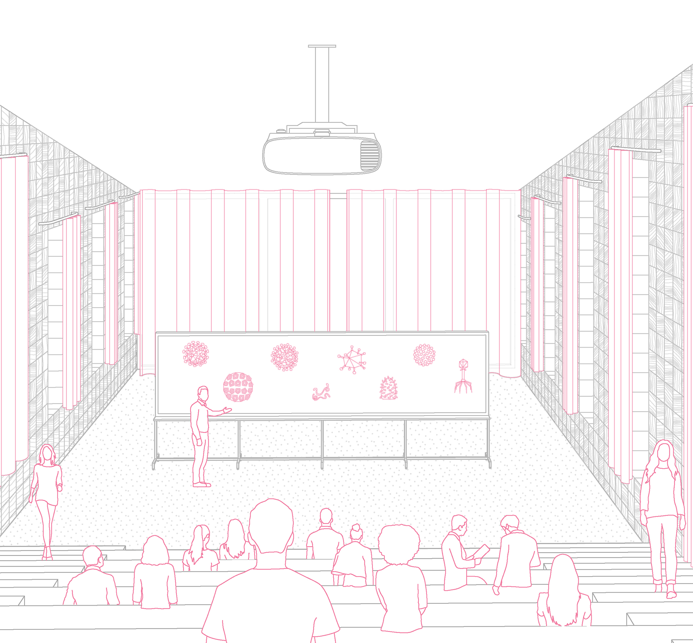 Once inside the building the user finds one big space with a lot of natural light that unifies all the volume with full height and connects physically all the spaces inside. But, a part from acting as a distributor and a connector with the rest of the university, the hall is the main social attraction, so through the concept of nature and experimentation, an installation made with bubbles held by tensors and with vegetation inside is created inside the building, letting people interact with it.