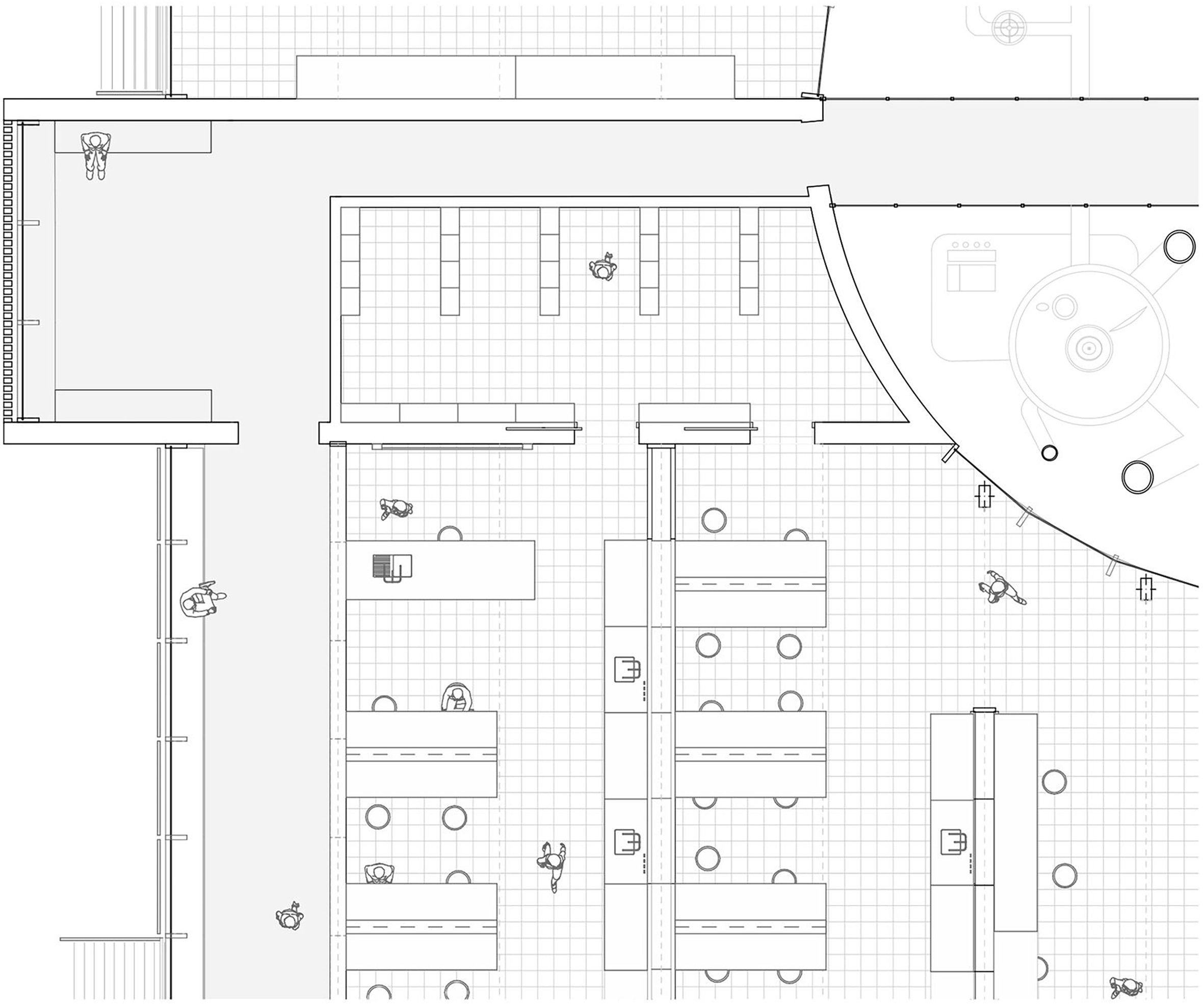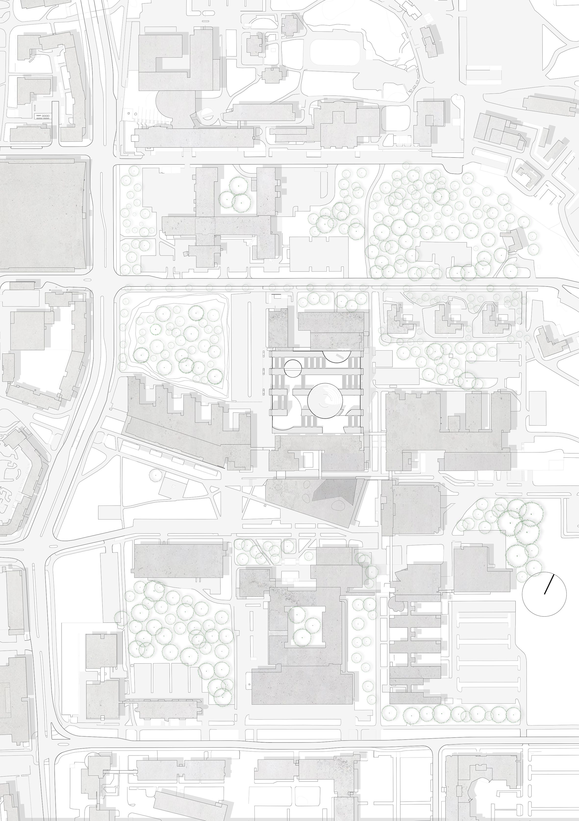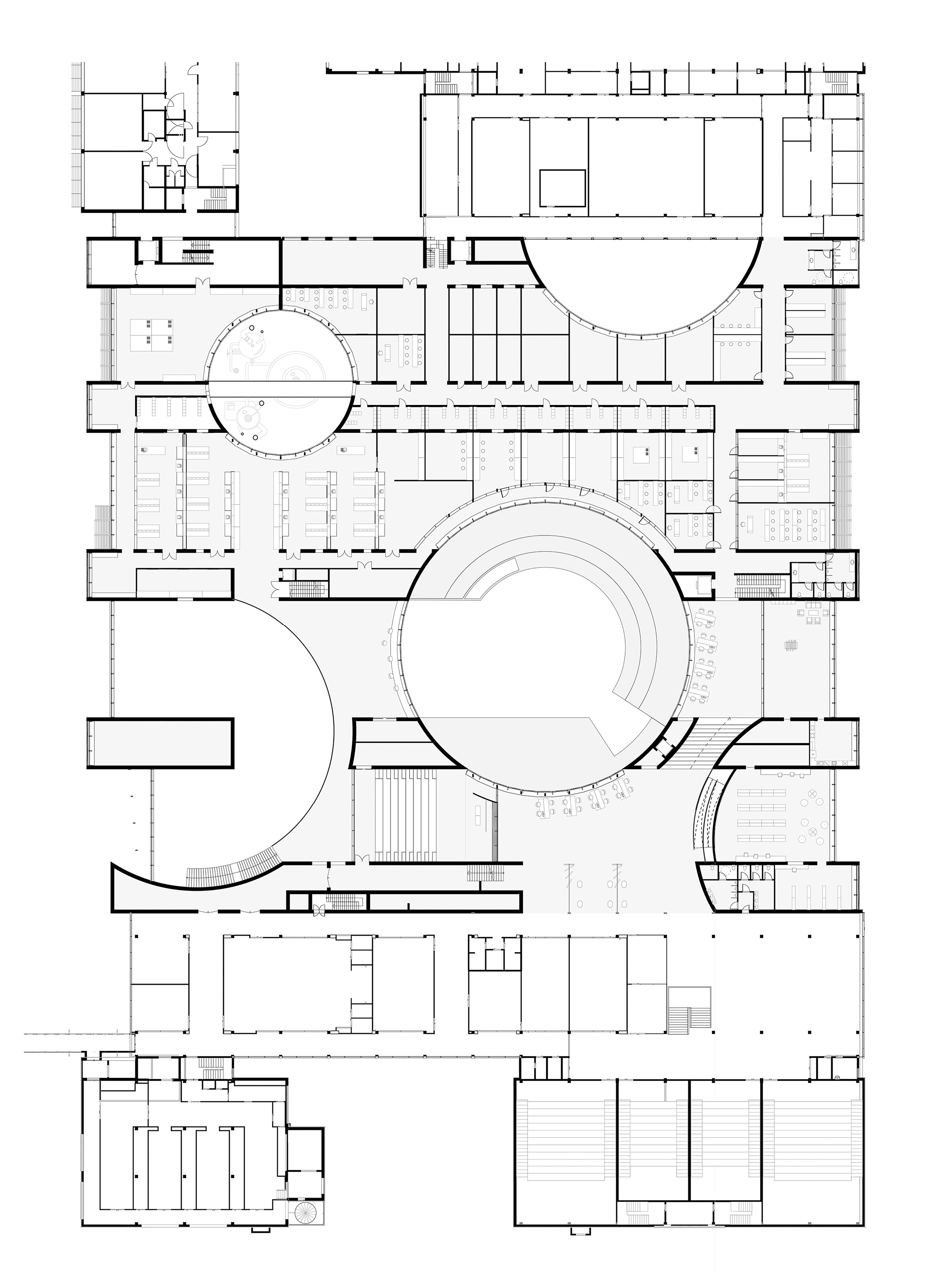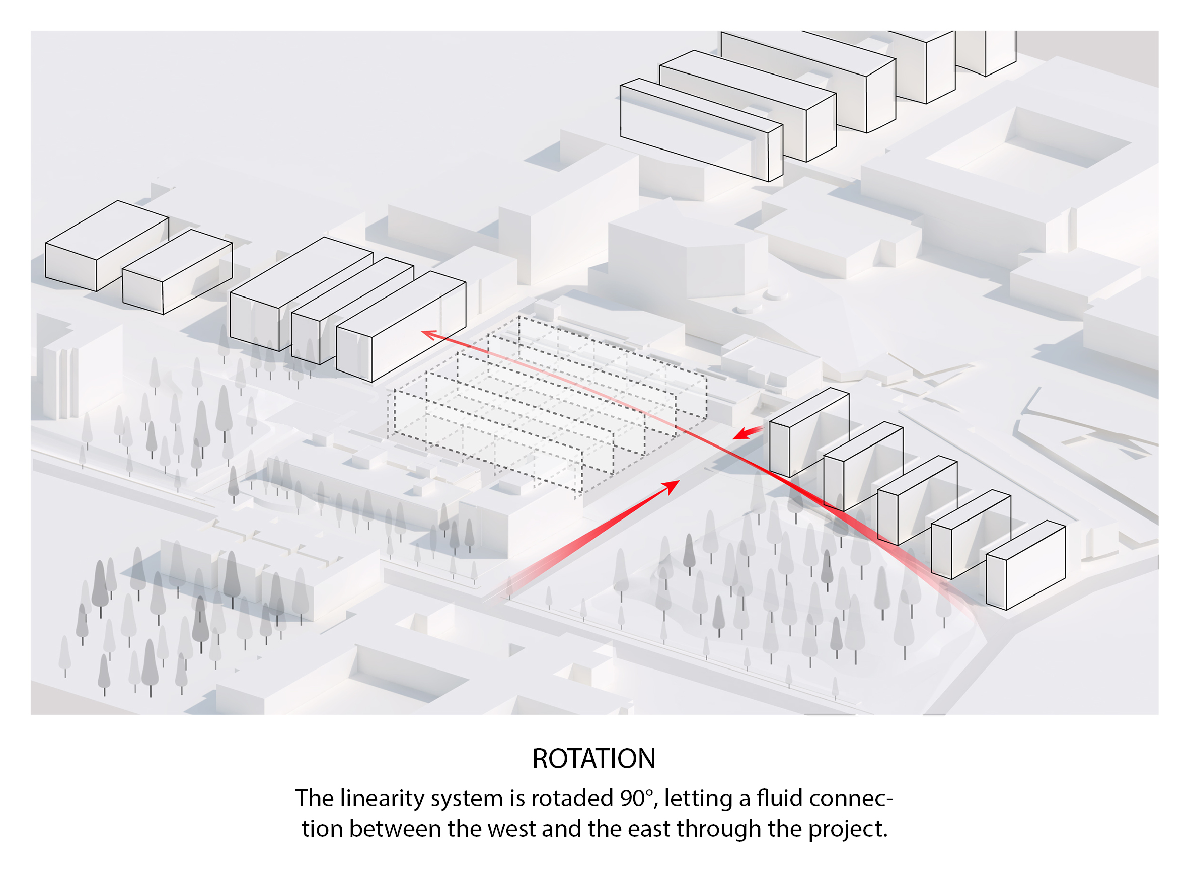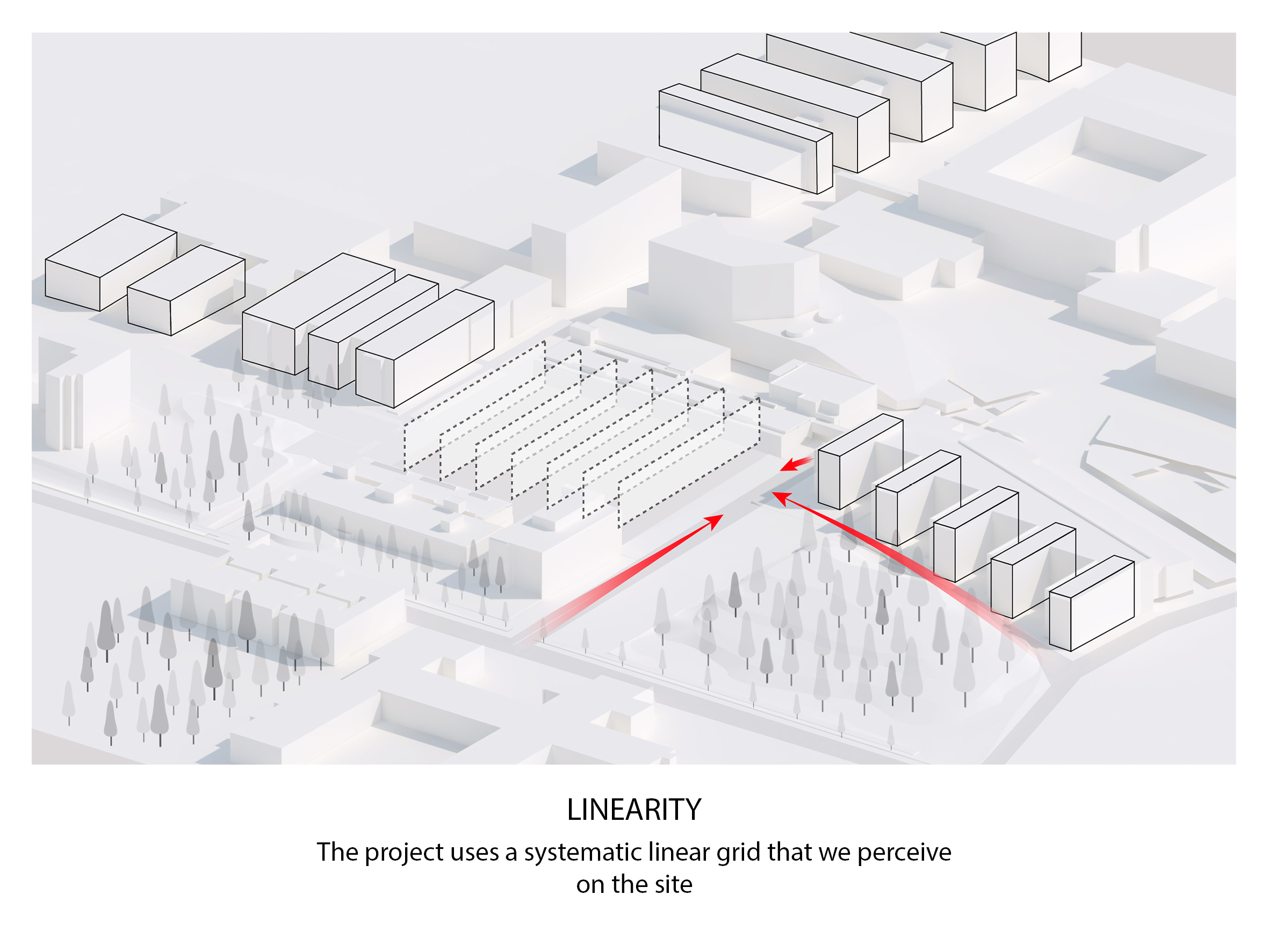 For this project, there was a need of creating a strong architectural landmark for the university, nonetheless keeping unity and coherence between the buildings of the site. The project is therefore working with a certain systematicity and repetition of straight and parallel walls. To do that, the new building uses the structural framework of the old building. According to a 6×6 meters grid, we placed long straight walls in order to find the linear and repetitive system of the school. These walls are placed perpendicularly to the original ones.