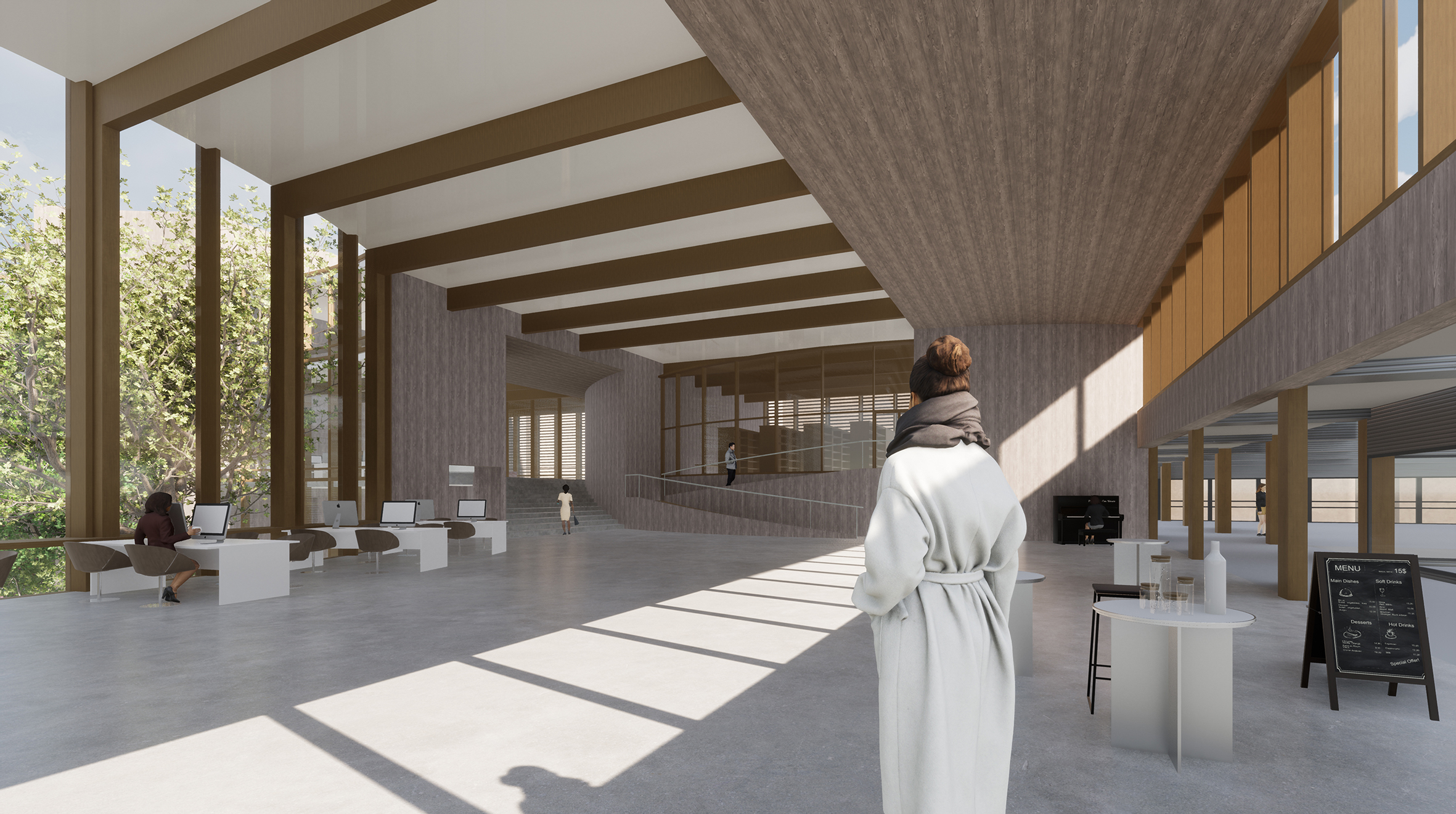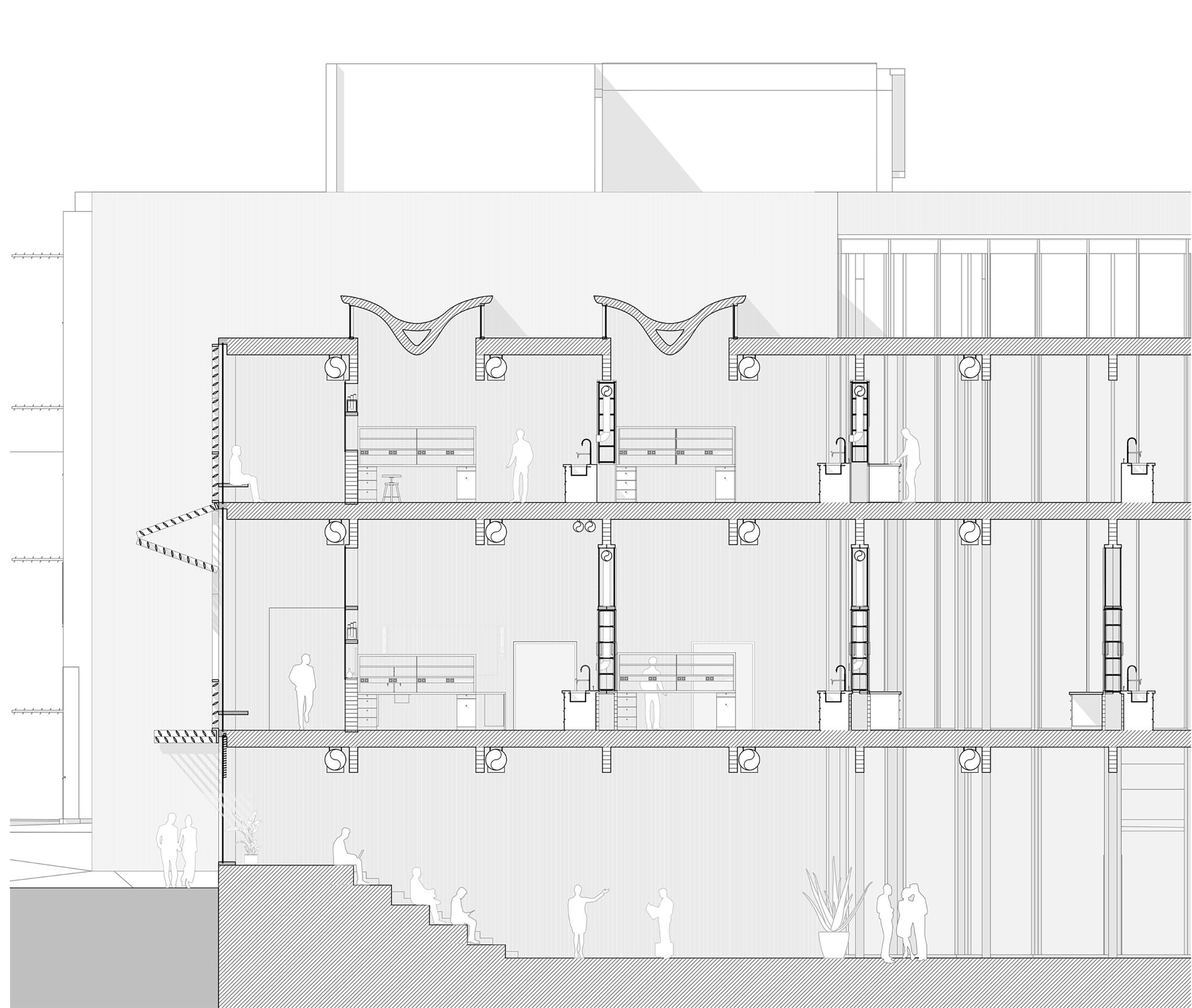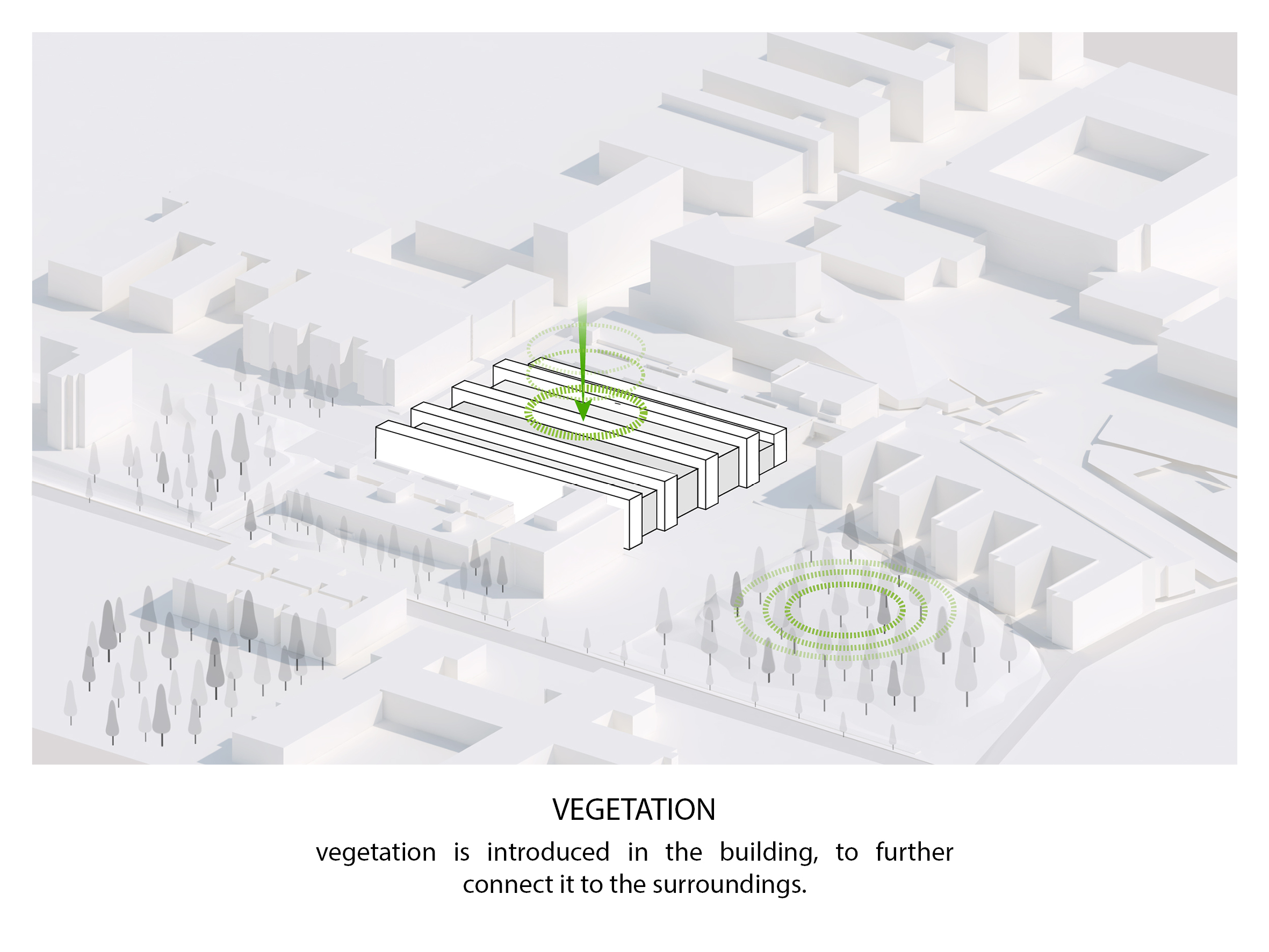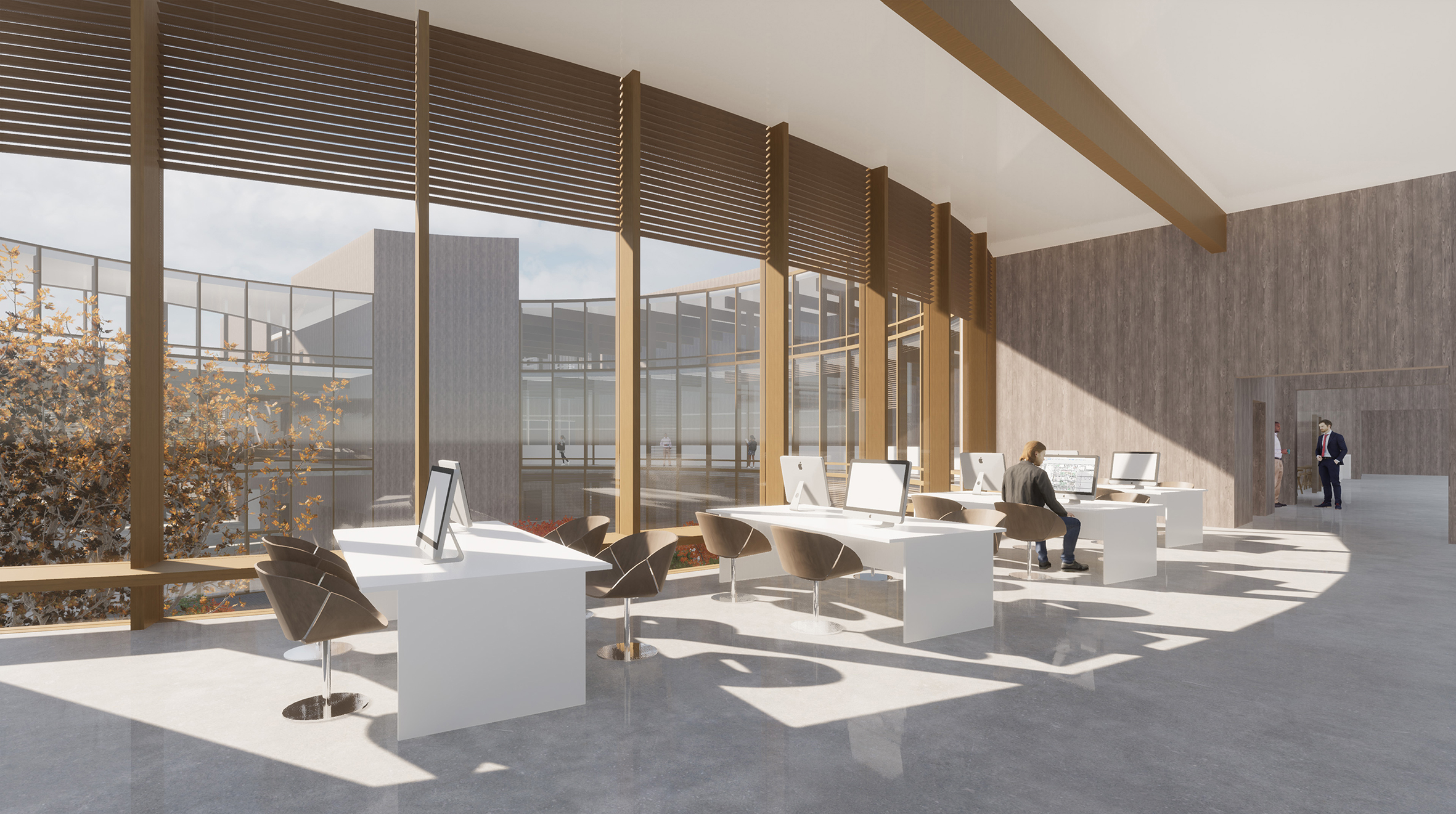 To allow for such large spaces, large beams will span the entire width between the bearing walls, of maximum 15 meters. In some places, there will be specifically designed roof windows between the beams, that will let diffuse natural light through the space.