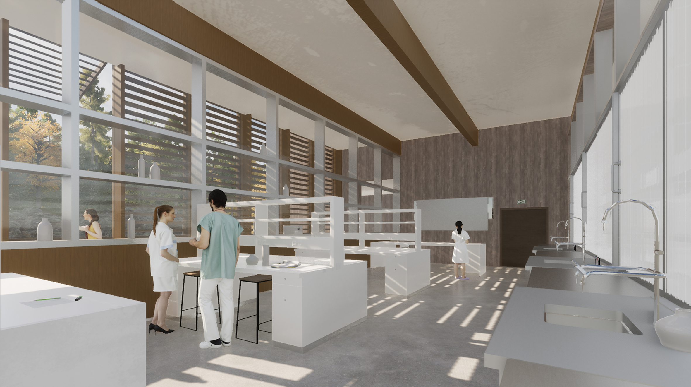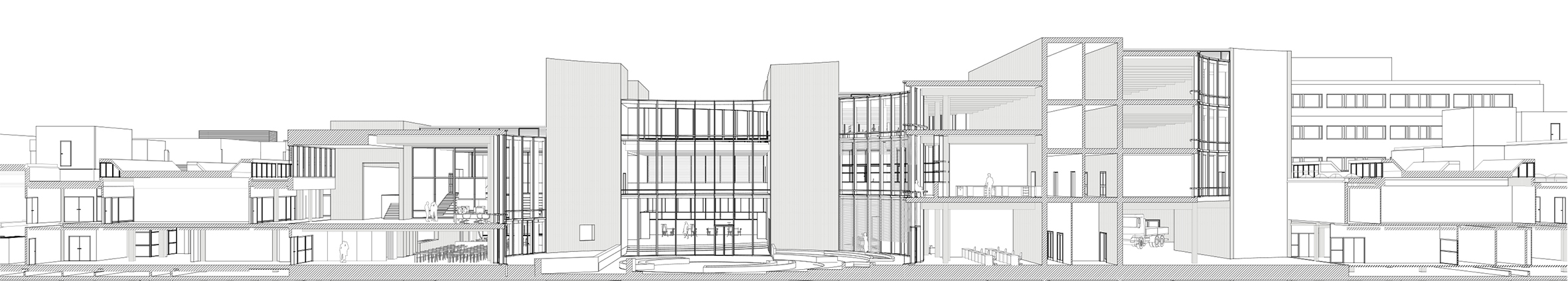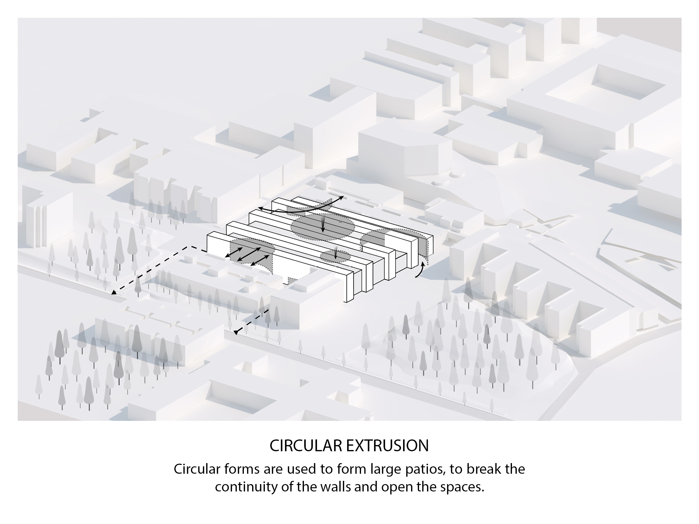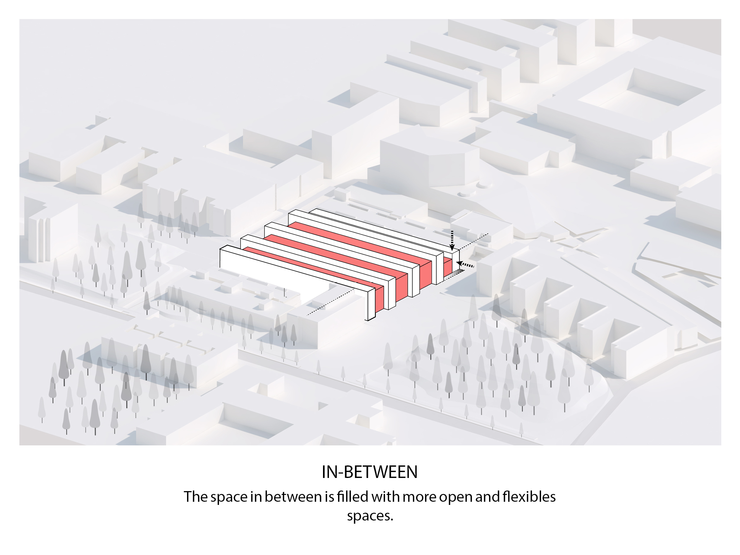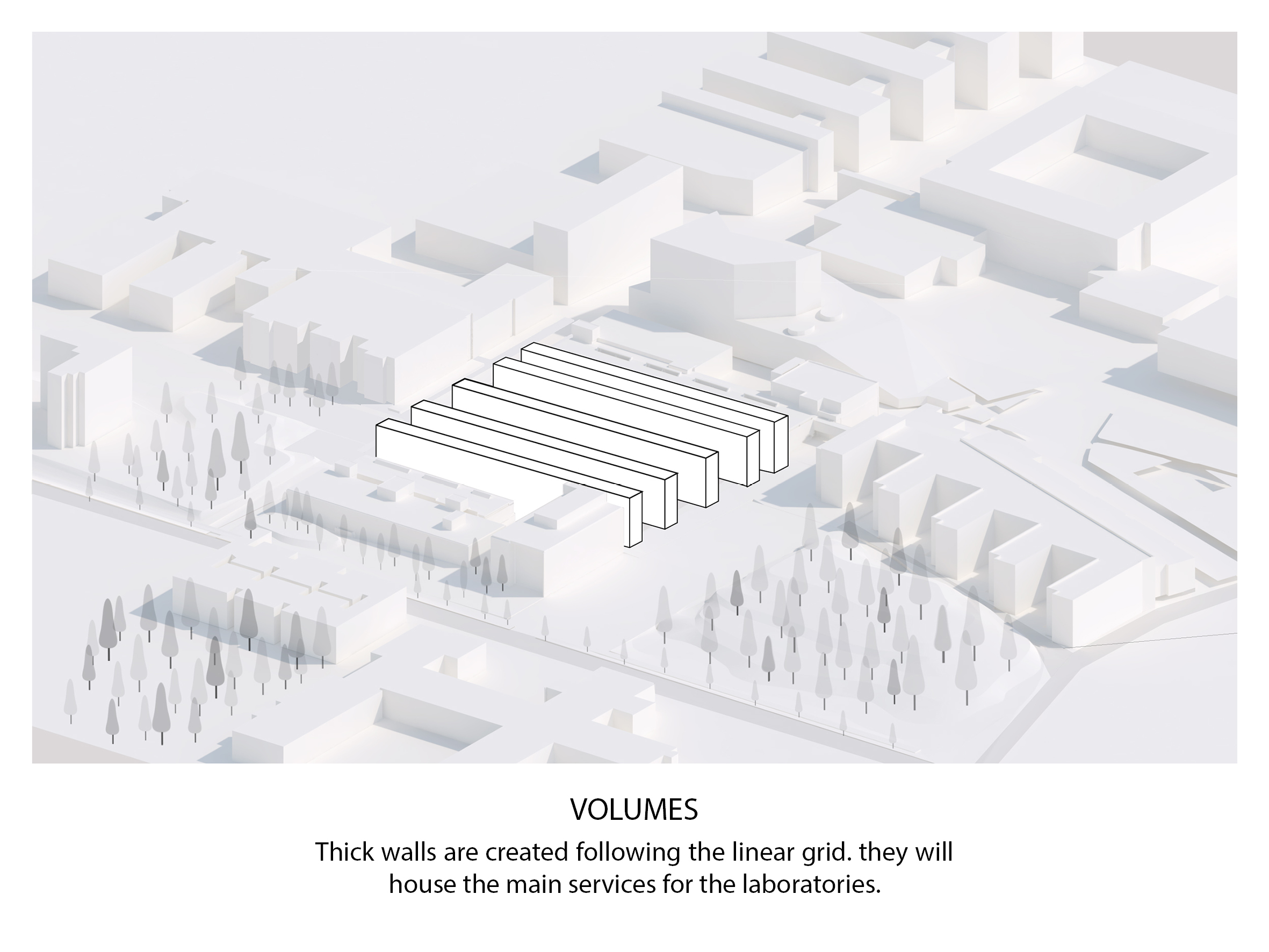 Subsequently, we gave these walls a certain thickness, so they become both structural and functional. They will accommodate all the technical and service spaces and will also serve for circulation. Between these plain walls will be free spaces housing the core of the program, including the laboratories and classrooms, which will let their activity show through transparent or opaque glass panes.