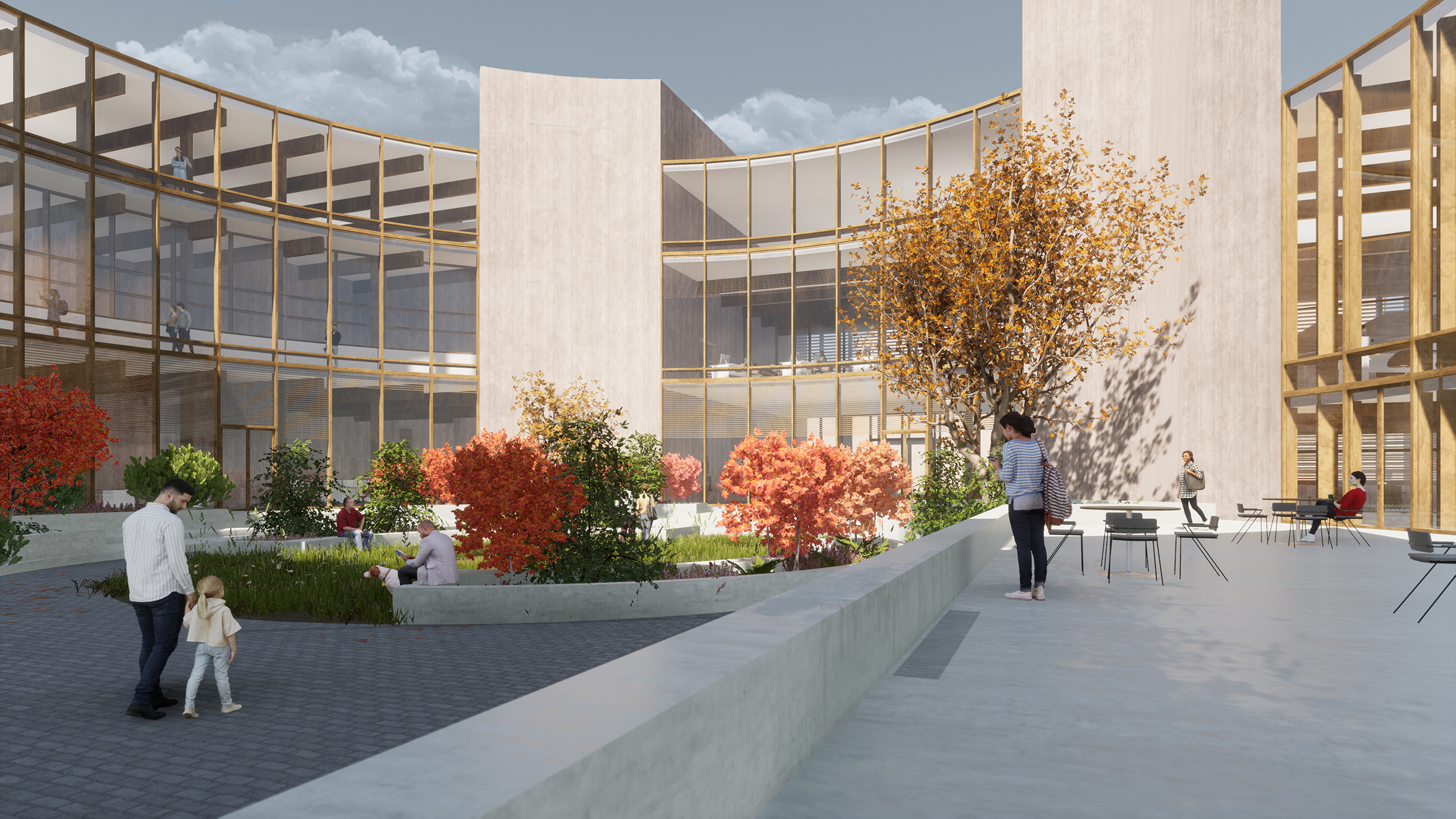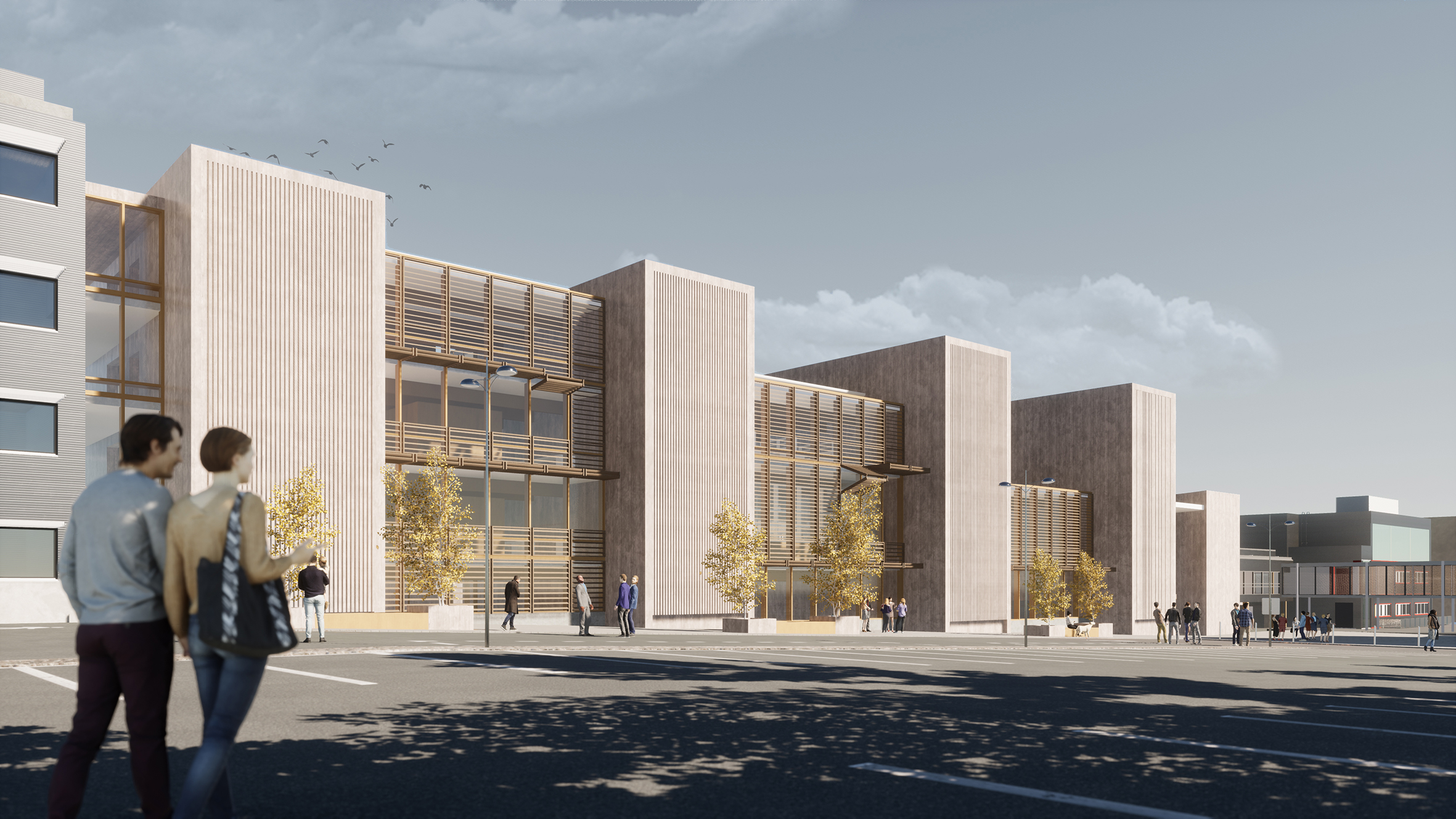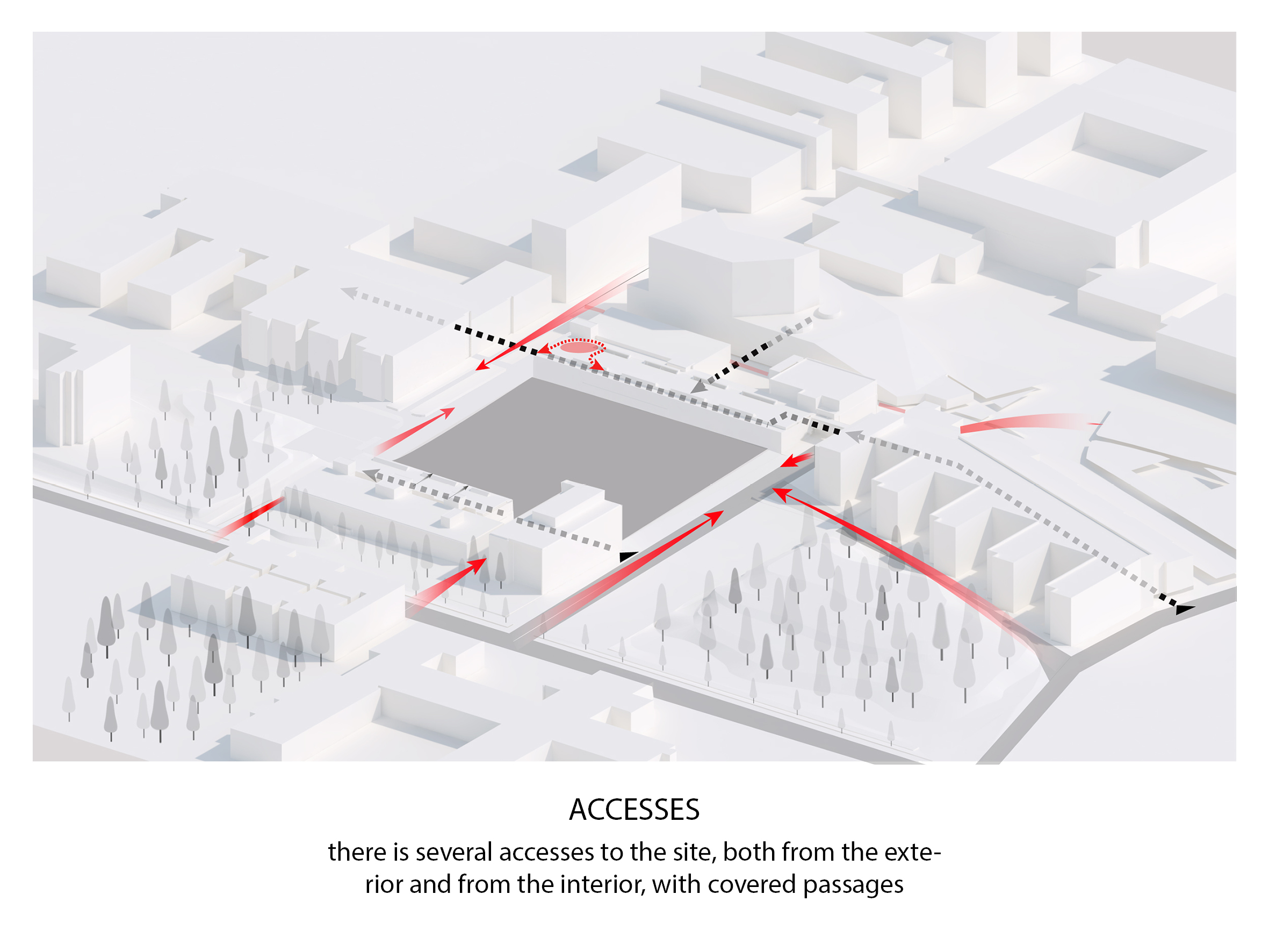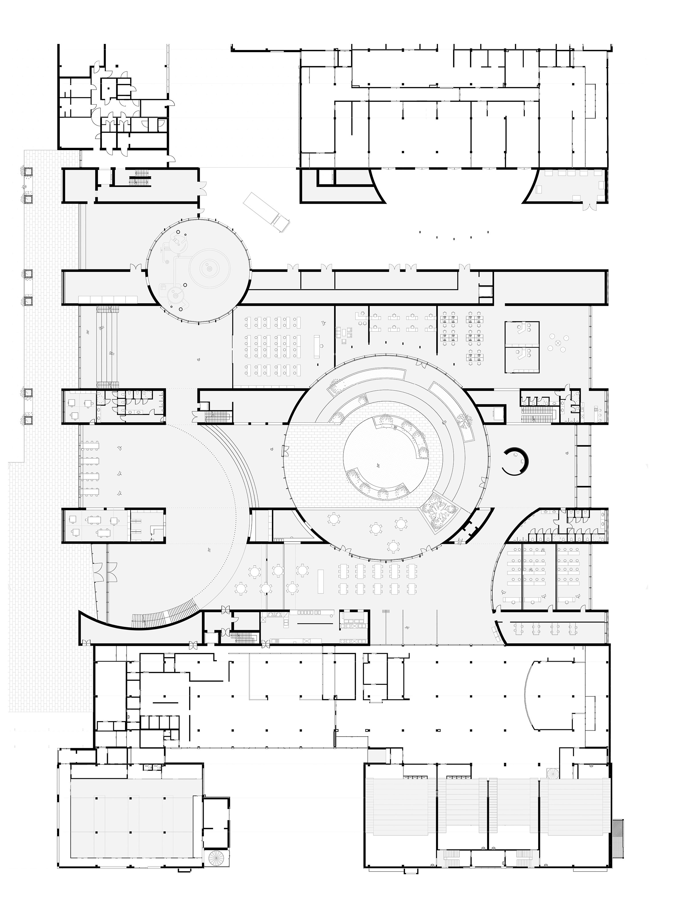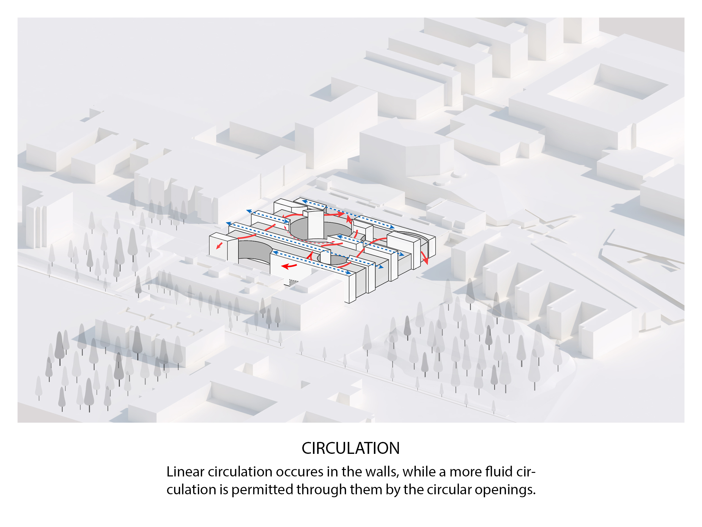 Subsequently, we gave these walls a certain thickness, so they become both structural and functional. They will accommodate all the technical and service spaces and will also serve for circulation. Between these plain walls will be free spaces housing the core of the program, including the laboratories and classrooms, which will let their activity show through transparent or opaque glass panes.