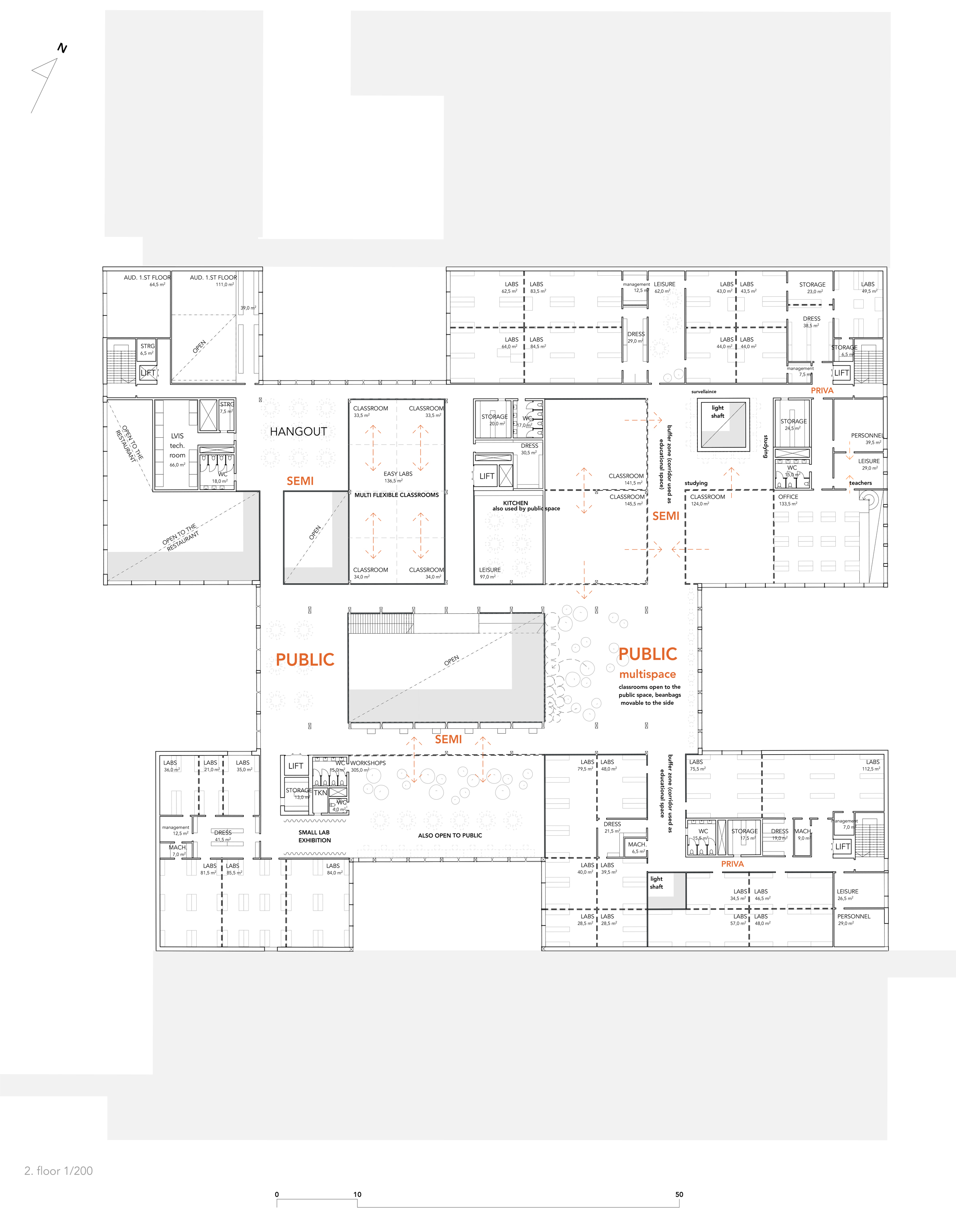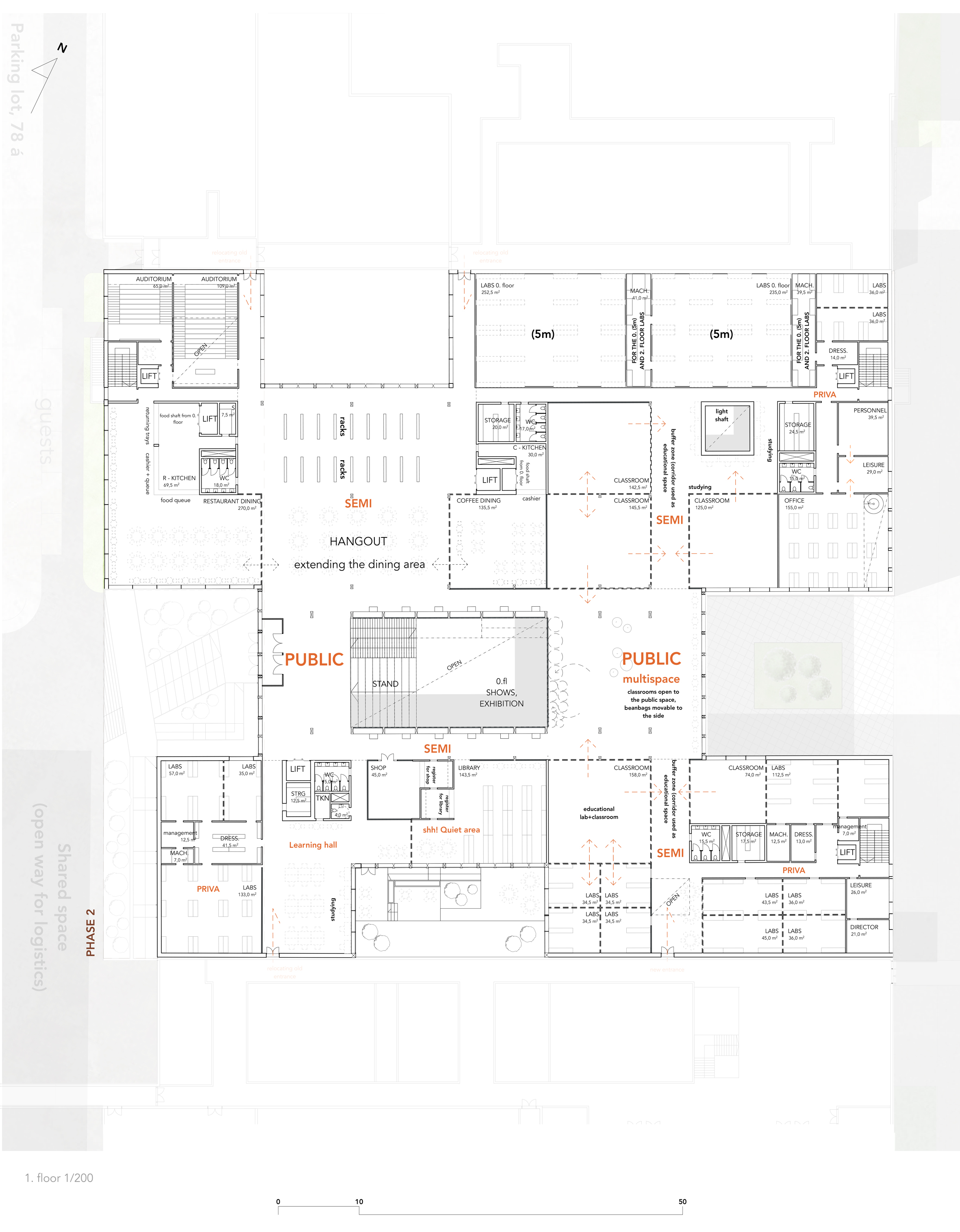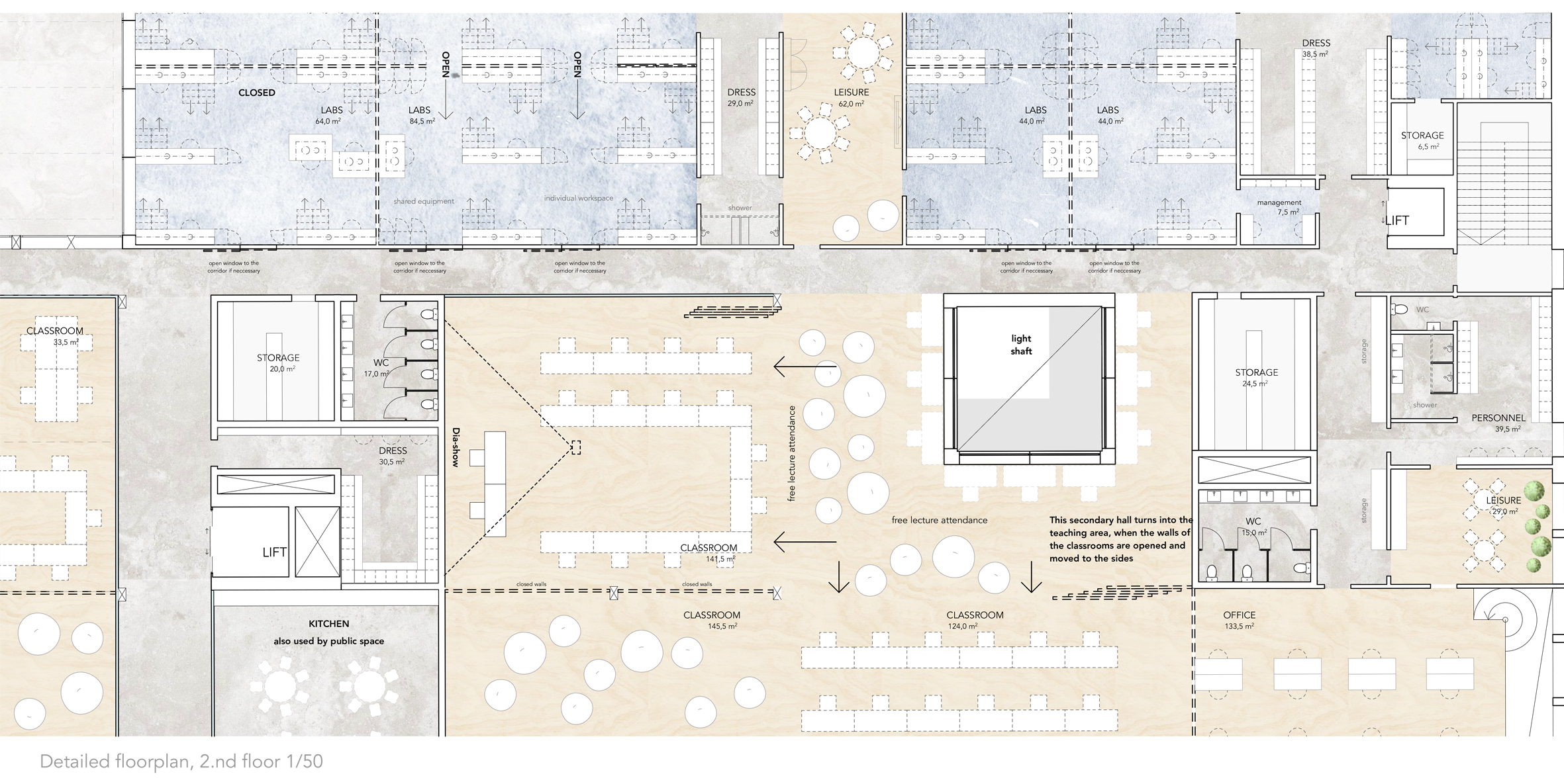 Our central building is the main one with public spaces. The near halls located between the wings are semi-public/semiprivate depending on the activity in those areas. The wings are private, but sometimes they can be open to the semi-public space, such as classrooms and discussion forums held in the main hall. We designed learning and laboratory spaces in the way that the space can be modified by its use.