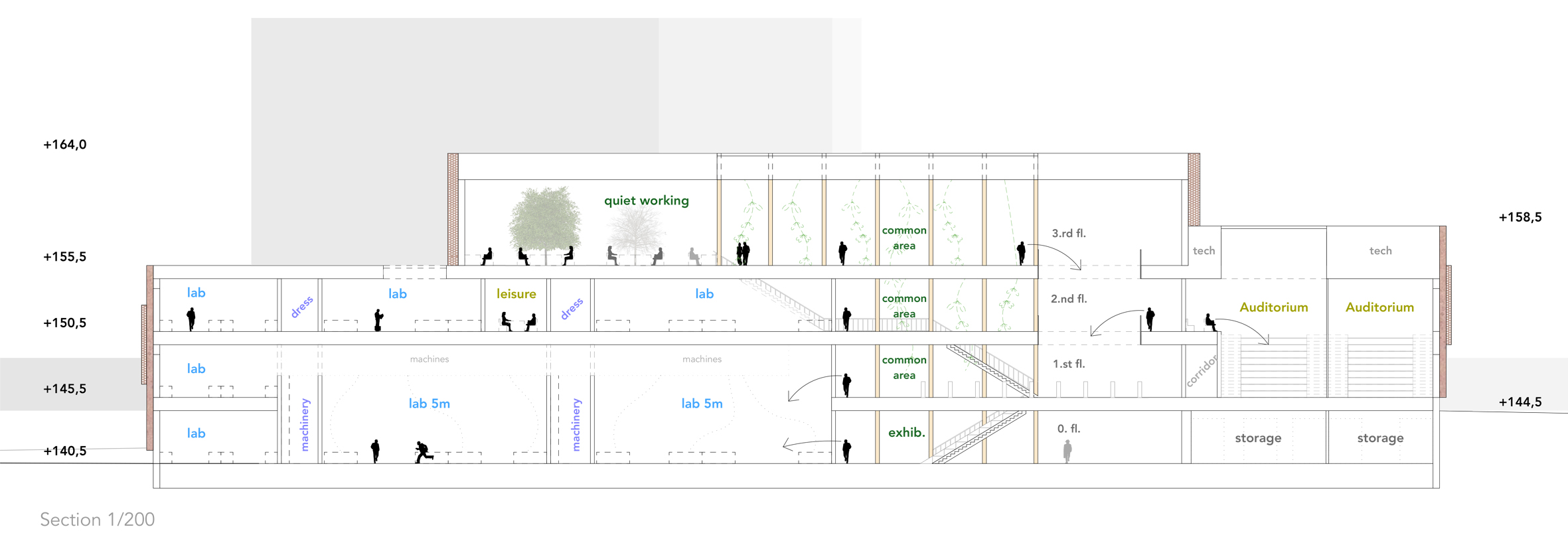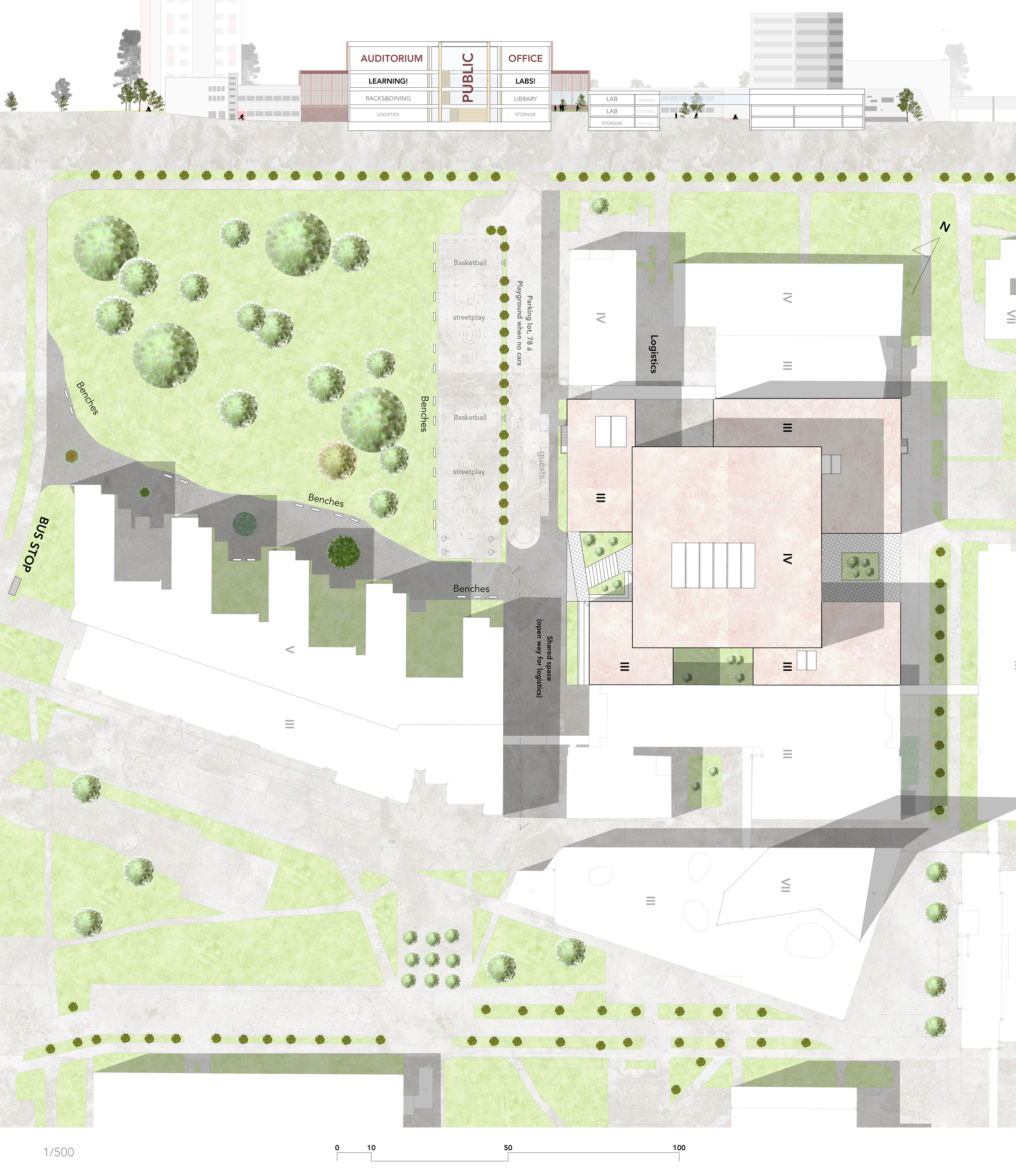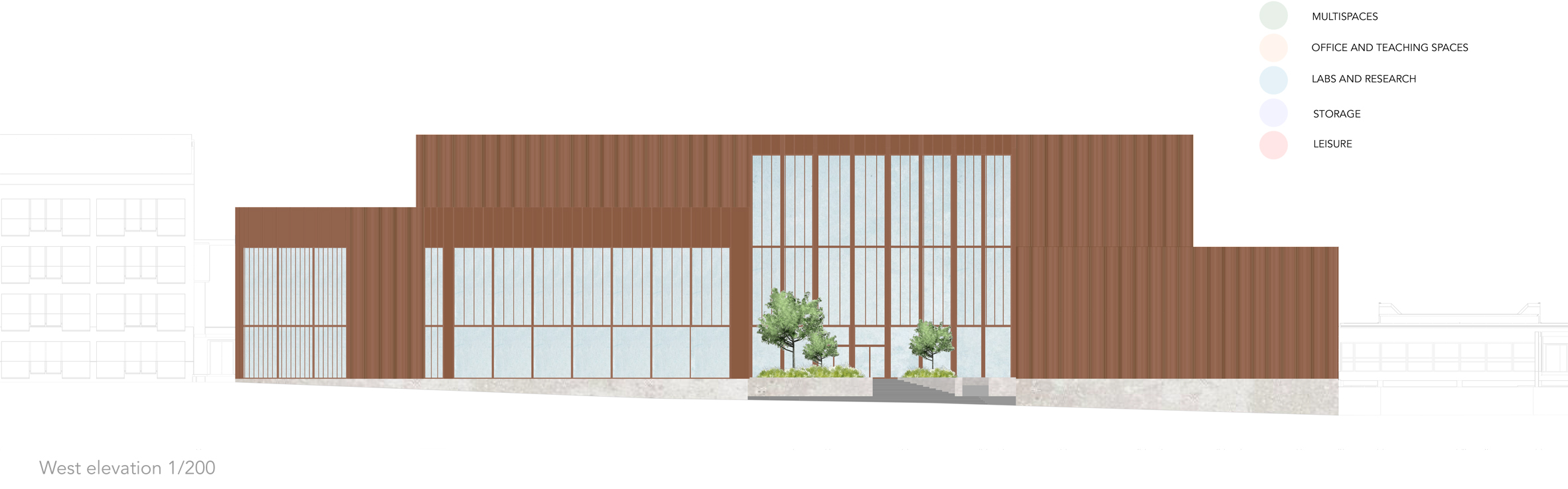 Our central building is the main one with public spaces. The near halls located between the wings are semi-public/semiprivate depending on the activity in those areas. The wings are private, but sometimes they can be open to the semi-public space, such as classrooms and discussion forums held in the main hall. We designed learning and laboratory spaces in the way that the space can be modified by its use.