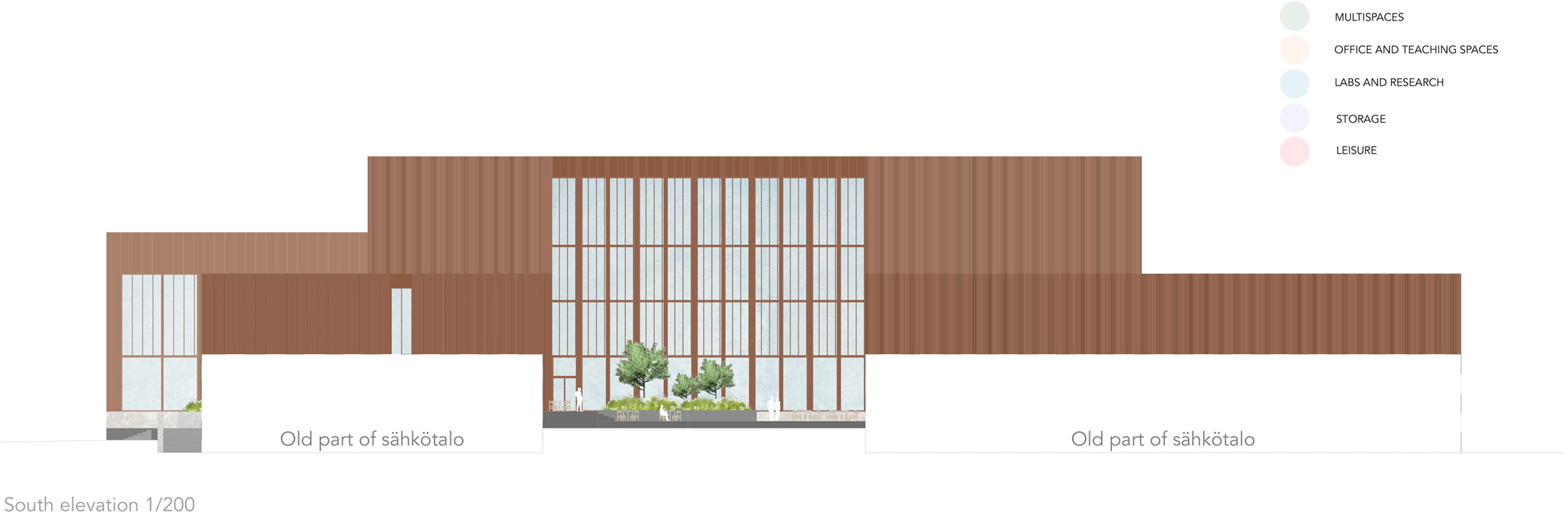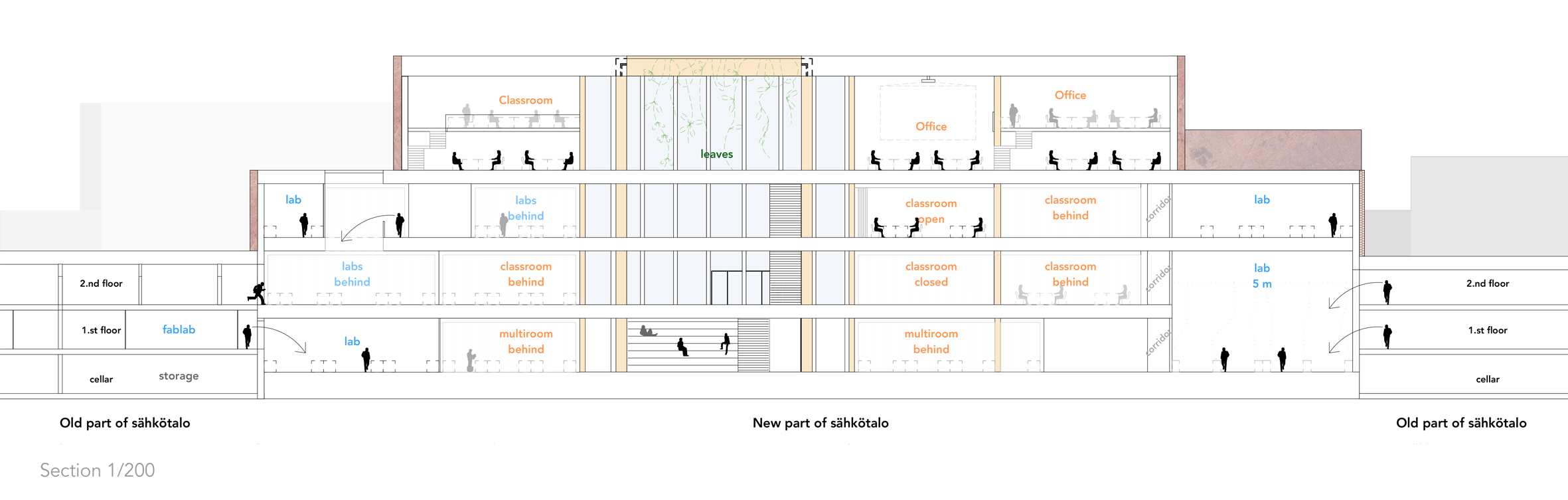 Our central hub is designed as a connective box. The idea behind our design is about varying the public, semiprivate and private spaces. We also believe that when one can vary the space in need, the purpose of that space becomes much more valuable for the user. The new Sähkötalo campus contains different kind of transformable places.