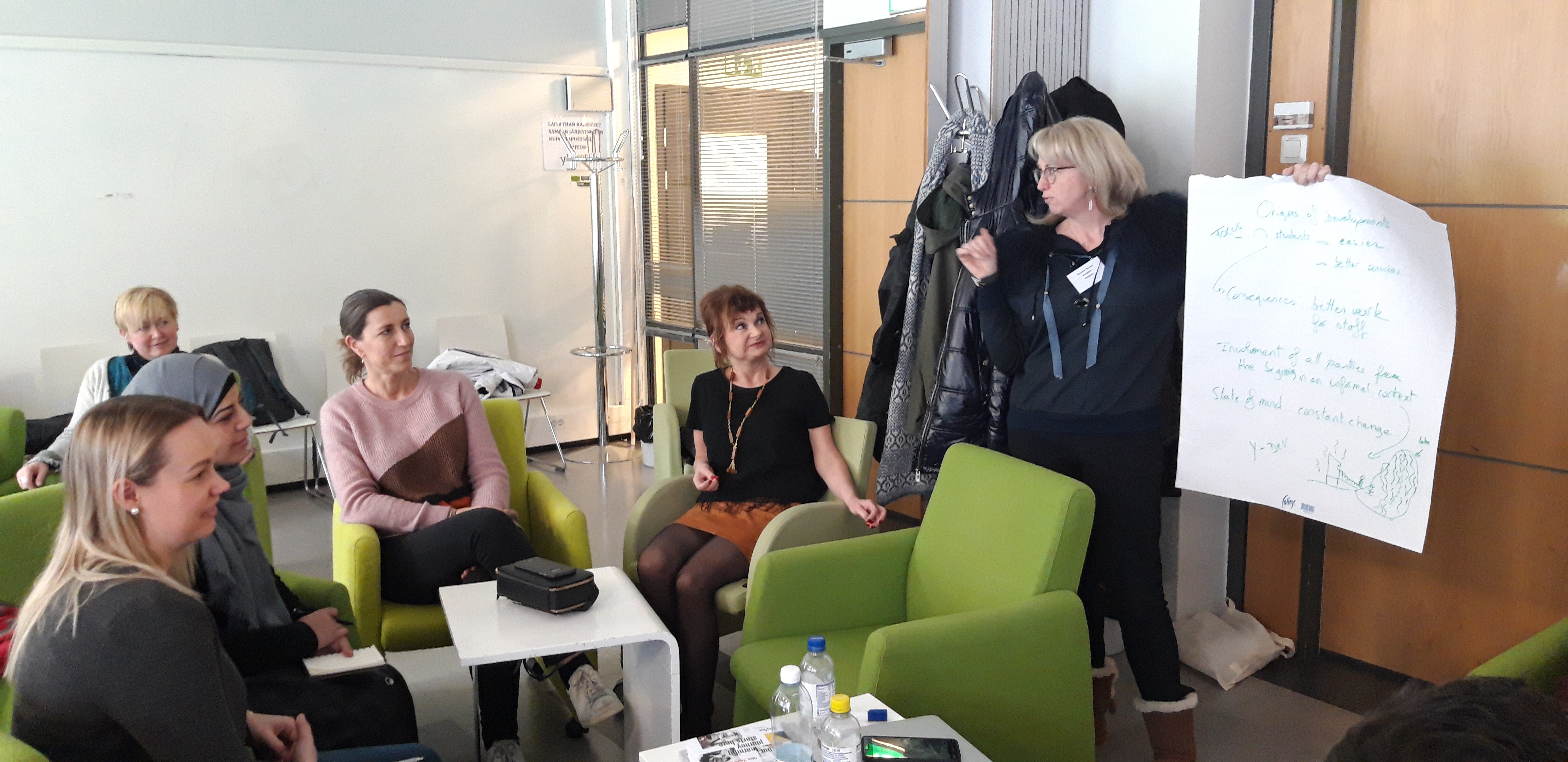 Our group discussed about the origins of the development – where does the need for the change/development come from? Focus on student means services should be easier and better. As a consequence, it means more effective and better use of worktime for staff too. Involvement of all parties should be from the beginning of the development project and it should be in an informal context. When talking about online systems to help our lives, it is important to keep the State of Mind: constant change!